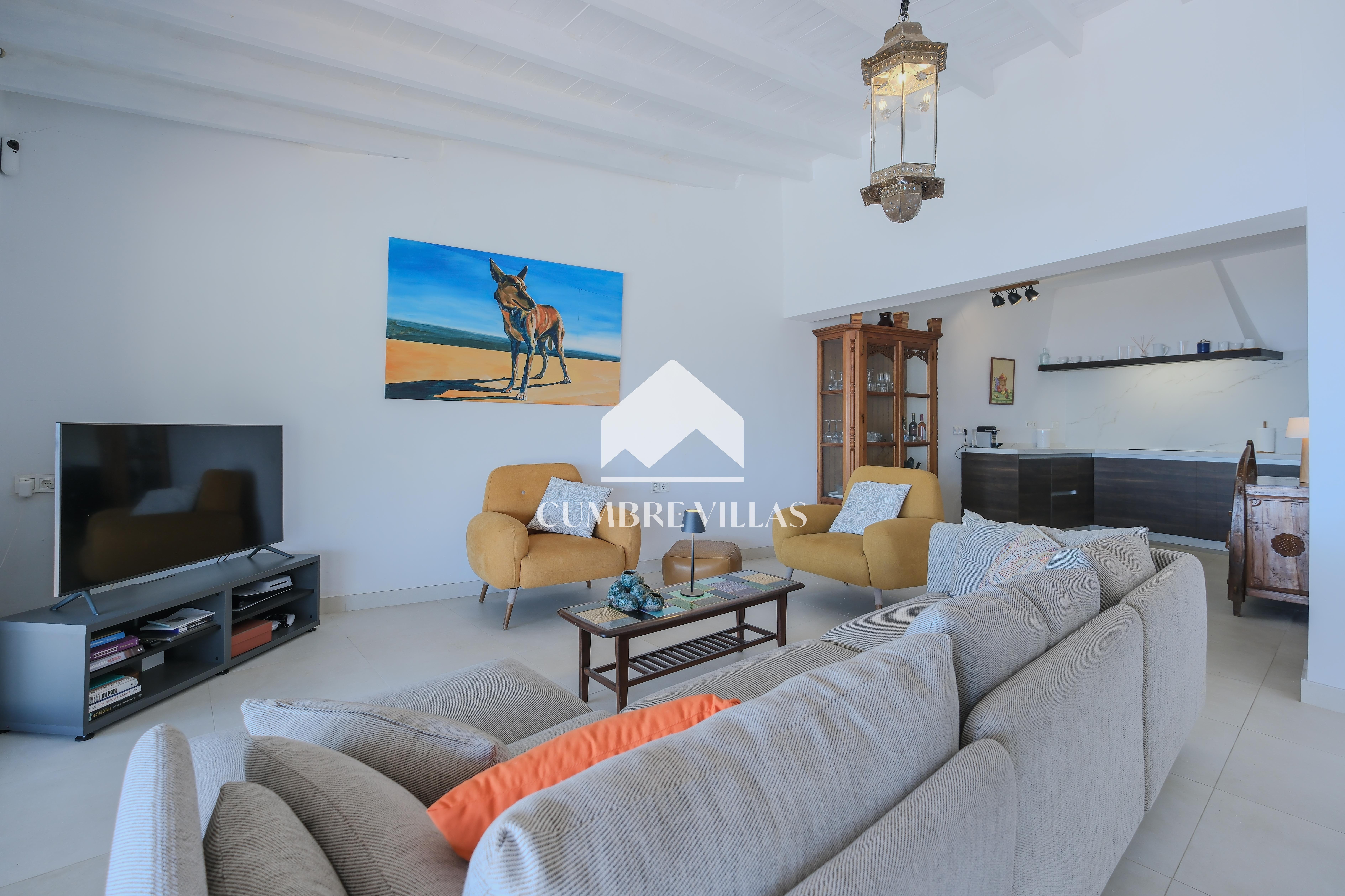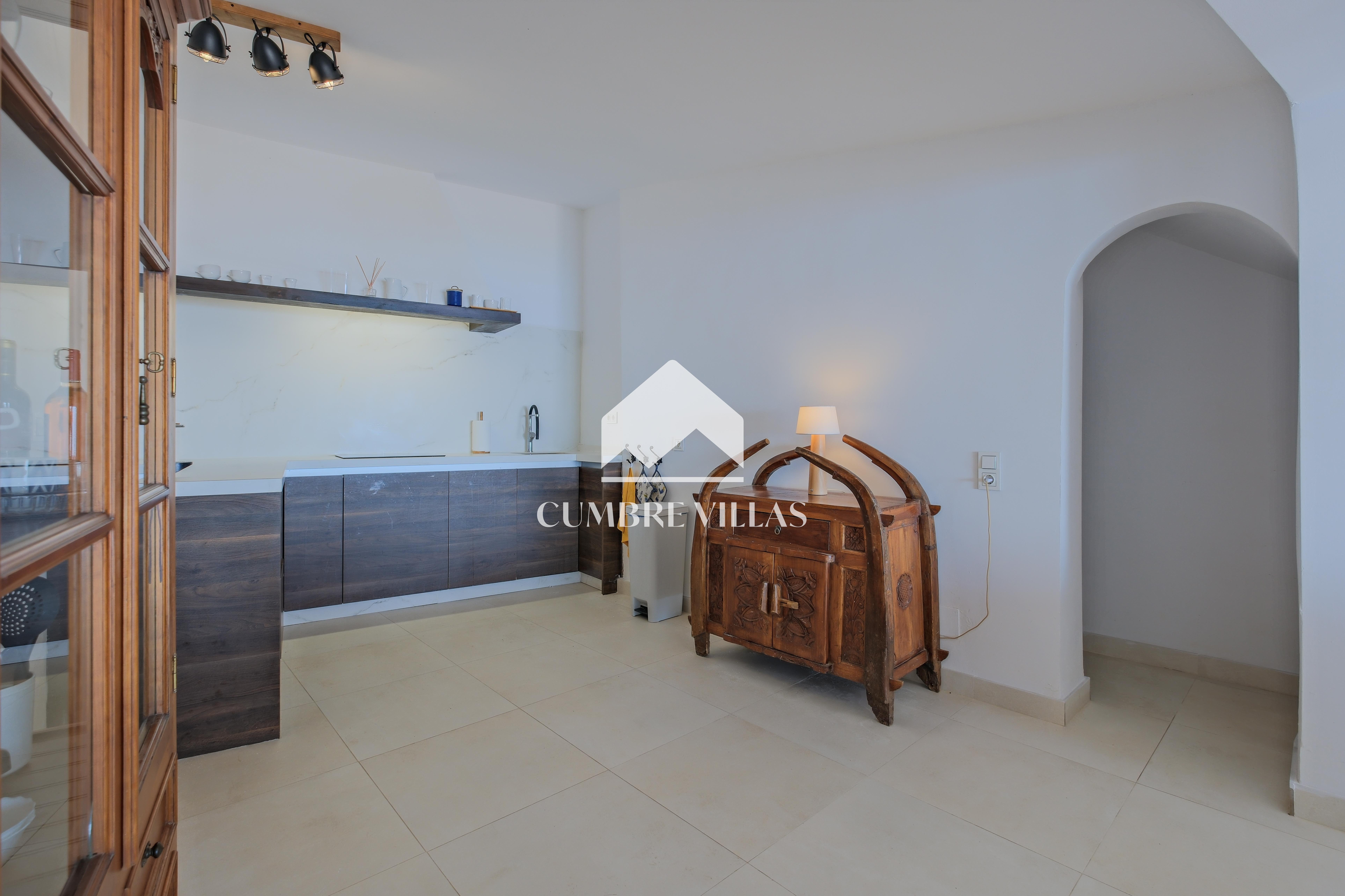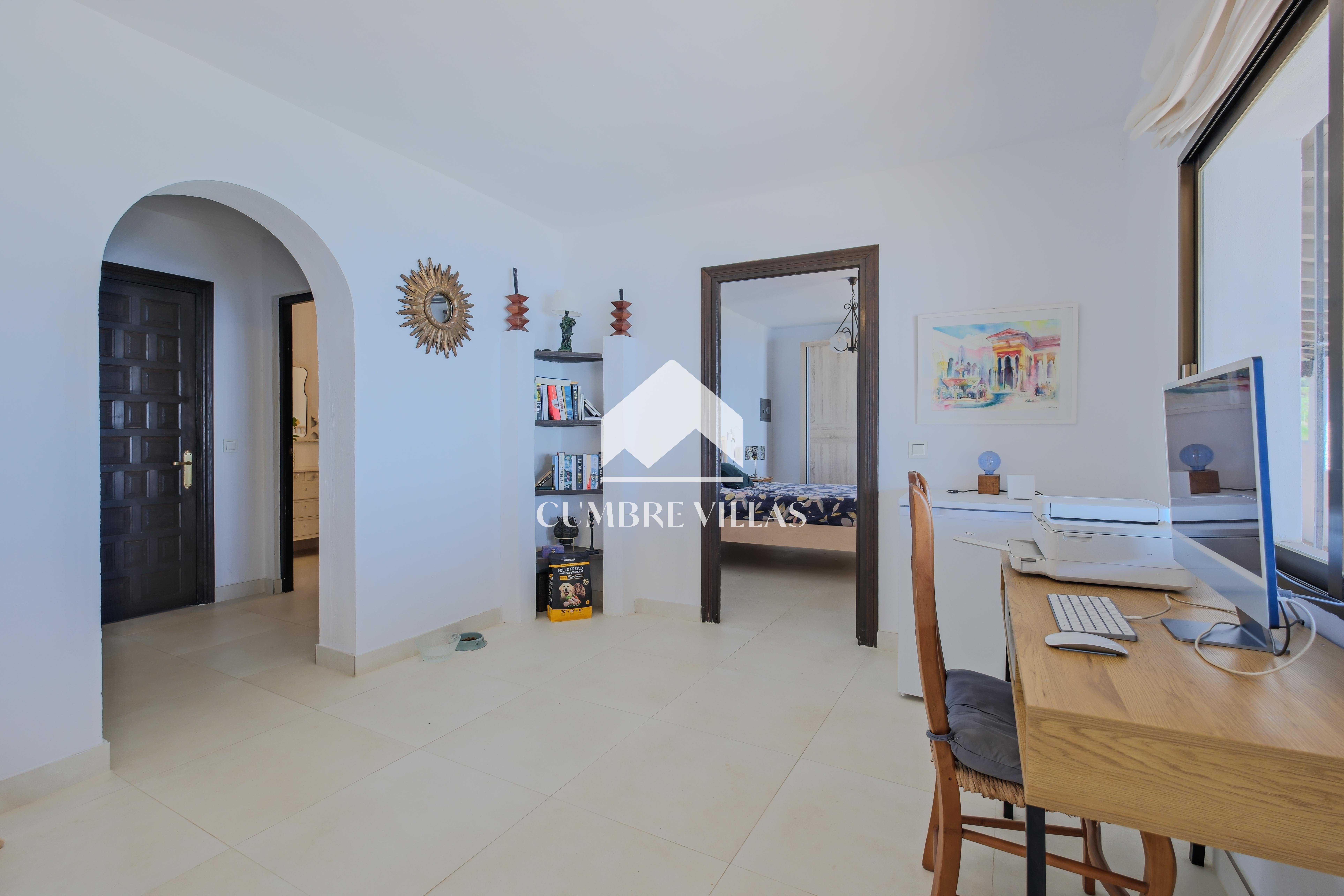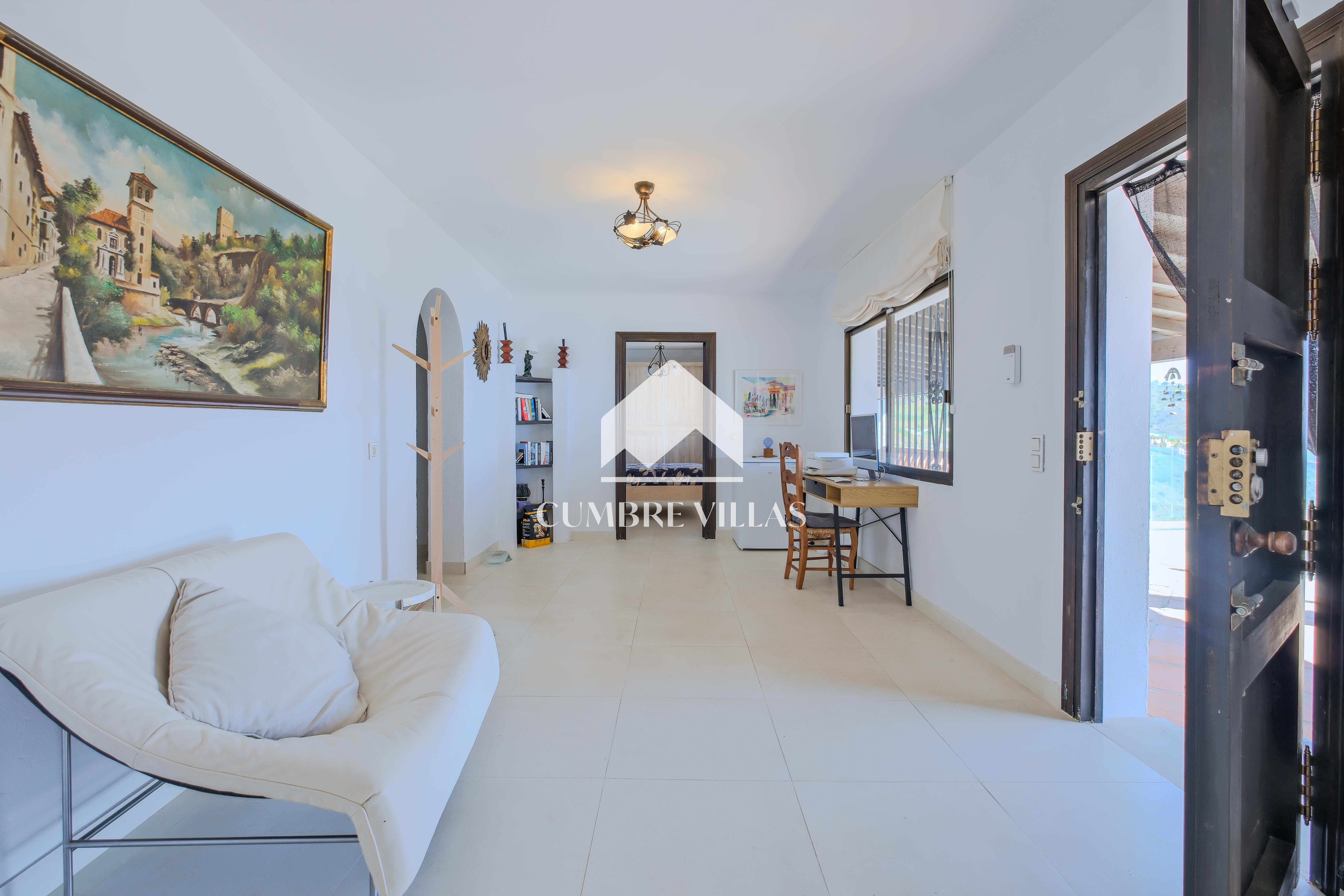 A spacious and elegant entrance hall with a study area welcomes you inside. To the left, a bright living room with large windows and wooden ceilings offers impressive views and direct access to the outdoor areas. To the right, at the end of the space, is a large open-plan kitchen and a pantry.