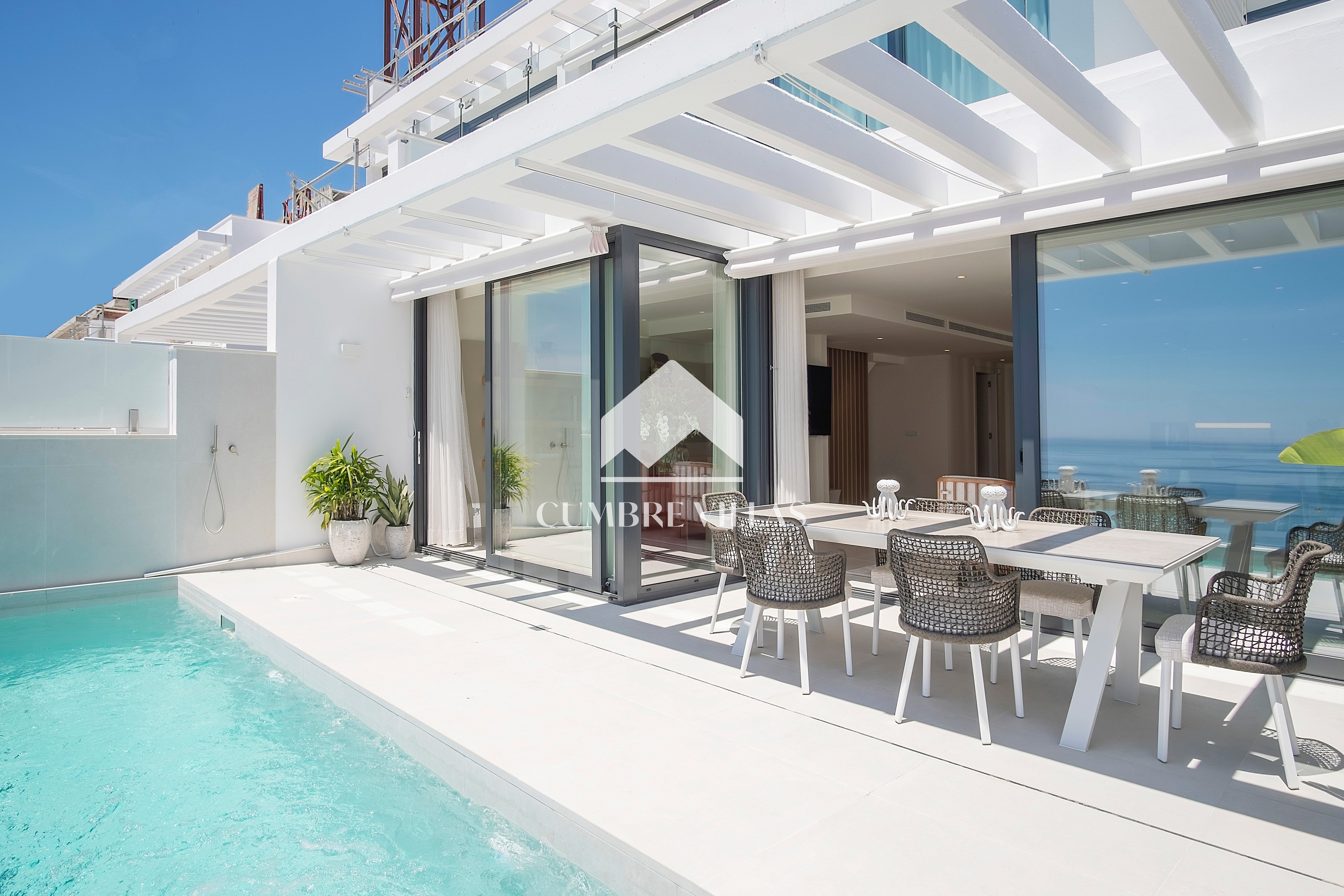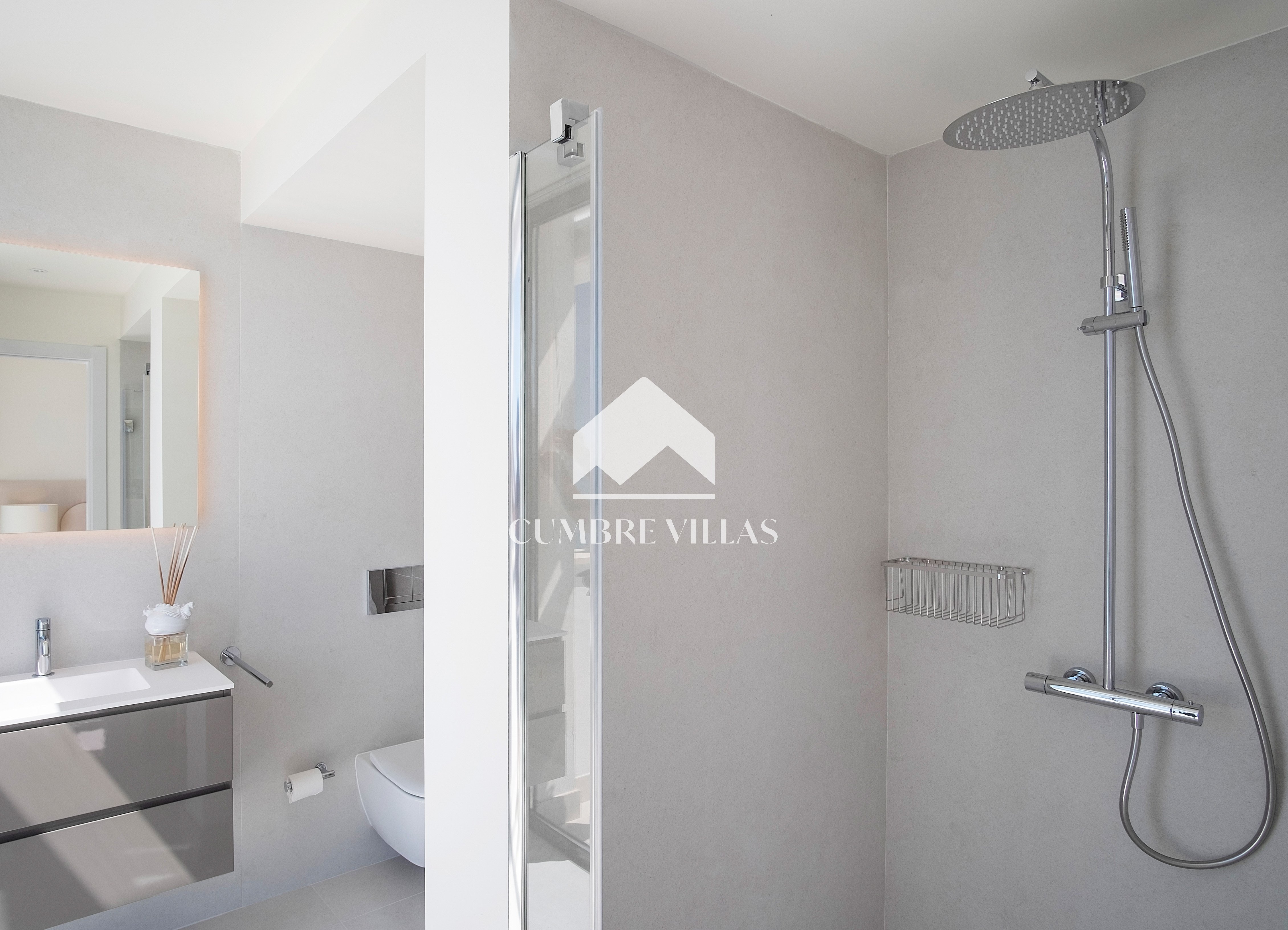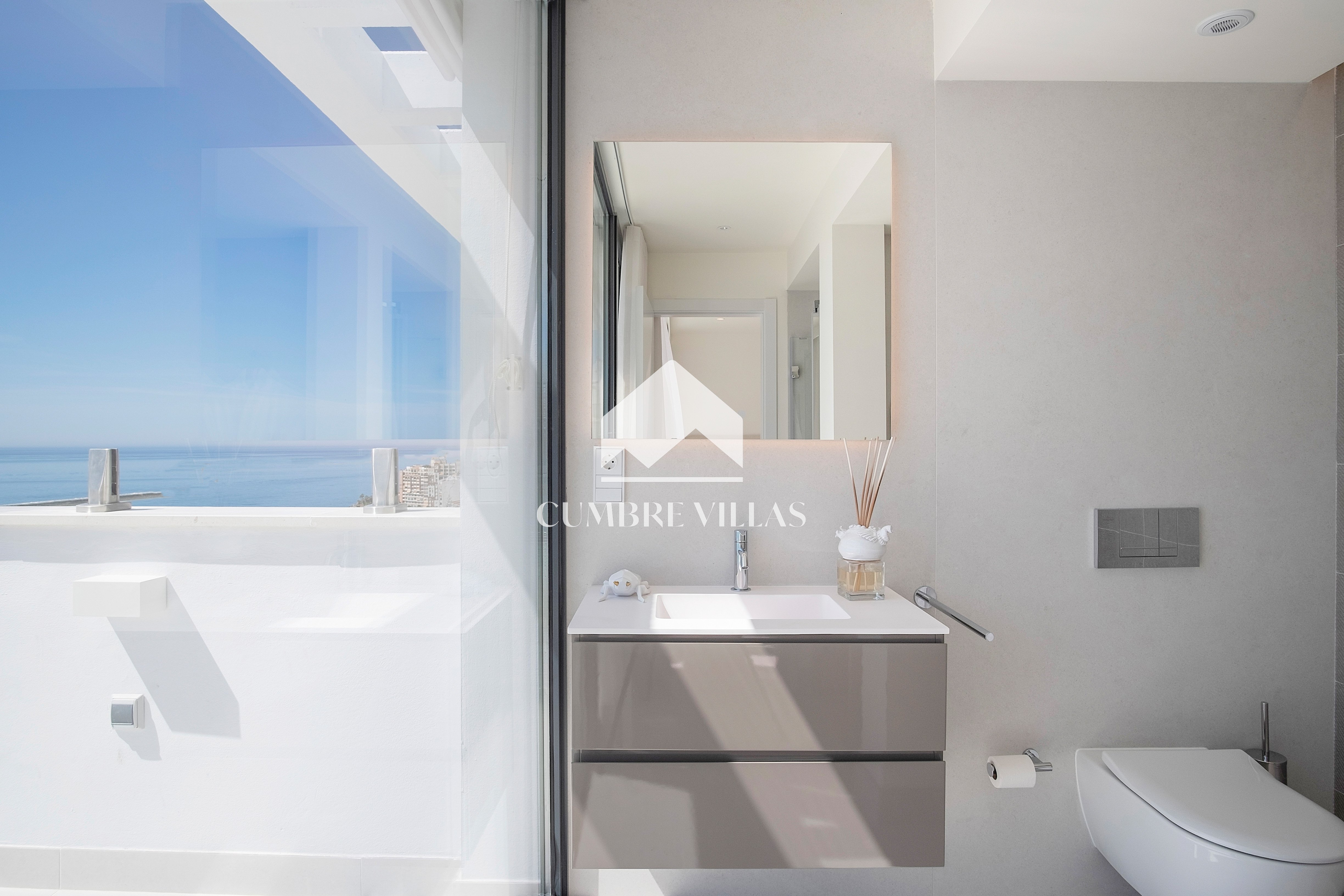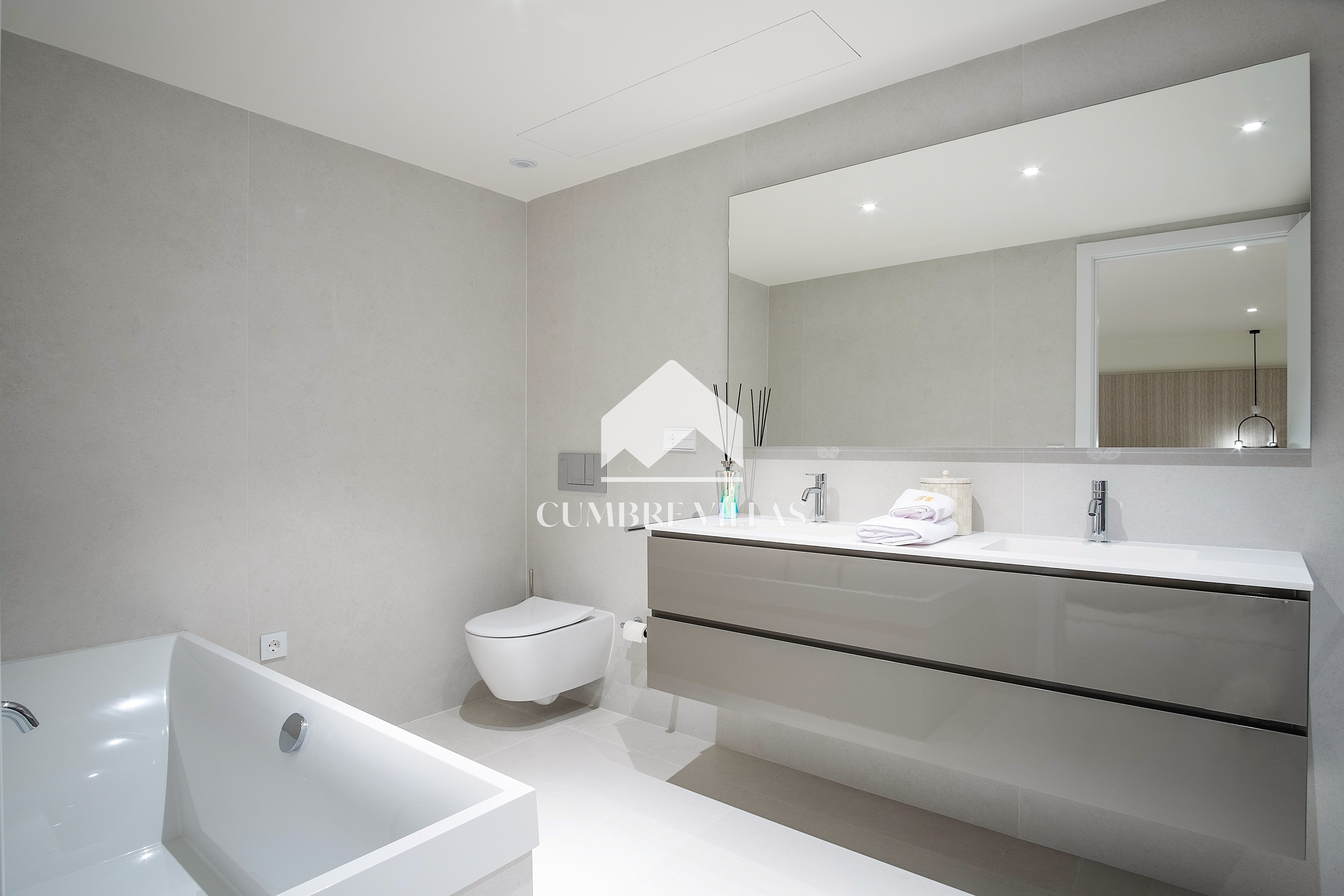The first floor showcases 2 en-suite bedrooms and ample fitted wardrobes. The bedrooms have glass sliding doors that open directly to a terrace. One floor up, the staircase/lift provides access to a fabulous rooftop solarium and a technical terrace – the perfect place to install a jacuzzi or to just relax and enjoy the breathtaking views in all privacy.