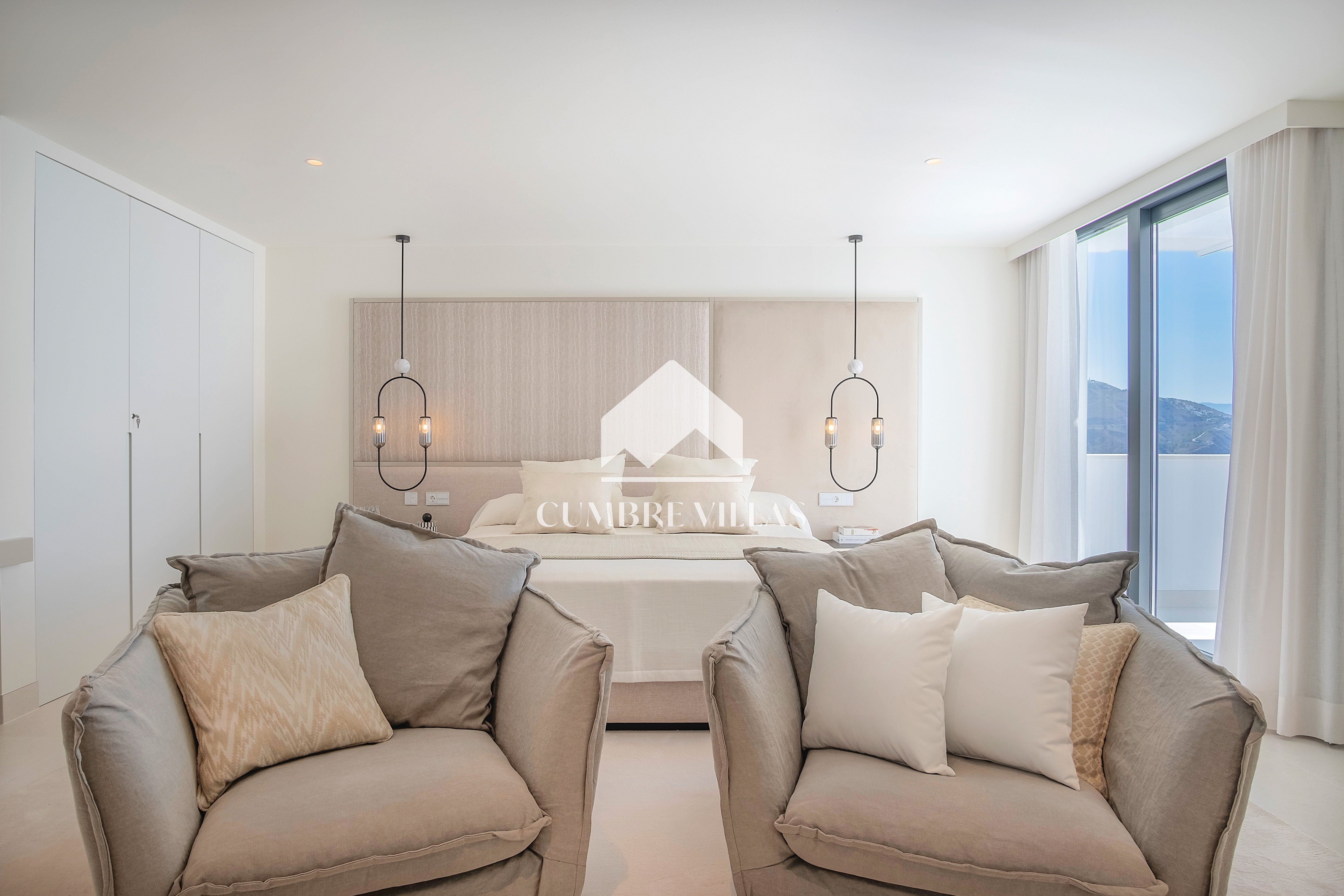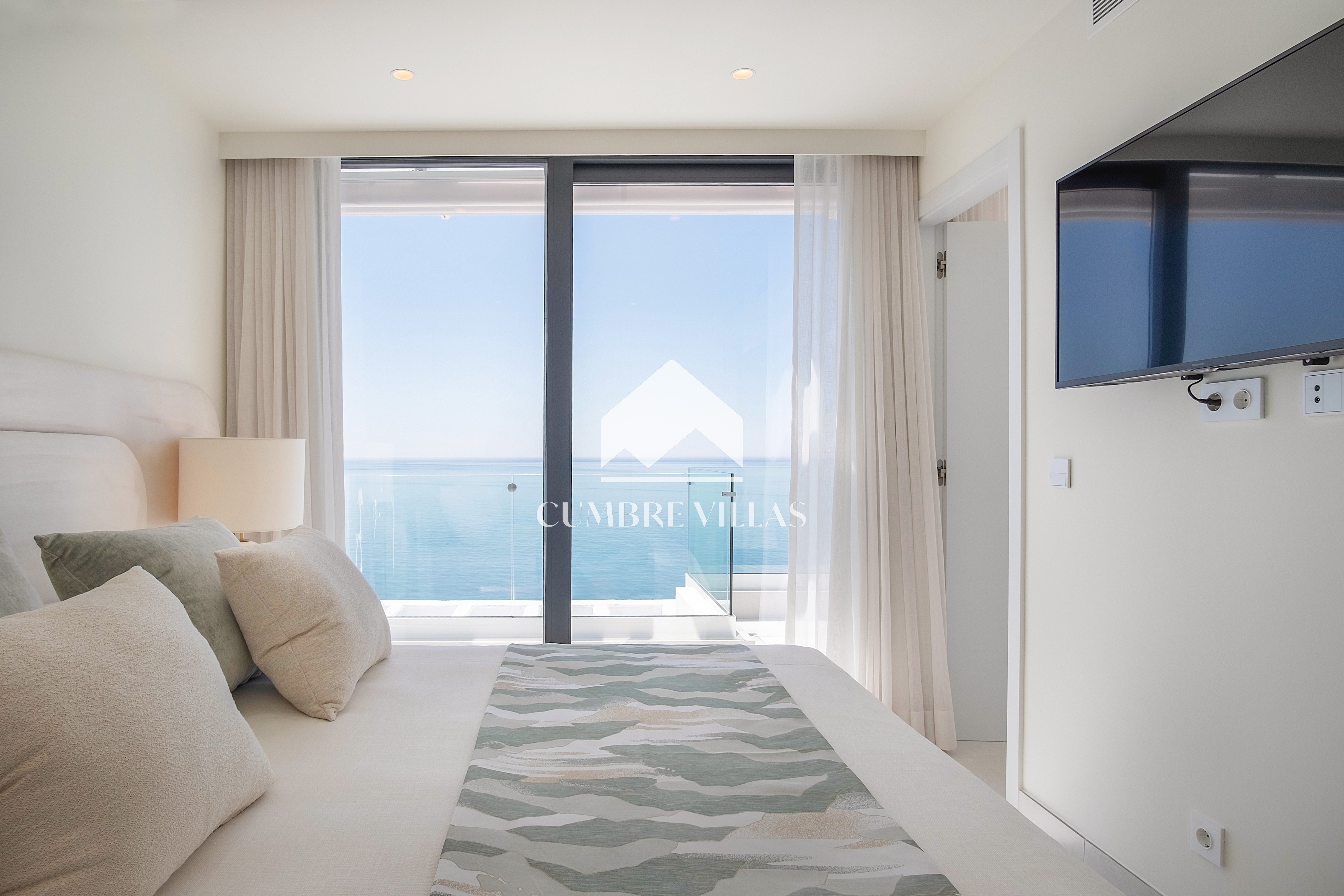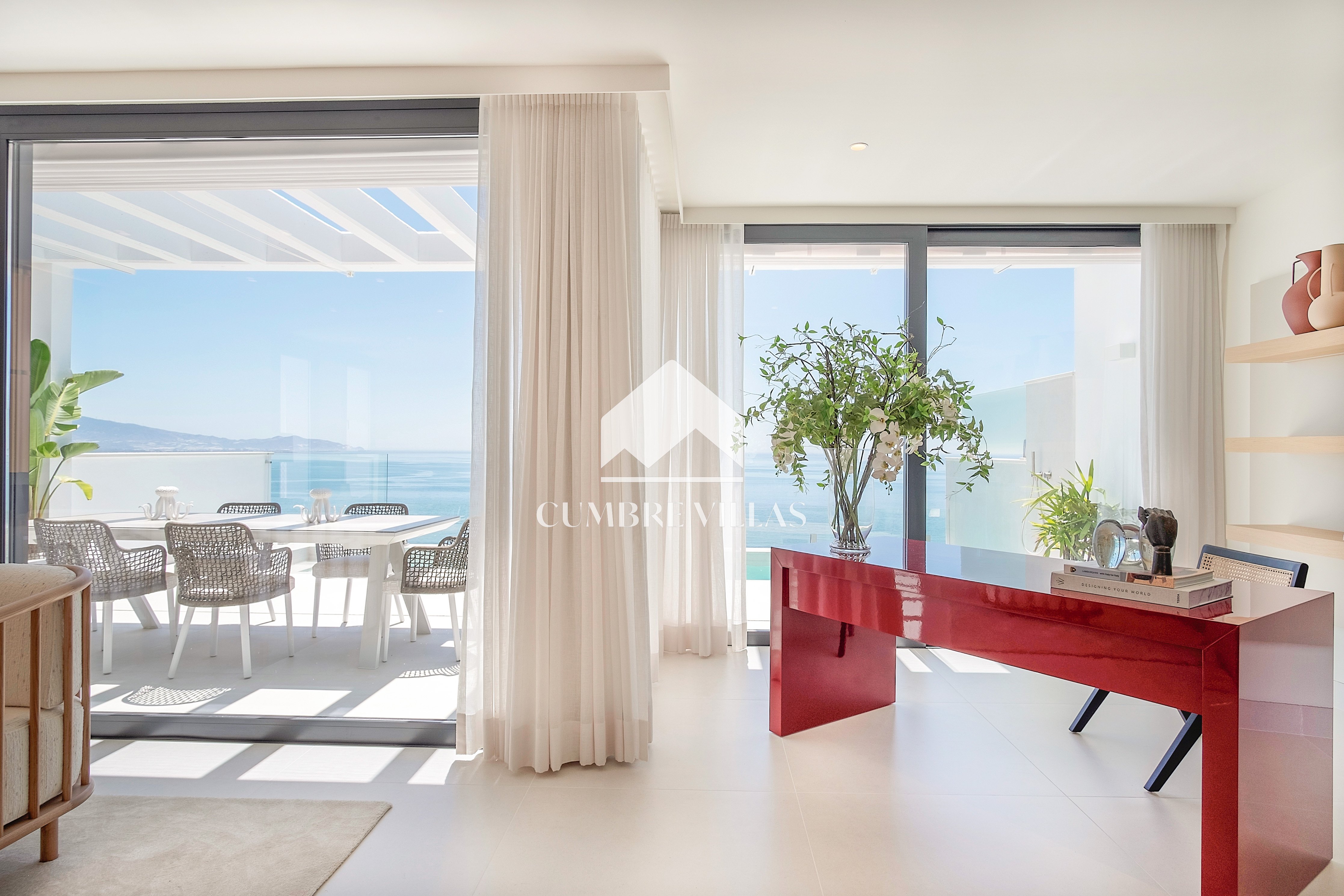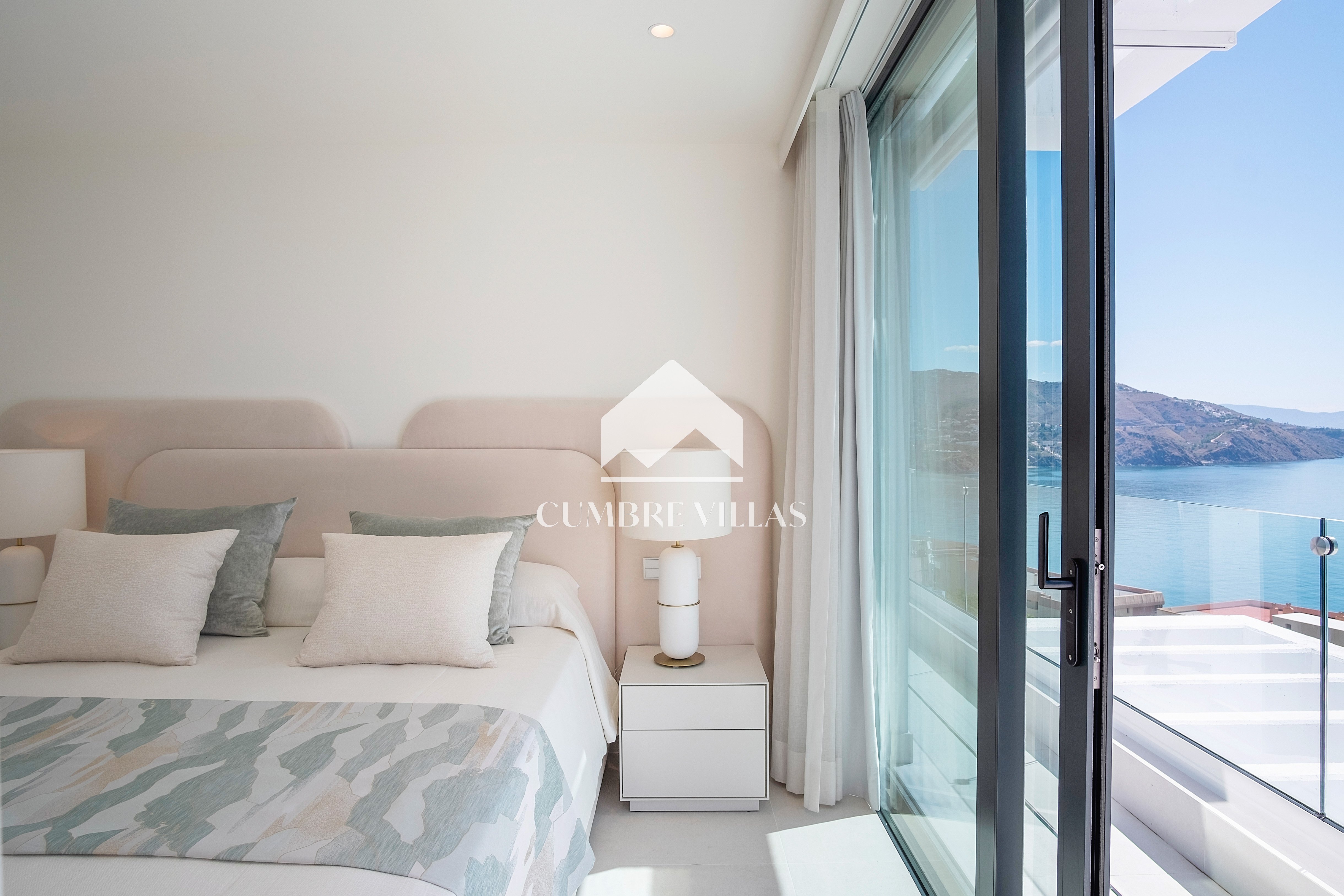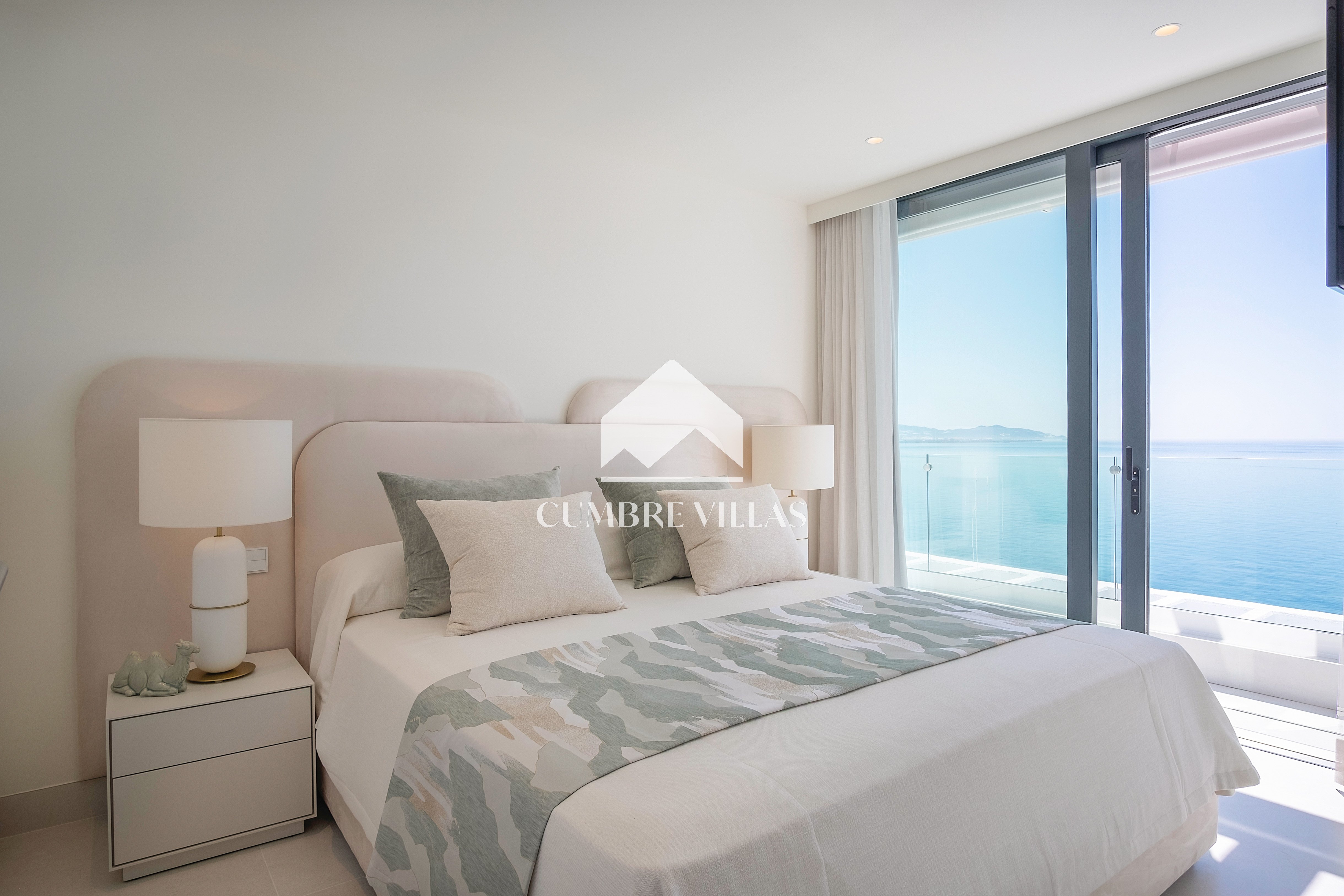 This villa is located on the far-right side of the development. Access to the property is from the East side, next to an area which is reserved for the lift and the staircase. A bright and spacious, open-plan living room and a fully-fitted kitchen with high-end appliances opens up to the interior. This area includes an open side room that can be used as a dining area. There is also a guest toilet and a utility room. Large bay windows seamlessly connect the interior with the pool terrace and flood the interior with abundant natural light, creating a warm and inviting ambiance throughout. The astonishing, 180º panoramic views over the Mediterranean Sea and the Costa Tropical can be enjoyed both from the outside and from the inside of the property.