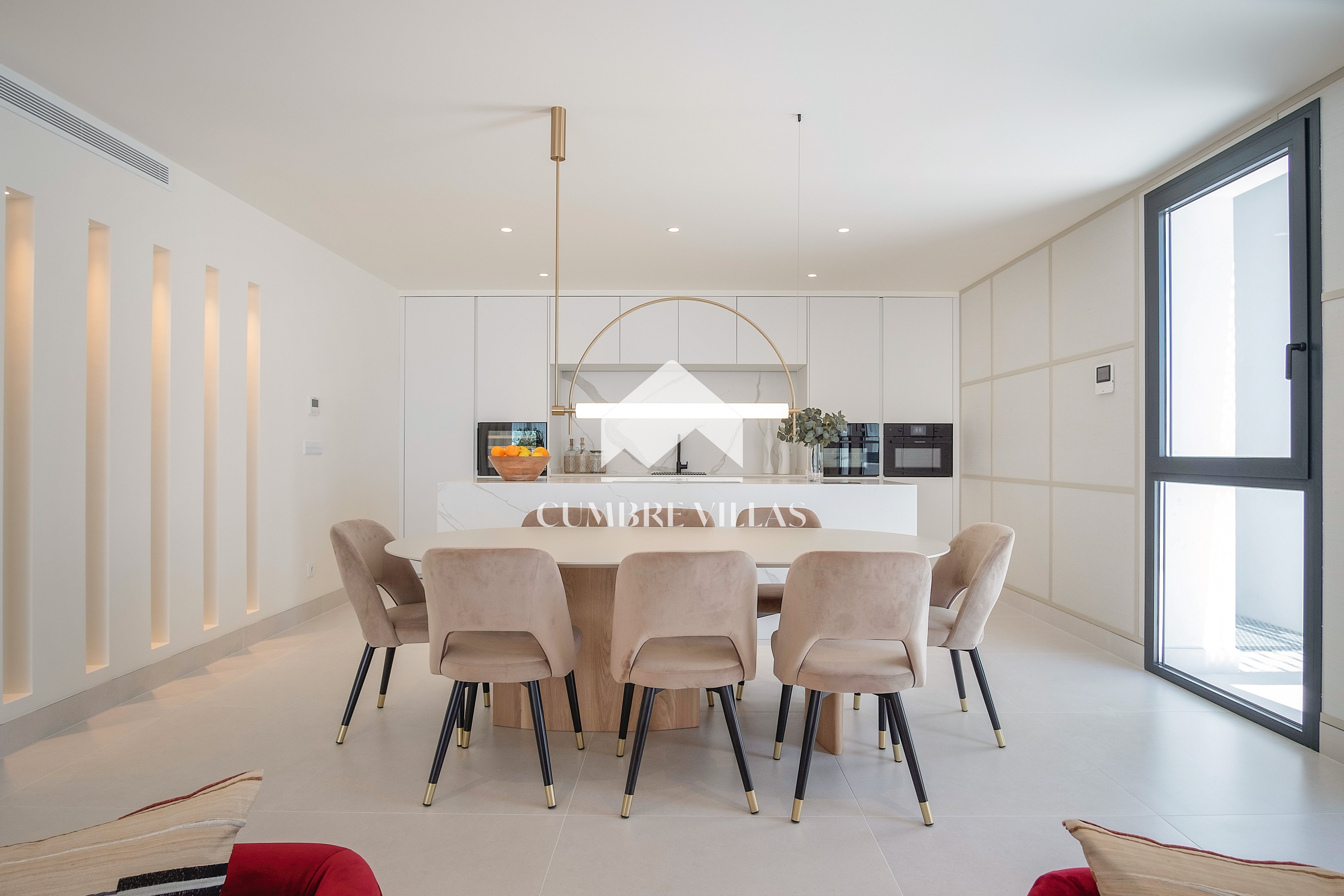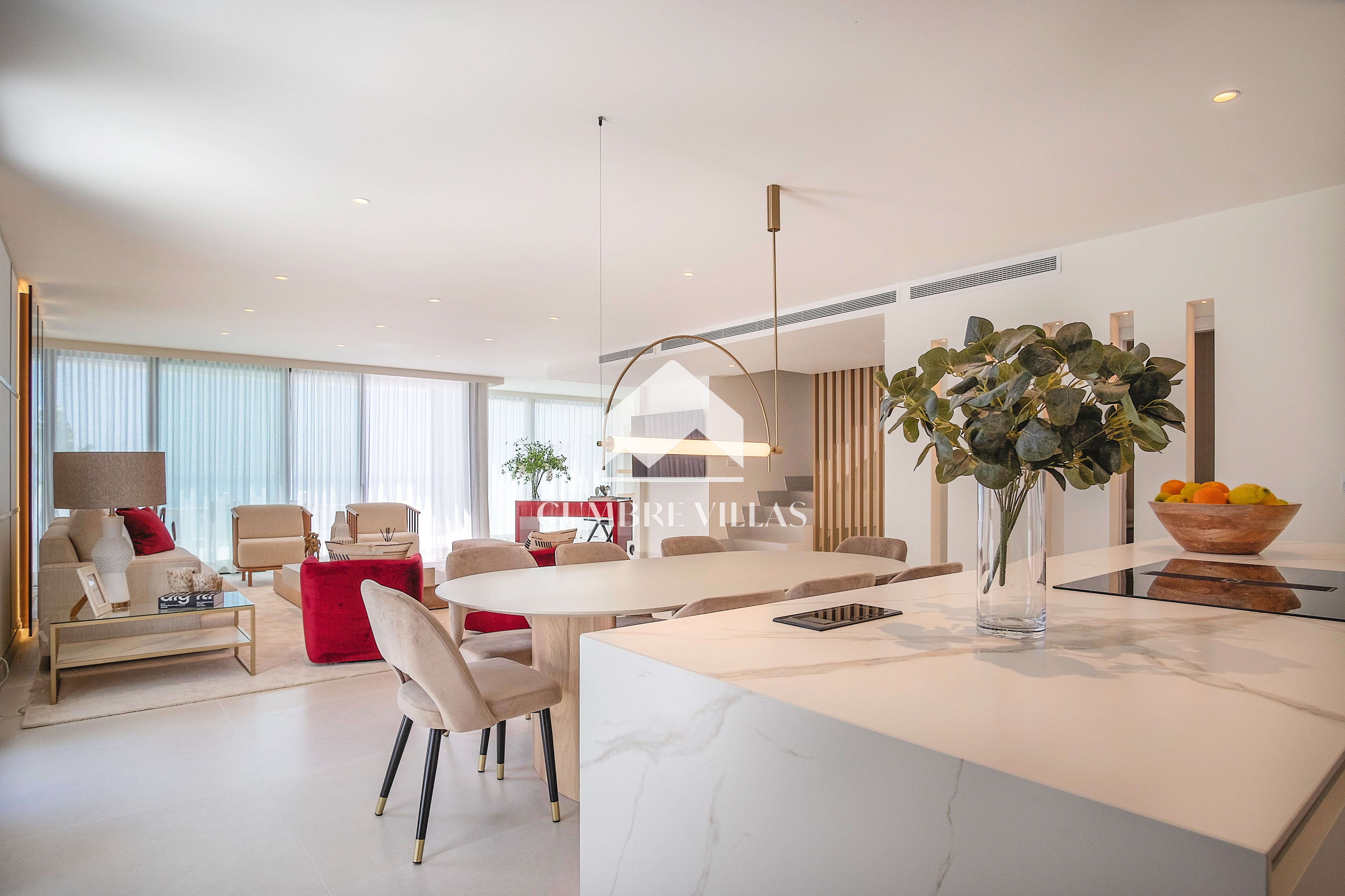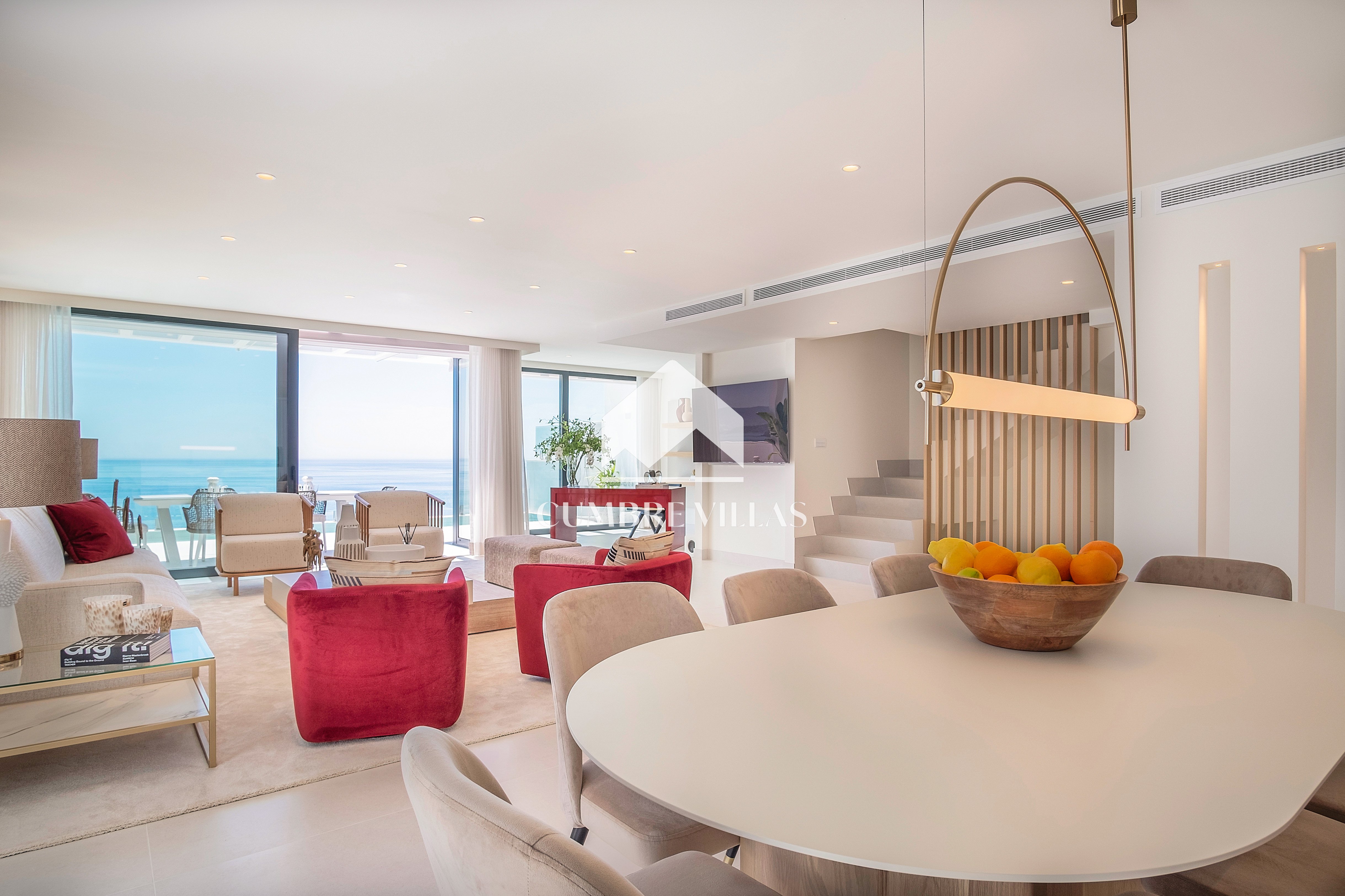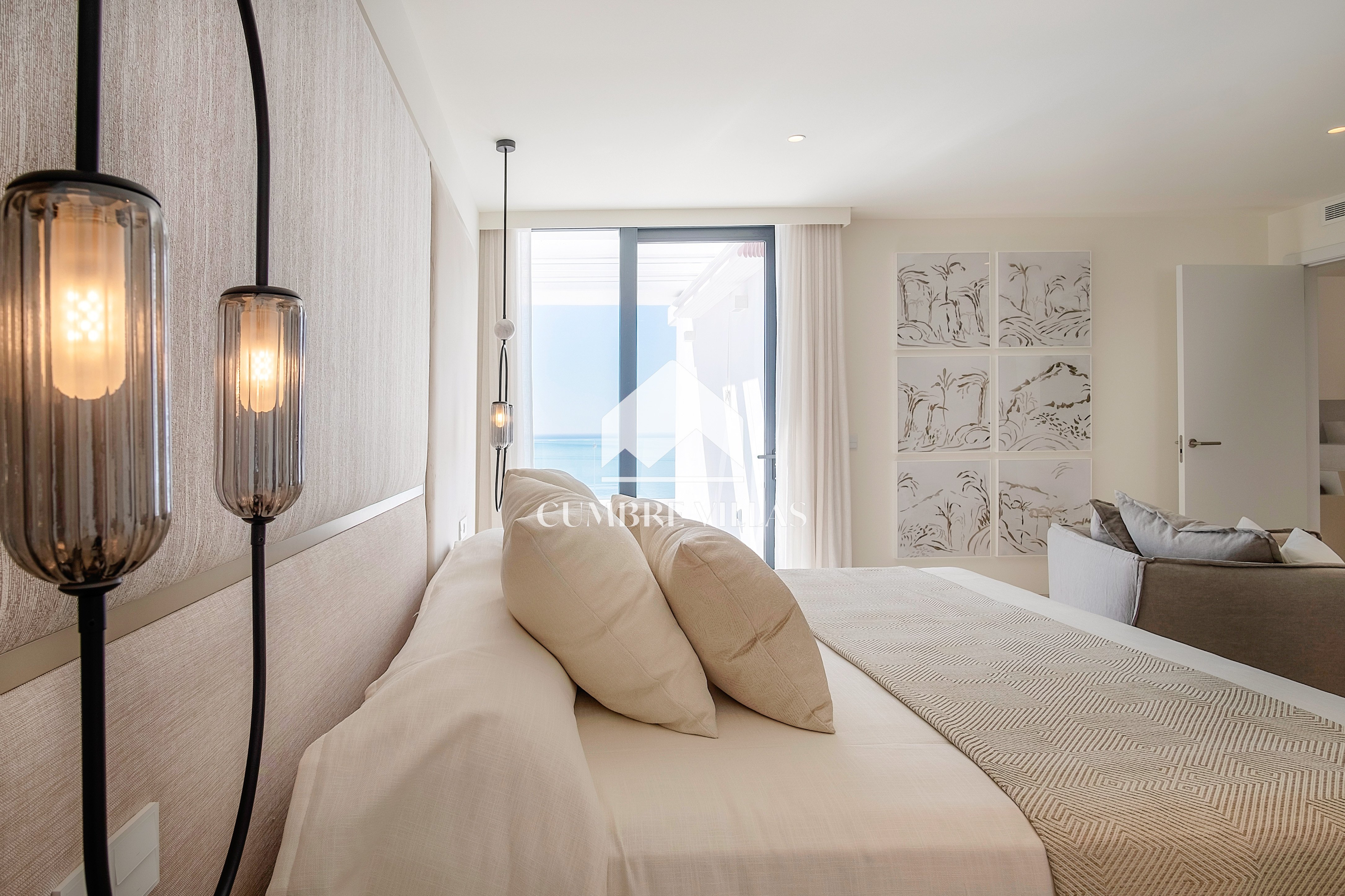 This villa is located on the far-right side of the development. Access to the property is from the East side, next to an area which is reserved for the lift and the staircase. A bright and spacious, open-plan living room and a fully-fitted kitchen with high-end appliances opens up to the interior. This area includes an open side room that can be used as a dining area. There is also a guest toilet and a utility room. Large bay windows seamlessly connect the interior with the pool terrace and flood the interior with abundant natural light, creating a warm and inviting ambiance throughout. The astonishing, 180º panoramic views over the Mediterranean Sea and the Costa Tropical can be enjoyed both from the outside and from the inside of the property.