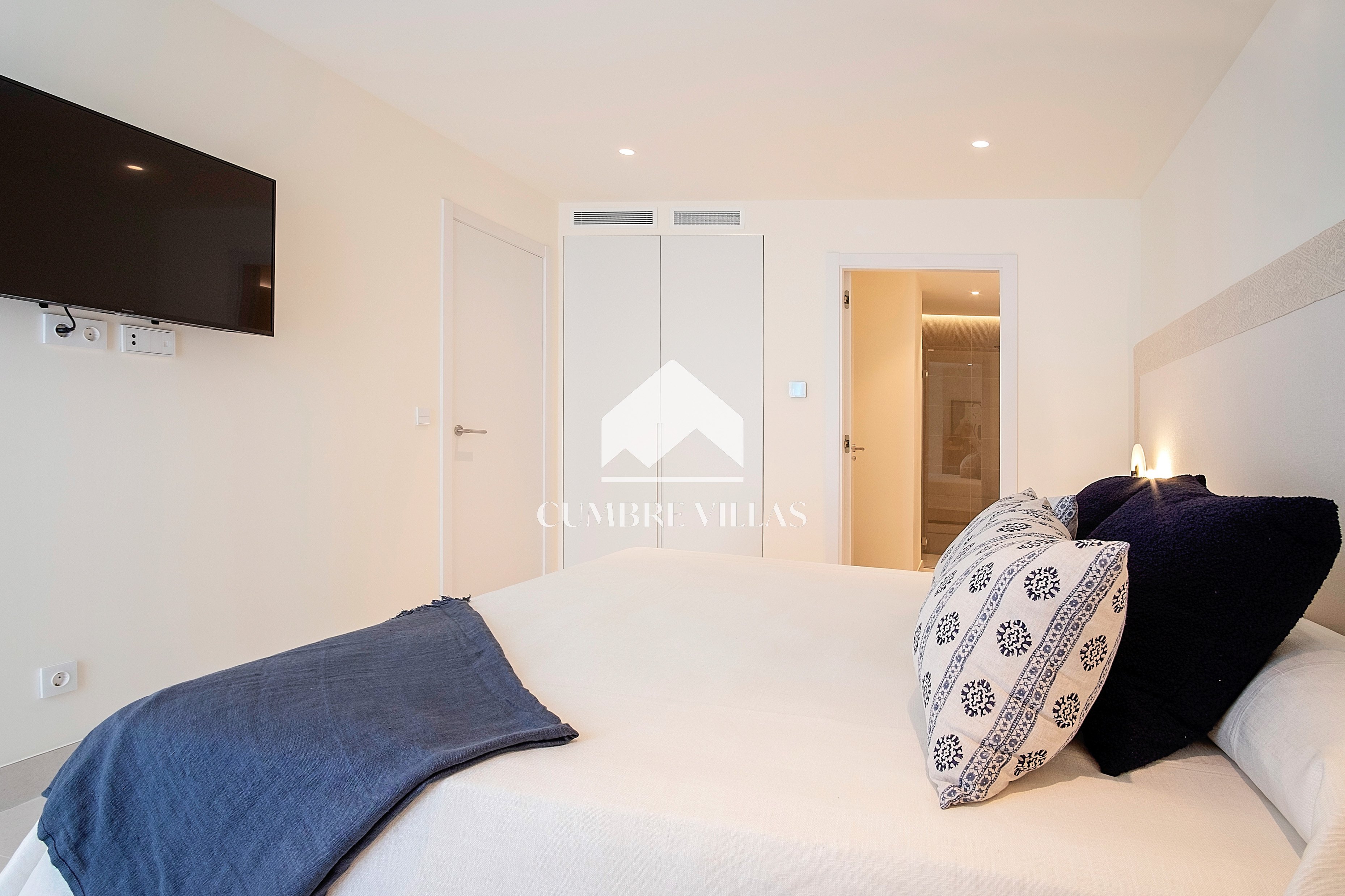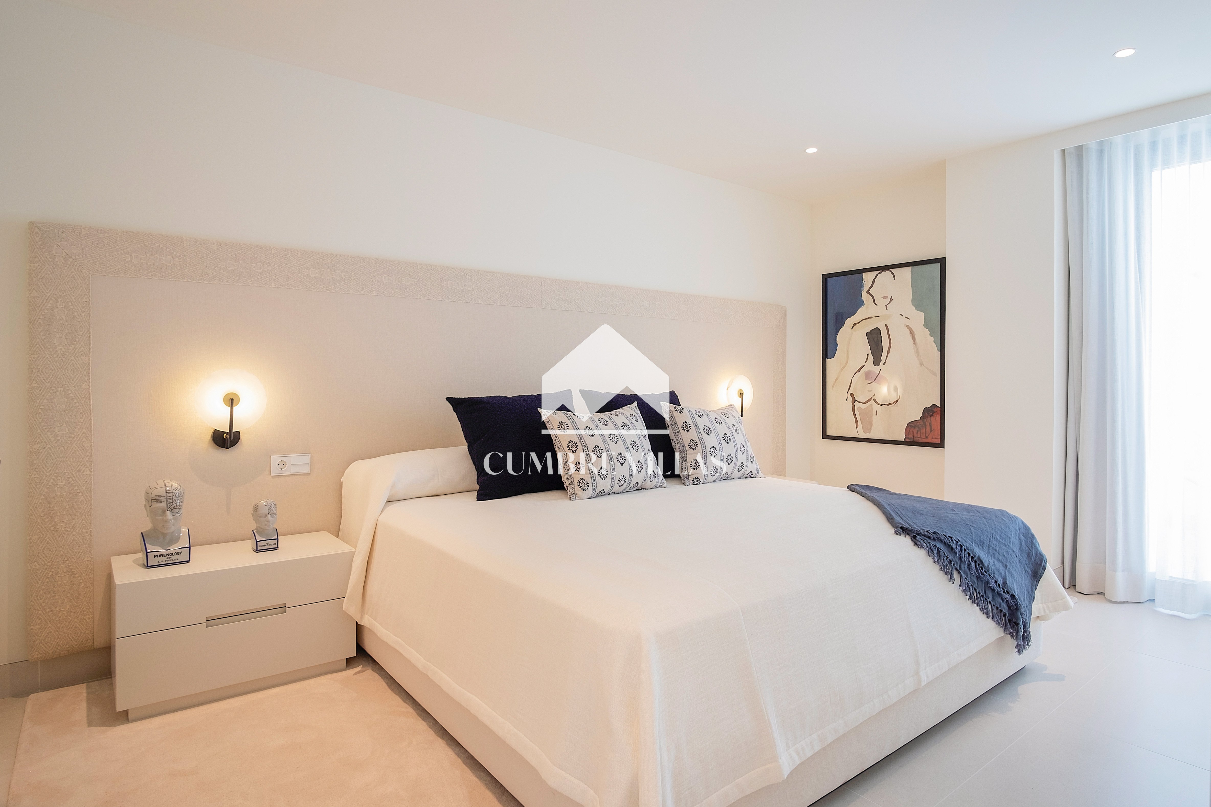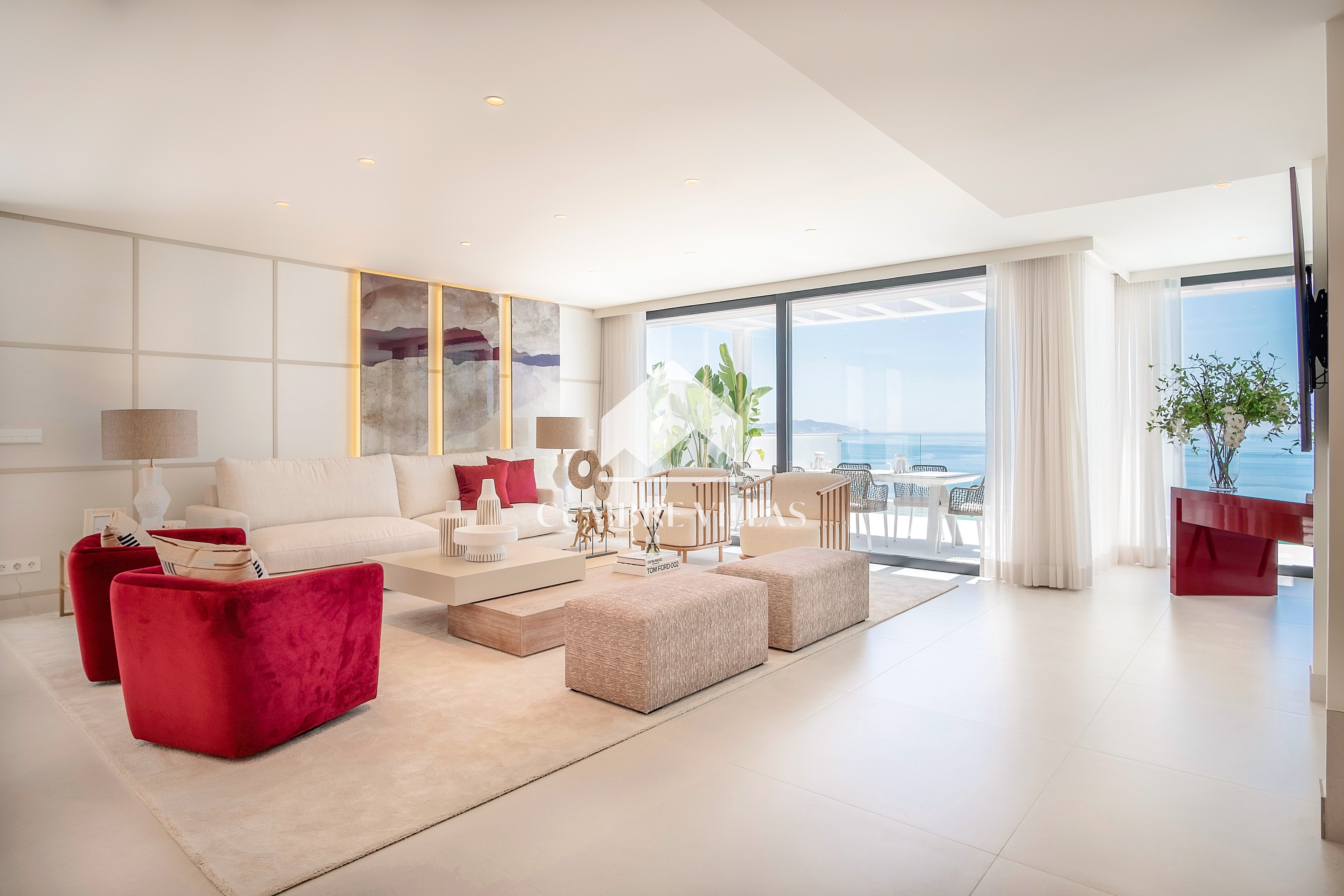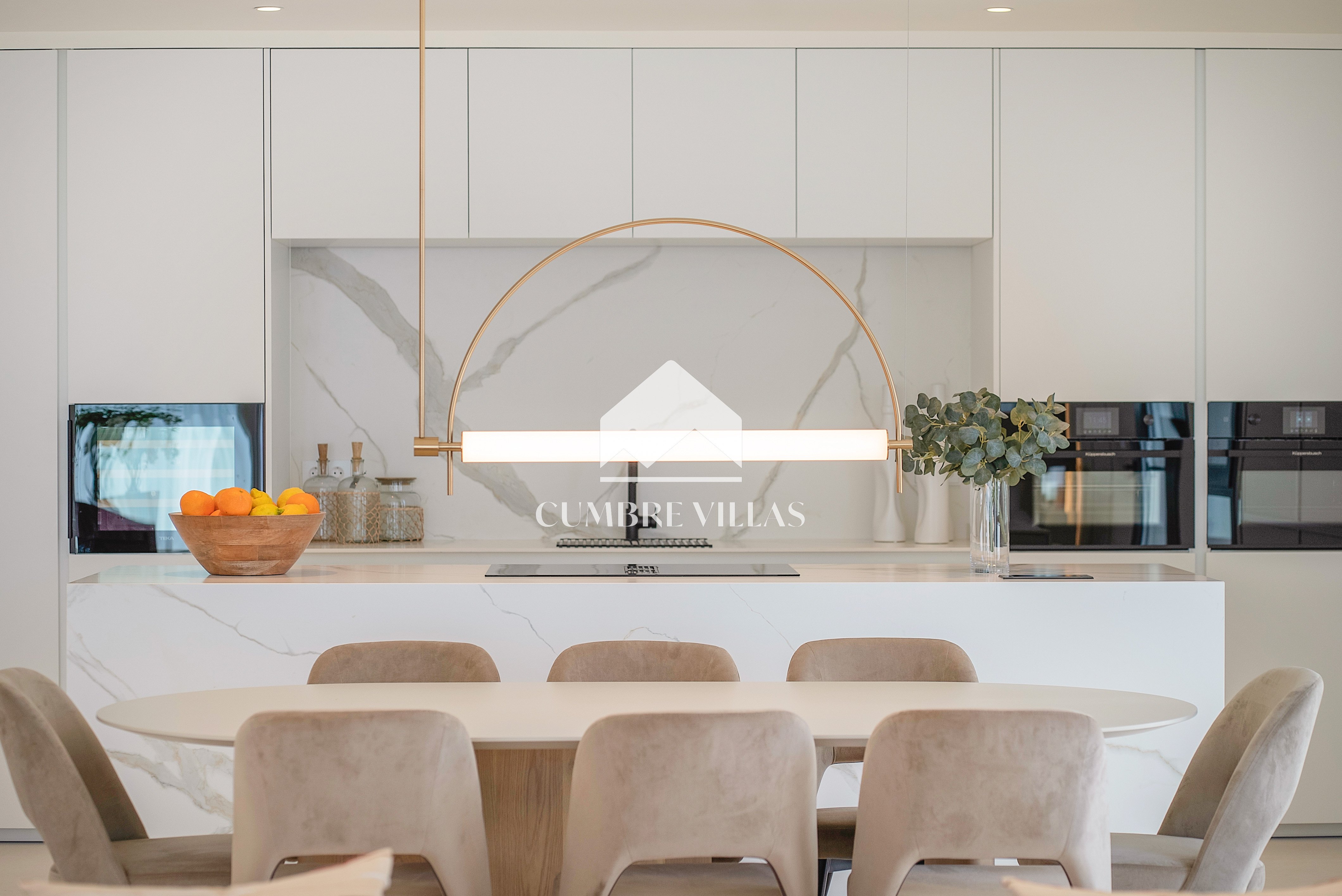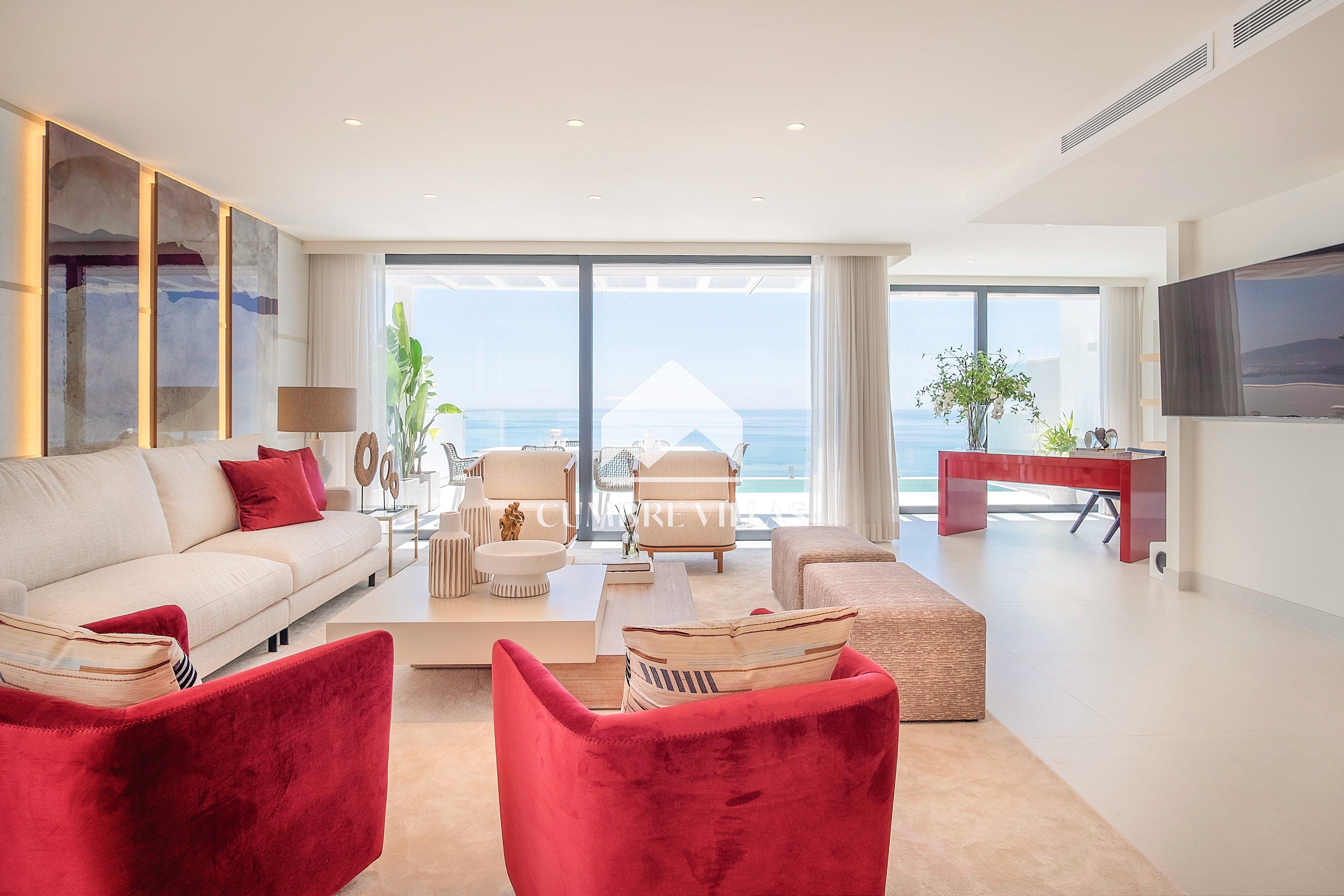 This villa is located on the far-right side of the development. Access to the property is from the East side, next to an area which is reserved for the lift and the staircase. A bright and spacious, open-plan living room and a fully-fitted kitchen with high-end appliances opens up to the interior. This area includes an open side room that can be used as a dining area. There is also a guest toilet and a utility room. Large bay windows seamlessly connect the interior with the pool terrace and flood the interior with abundant natural light, creating a warm and inviting ambiance throughout. The astonishing, 180º panoramic views over the Mediterranean Sea and the Costa Tropical can be enjoyed both from the outside and from the inside of the property.