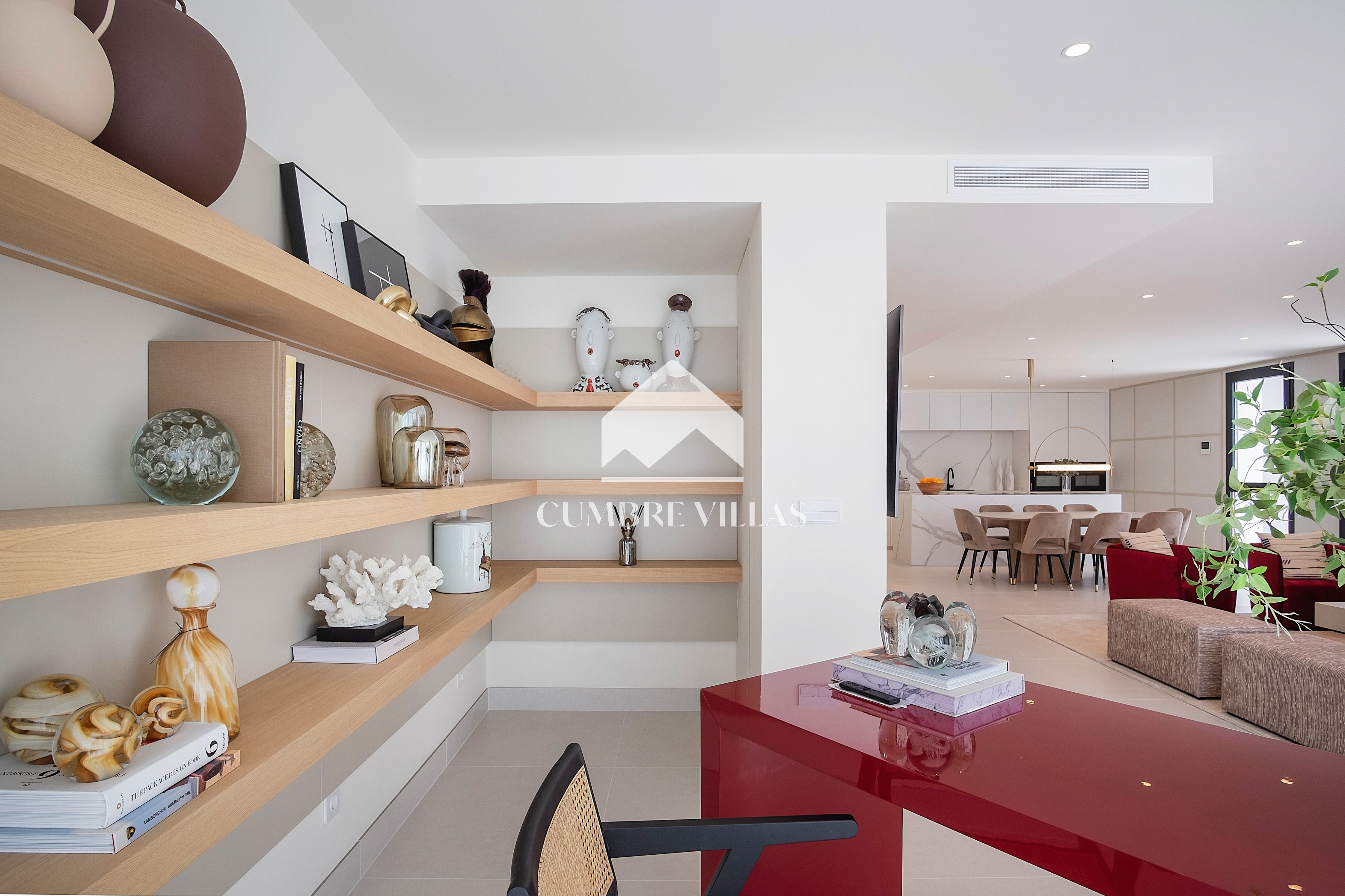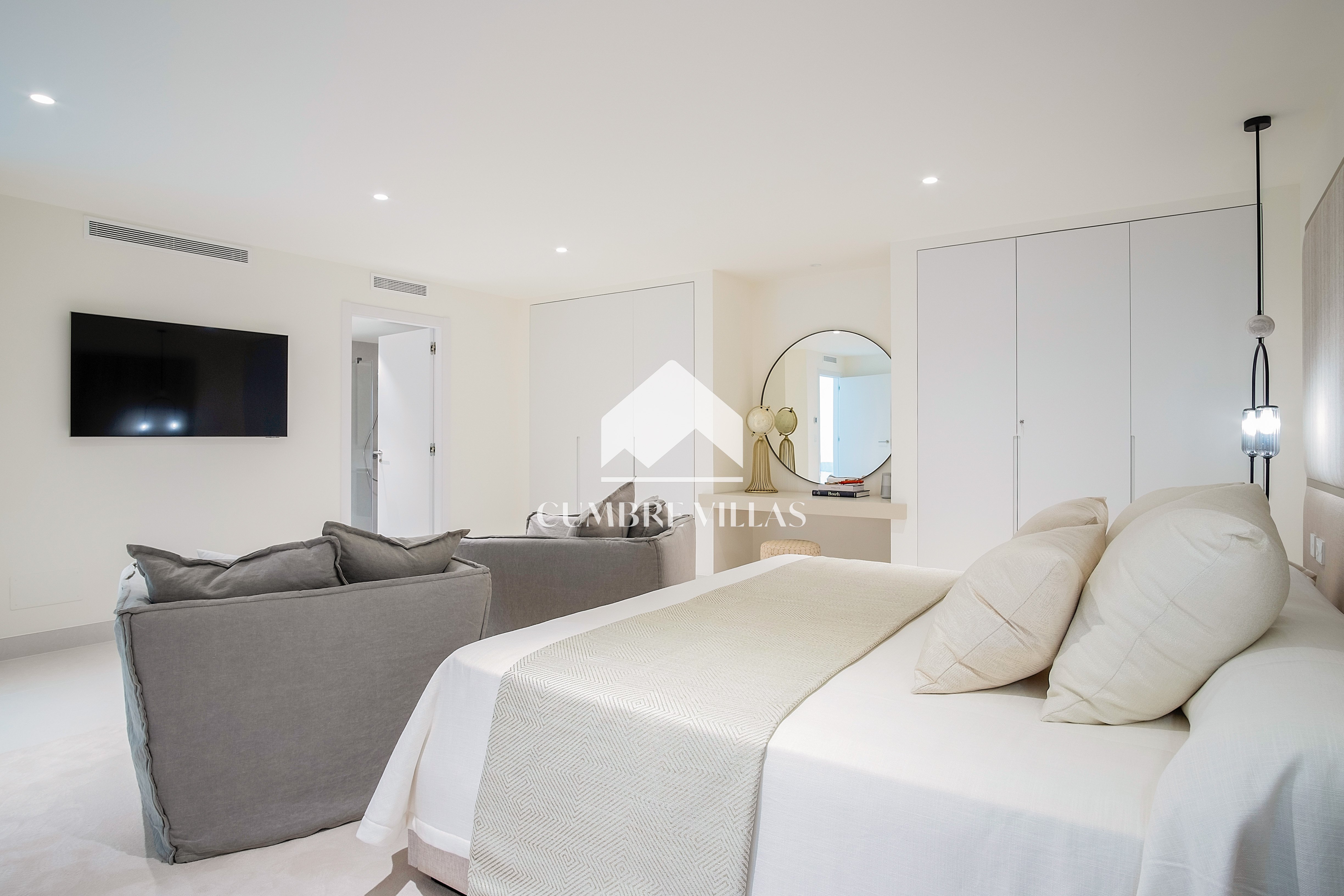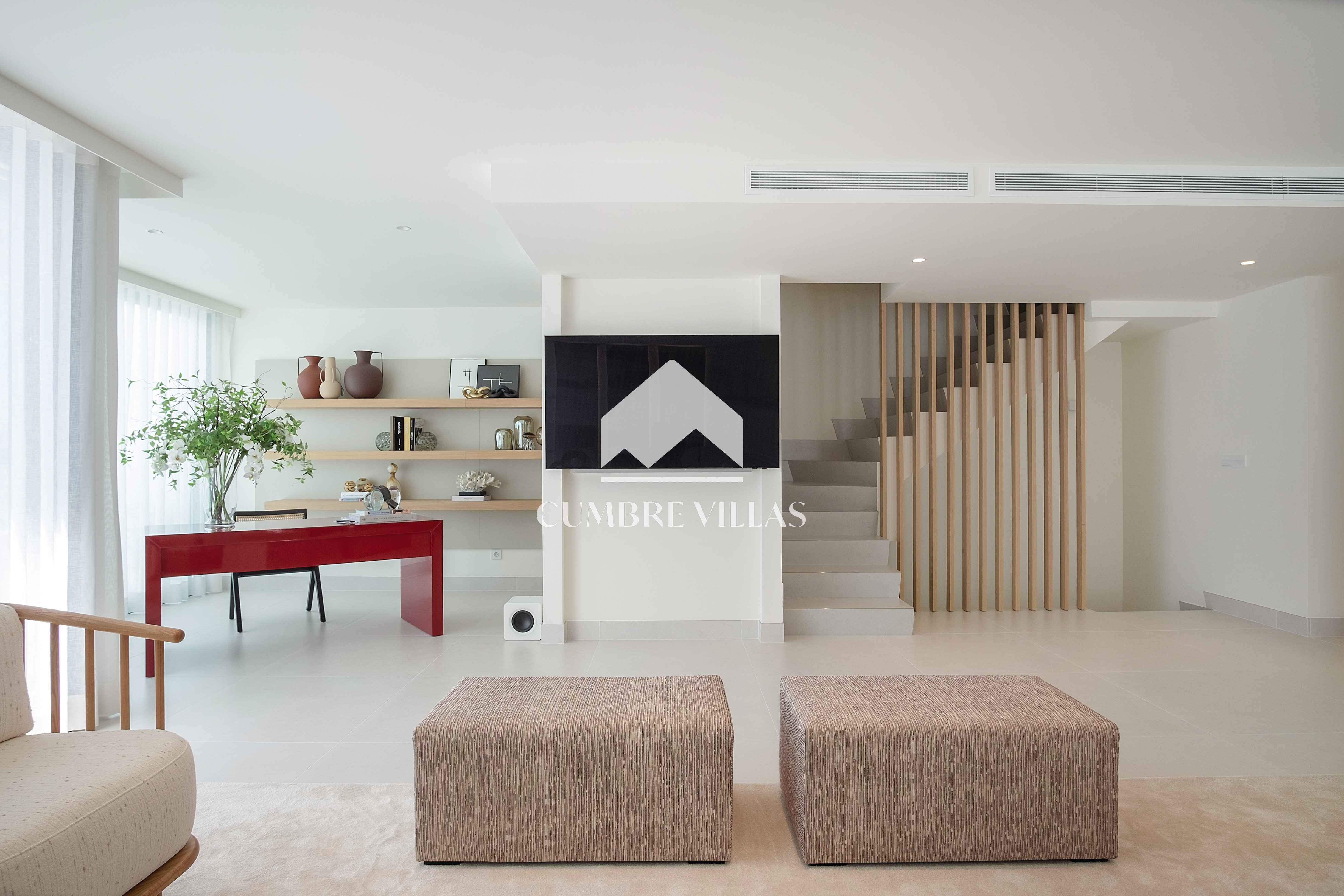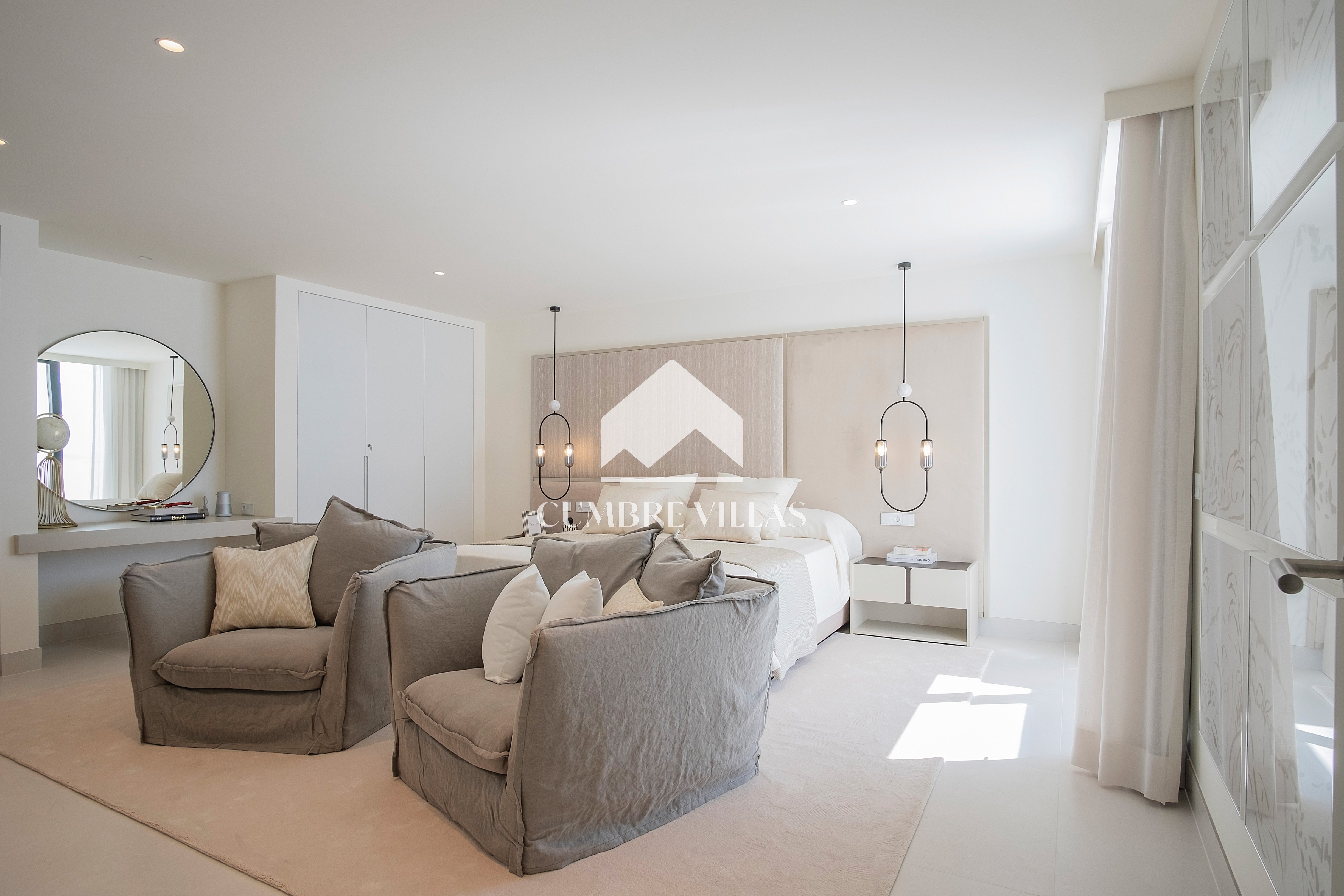This villa is located on the far-right side of the development. Access to the property is from the East side, next to an area which is reserved for the lift and the staircase. A bright and spacious, open-plan living room and a fully-fitted kitchen with high-end appliances opens up to the interior. This area includes an open side room that can be used as a dining area. There is also a guest toilet and a utility room. Large bay windows seamlessly connect the interior with the pool terrace and flood the interior with abundant natural light, creating a warm and inviting ambiance throughout. The astonishing, 180º panoramic views over the Mediterranean Sea and the Costa Tropical can be enjoyed both from the outside and from the inside of the property.