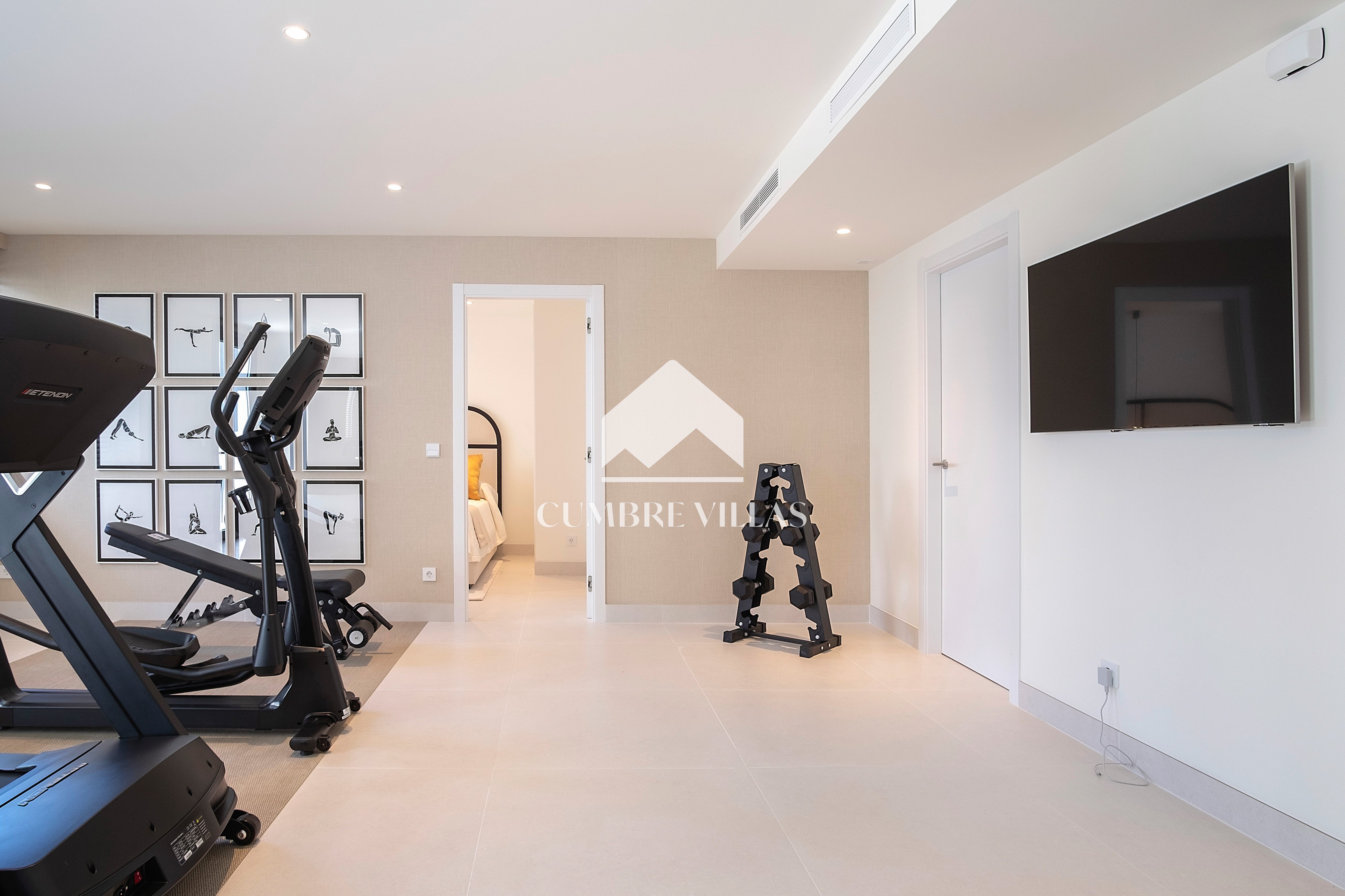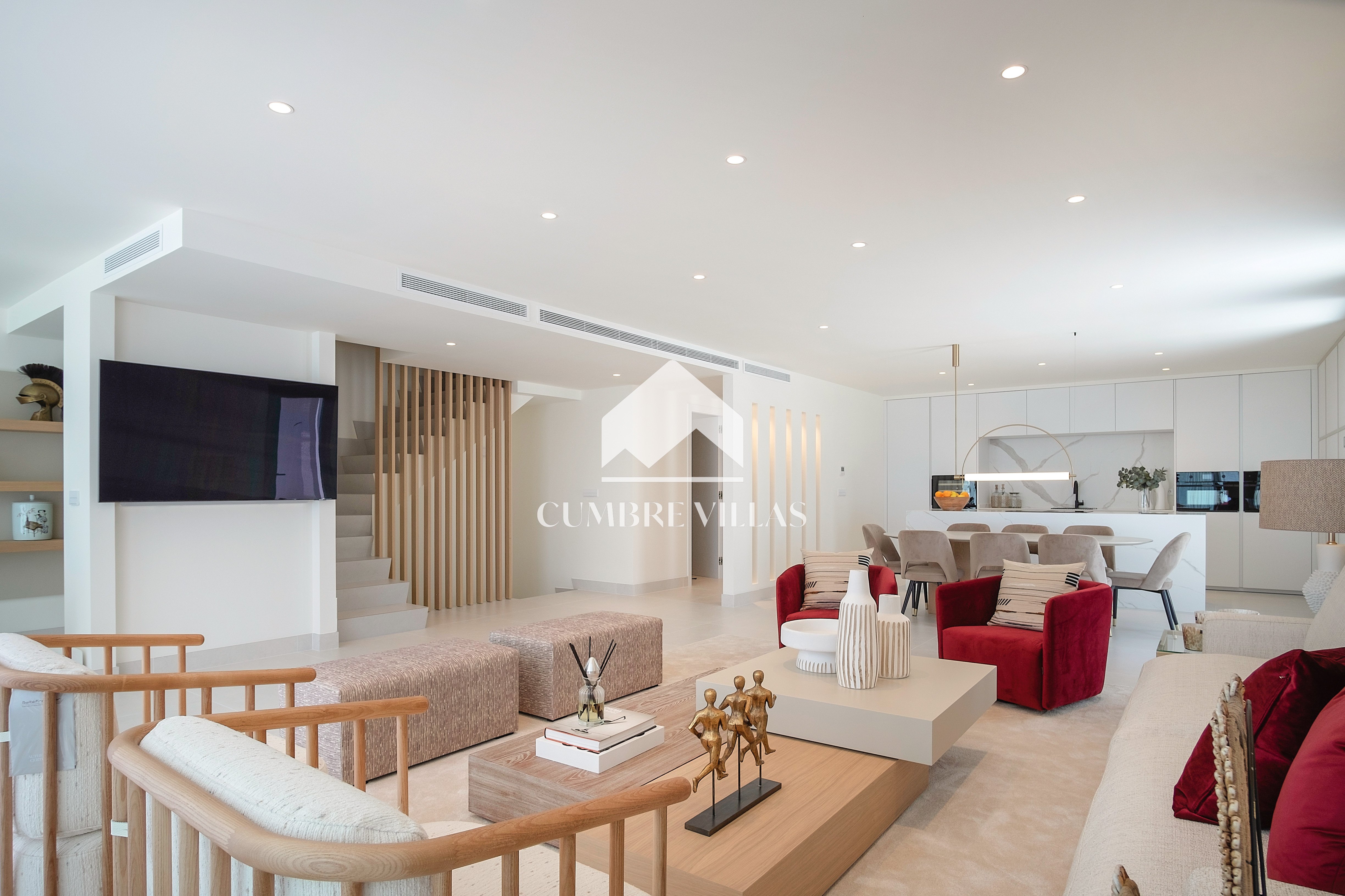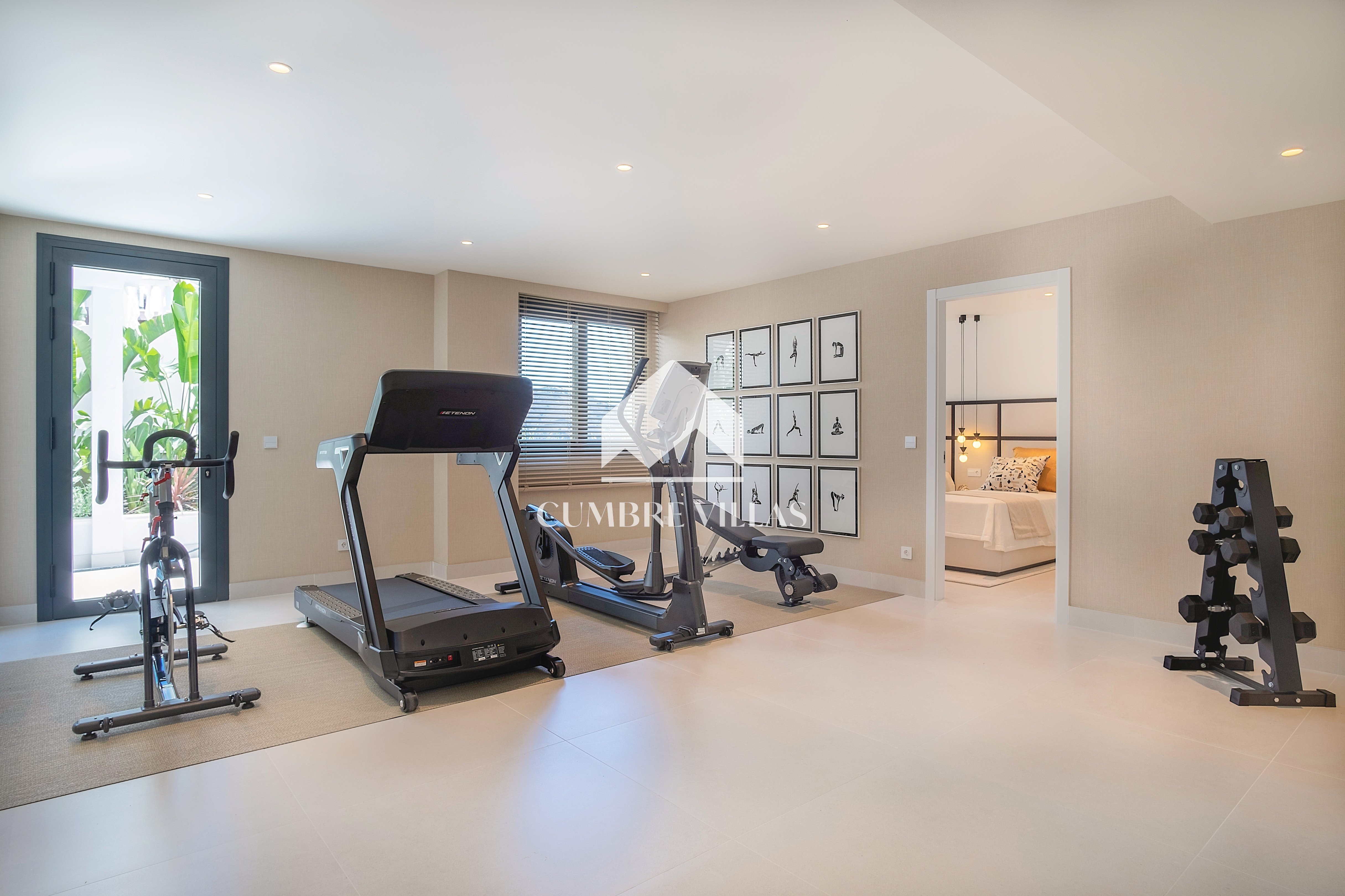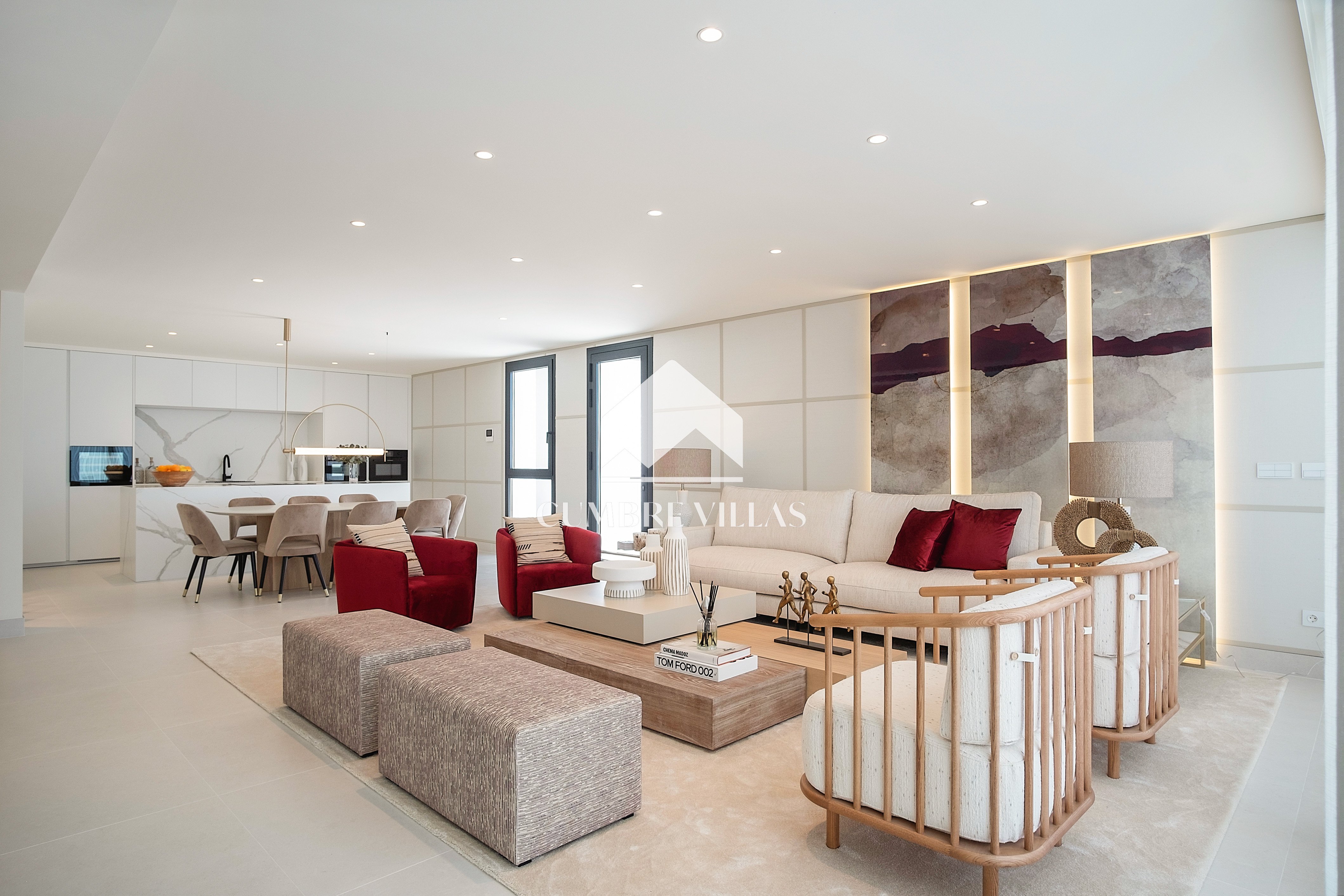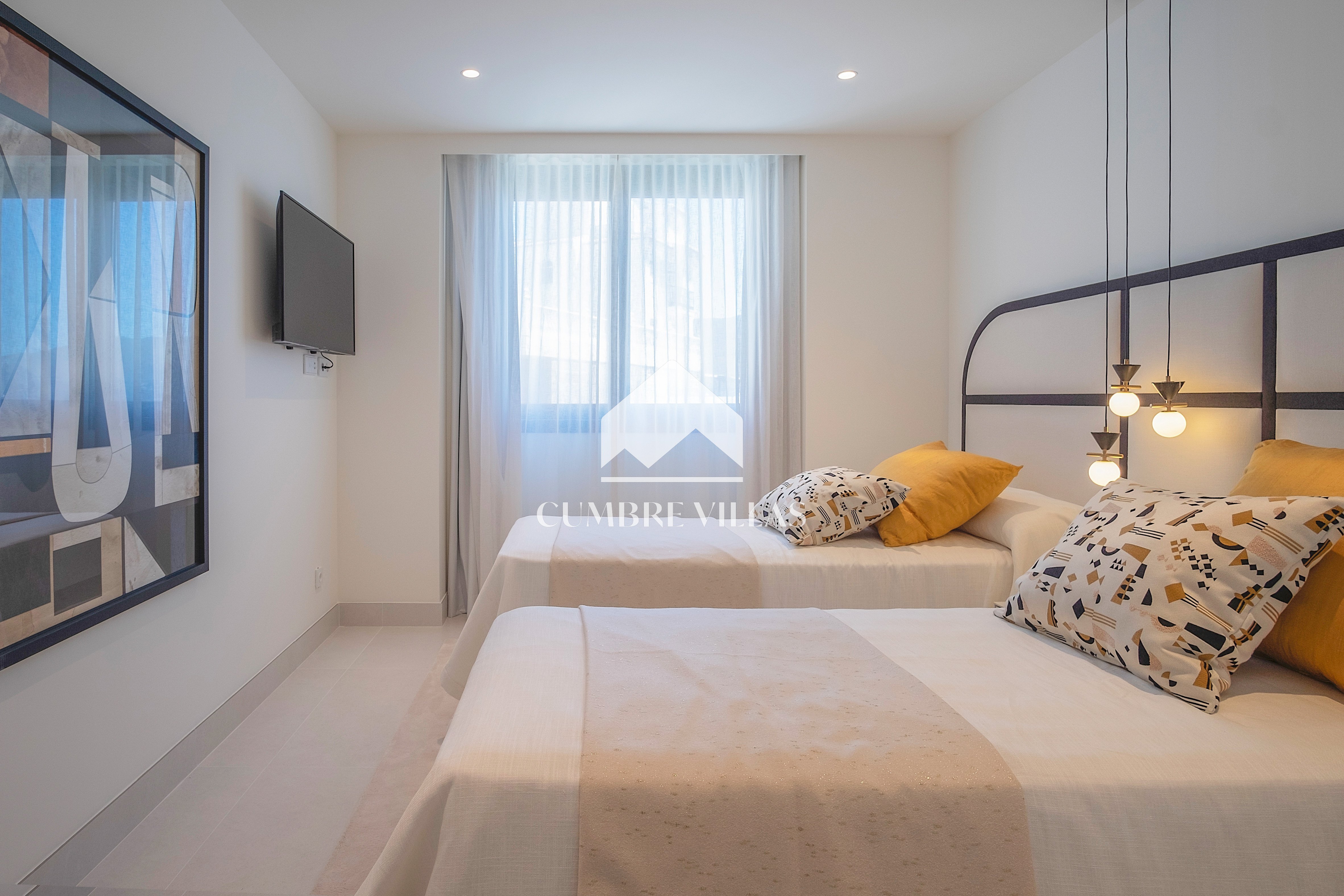 This villa is located on the far-right side of the development. Access to the property is from the East side, next to an area which is reserved for the lift and the staircase. A bright and spacious, open-plan living room and a fully-fitted kitchen with high-end appliances opens up to the interior. This area includes an open side room that can be used as a dining area. There is also a guest toilet and a utility room. Large bay windows seamlessly connect the interior with the pool terrace and flood the interior with abundant natural light, creating a warm and inviting ambiance throughout. The astonishing, 180º panoramic views over the Mediterranean Sea and the Costa Tropical can be enjoyed both from the outside and from the inside of the property.