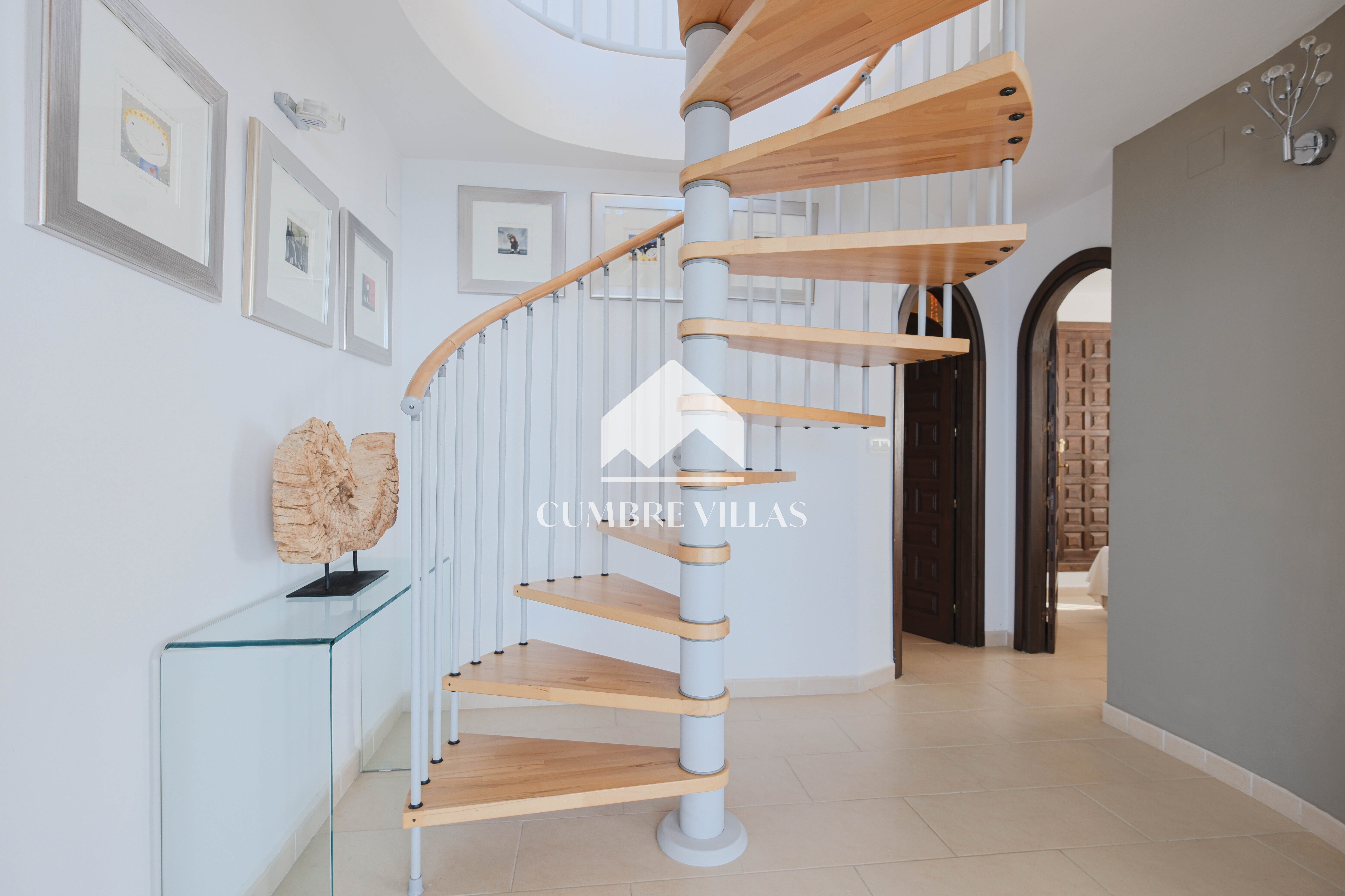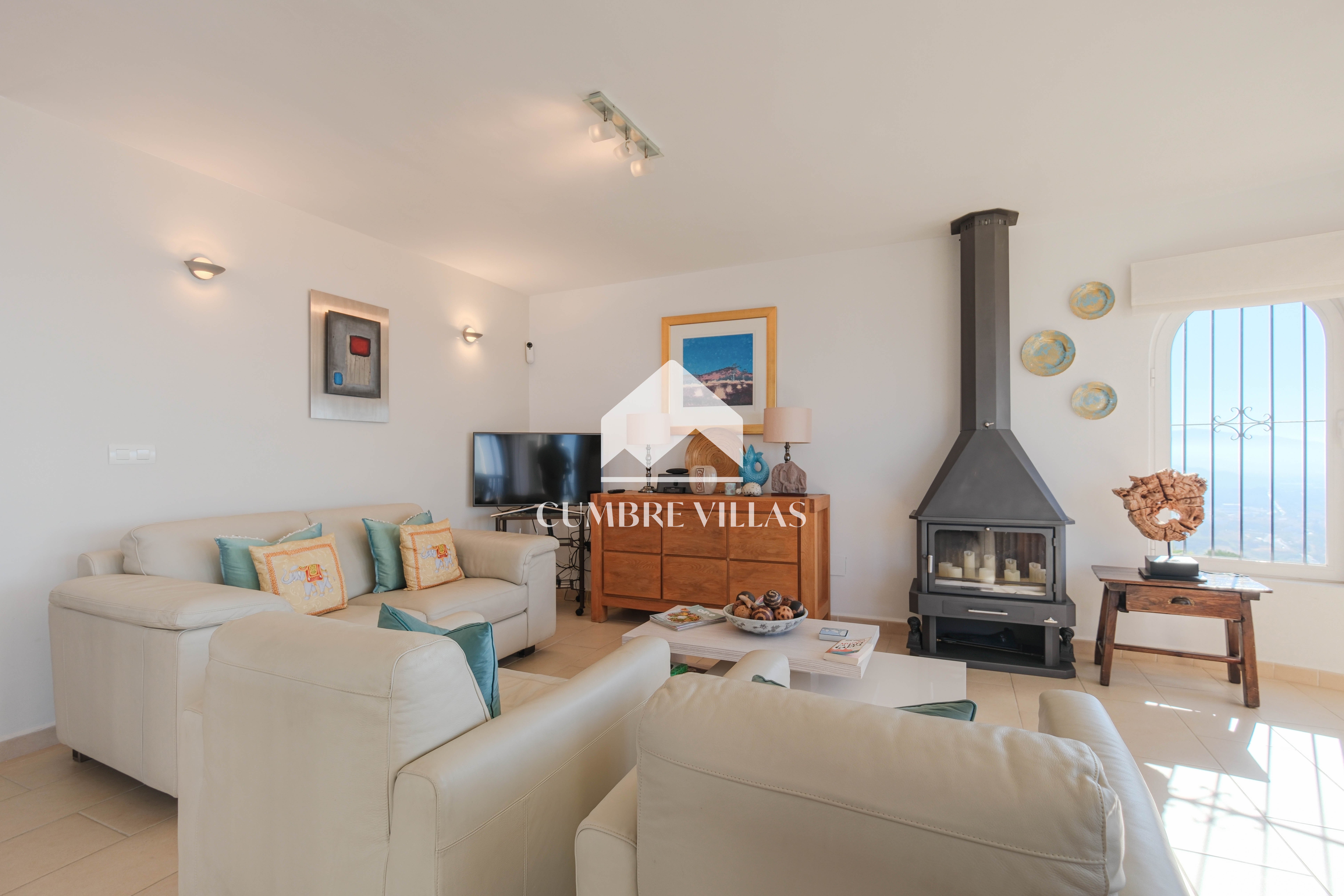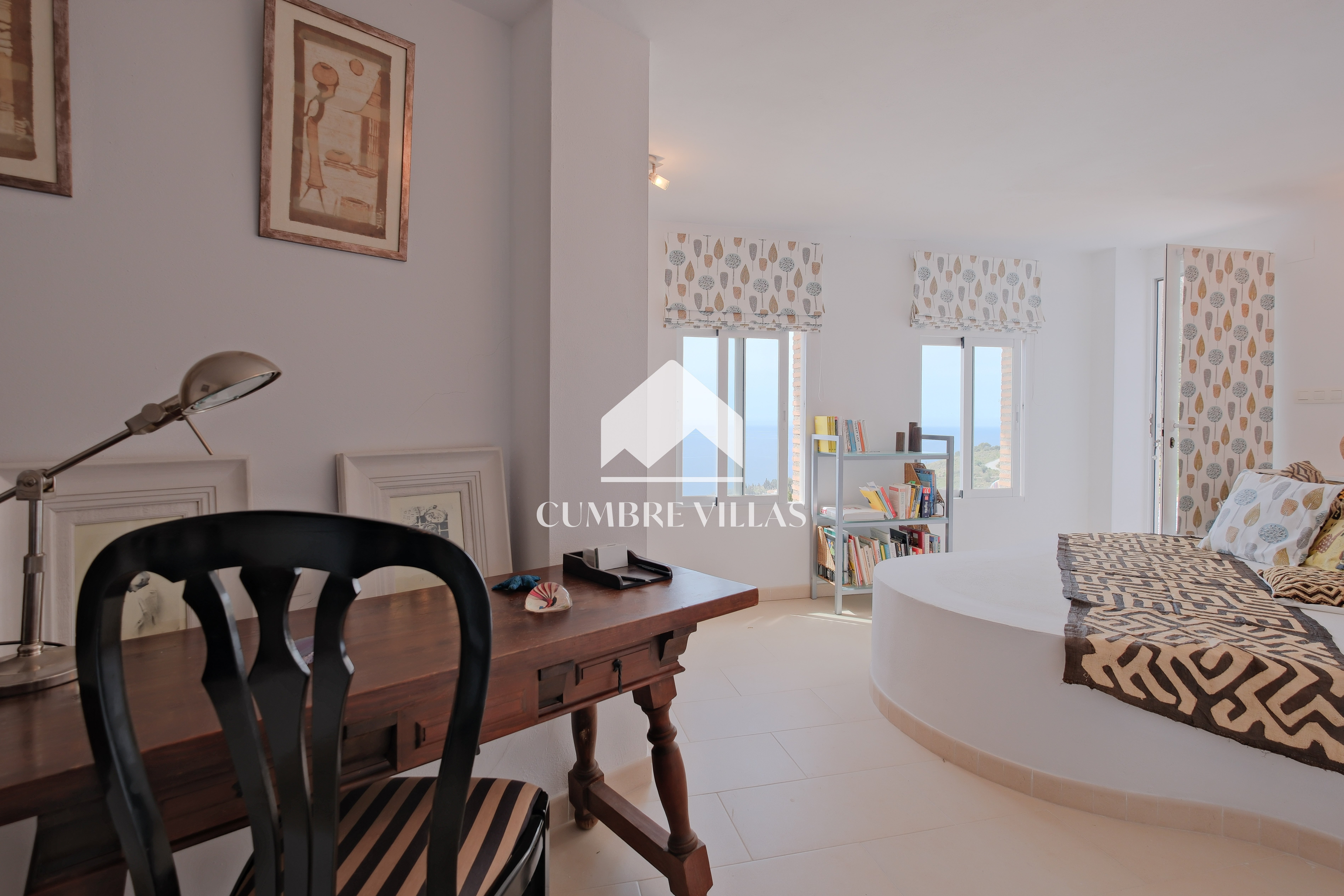 On the main living level, the villa features a welcoming entrance hall, a twin bedroom and a bathroom, and a beautifully refurbished, spacious kitchen. This connects seamlessly to the reception areas, where the architecture truly shines. The living room, centred around a wood-burning fireplace, is framed by six arched windows set within a semi-circular bay, flooding the space with light. Large patio doors open onto the main terrace, offering uninterrupted views from sunrise to sunset. The dining area mirrors this connection to the outdoors and is linked to the kitchen via a generous breakfast bar.