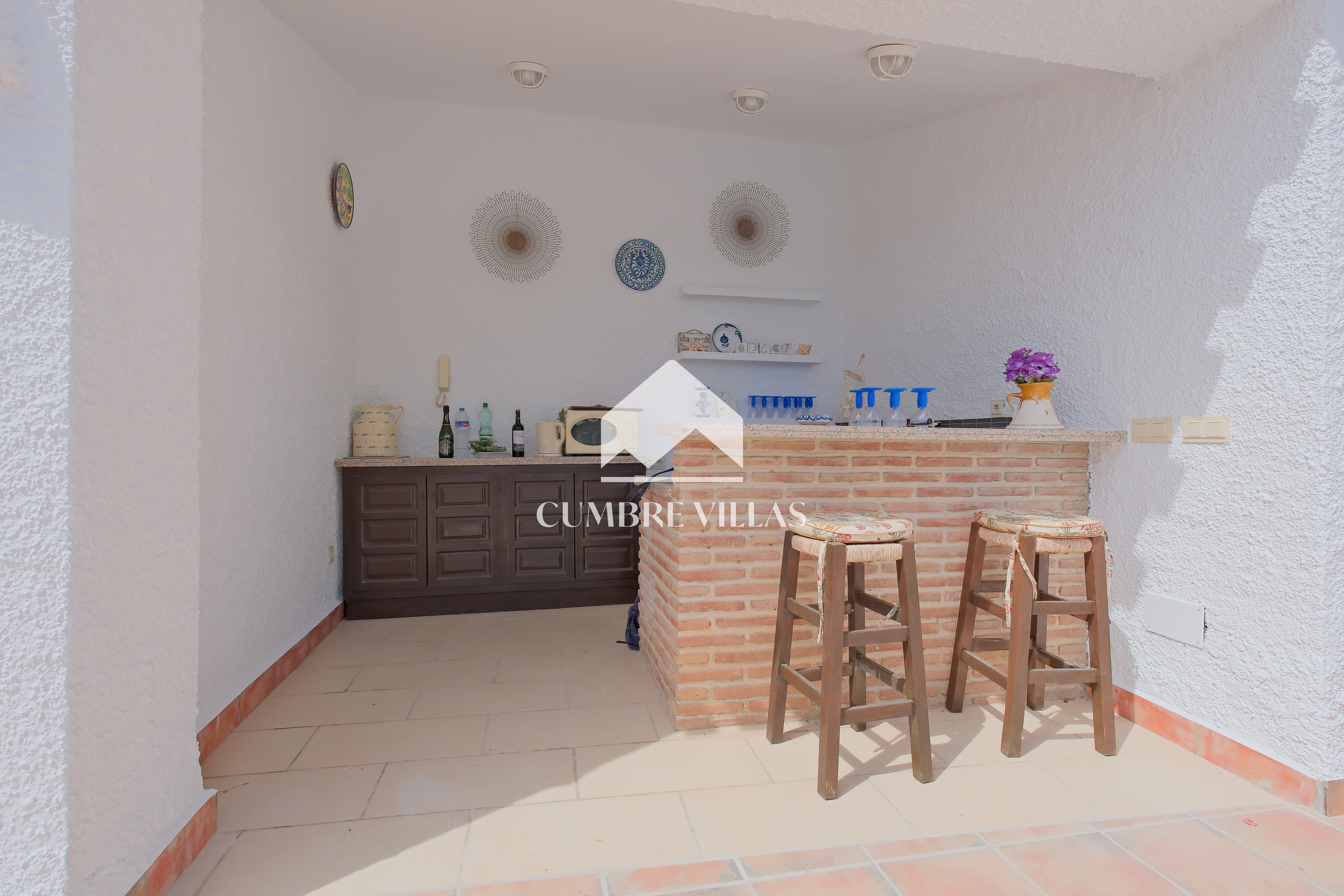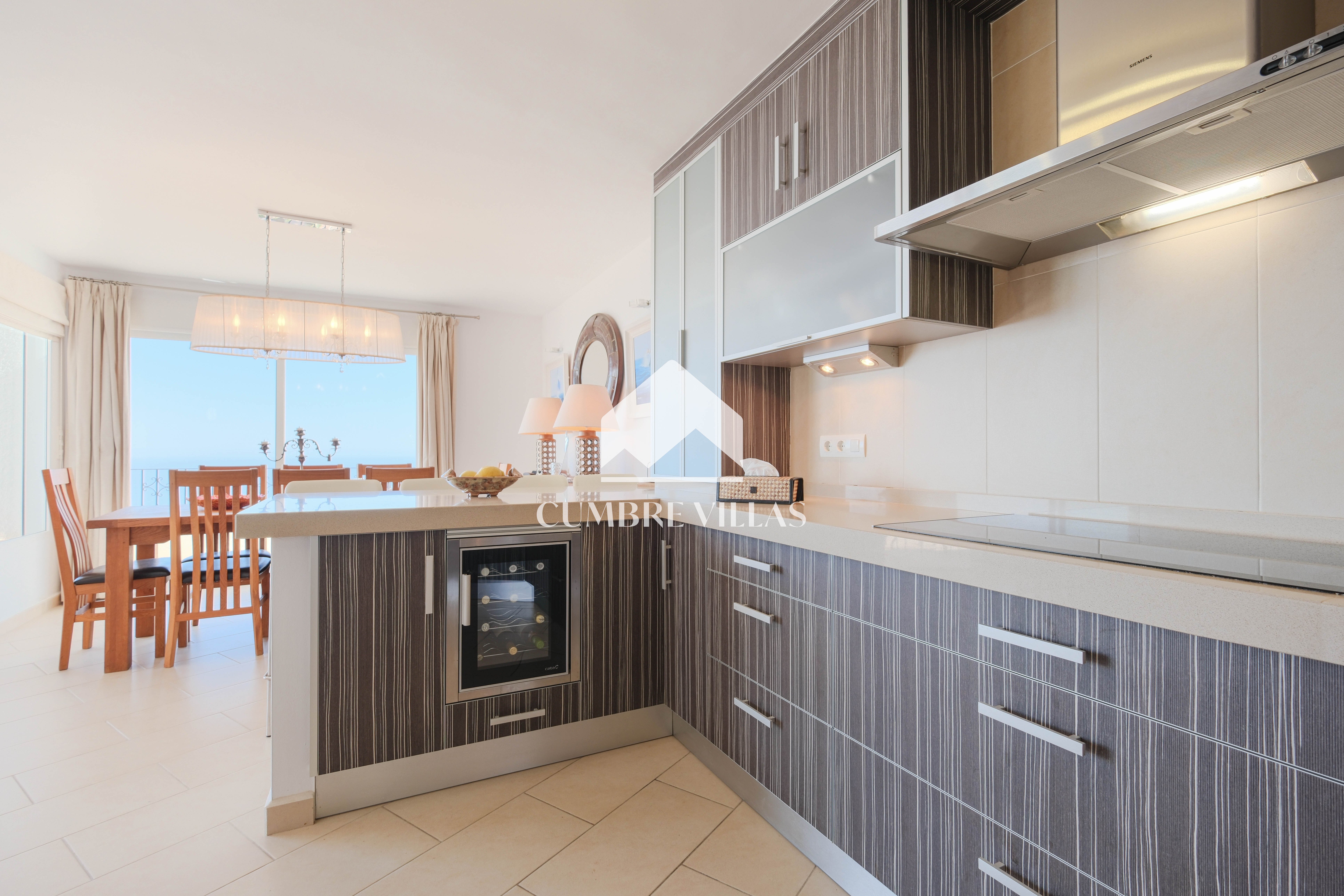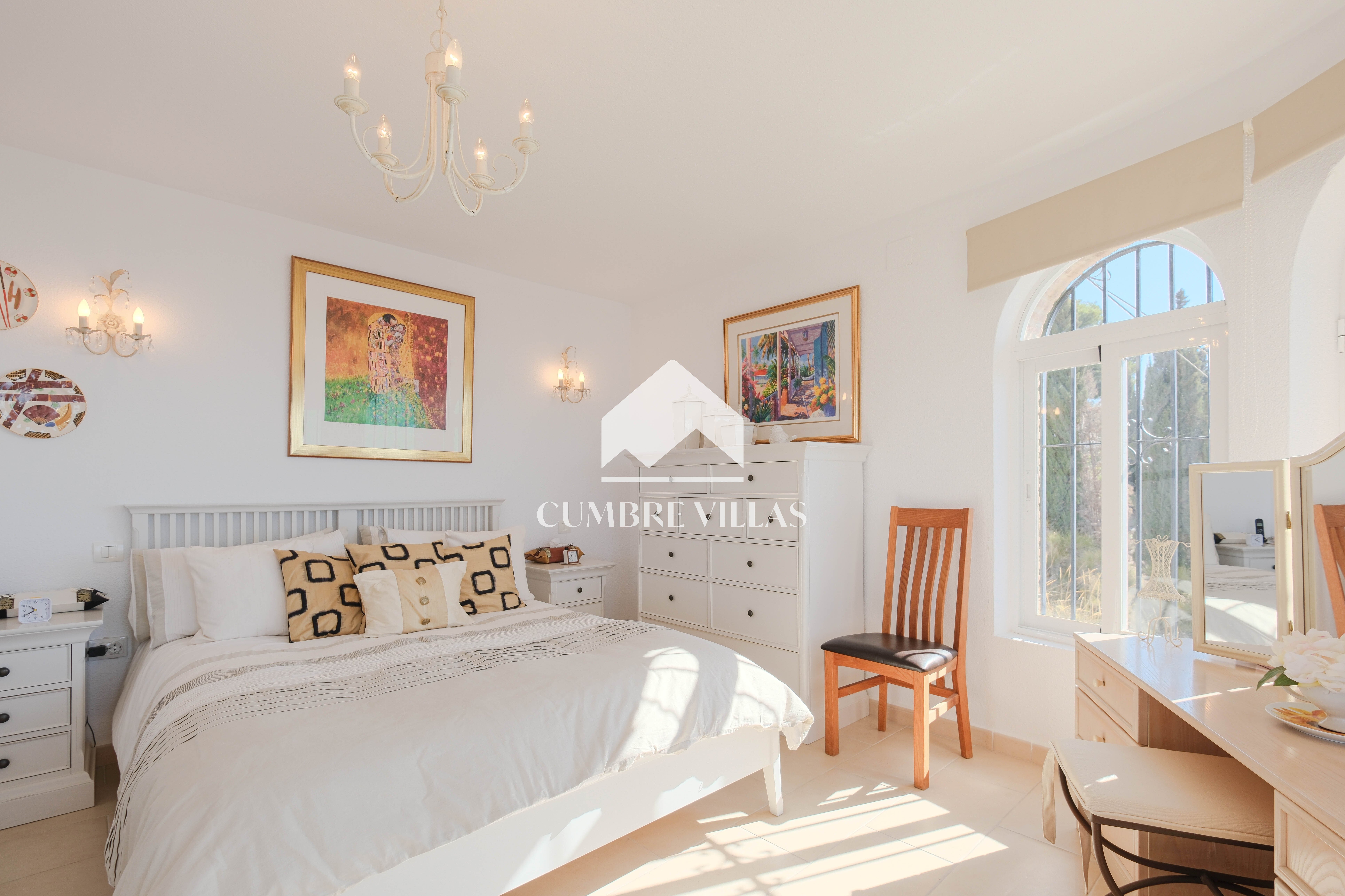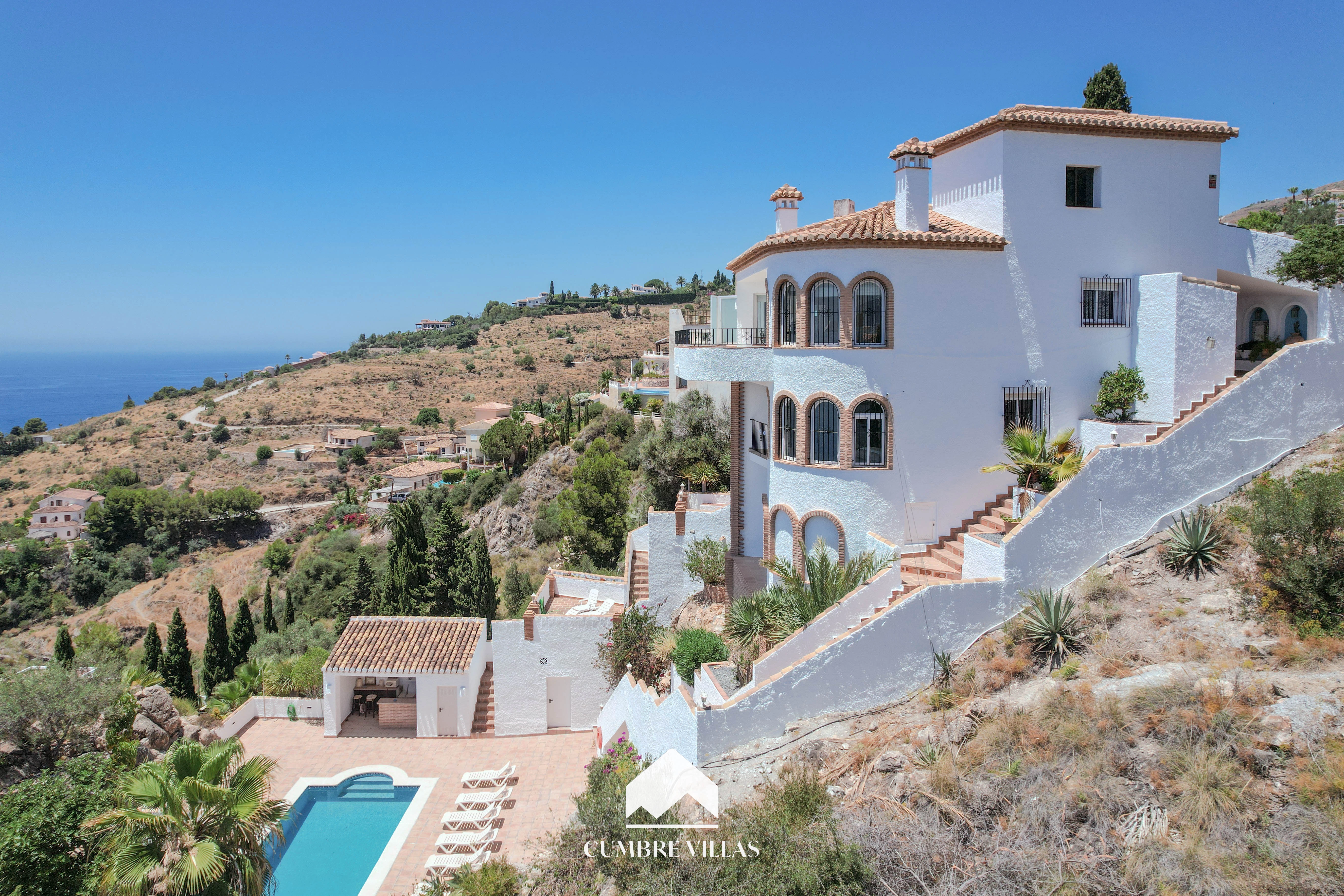On the main living level, the villa features a welcoming entrance hall, a twin bedroom and a bathroom, and a beautifully refurbished, spacious kitchen. This connects seamlessly to the reception areas, where the architecture truly shines. The living room, centred around a wood-burning fireplace, is framed by six arched windows set within a semi-circular bay, flooding the space with light. Large patio doors open onto the main terrace, offering uninterrupted views from sunrise to sunset. The dining area mirrors this connection to the outdoors and is linked to the kitchen via a generous breakfast bar.