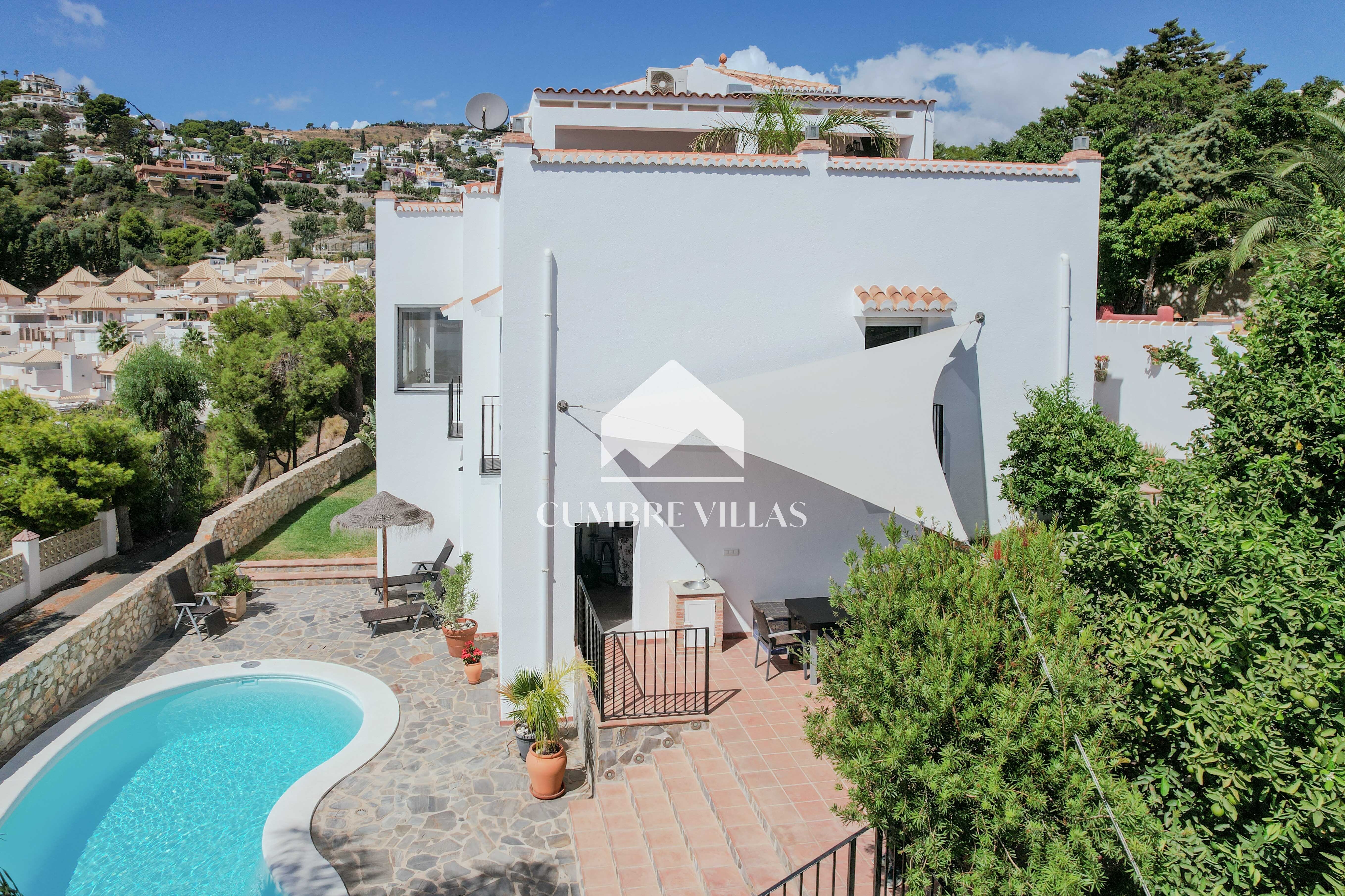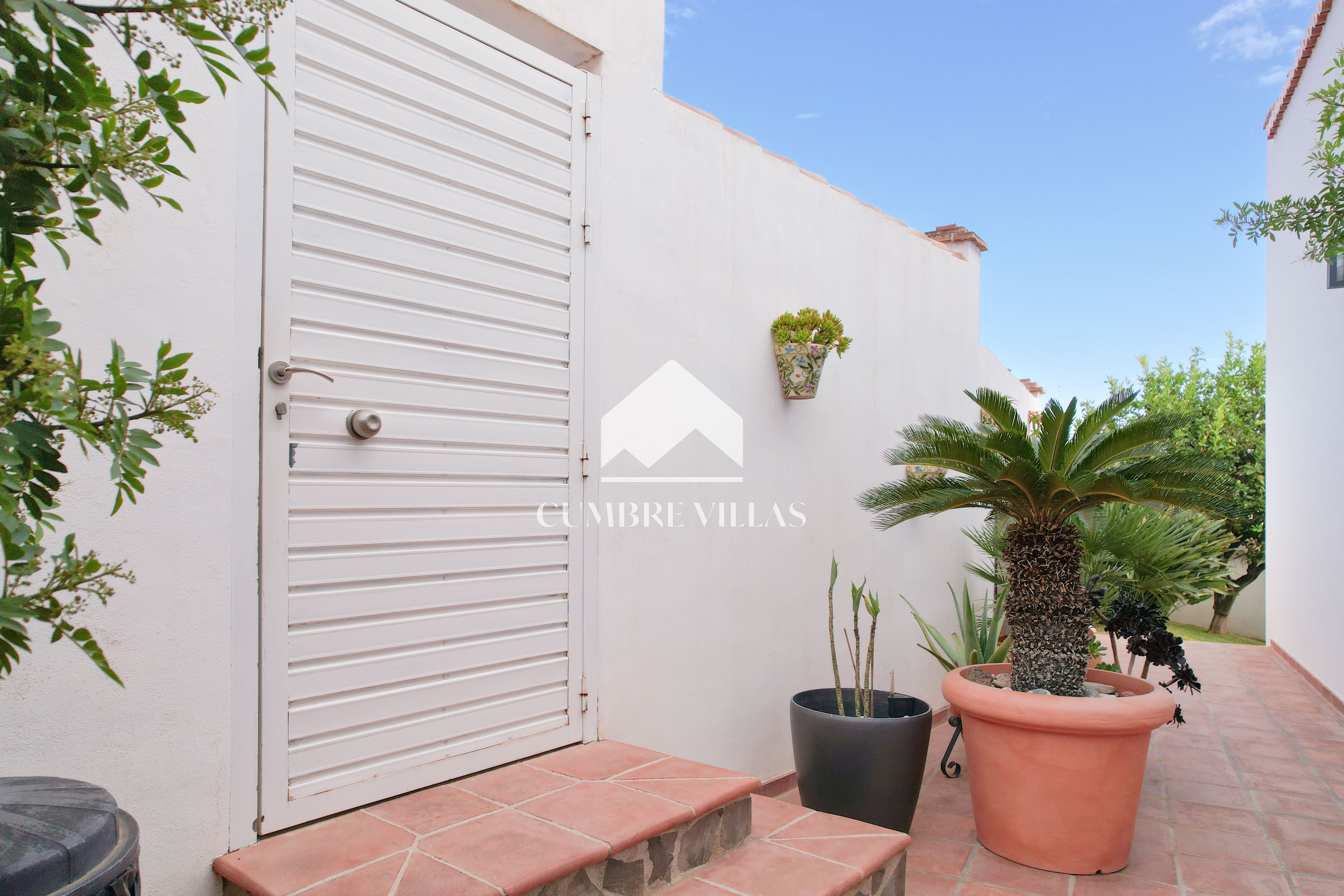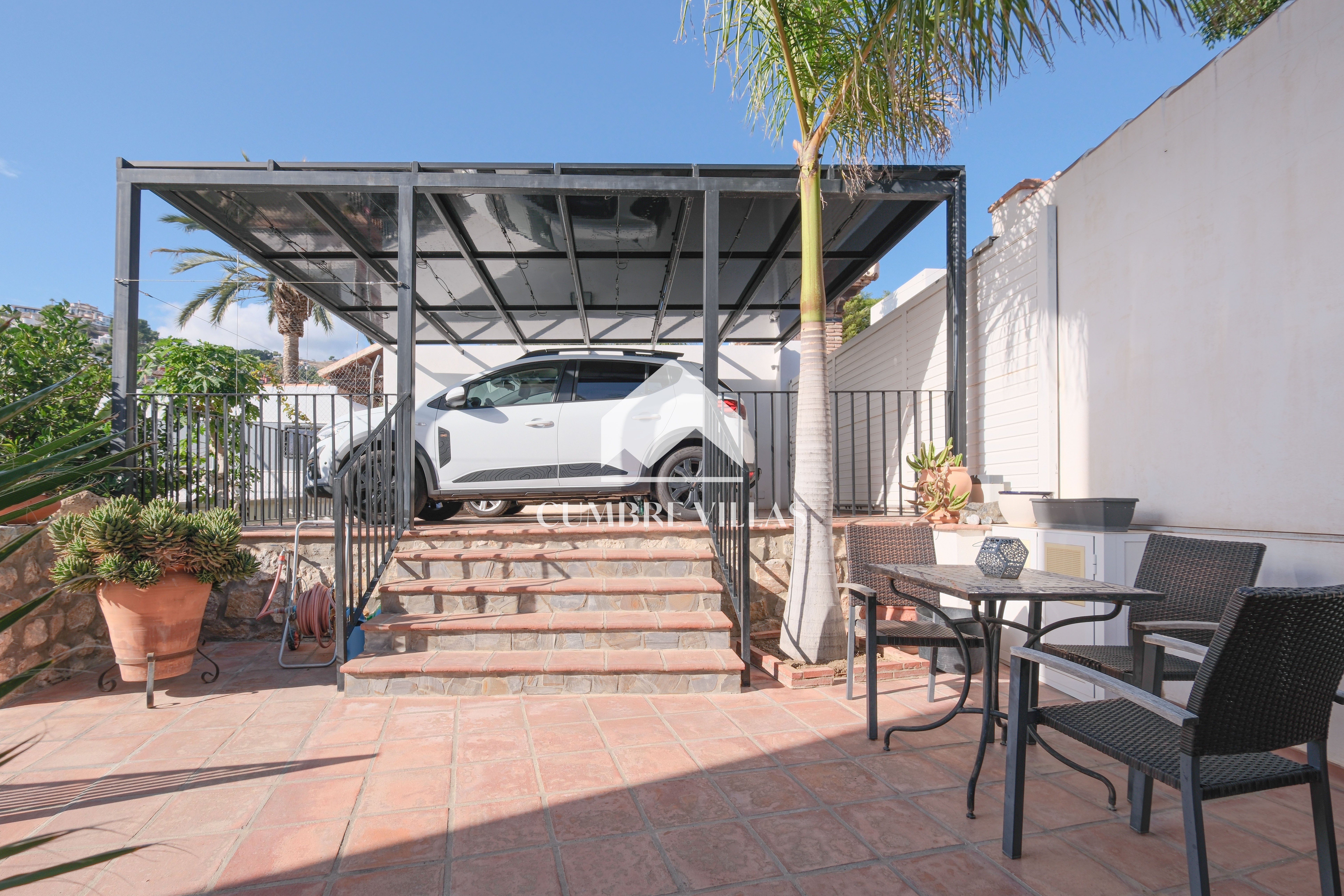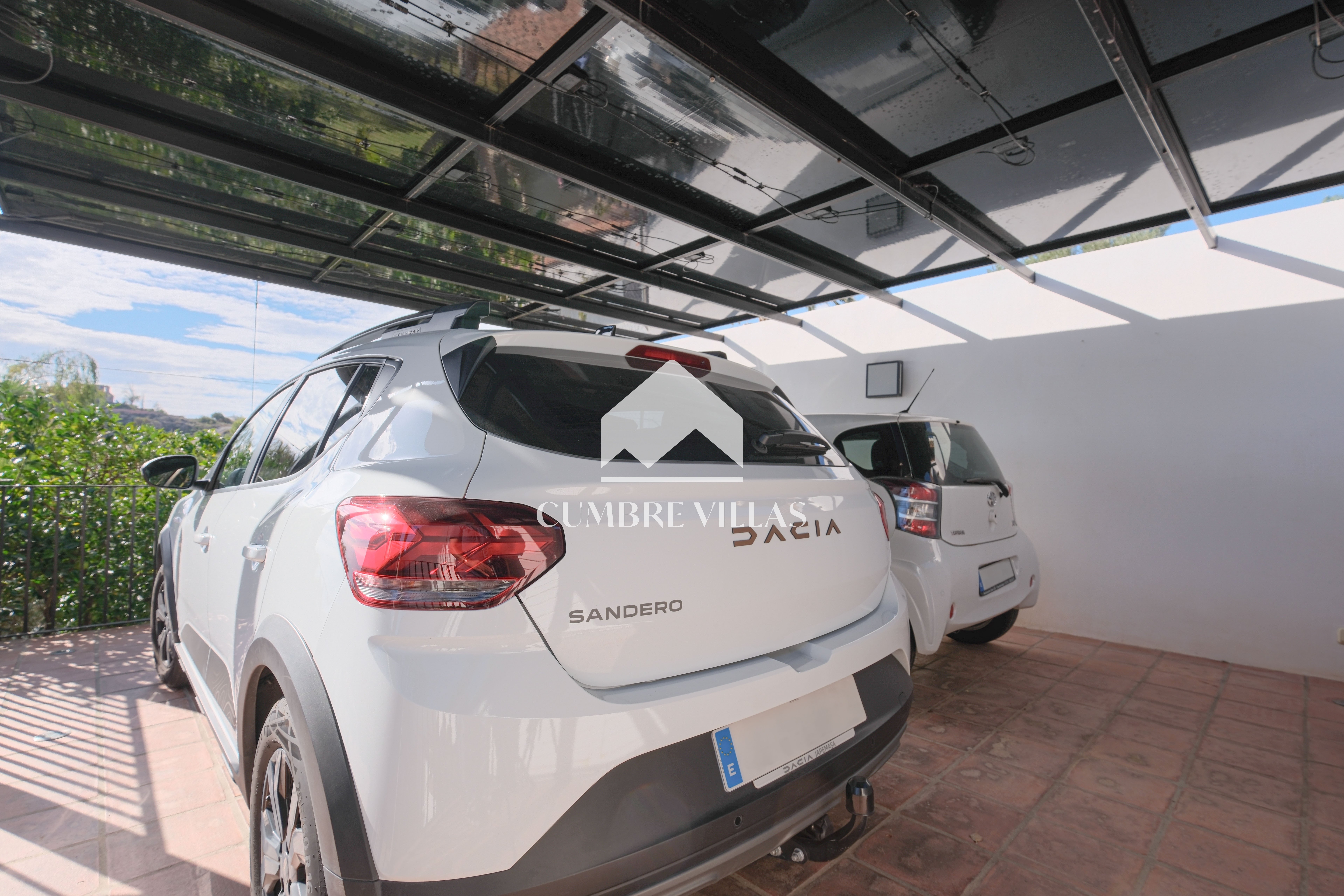 The property can be accessed by car or on foot from the street. A pavement surrounds the house and connects, via a series of steps, the covered parking for two vehicles, the entrance to the house, the barbecue area by the pool and the guest apartment.