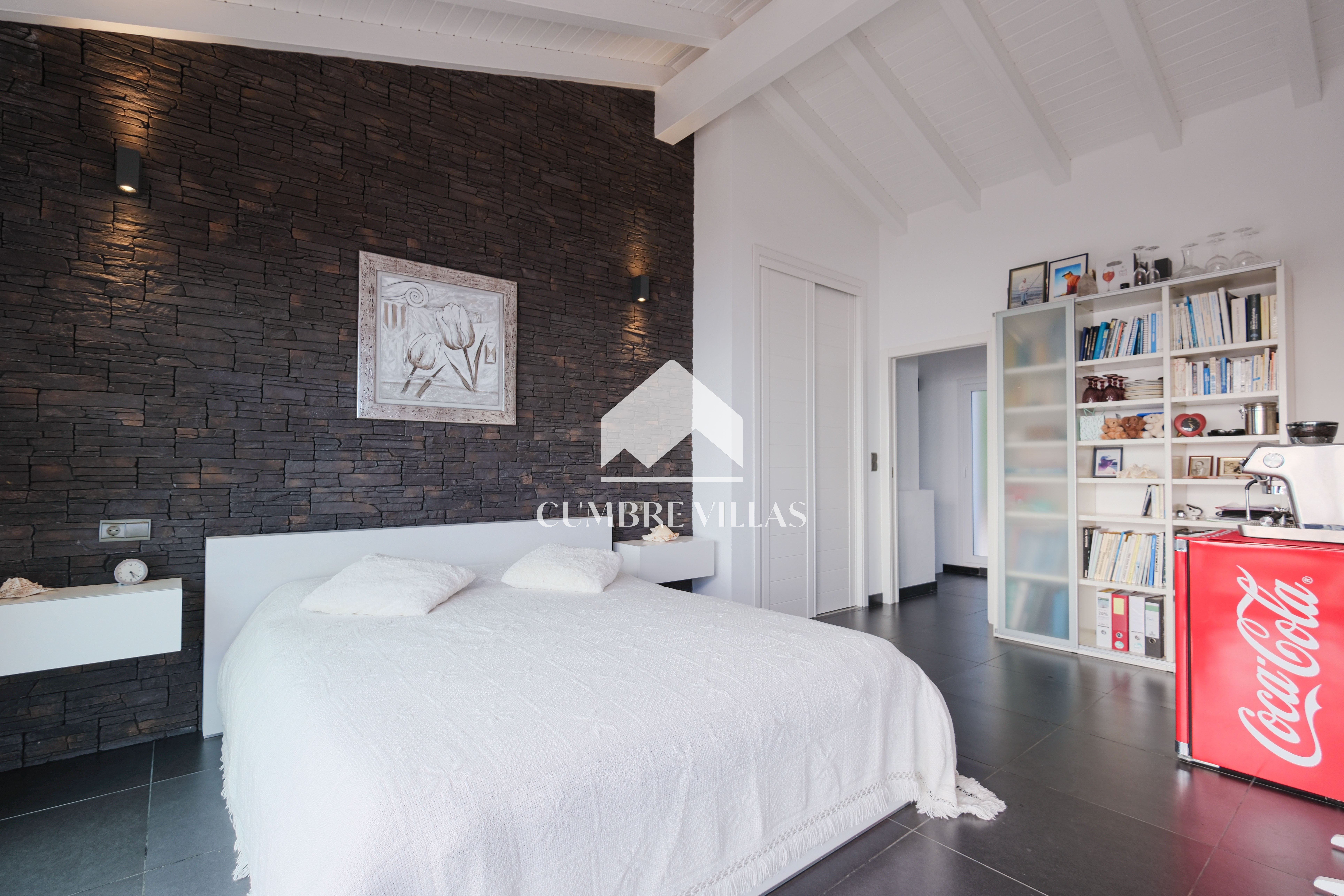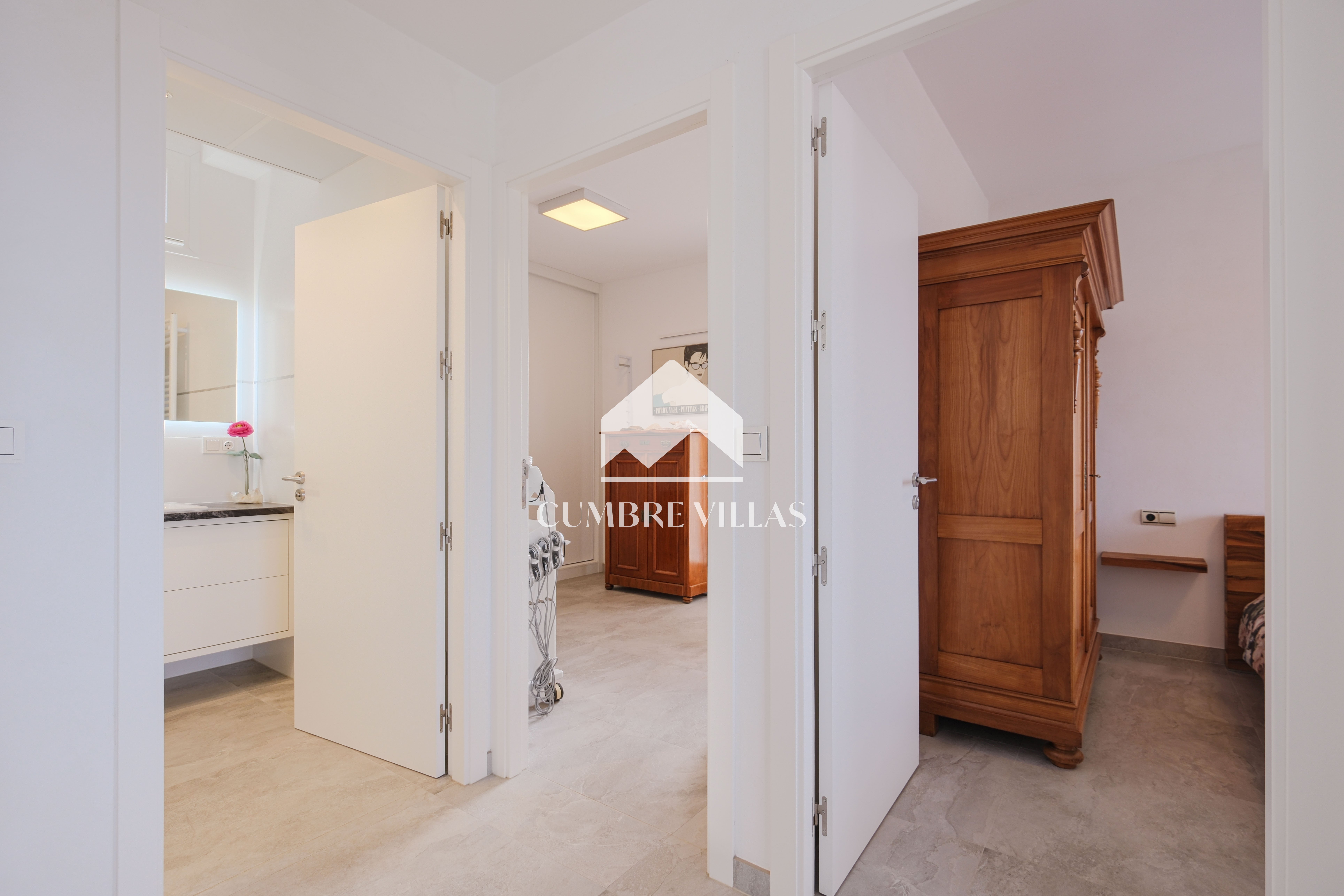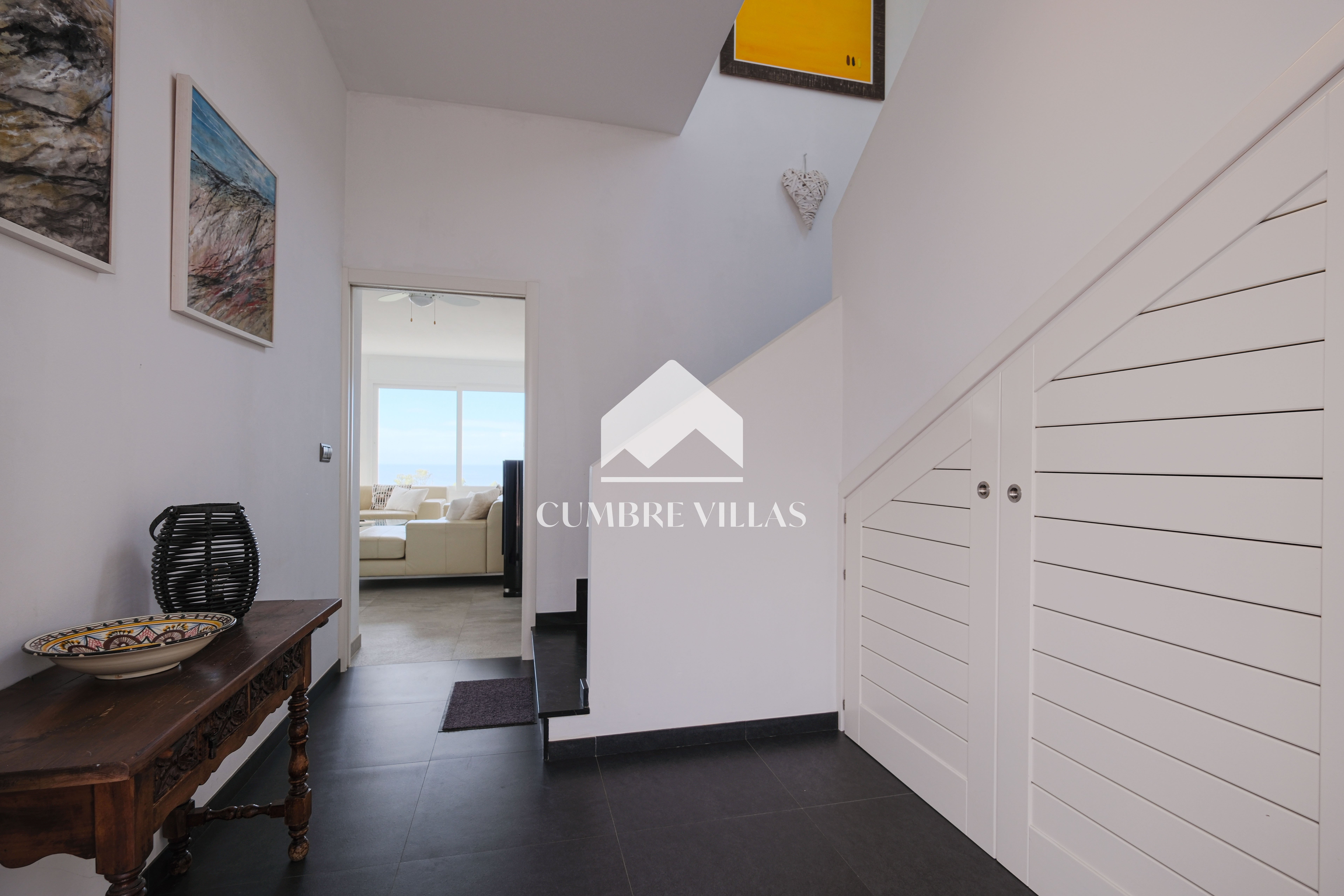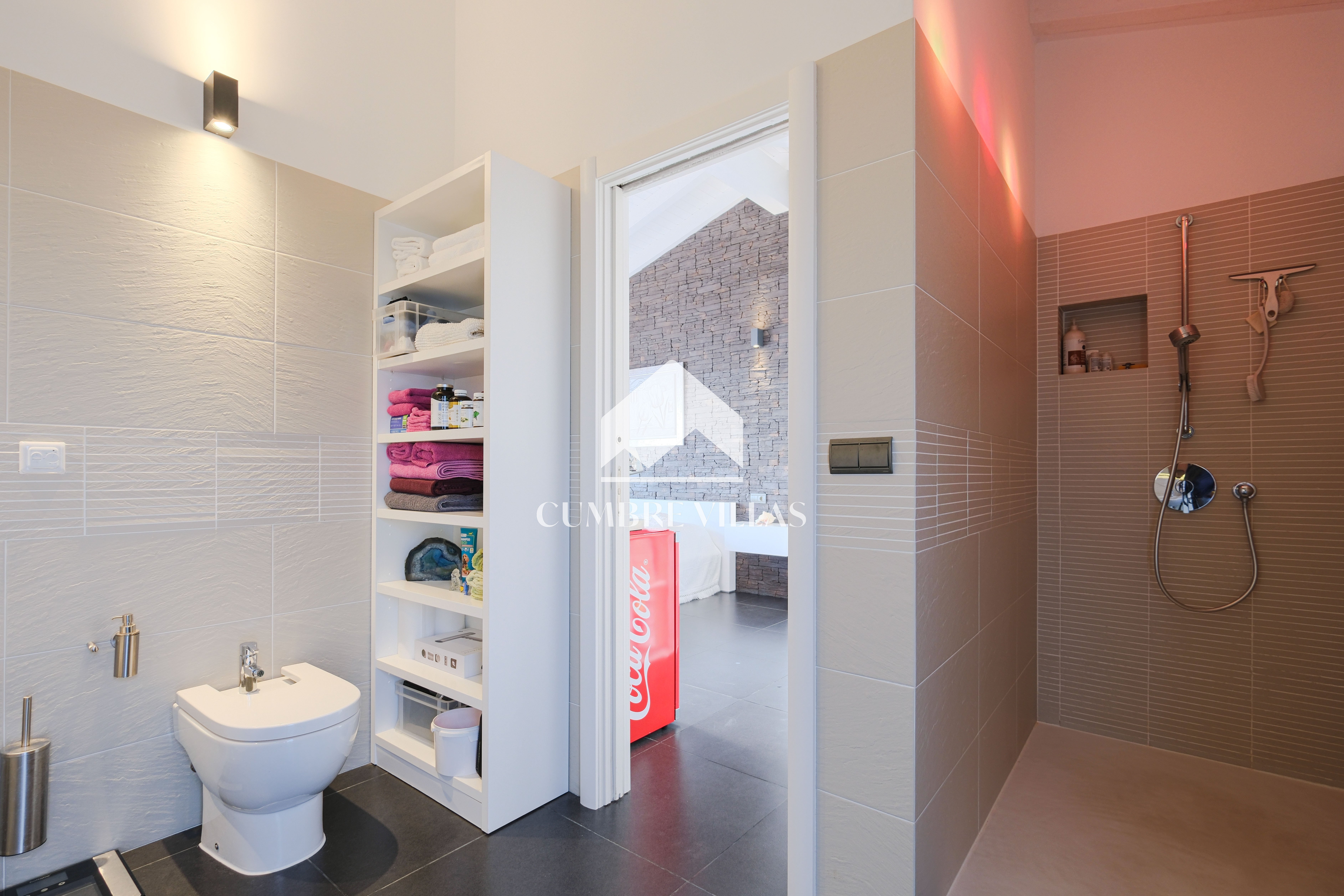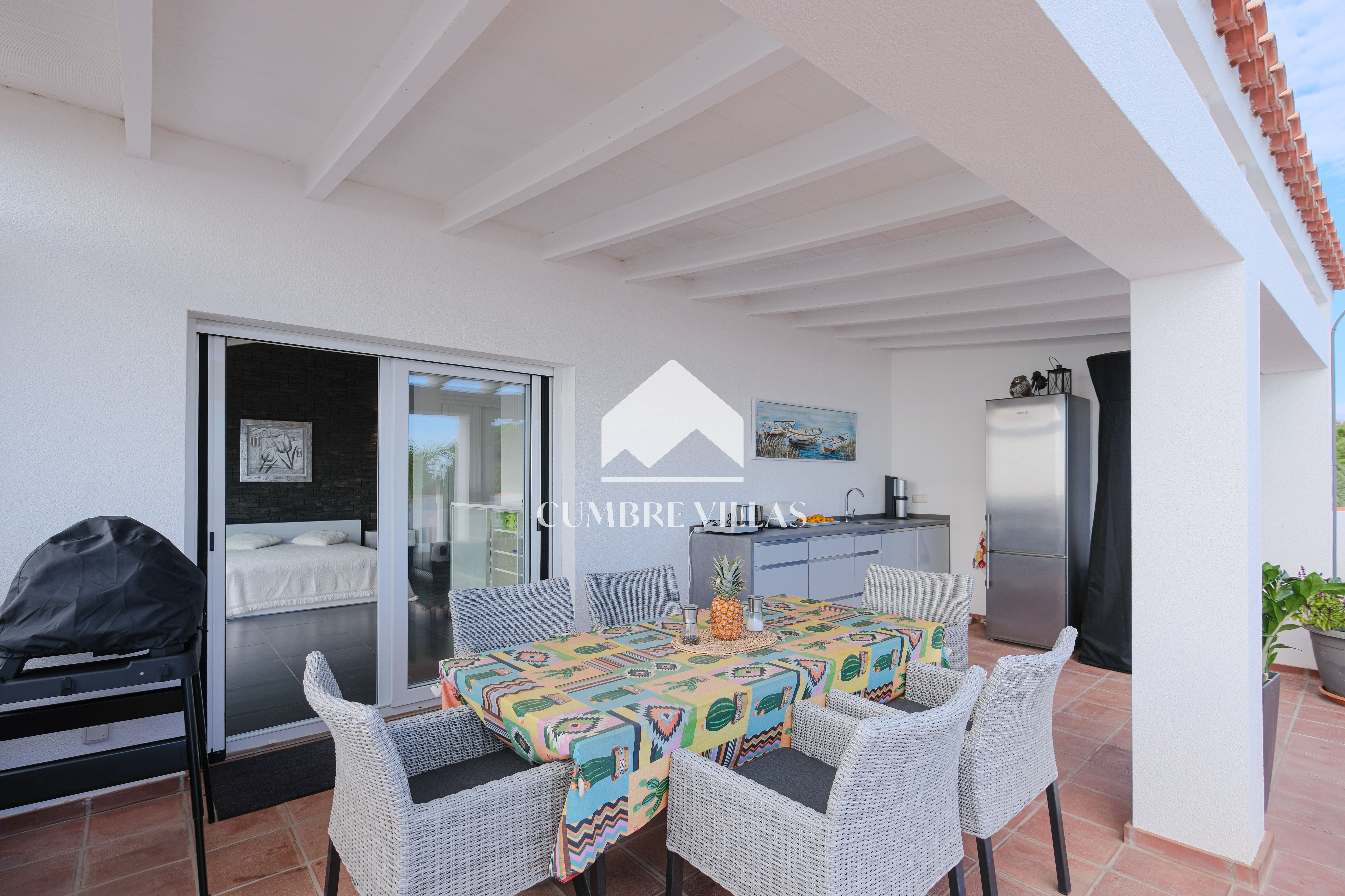 Returning to the entrance hall, a staircase leads to the first floor, where there is a spacious bedroom with en-suite bathroom. This bedroom has two exits that connect to an extensive terrace that surrounds almost the entire floor, offering spectacular sea views. The terrace includes a fully equipped outdoor kitchen, which could be glazed for winter use, allowing it to be heated.