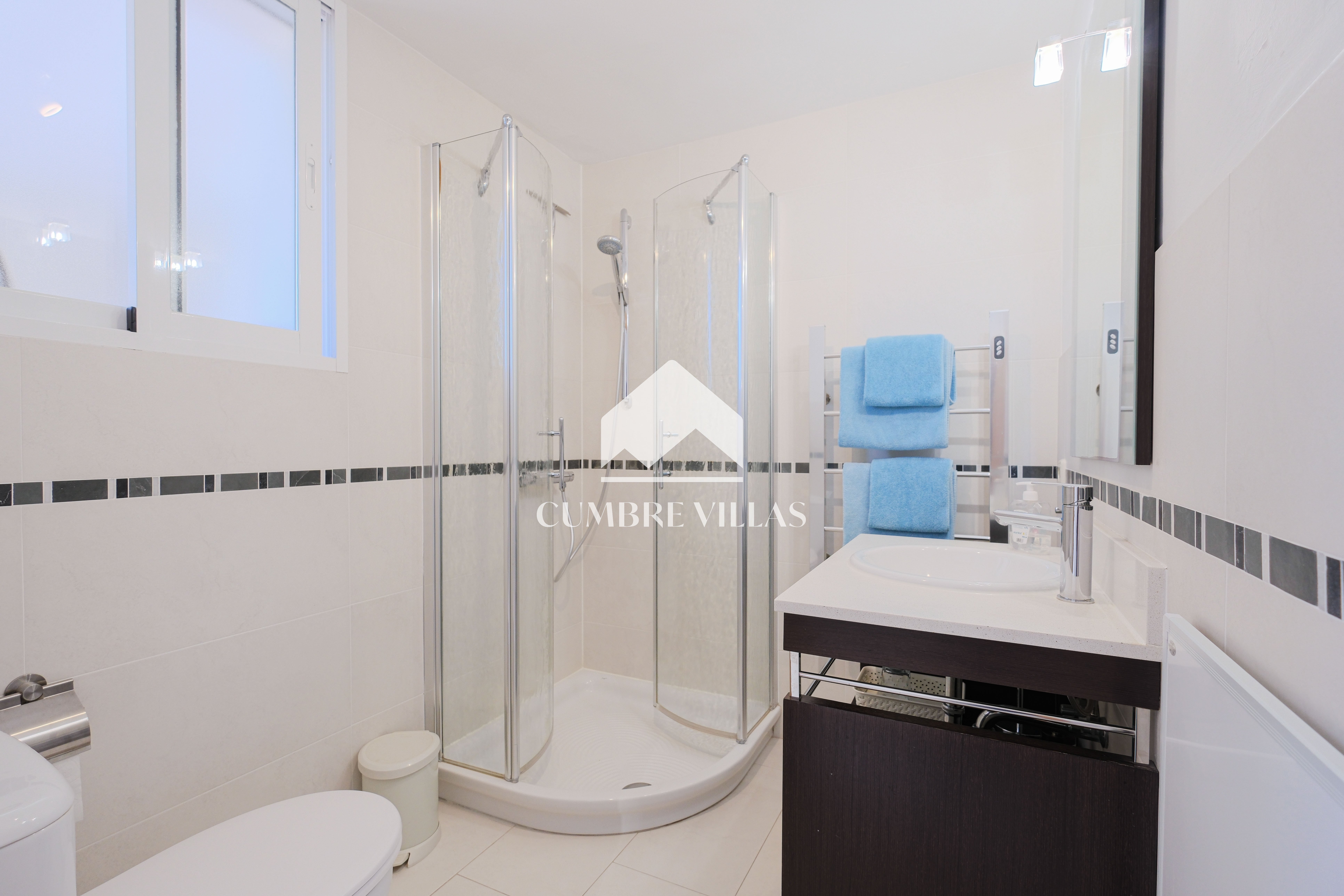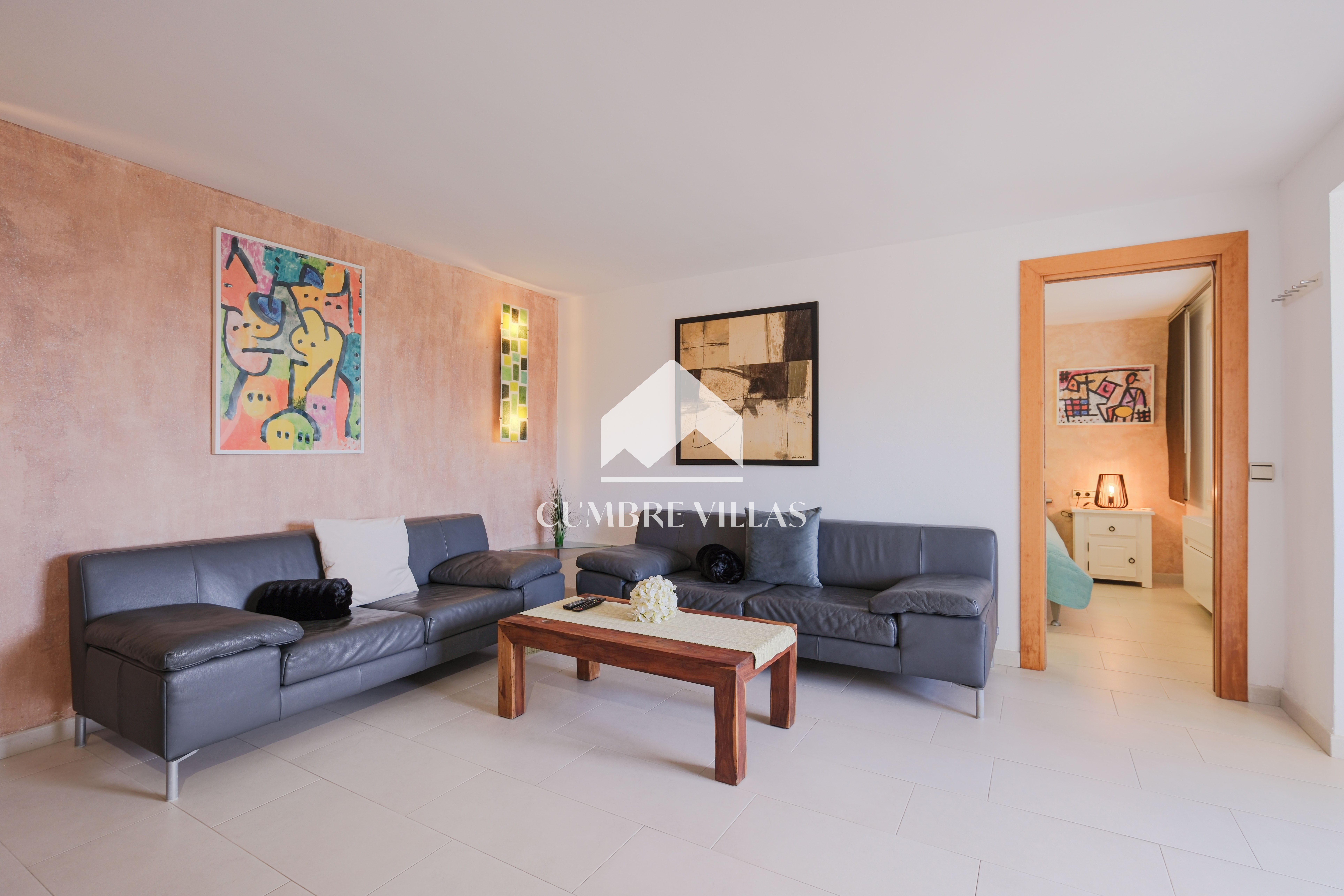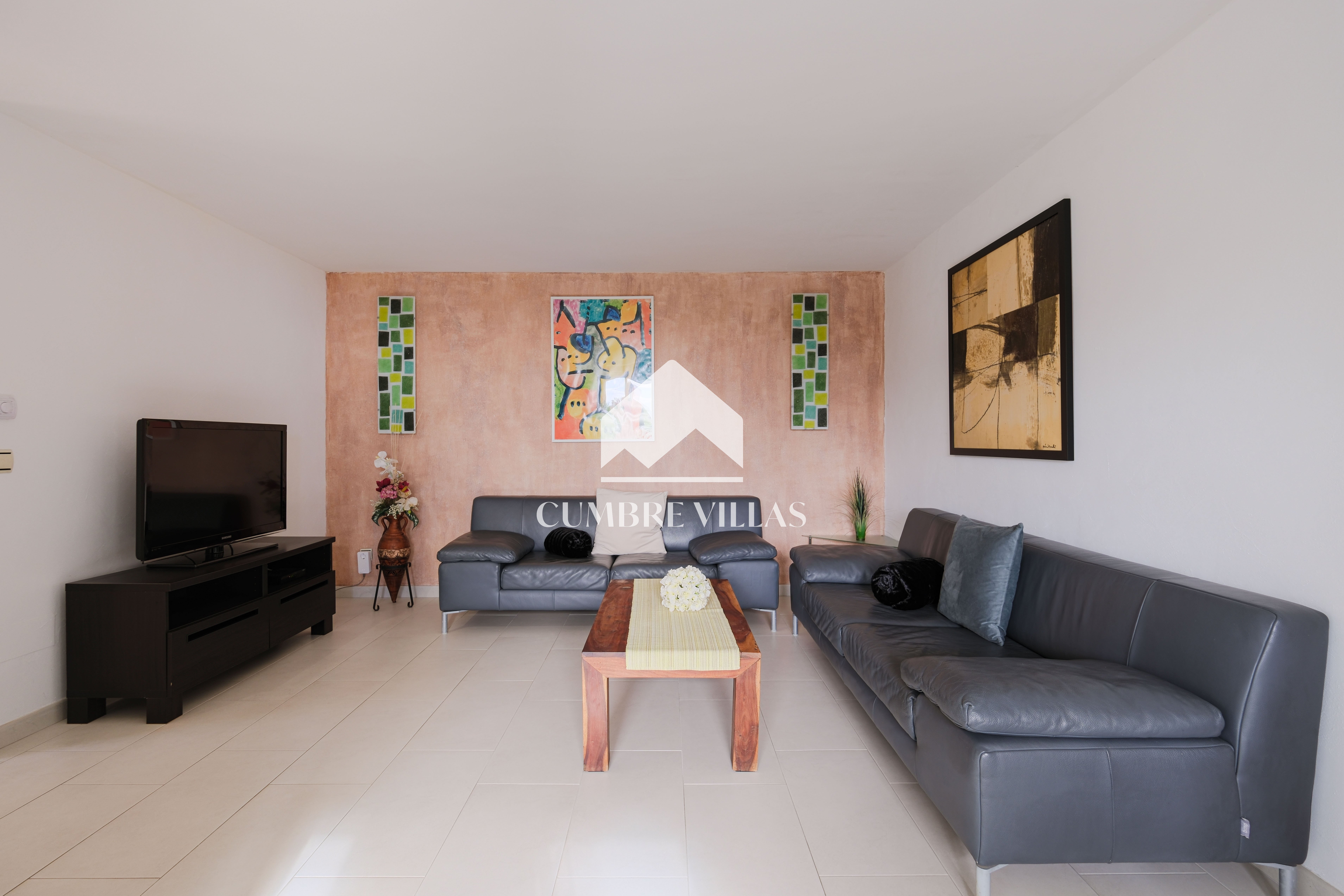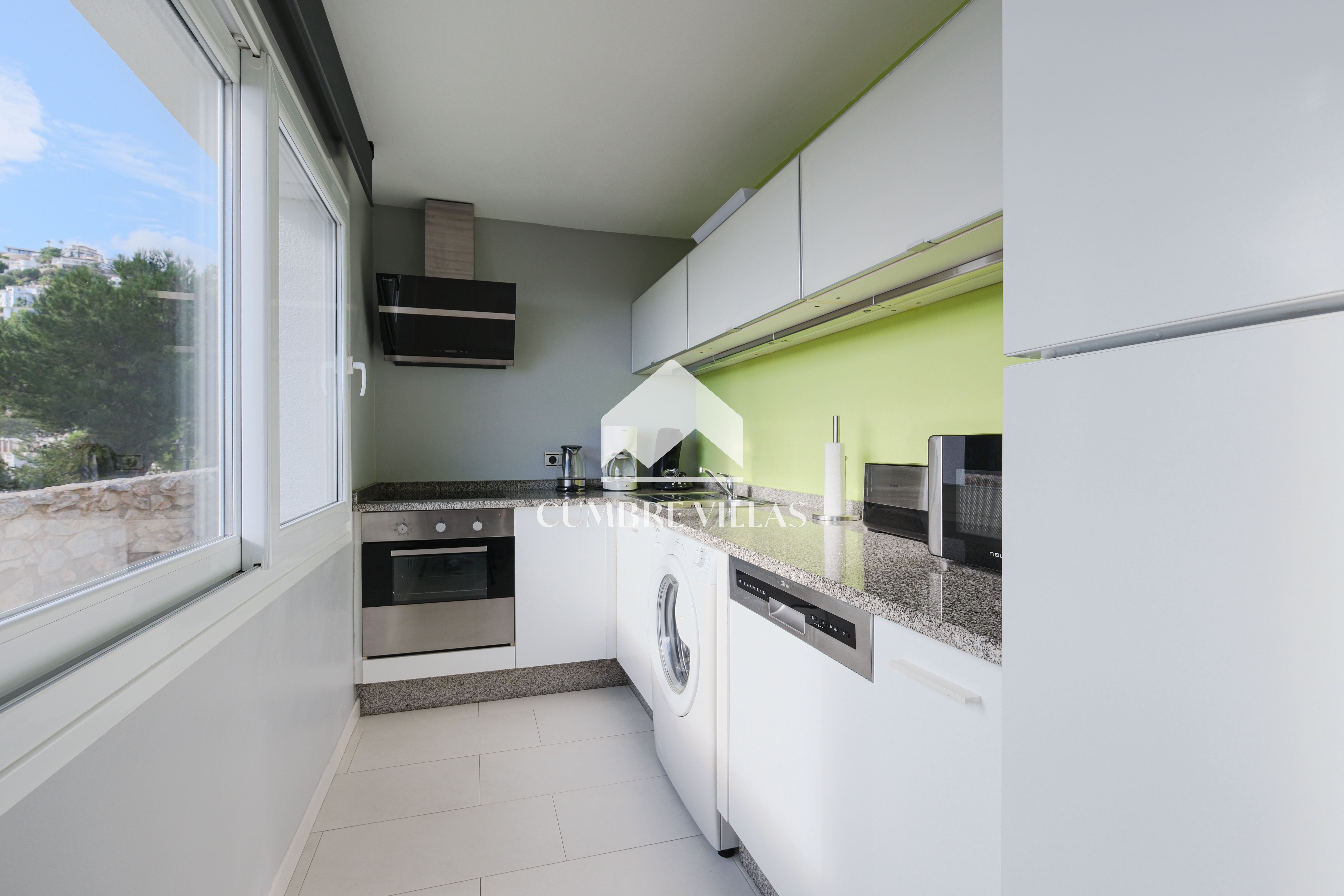 The apartment on the lower floor has a covered terrace at the entrance and a small chill out area. On entering, to the left is a bathroom with shower and to the front a spacious living room that connects to a modern kitchen. From the living room there is access to a double bedroom with large wardrobes and a west facing window.