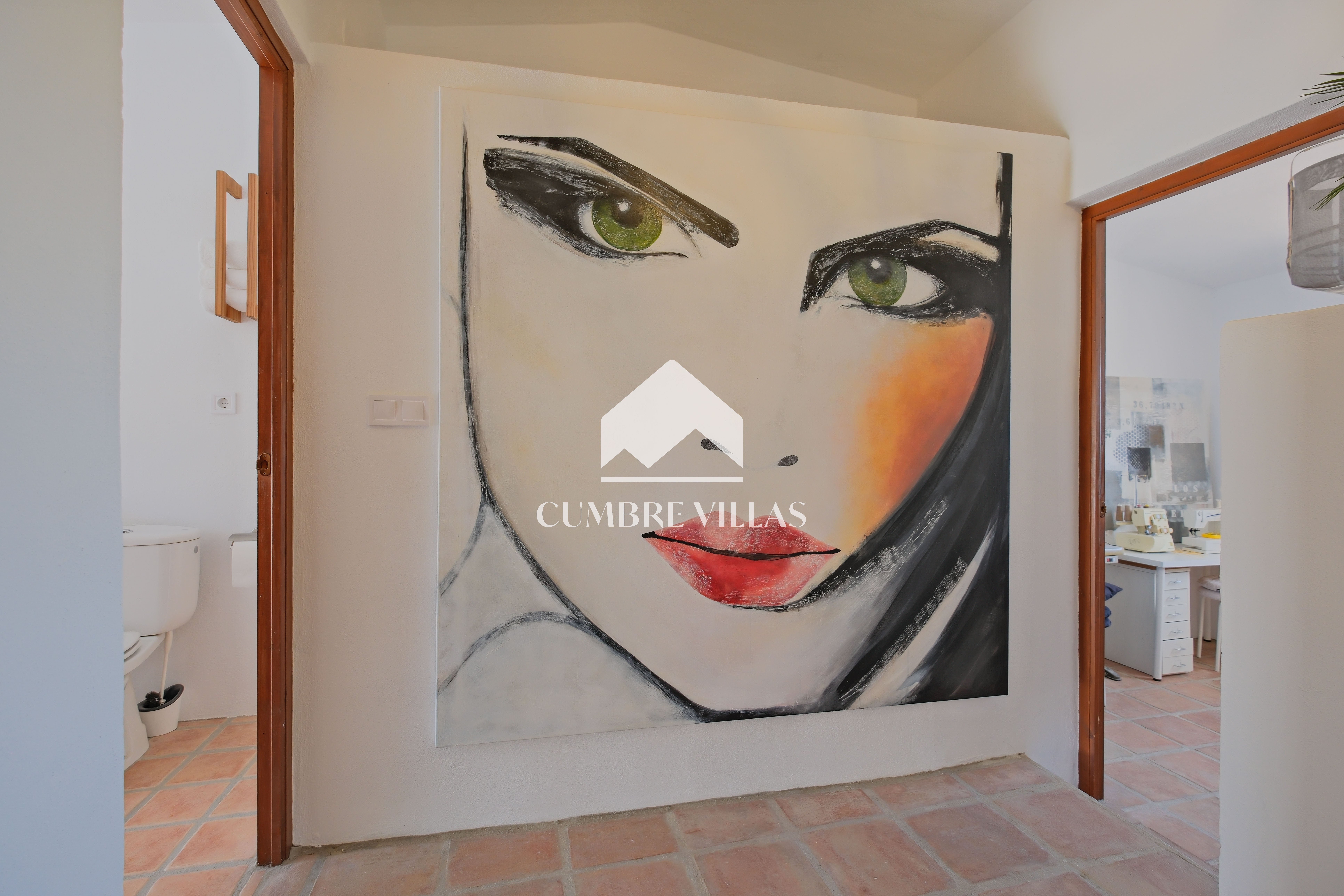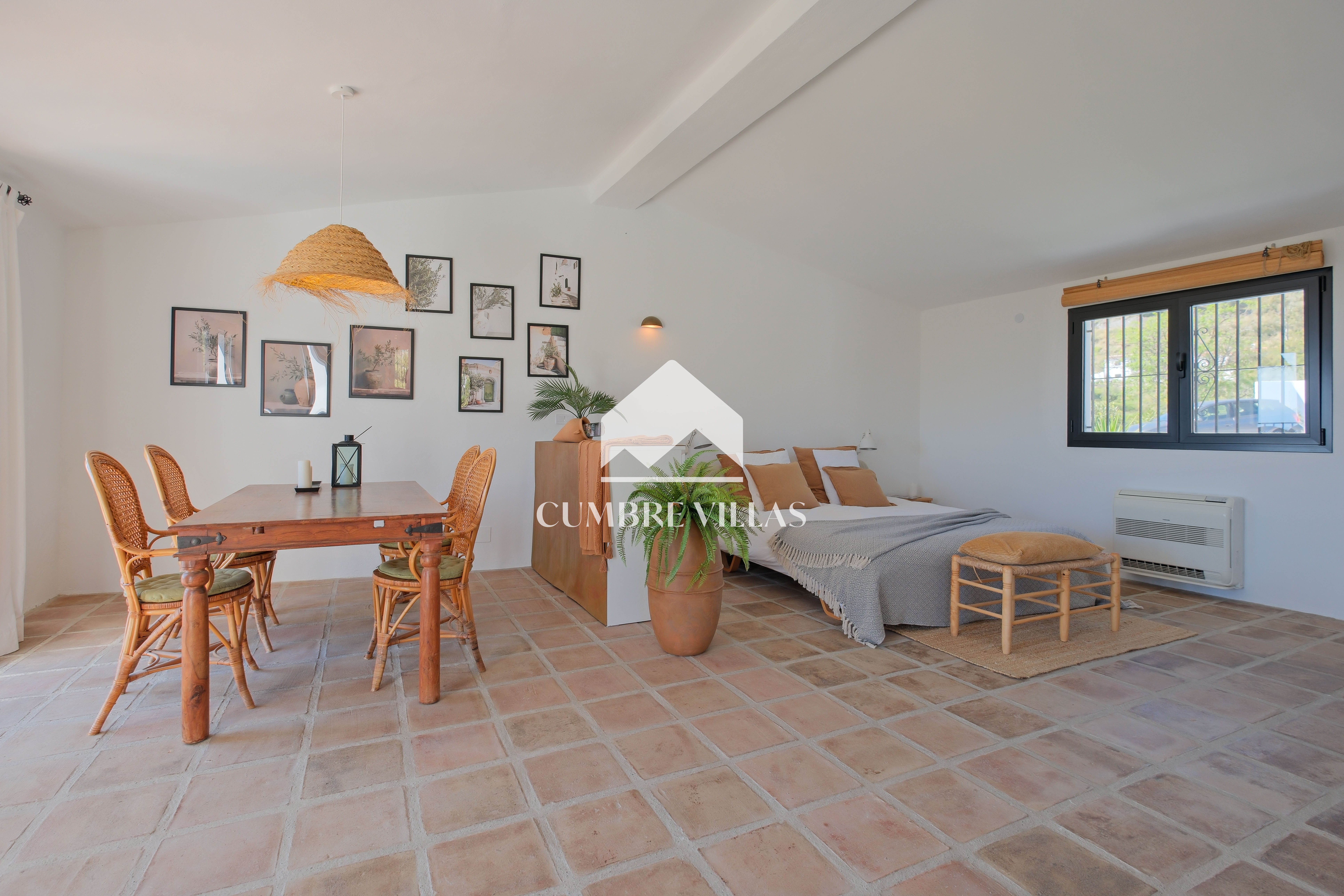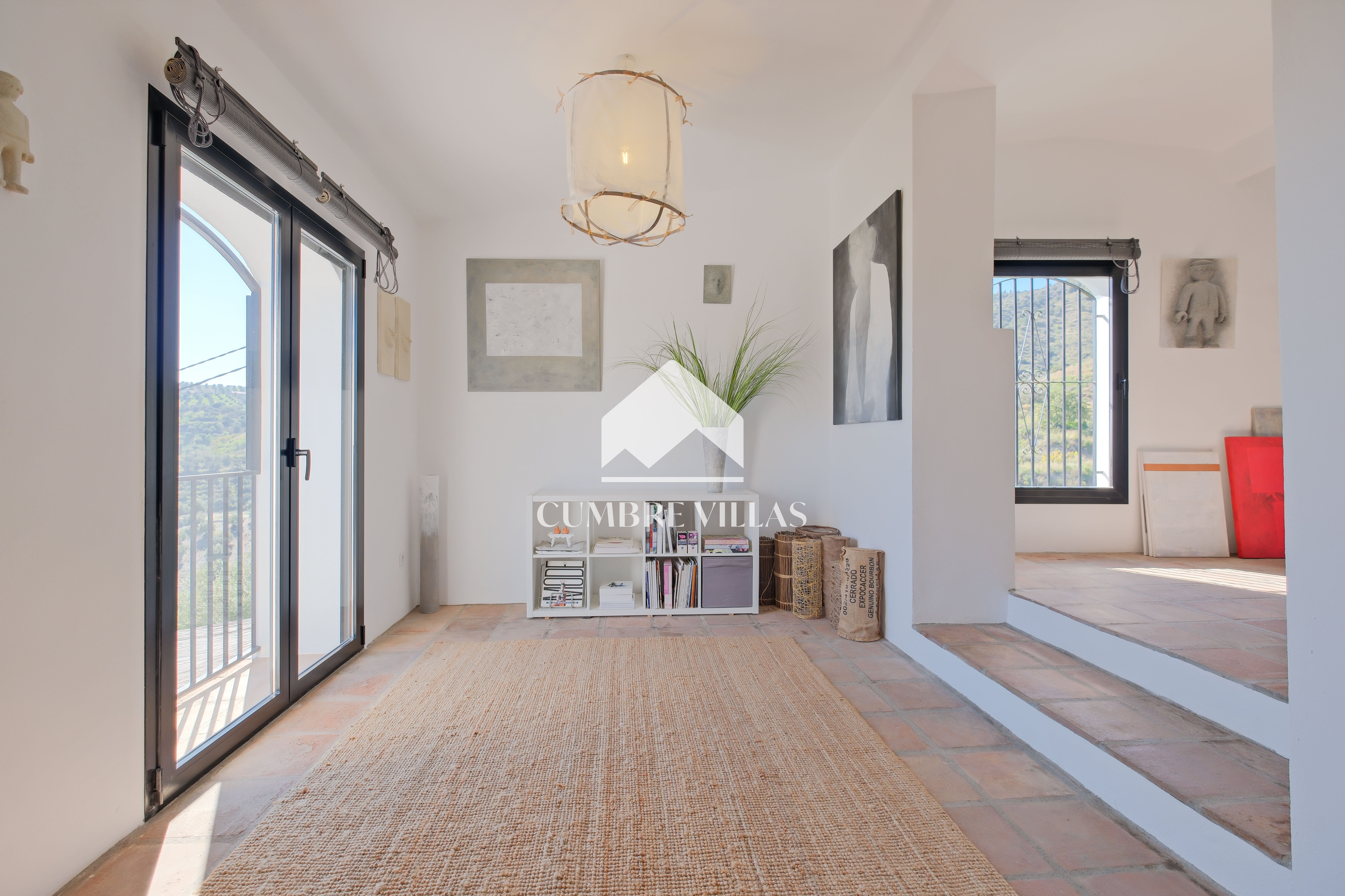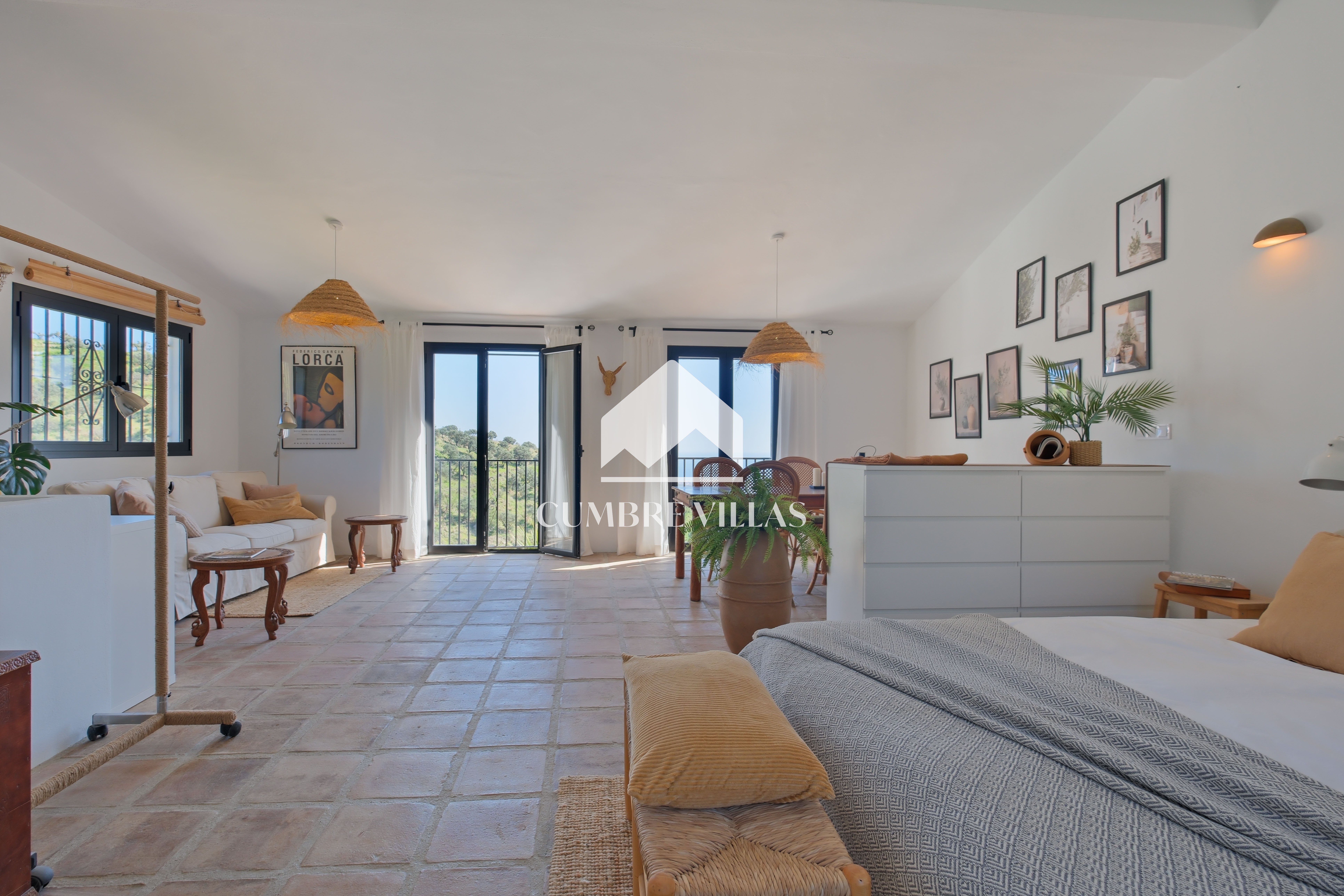 There are two entrances to the finca at the top of the plot. Through the main gate, you arrive at a large level area with a garage/storage room and solar panels. This area also provides ample outdoor parking for guests. From here, you can enter the upper floor of the first home. A hallway leads to three bedrooms and a bathroom and connects to a spacious living room with two distinct areas. With large picture windows framing the sea and valley, this space is filled with natural light and would be ideal for an art studio or home office.