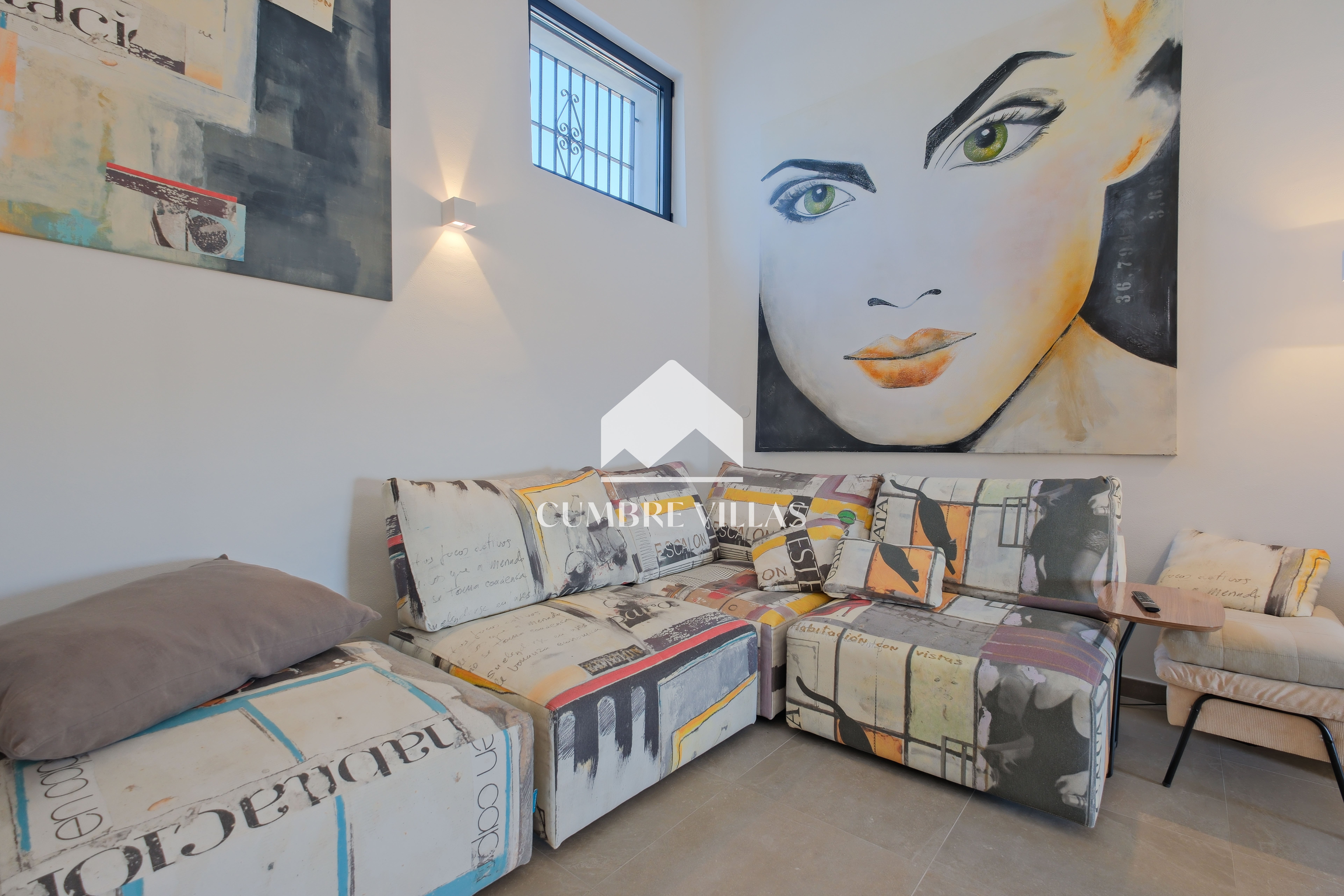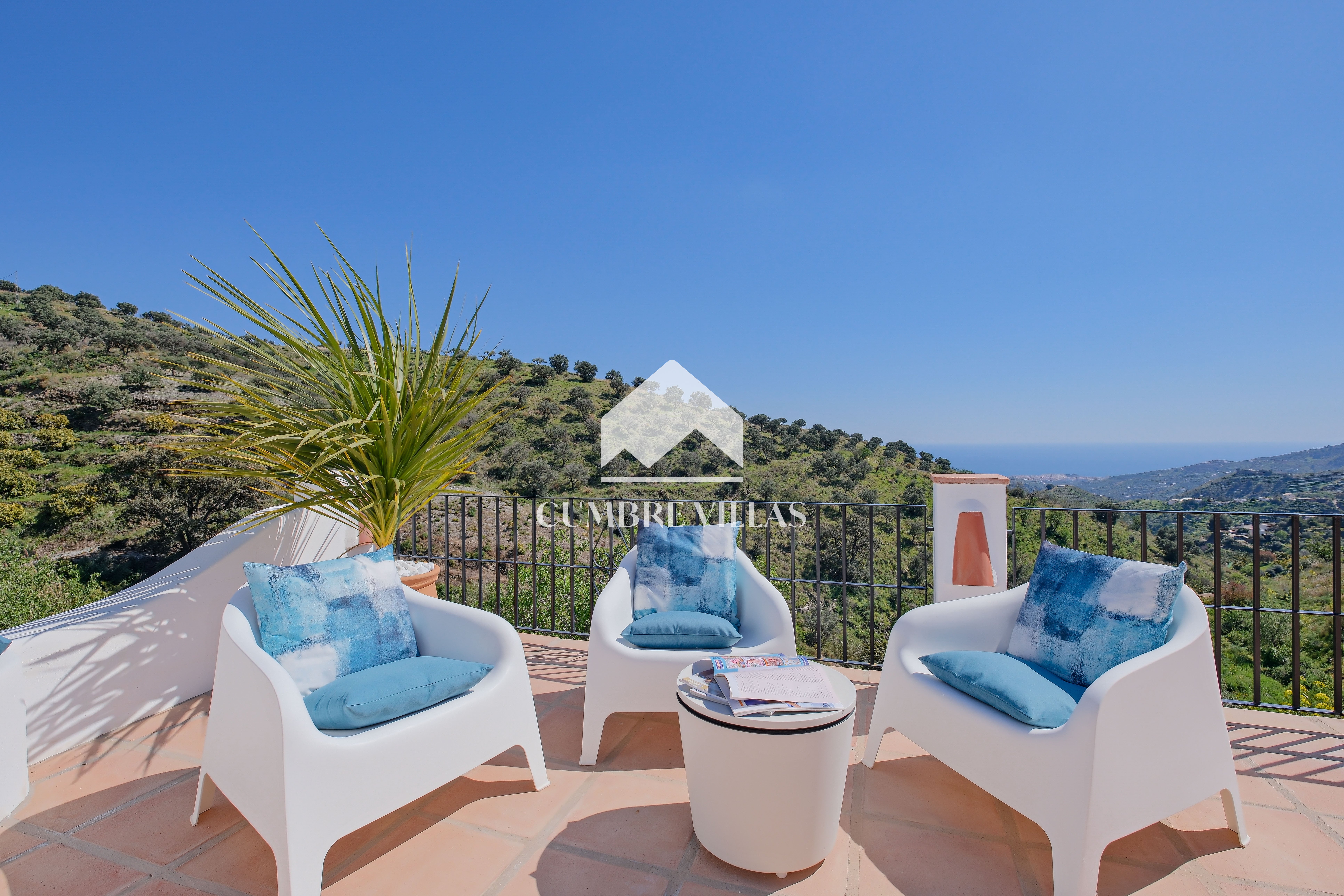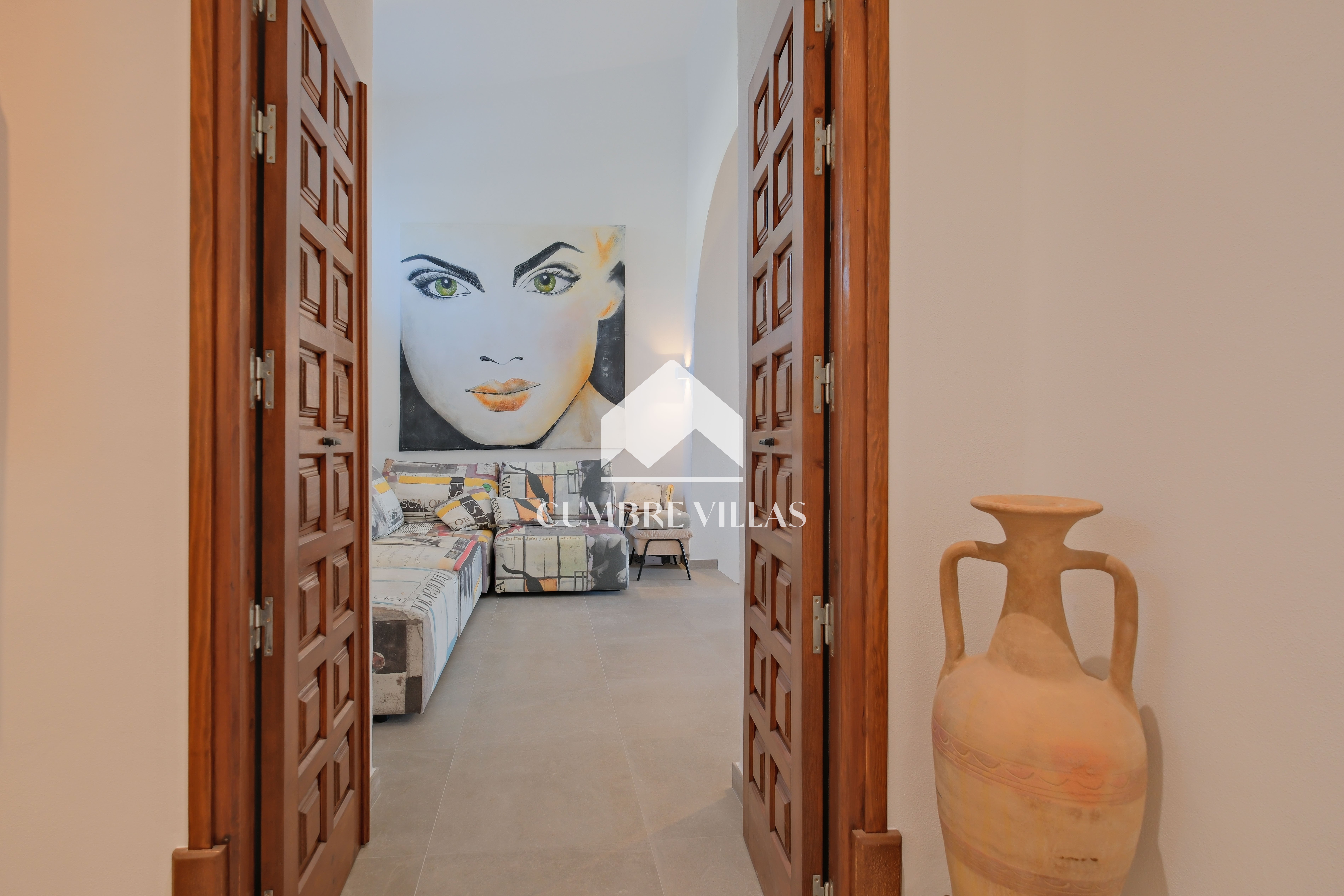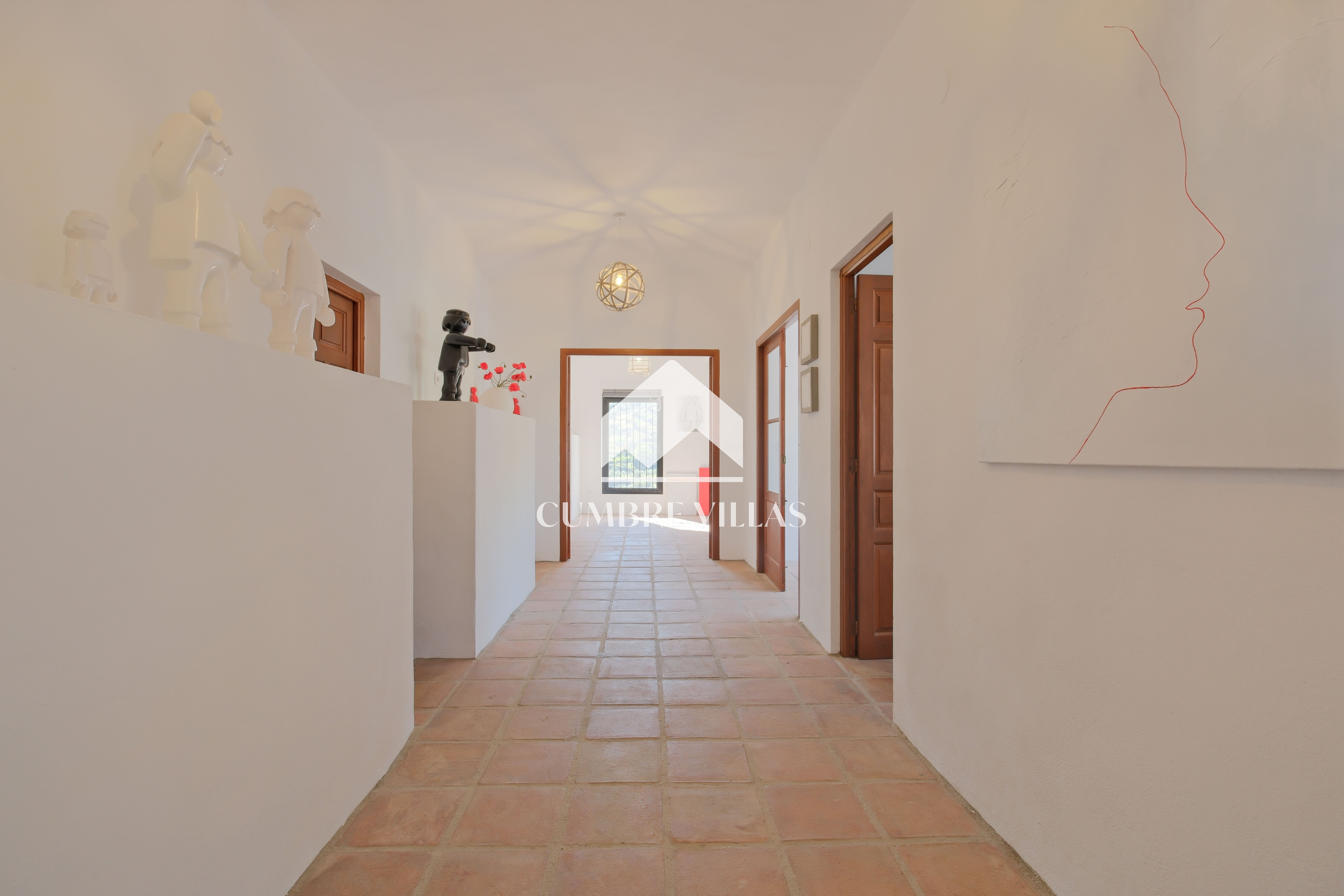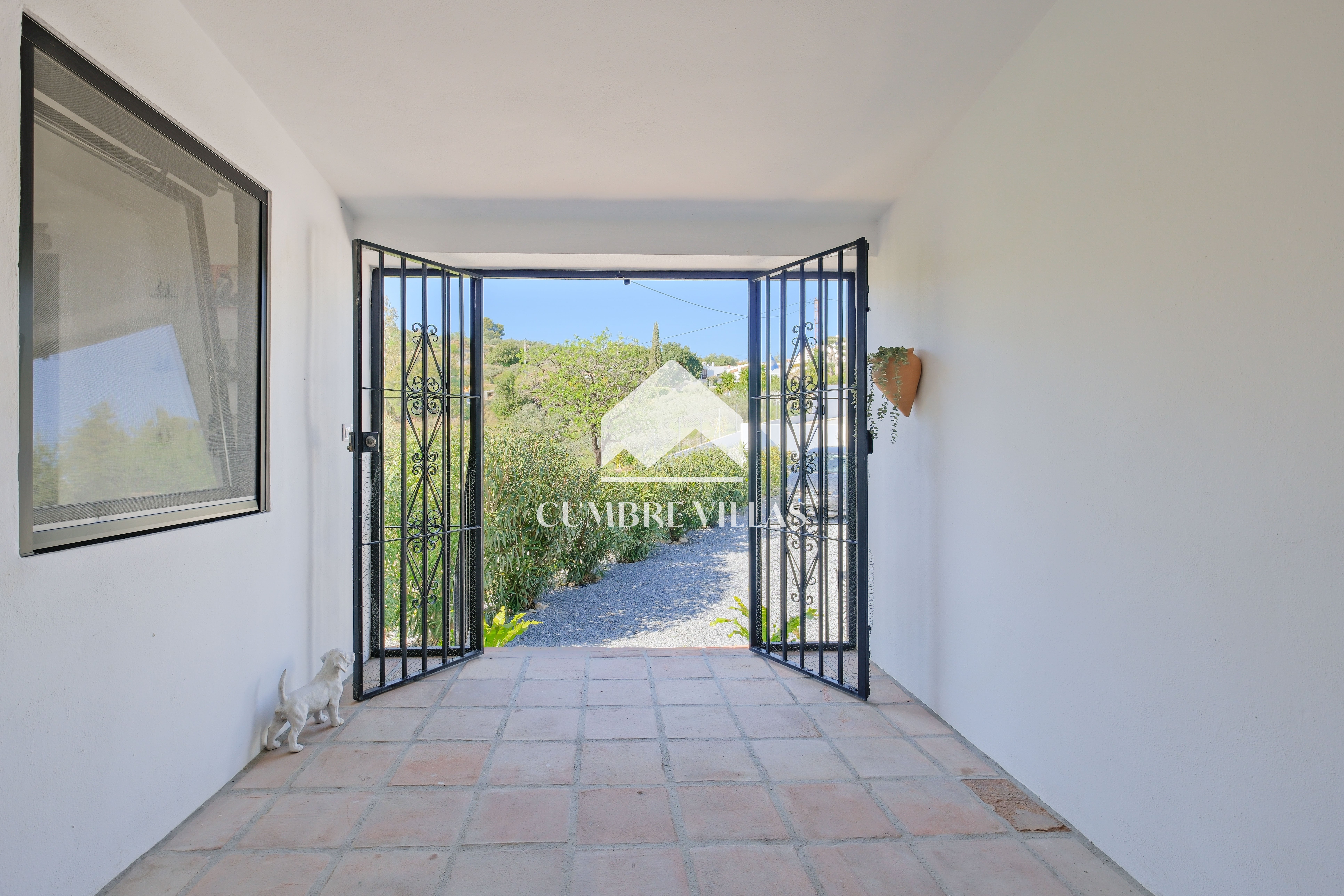 There are two entrances to the finca at the top of the plot. Through the main gate, you arrive at a large level area with a garage/storage room and solar panels. This area also provides ample outdoor parking for guests. From here, you can enter the upper floor of the first home. A hallway leads to three bedrooms and a bathroom and connects to a spacious living room with two distinct areas. With large picture windows framing the sea and valley, this space is filled with natural light and would be ideal for an art studio or home office.