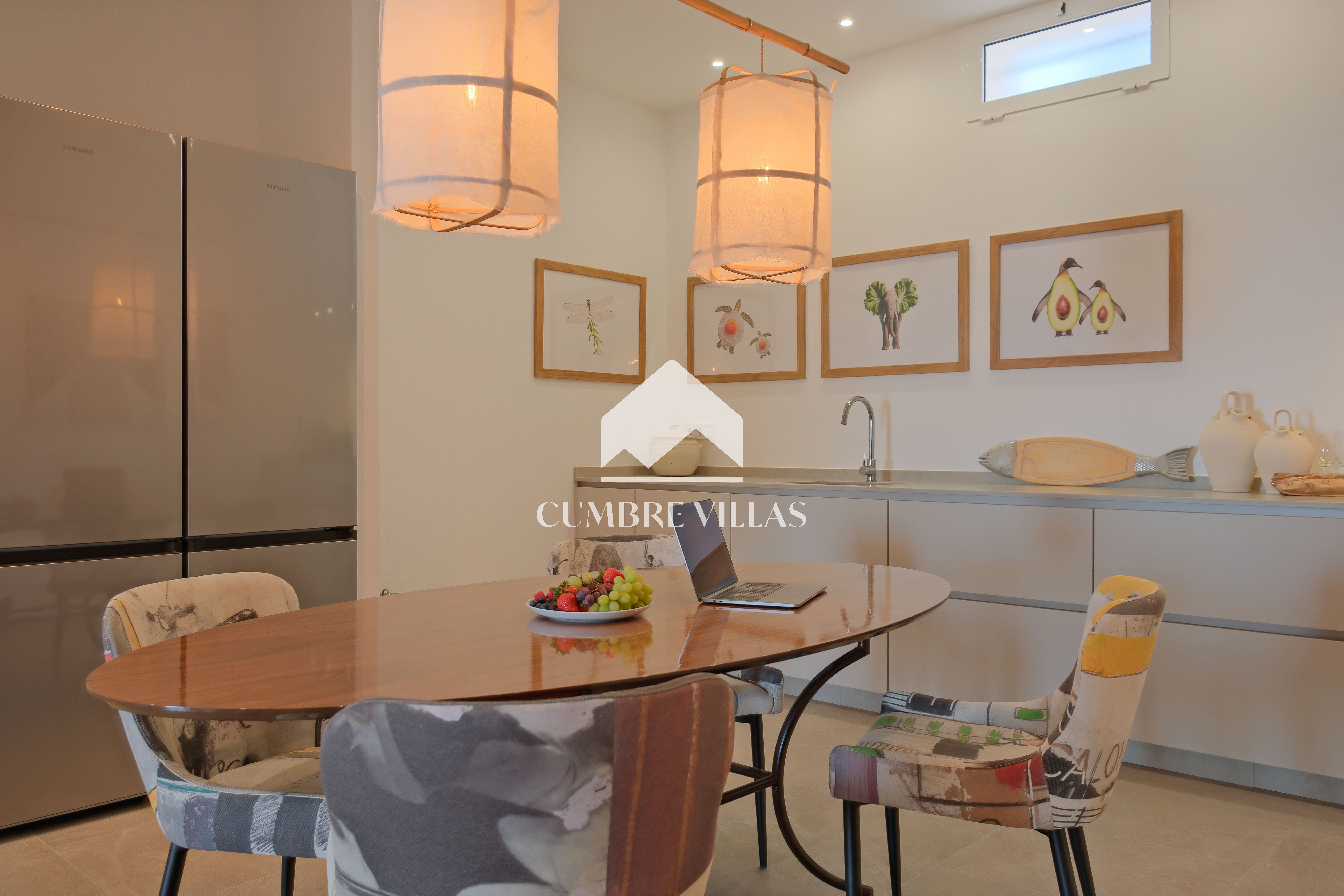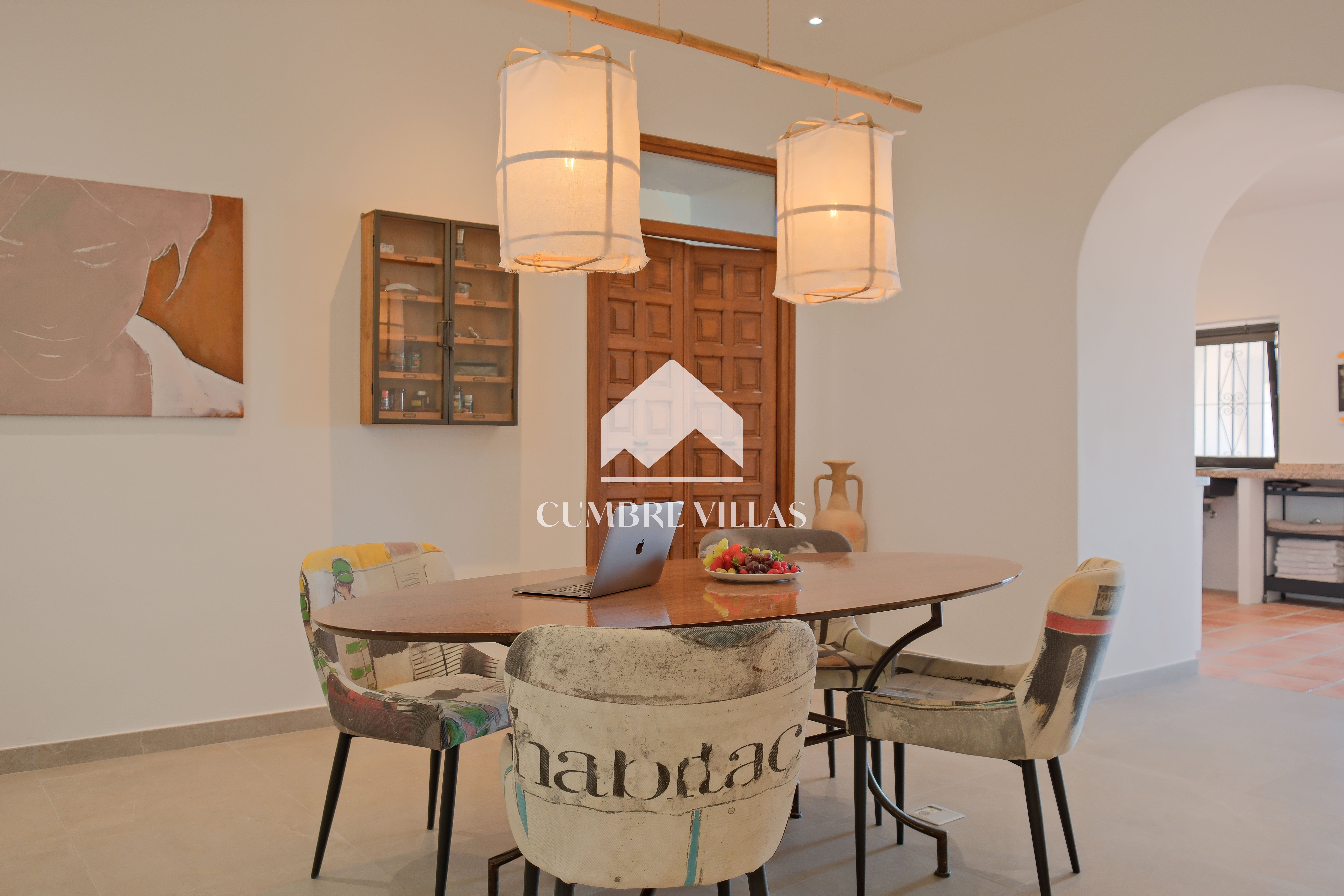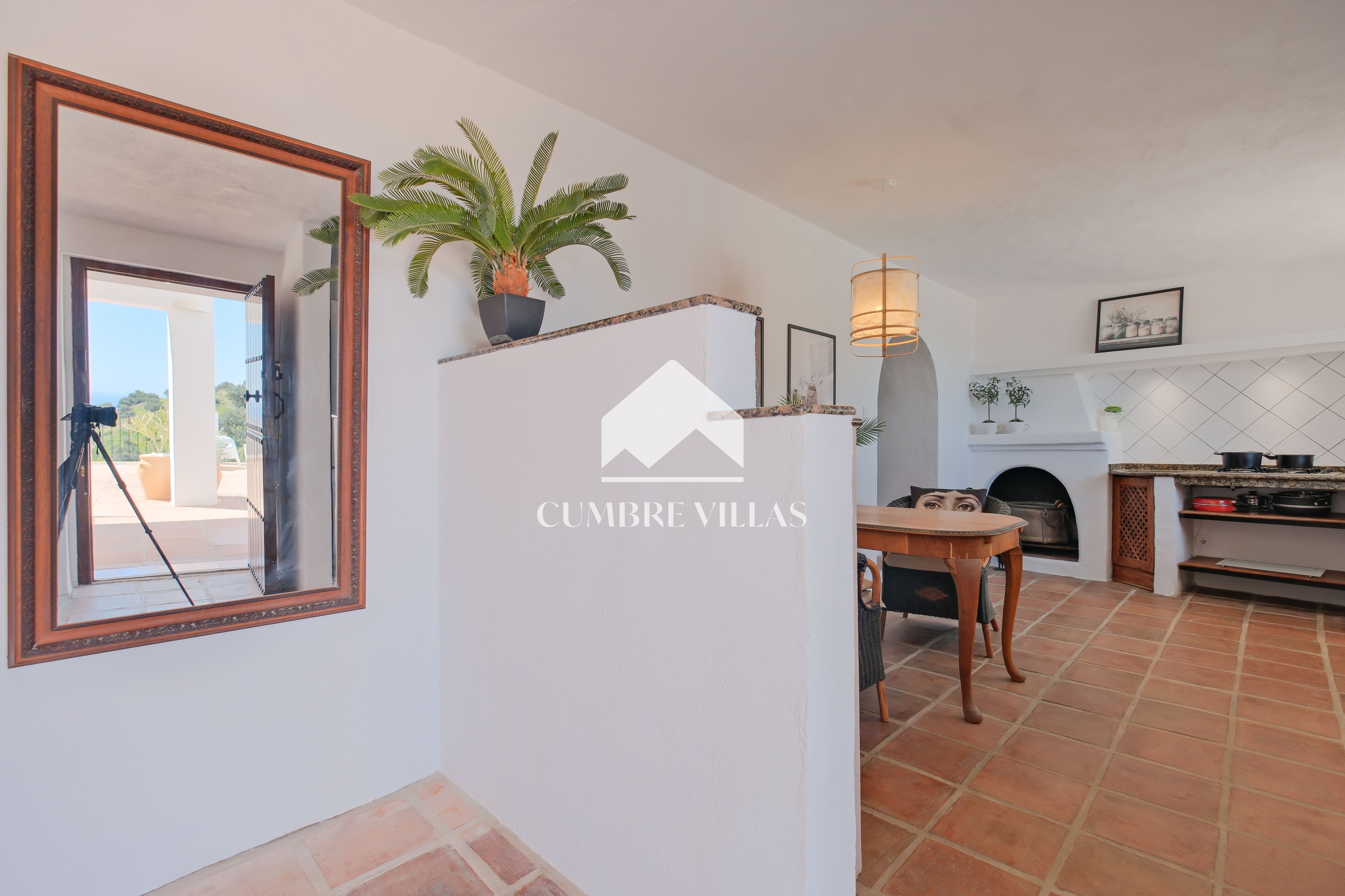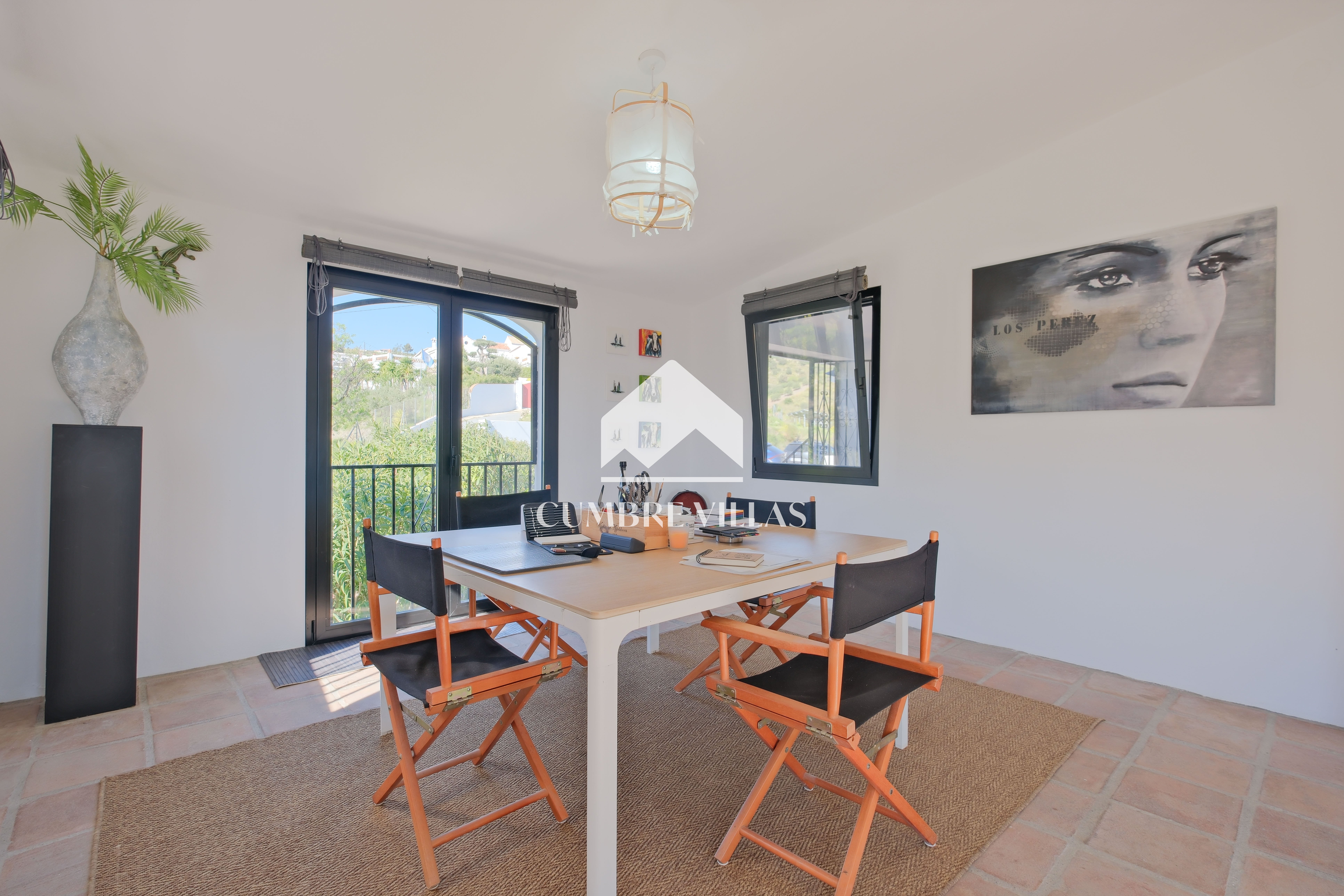 Downstairs, you’ll find a versatile open space that connects to several areas of the home. The current owners use this space as a breakfast room, where you can enjoy the peace and views every morning. Behind the staircase is a cosy office with a view to the main terrace, and to the right you step out onto a covered pergola terrace.