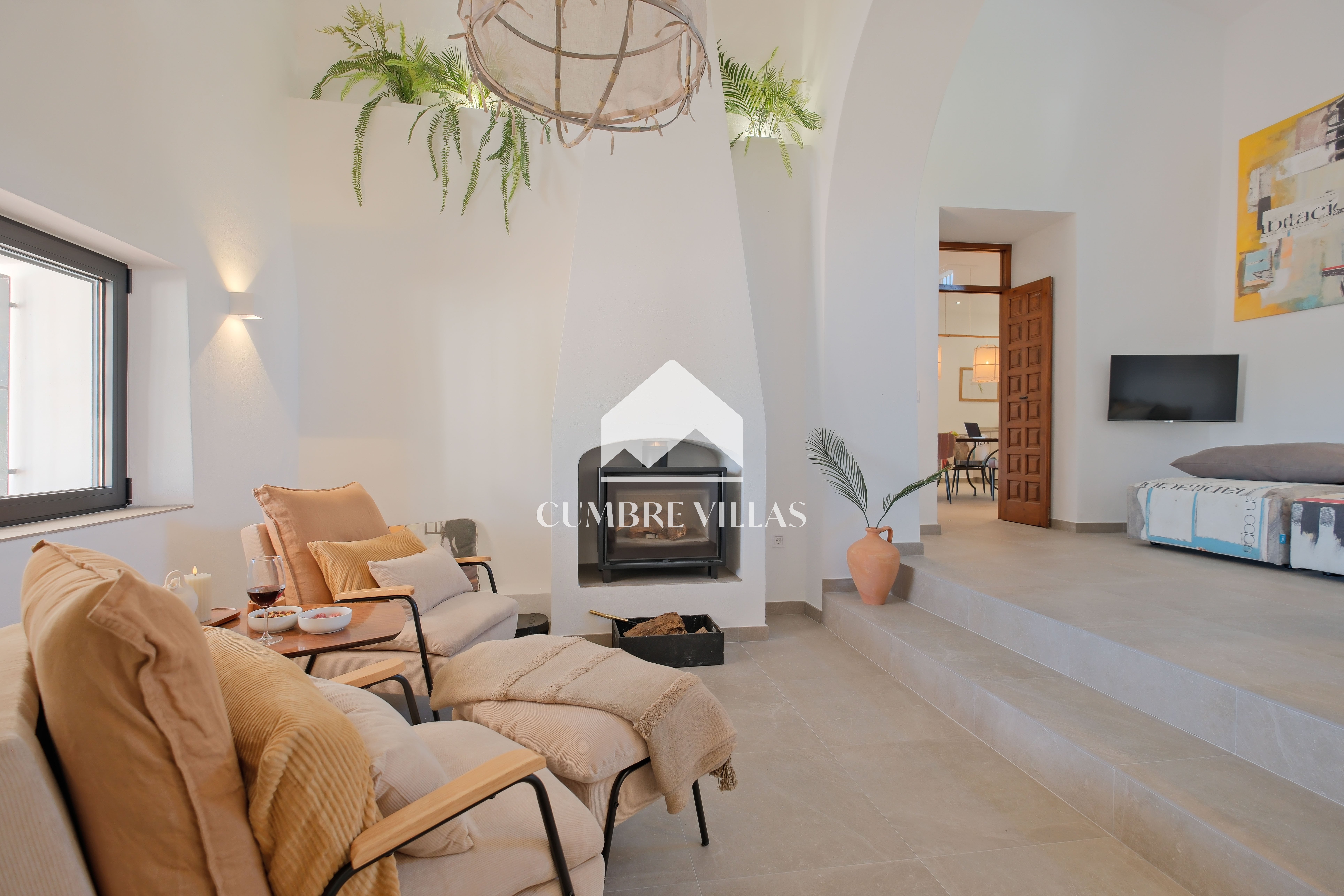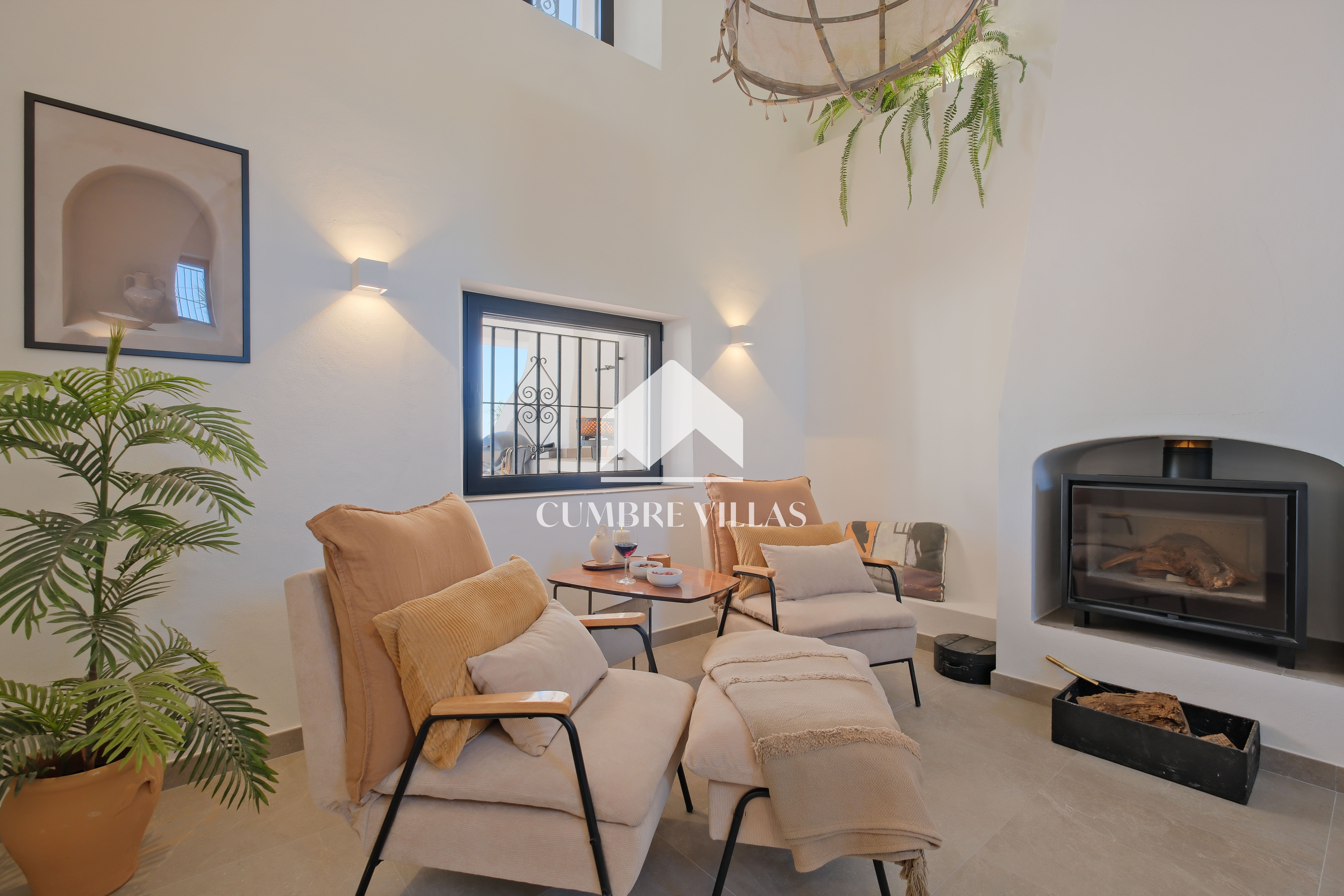 From the kitchen, you pass into another living room with high ceilings, where a cosy reading nook has been created next to the fireplace. This room connects to the second house, which also has its own entrance from the main terrace next to the outdoor kitchen. This second home was joined to the first just a year ago and has retained its original style. On the ground floor, you’ll find a spacious kitchen and a bathroom, while upstairs there’s a large open-plan room with beautiful views.