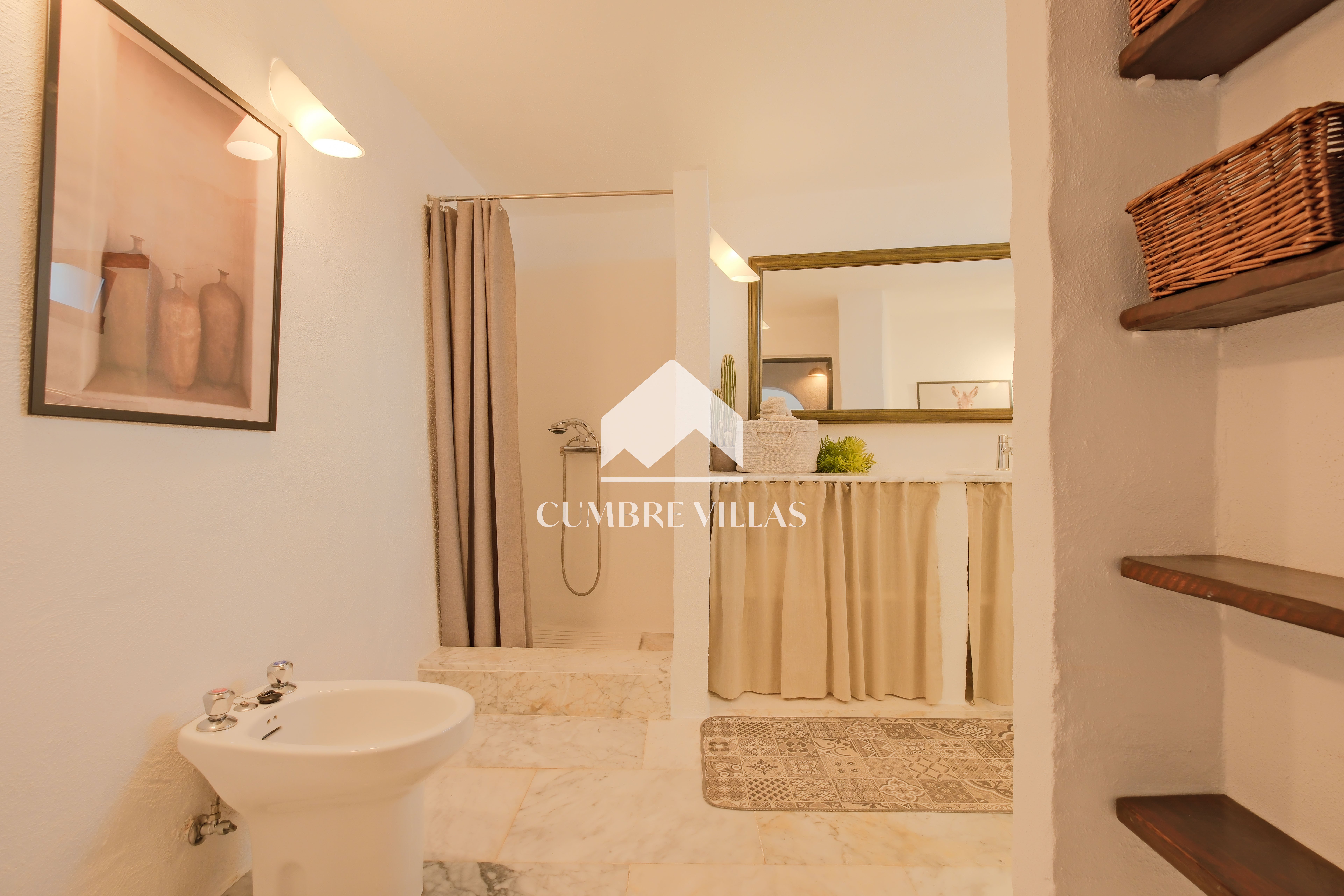 Back inside, the open space leads to the dine-in kitchen, which is equipped with modern appliances. This room was once a water deposit, now converted into an inviting area. From one corner, you reach a guest toilet and the main bedroom, which stays naturally cool in the summer thanks to its location on the ground floor. The open-concept bathroom is integrated into the bedroom, creating the feel of an exclusive hotel suite.