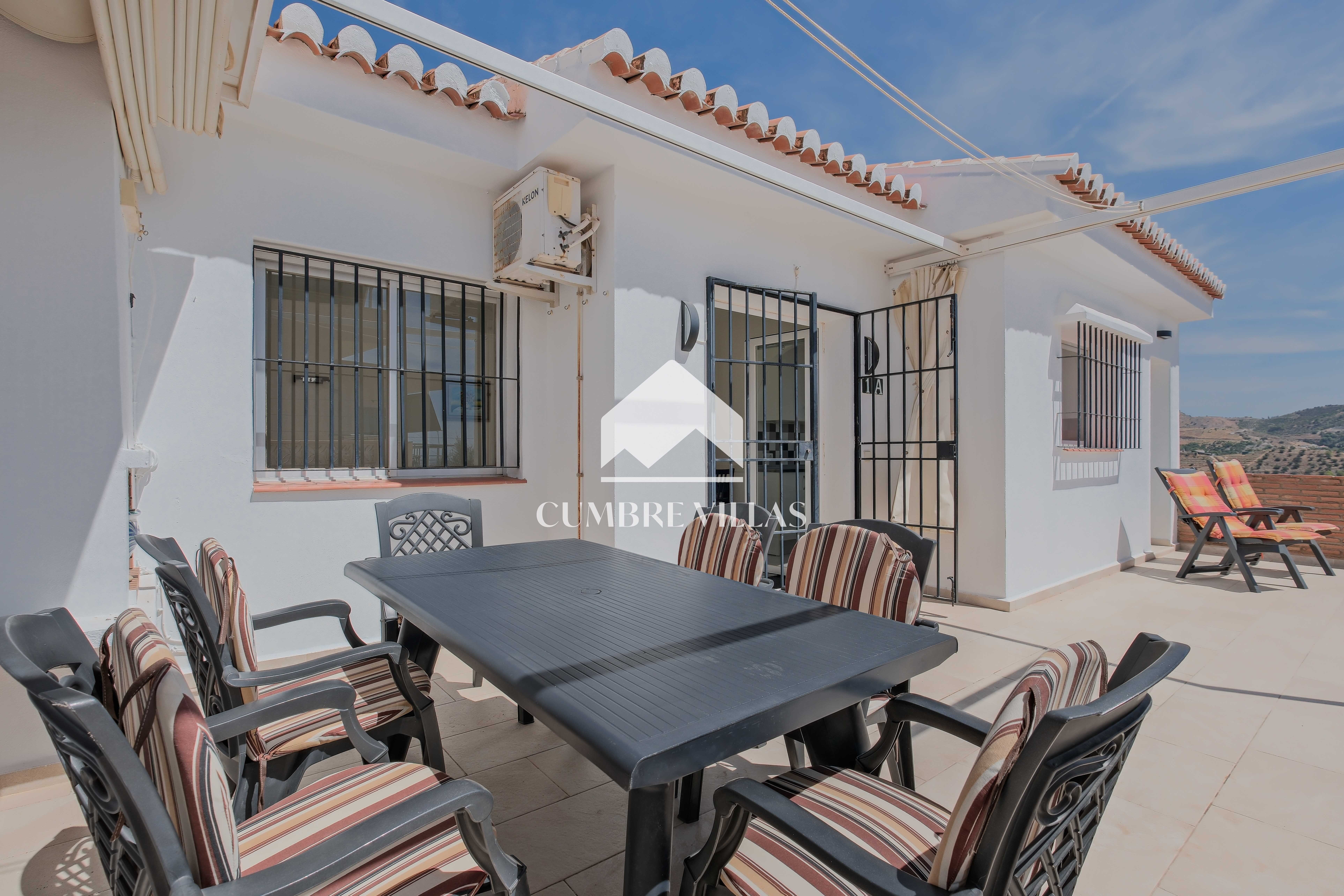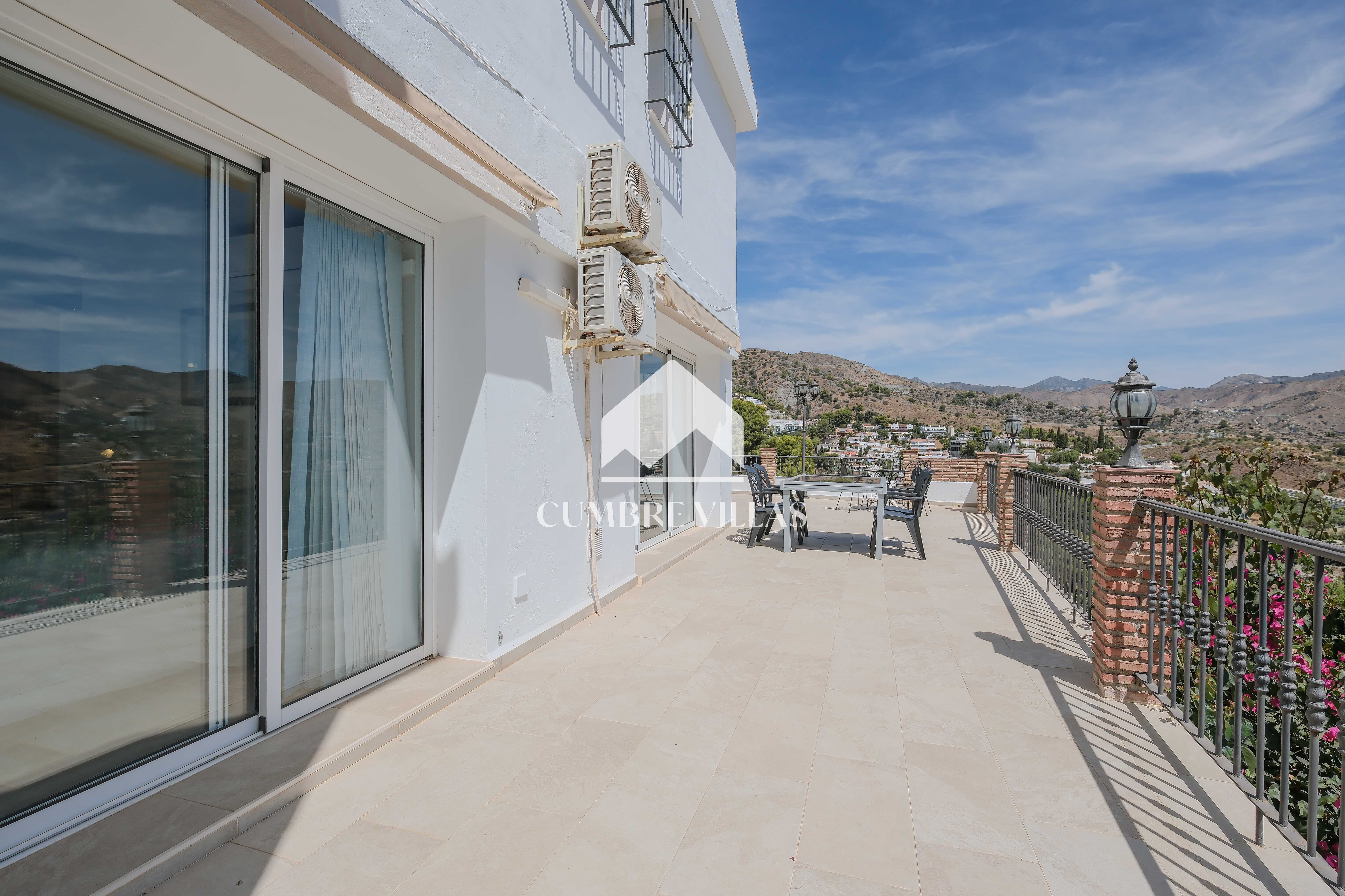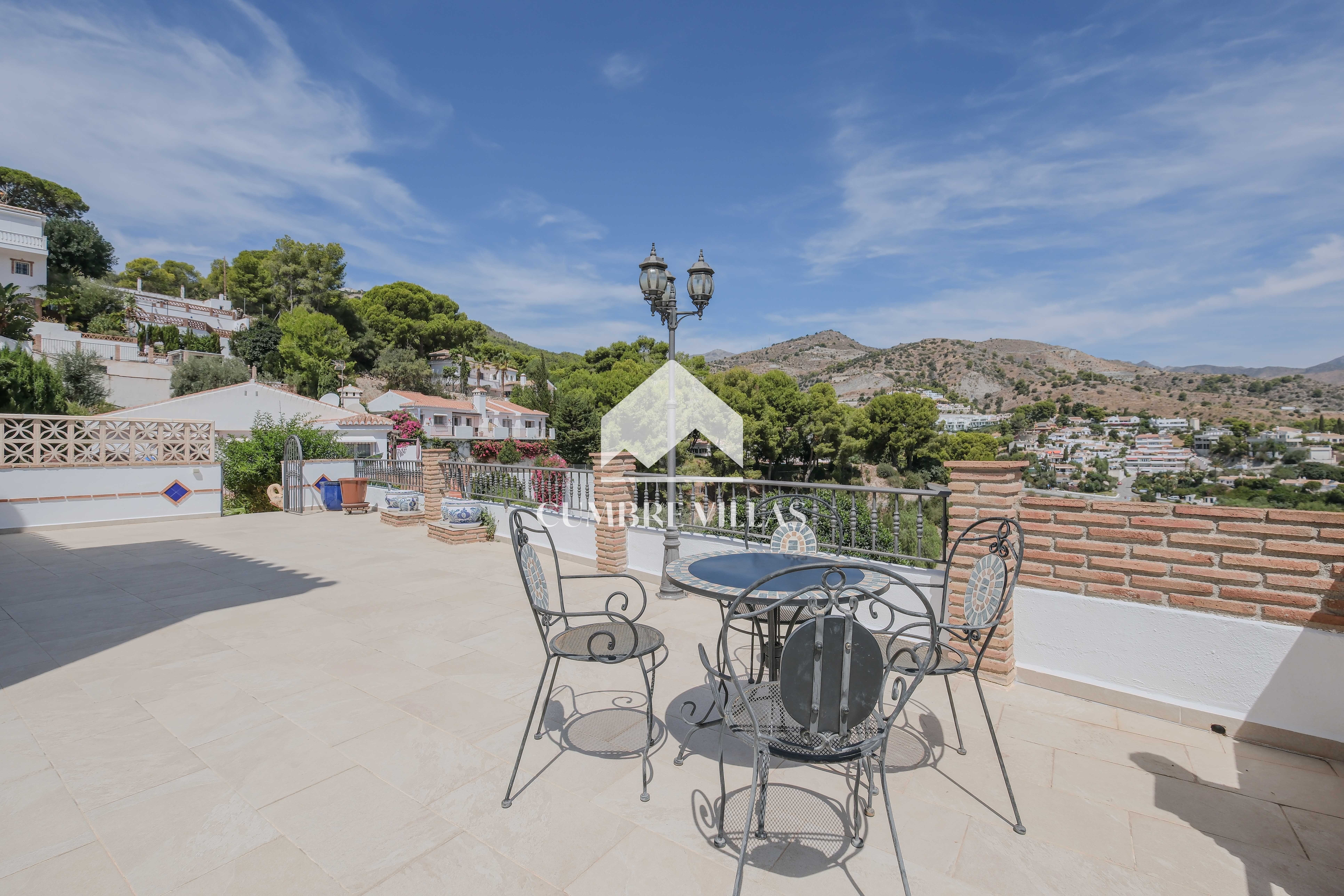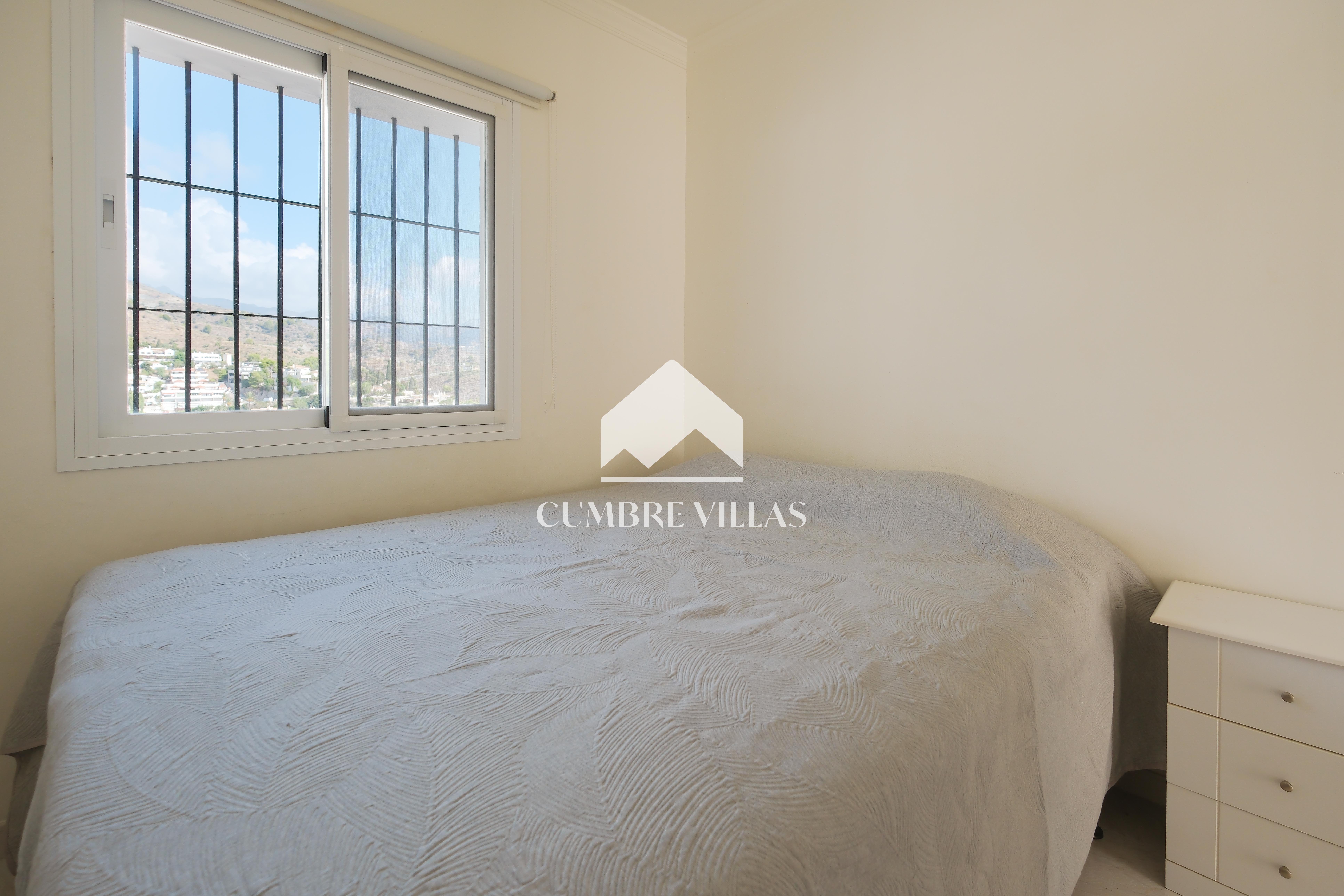 From the kitchen there is access to a bedroom currently fitted with a bunk bed, which also has a private bathroom and a ceiling fan. The main bedroom, accessed from the living room, has built-in wardrobes, air conditioning, and a full bathroom with bathtub. In addition, it connects to the large L-shaped terrace, which provides both shade and sun, as well as spectacular views of the sea, the mountains, the countryside, the bay, and the village of La Herradura.