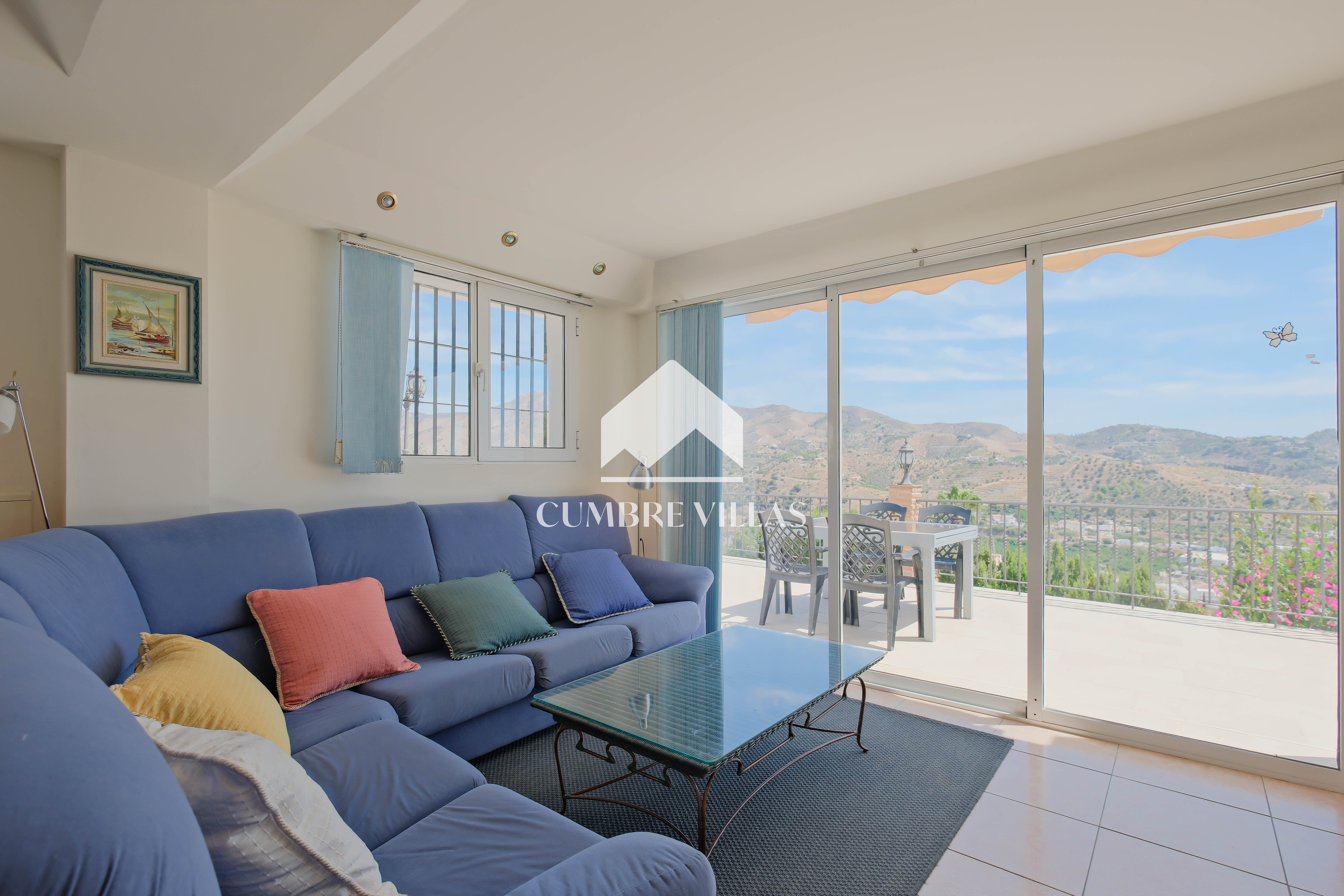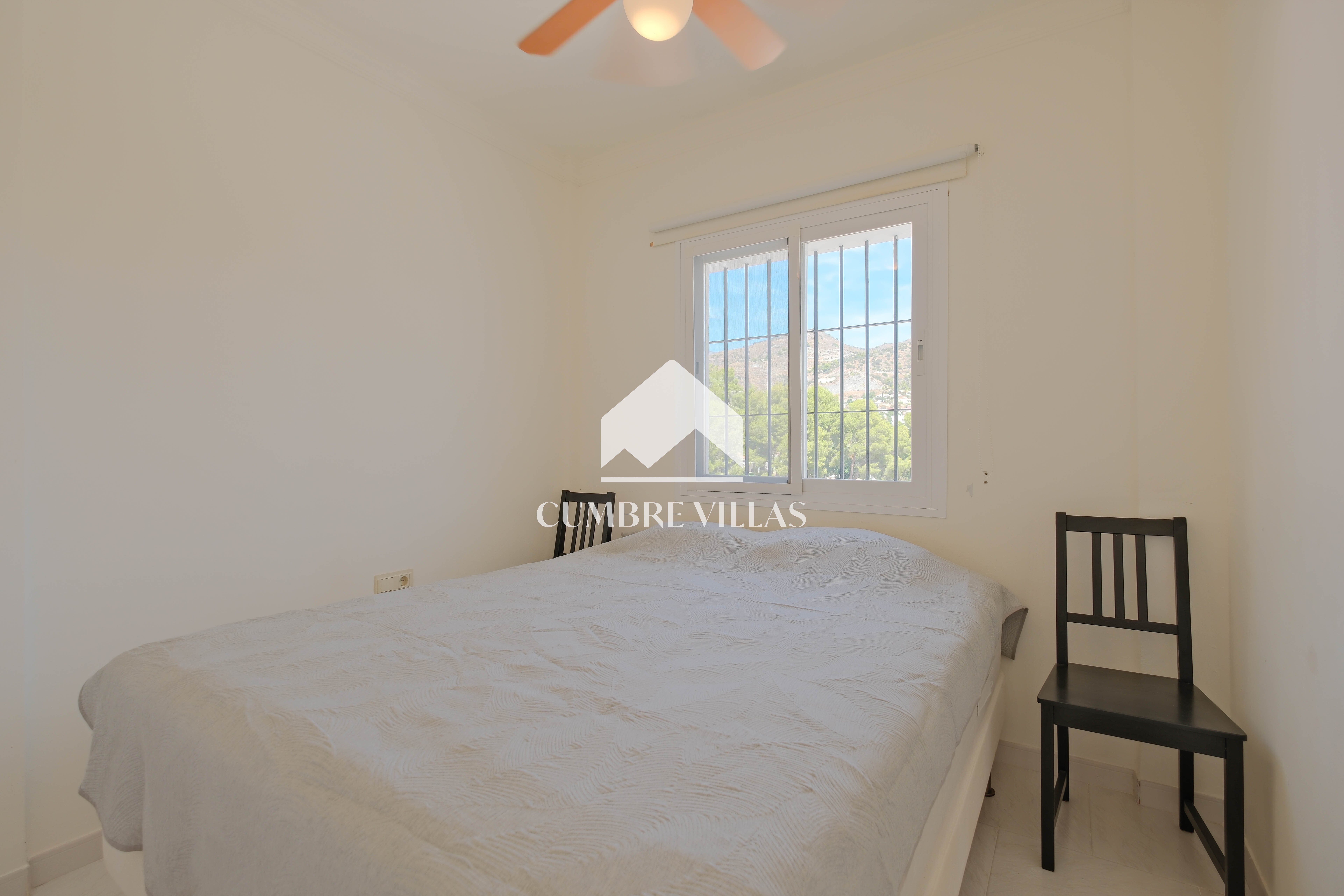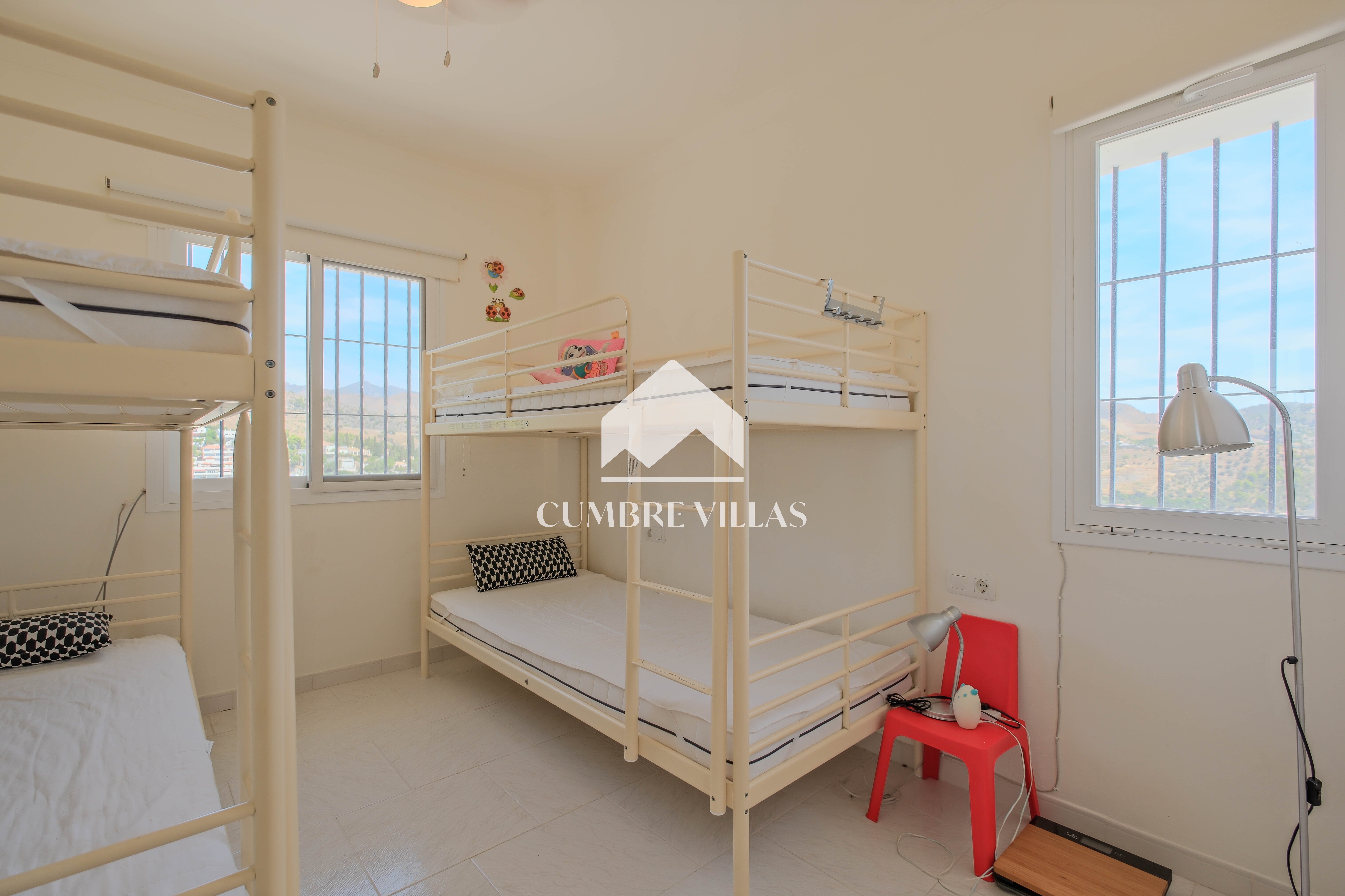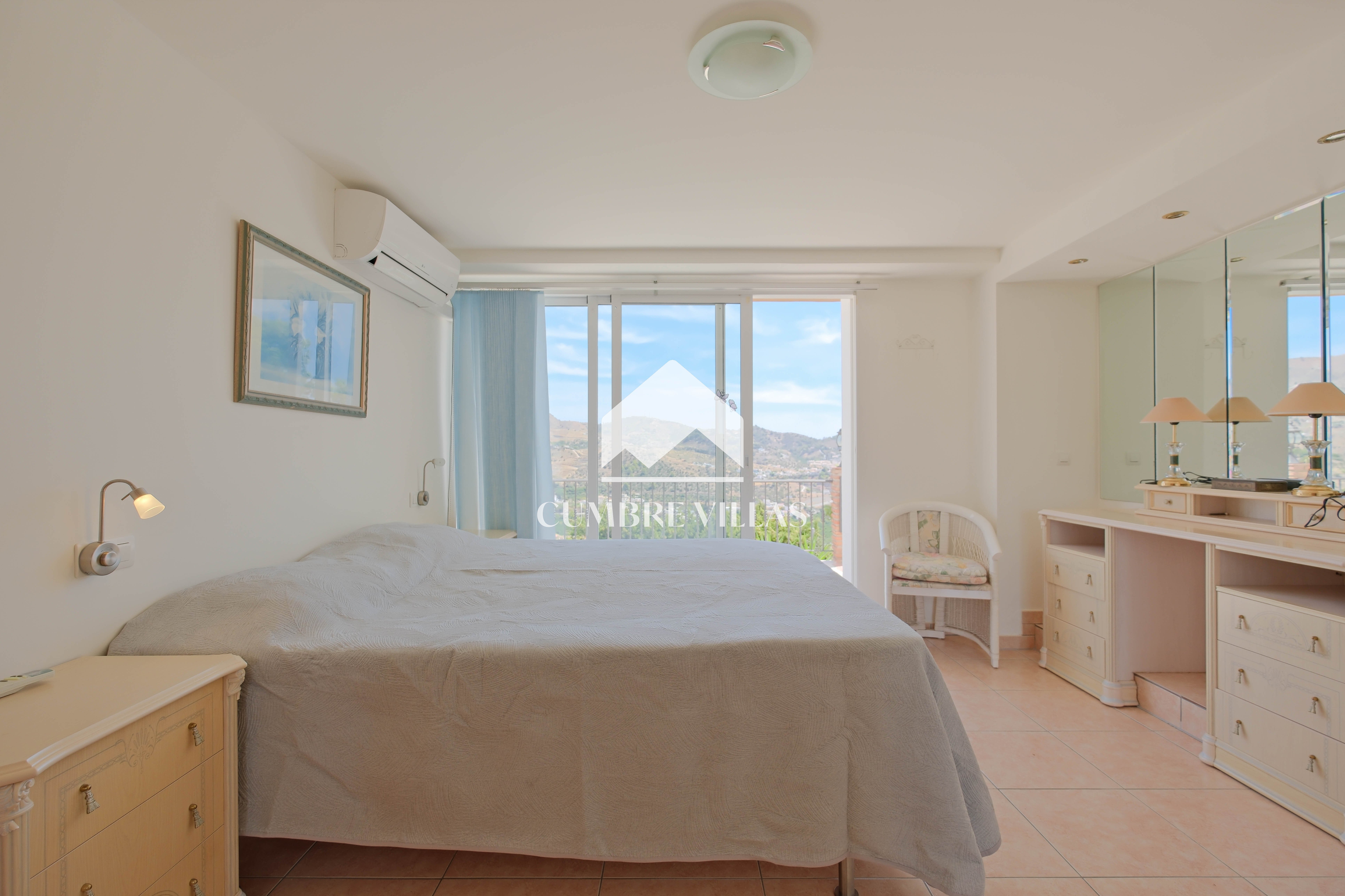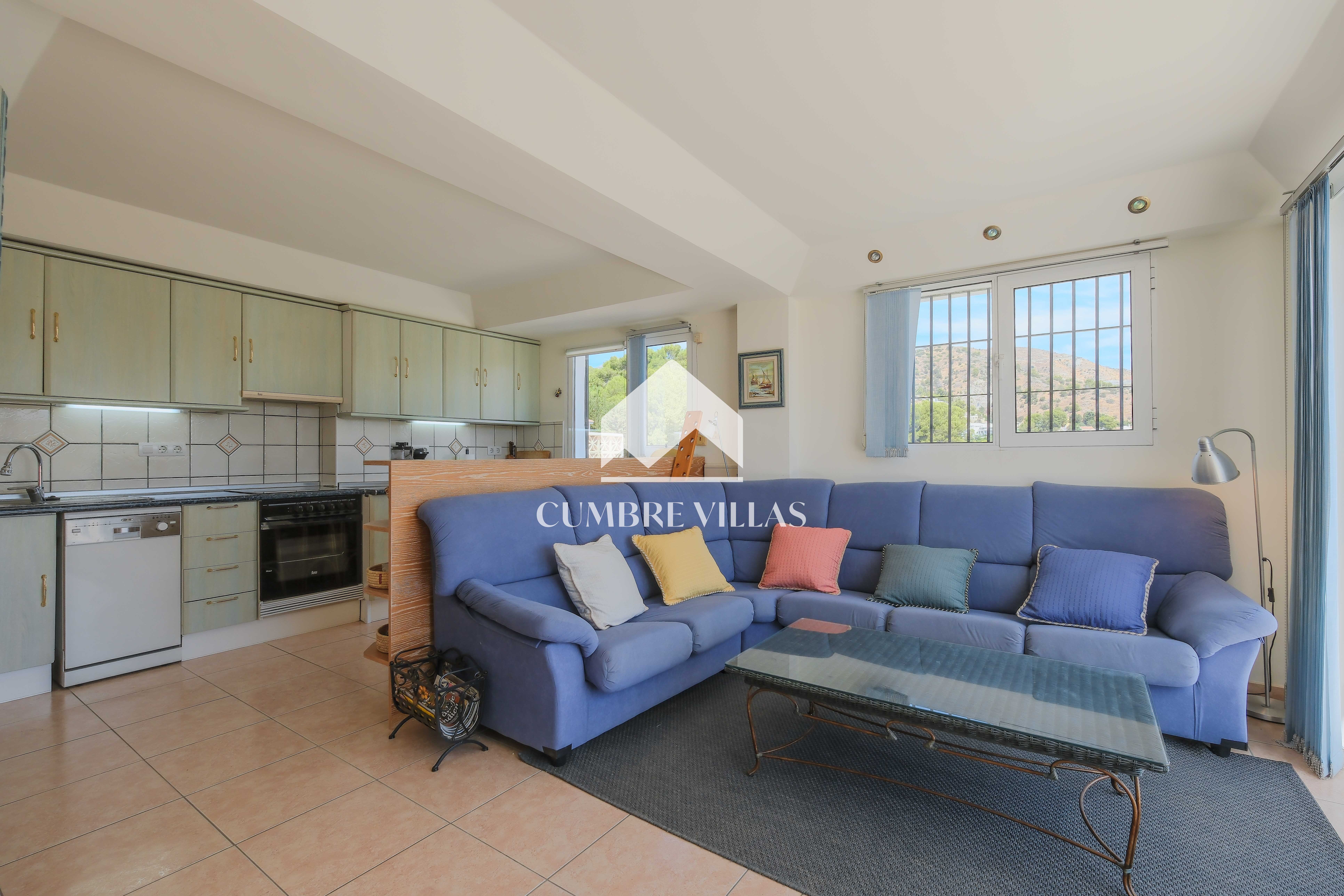 From the kitchen there is access to a bedroom currently fitted with a bunk bed, which also has a private bathroom and a ceiling fan. The main bedroom, accessed from the living room, has built-in wardrobes, air conditioning, and a full bathroom with bathtub. In addition, it connects to the large L-shaped terrace, which provides both shade and sun, as well as spectacular views of the sea, the mountains, the countryside, the bay, and the village of La Herradura.