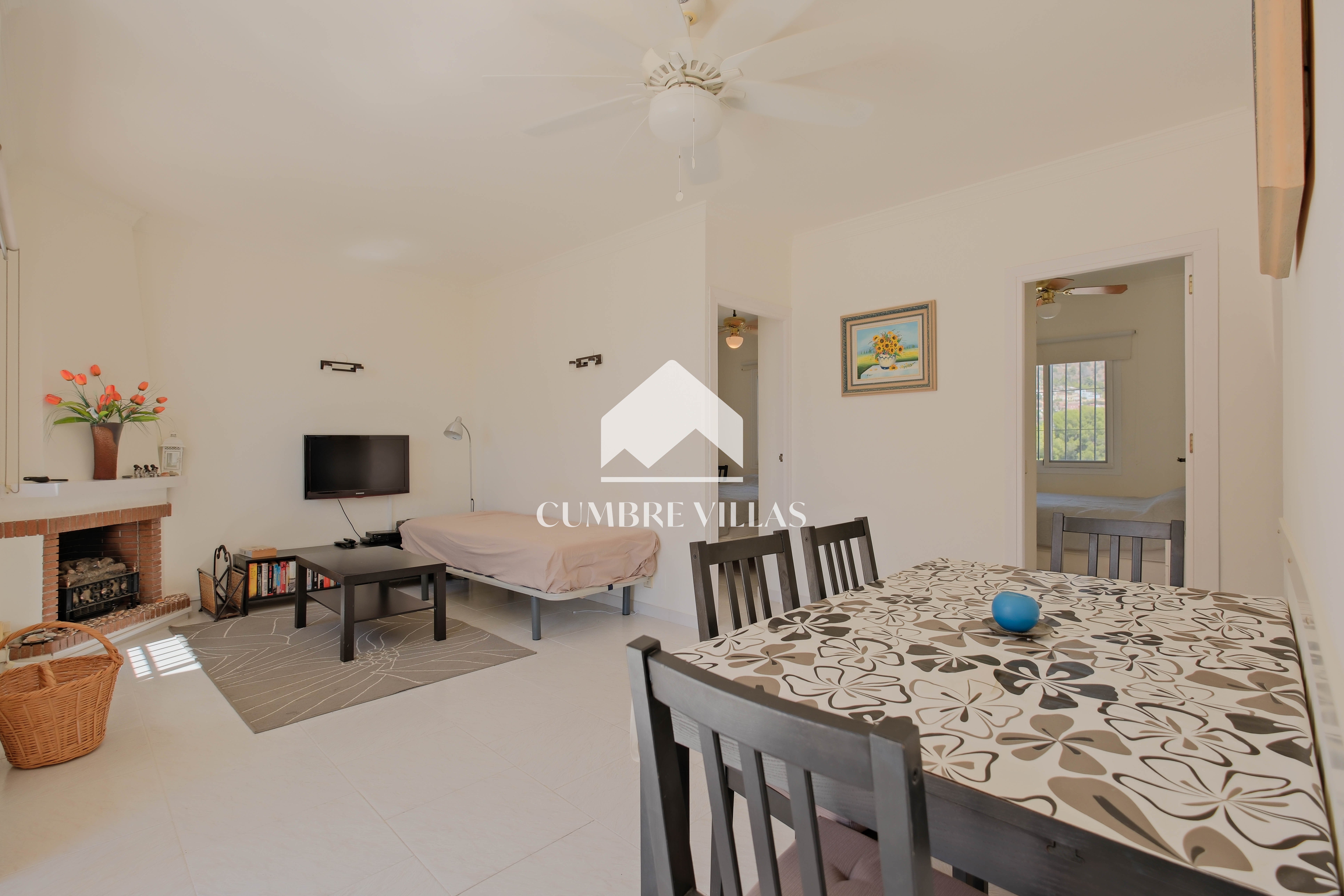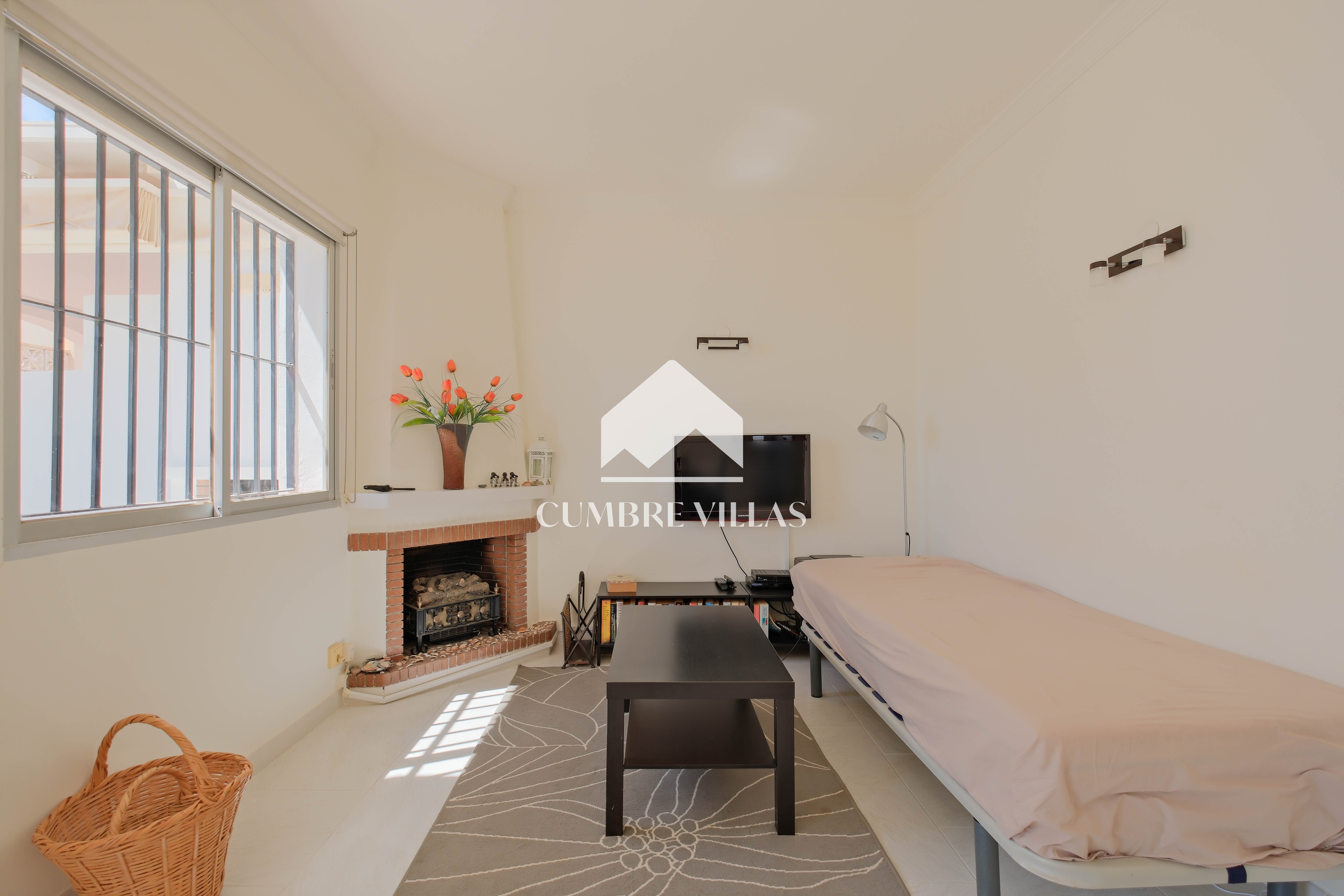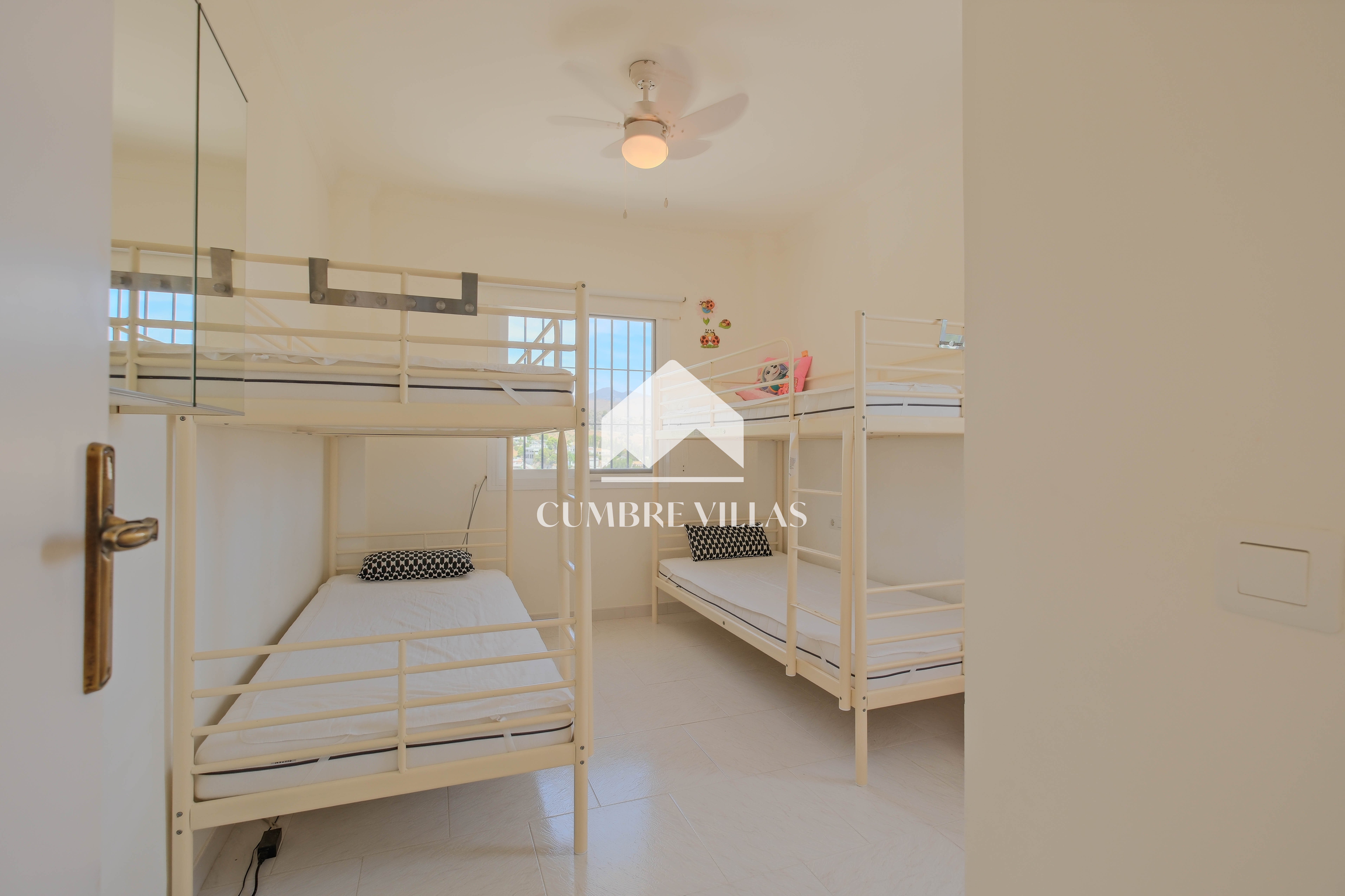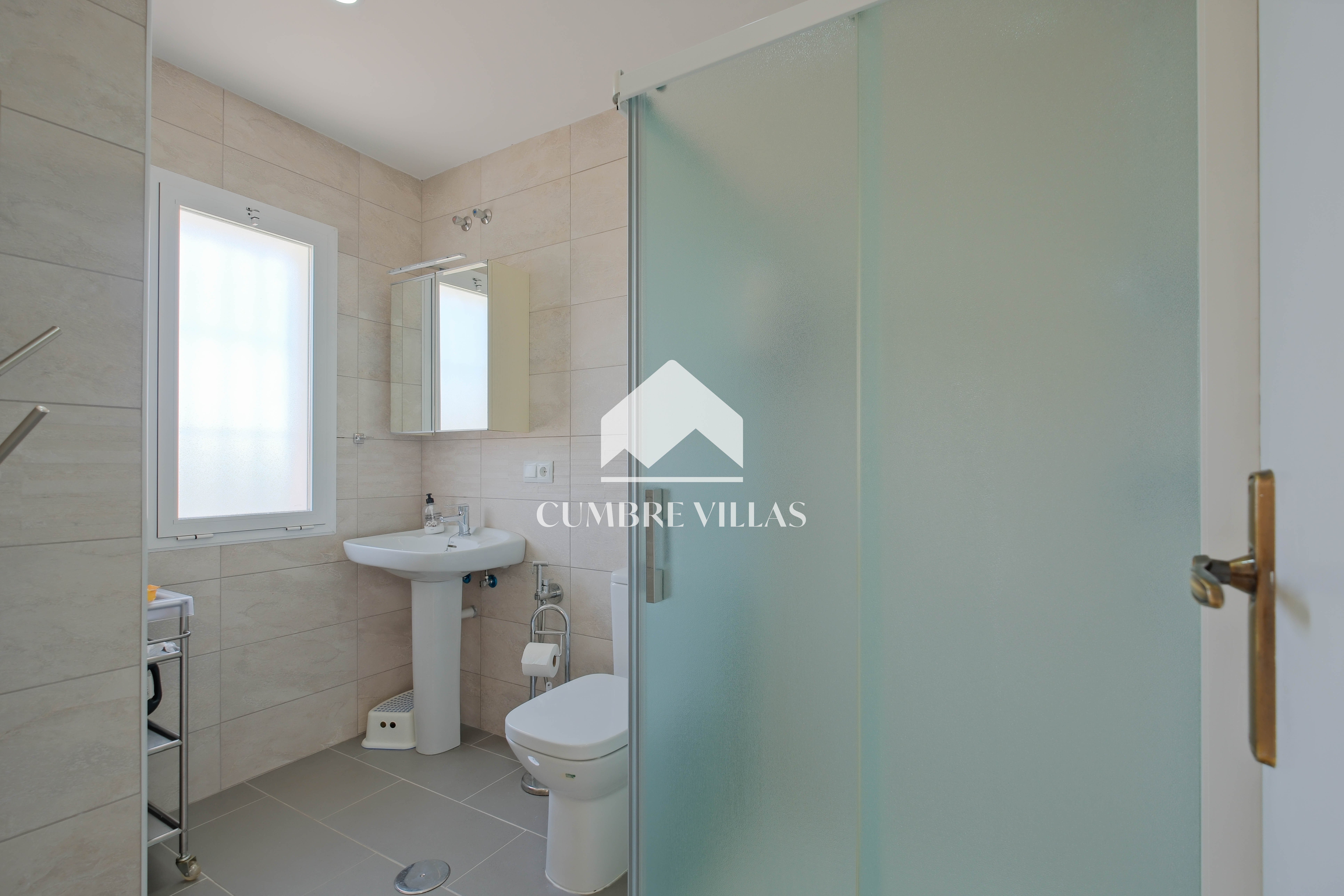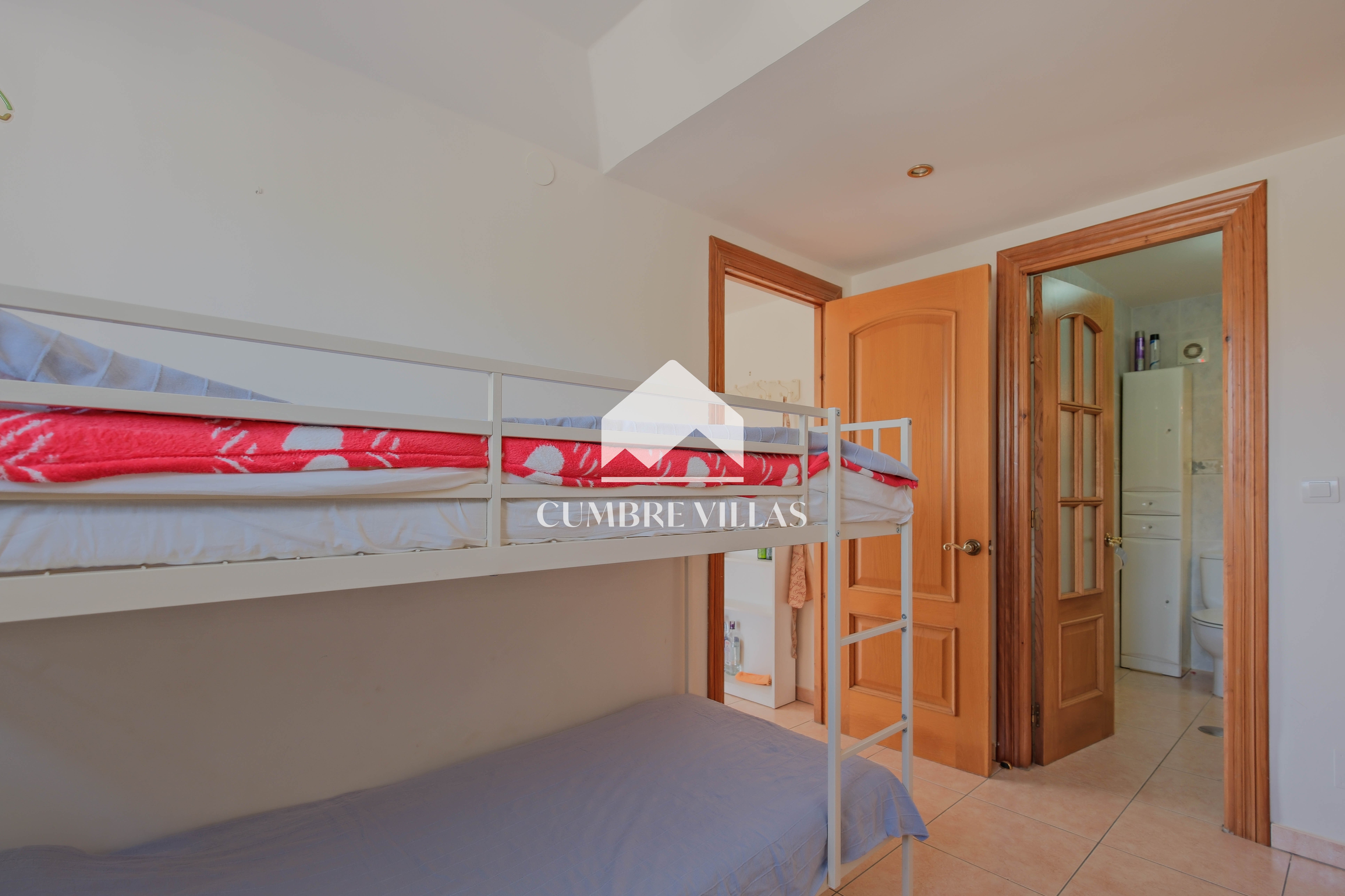 The upper-floor home, with independent access via a communal staircase, has a large southwest-facing terrace with spectacular views and a built-in barbecue. Inside, there is a living room with air conditioning and fireplace. To the right, there is a semi-open kitchen with windows that bring in plenty of natural light. Straight ahead are three spacious bedrooms: one to the left of the living room, one in the centre, and a third to the right, very spacious and fitted with two bunk beds. In addition, there are two adjoining bathrooms with showers. There is also a small storage and laundry room on the terrace.