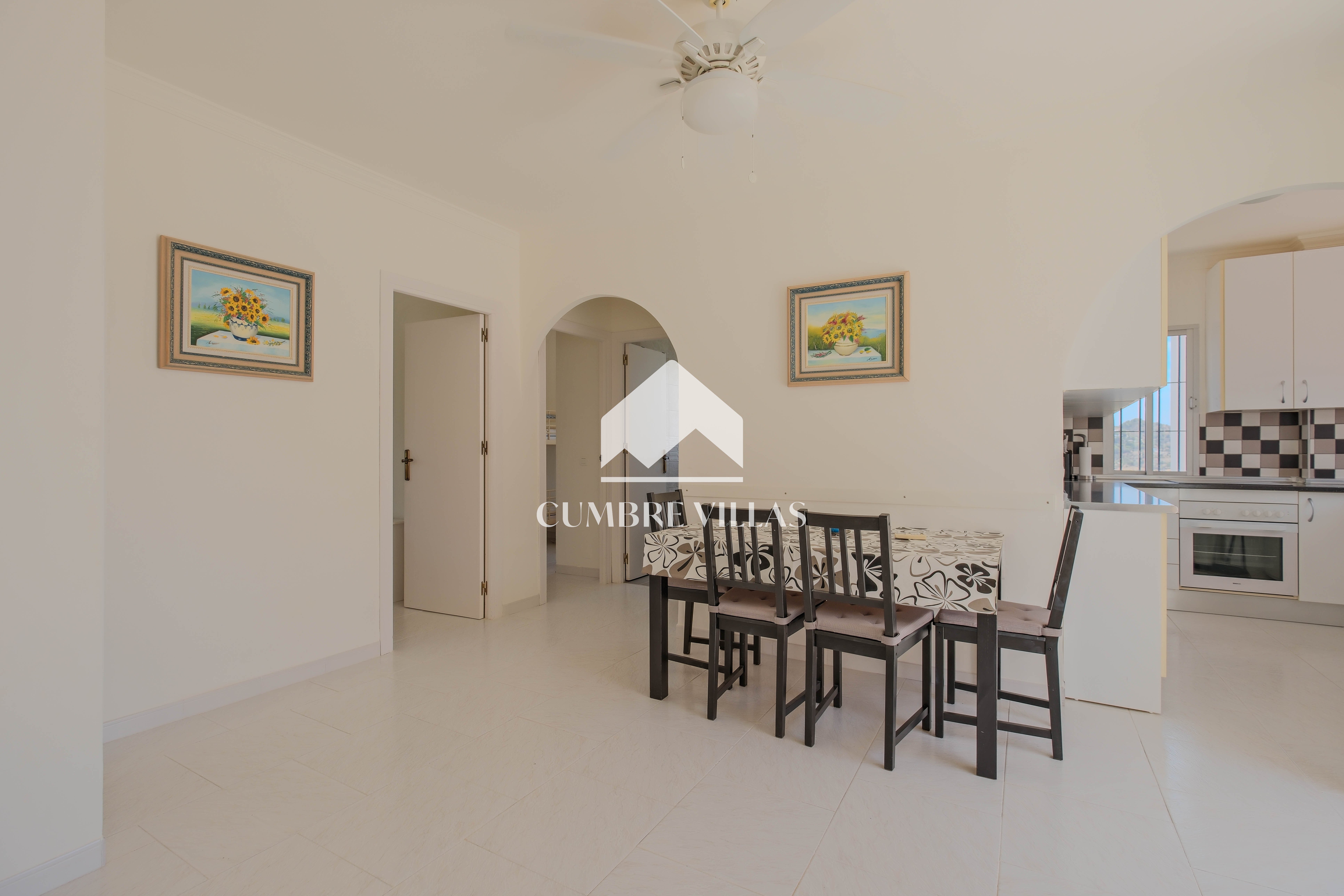 The ground-floor home features a large terrace, a spacious living room with open kitchen, two en-suite bedrooms, and a laundry and storage area with access from the terrace. The house can be entered from two different sides of the terrace. The living room is very bright, fully glazed, and offers stunning views. The open kitchen includes a breakfast bar that also serves as a dining table. This room is equipped with air conditioning.