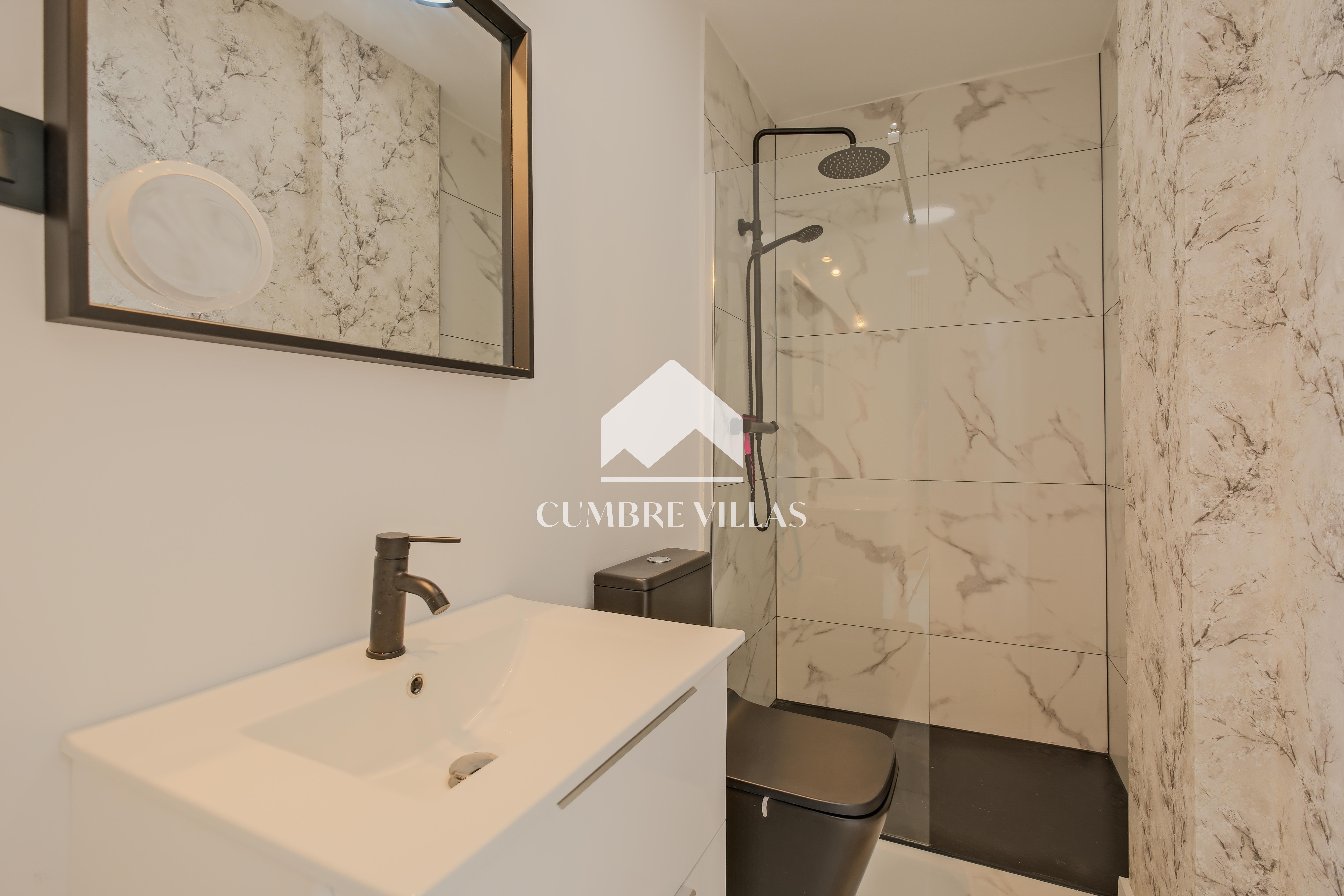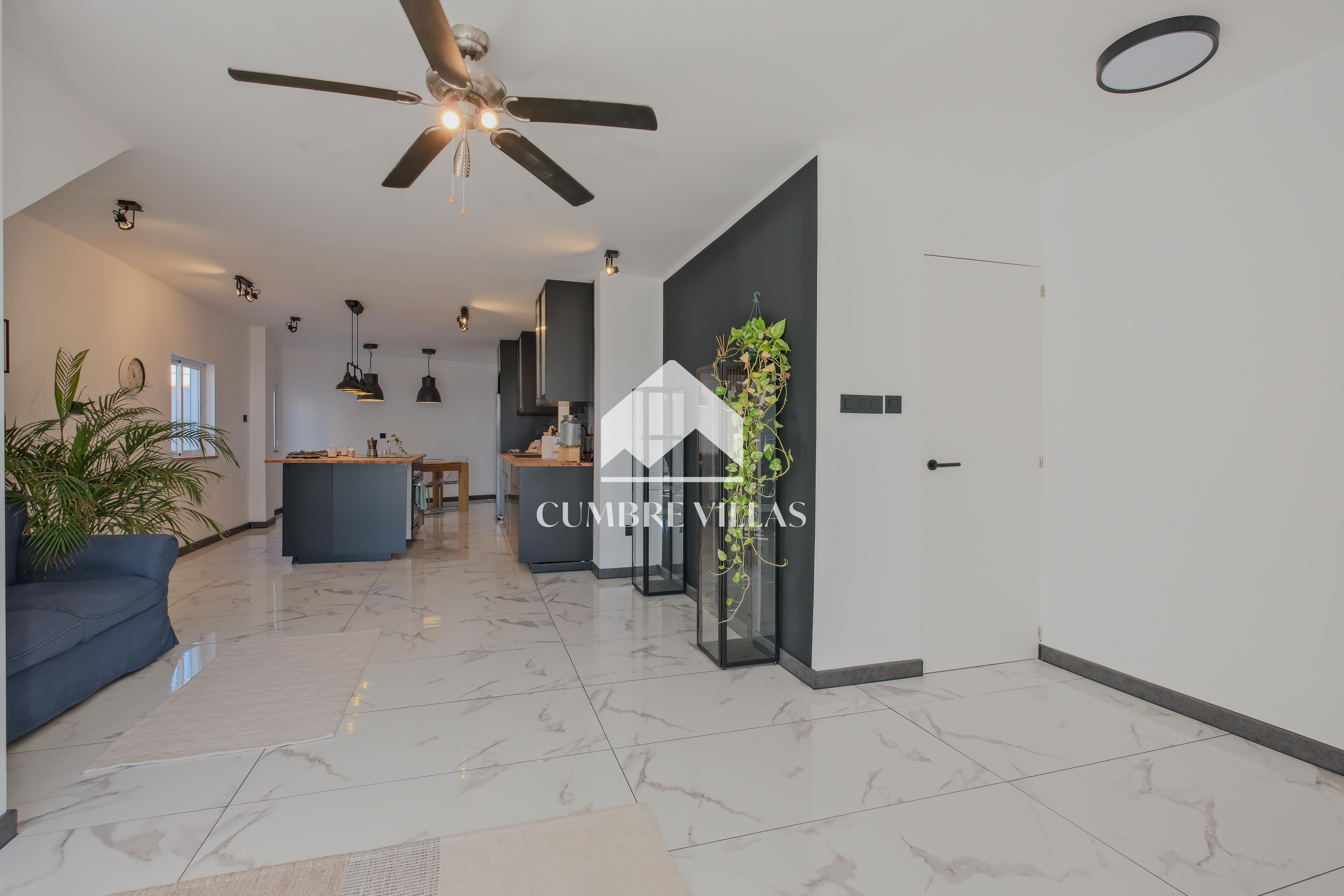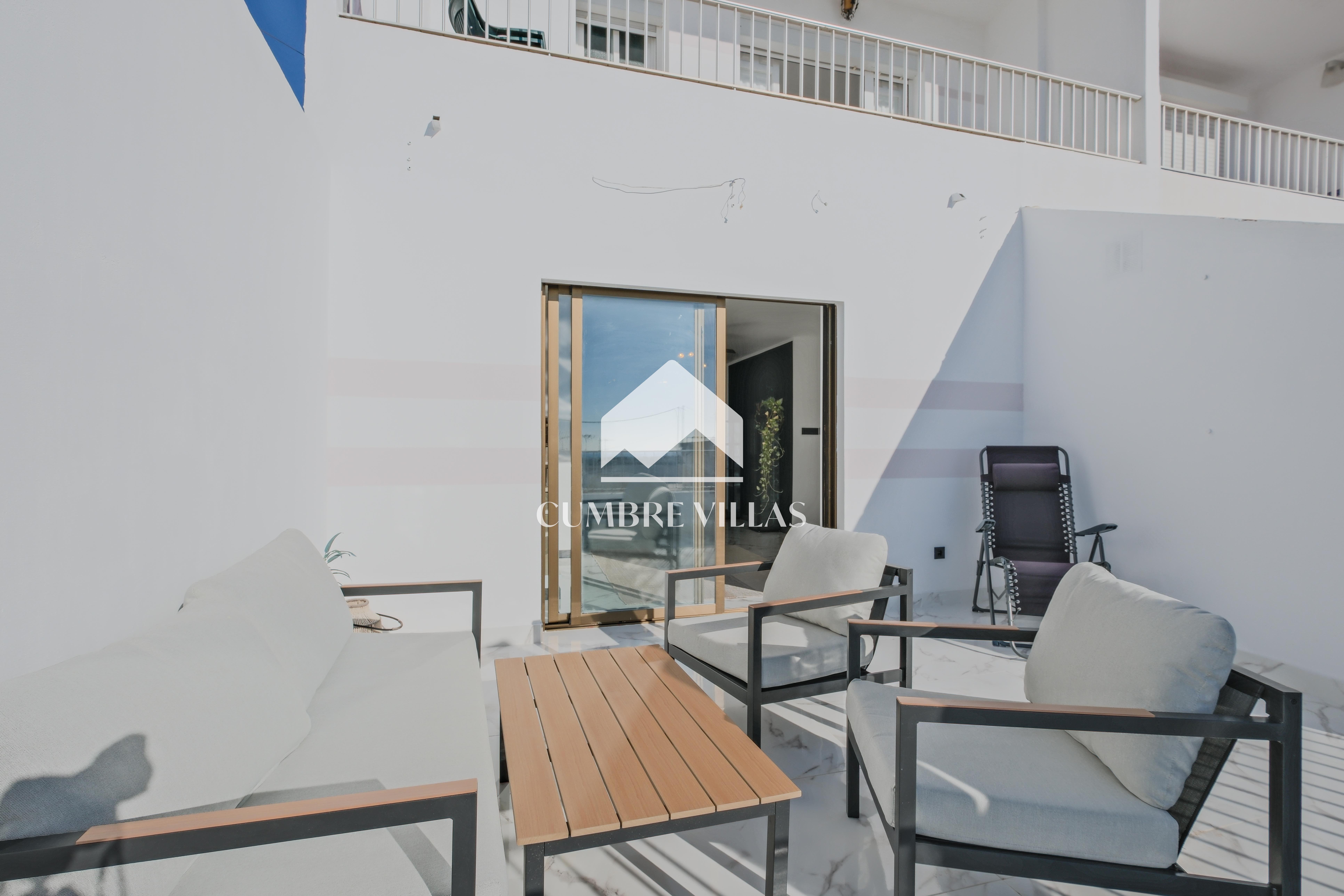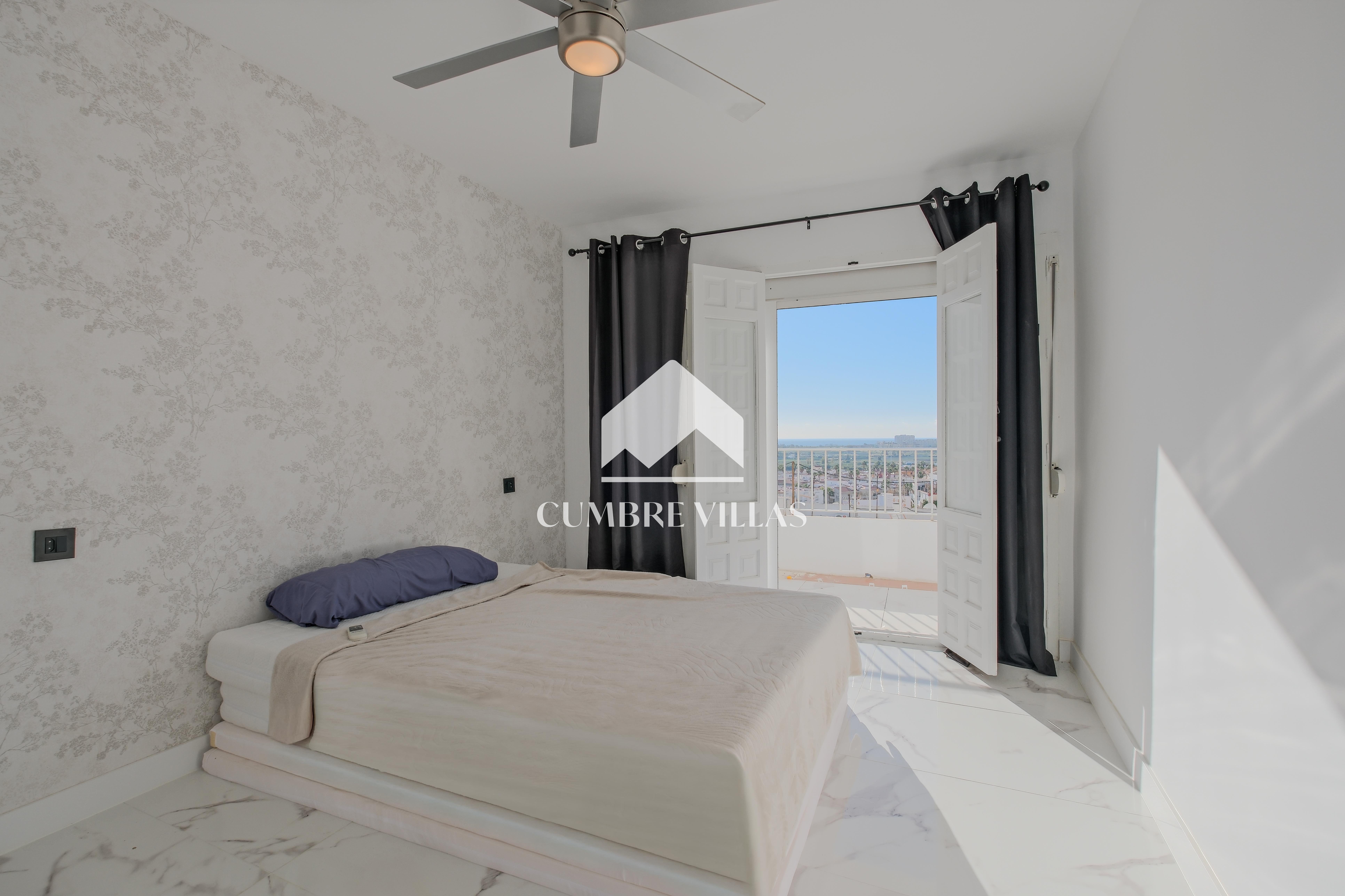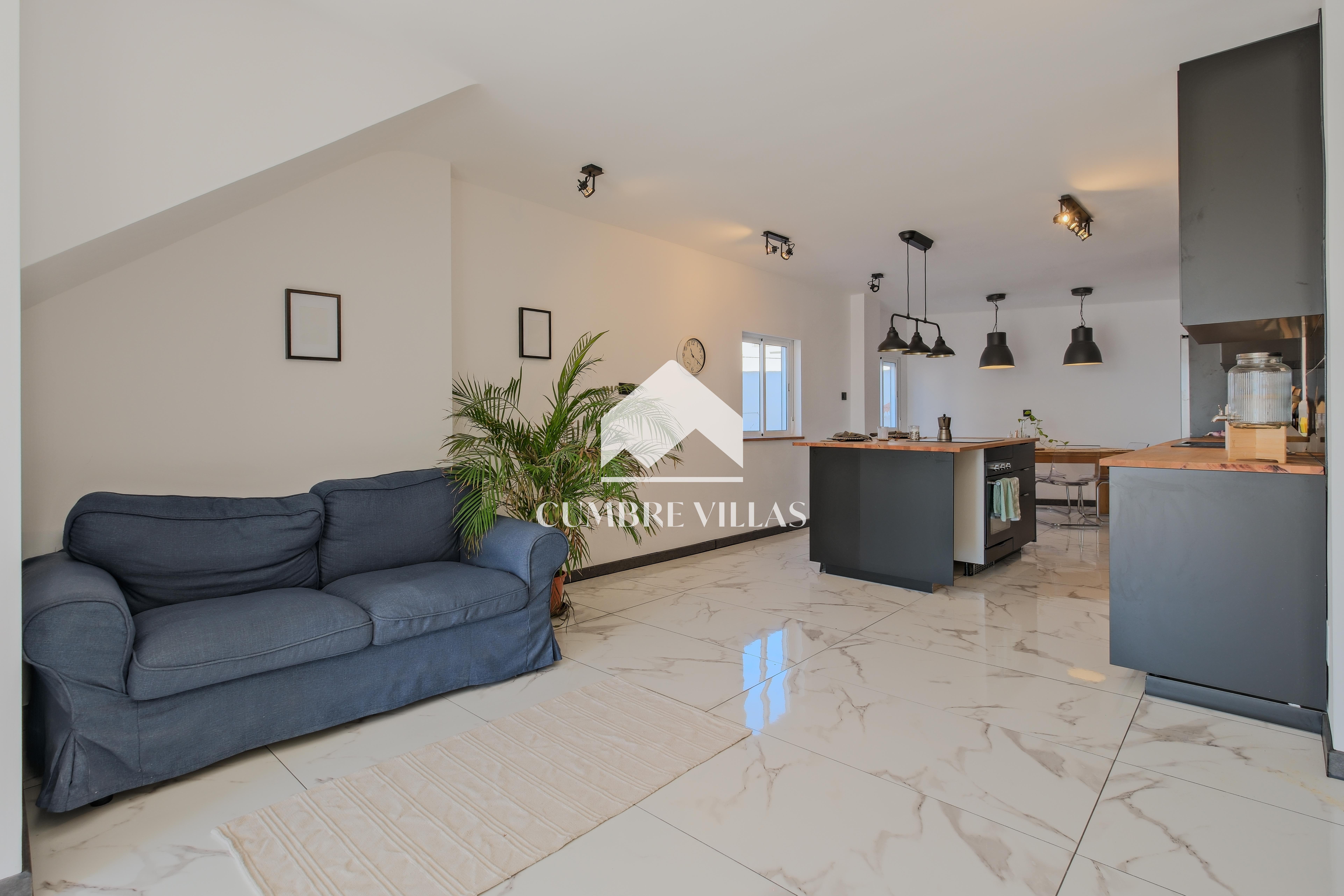 The apartment is distributed over two levels. Upon entering, you are welcomed into a spacious open-plan living area that combines a comfortable sitting area with a modern, fully fitted kitchen. The layout creates a bright and inviting living space, ideal for both everyday living and entertaining. From the living room, sliding doors open onto a generous private terrace, which forms one of the highlights of the property. This outdoor space offers panoramic views and plenty of room for a chill-out lounge and a dining area, making it perfect for enjoying the Mediterranean lifestyle throughout the year.