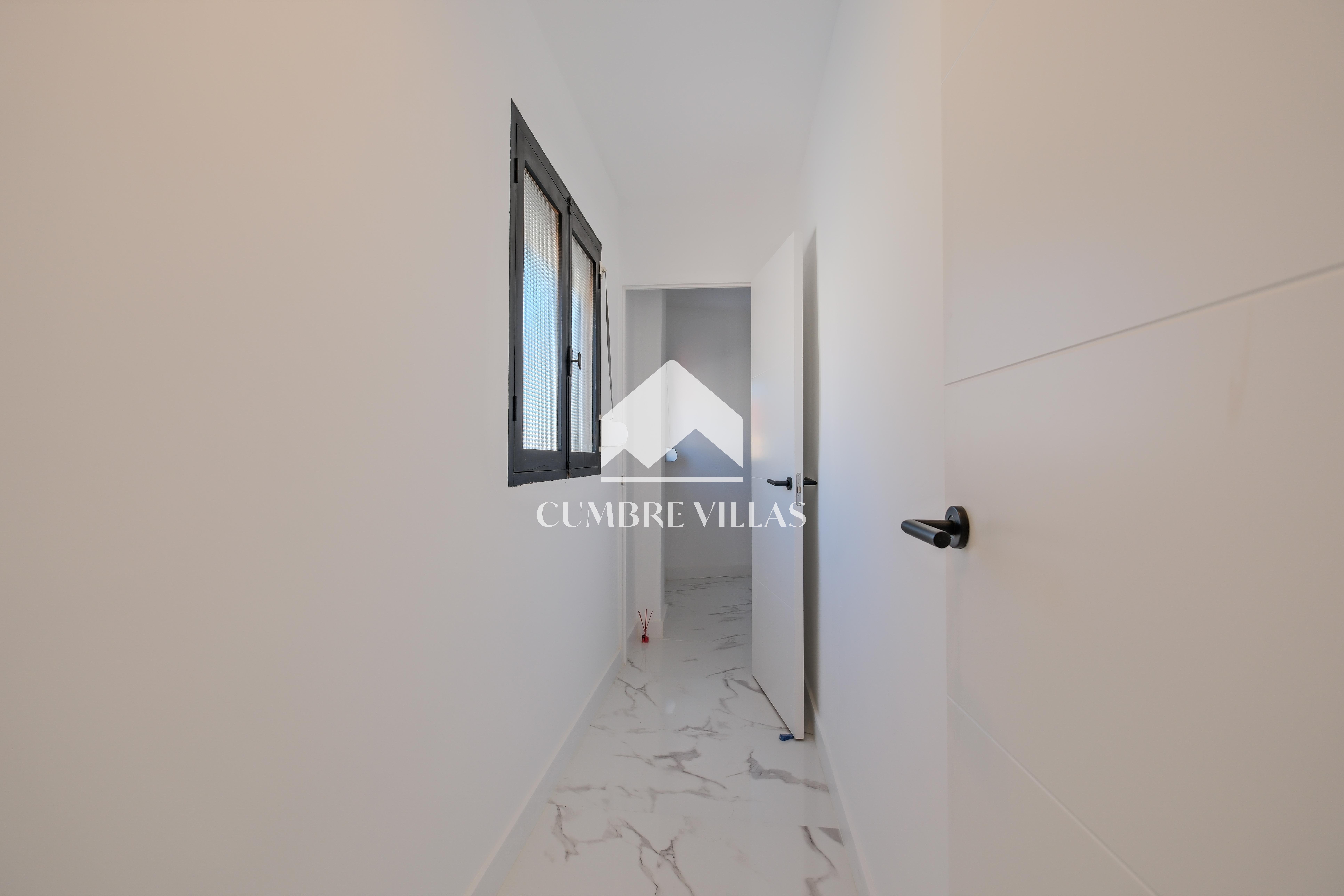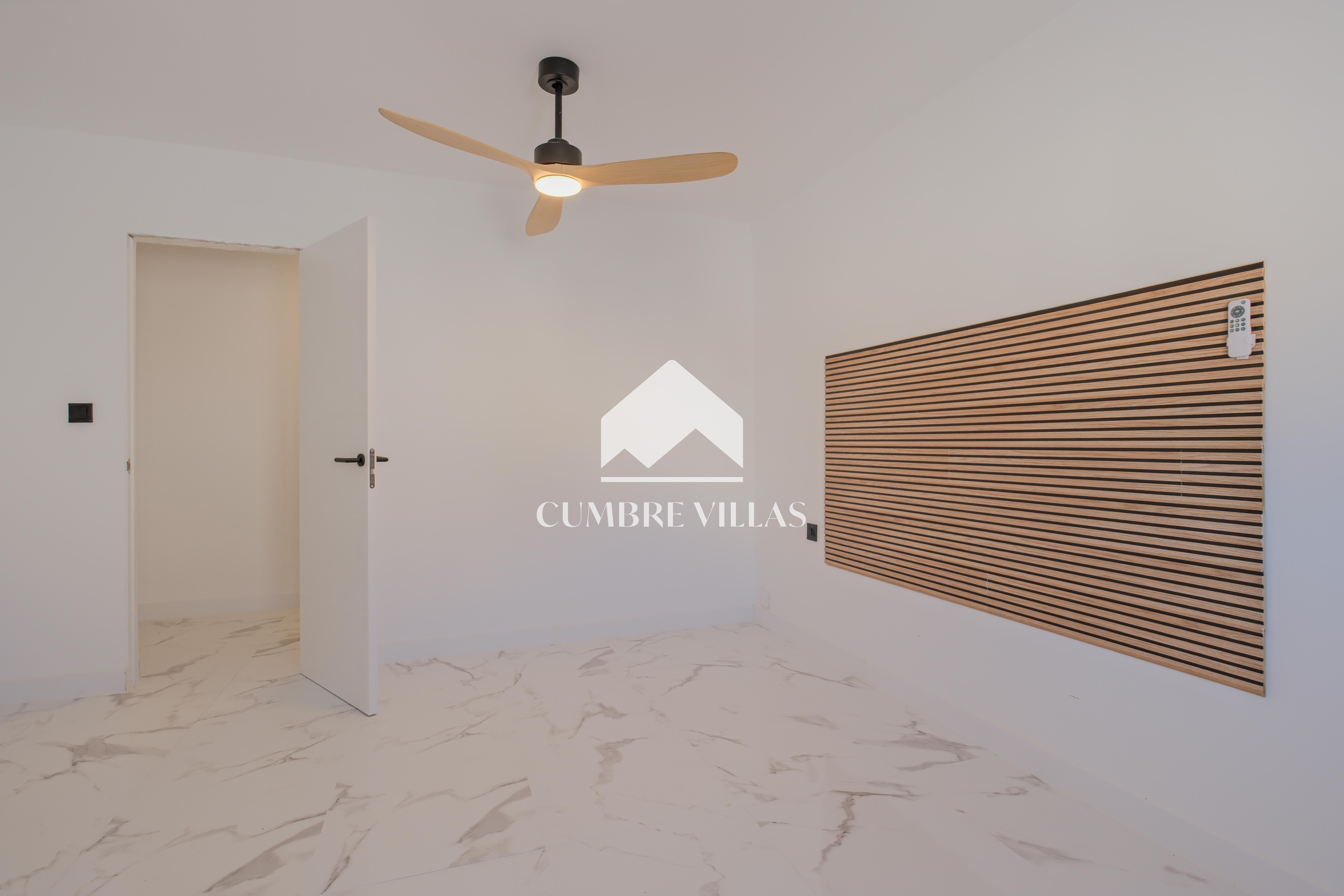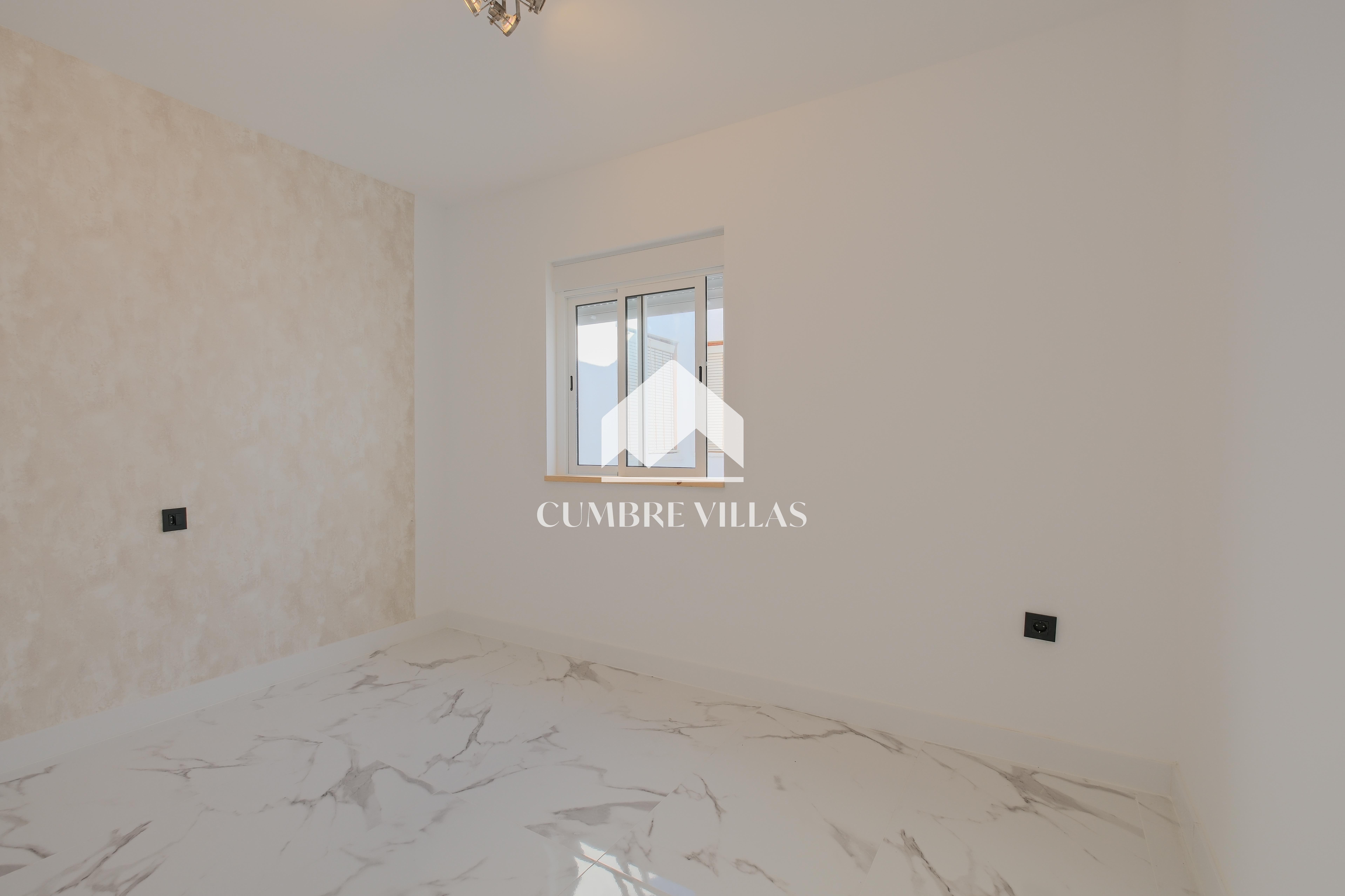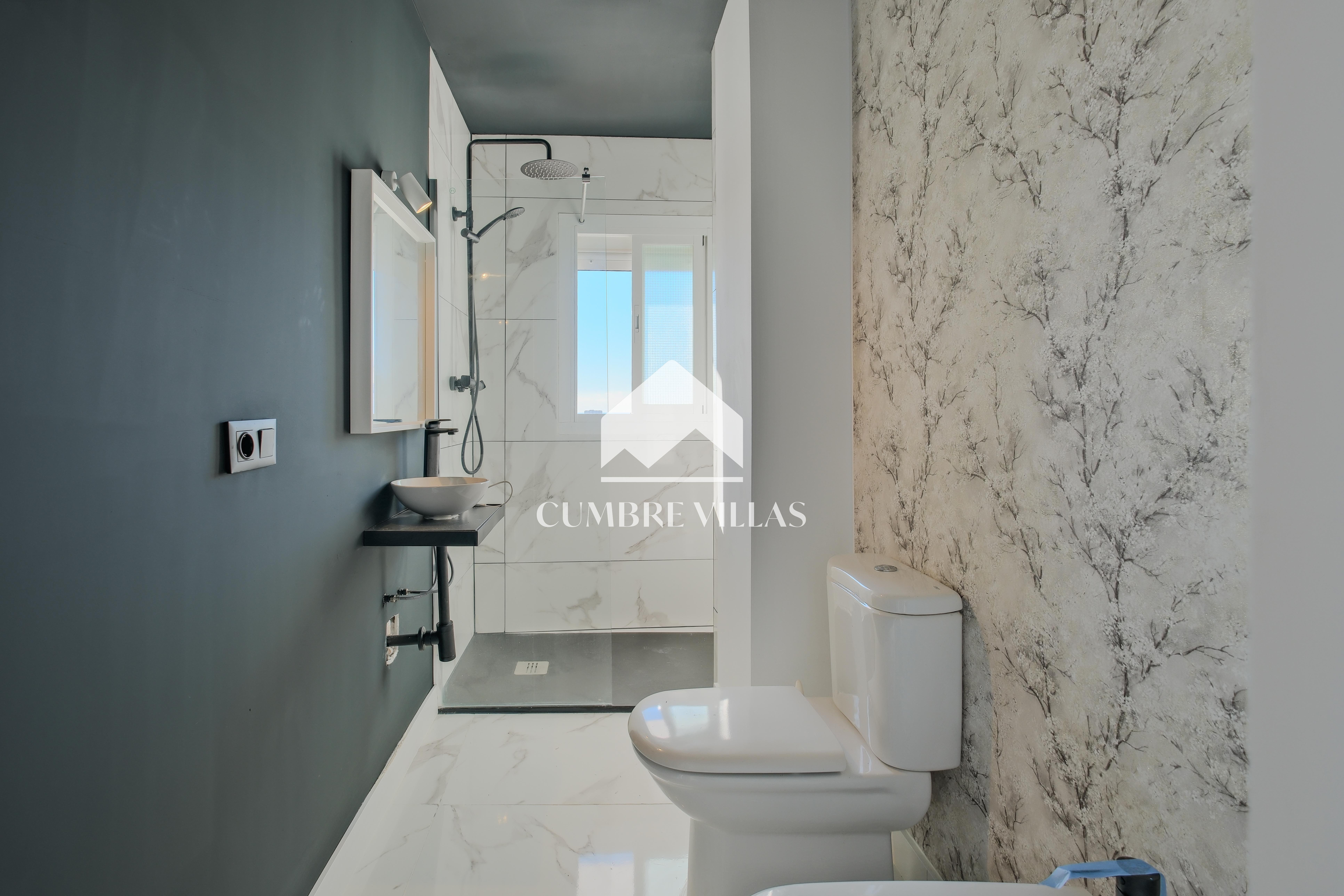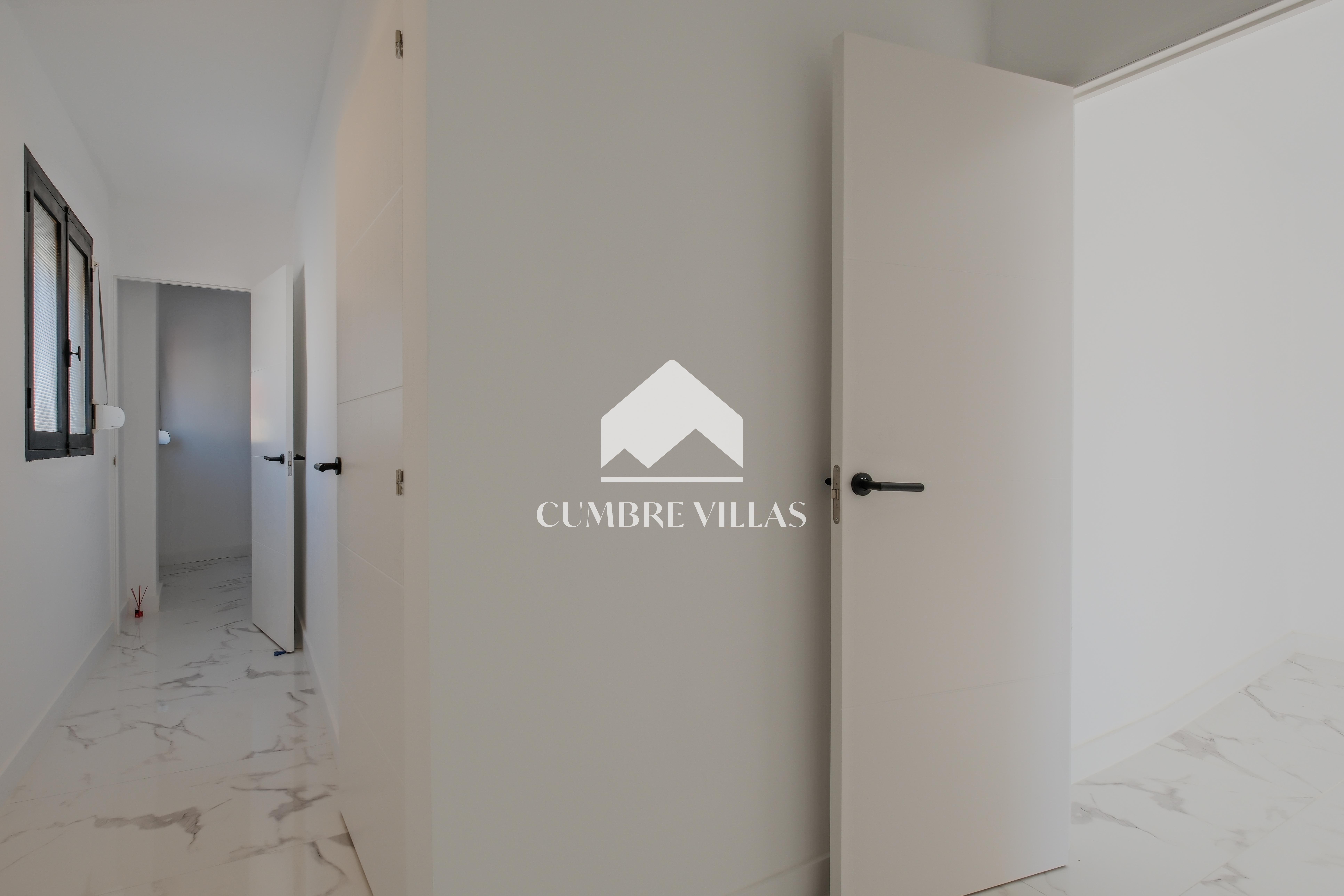 The apartment is distributed over two levels. Upon entering, you are welcomed into a spacious open-plan living area that combines a comfortable sitting area with a modern, fully fitted kitchen. The layout creates a bright and inviting living space, ideal for both everyday living and entertaining. From the living room, sliding doors open onto a generous private terrace, which forms one of the highlights of the property. This outdoor space offers panoramic views and plenty of room for a chill-out lounge and a dining area, making it perfect for enjoying the Mediterranean lifestyle throughout the year.