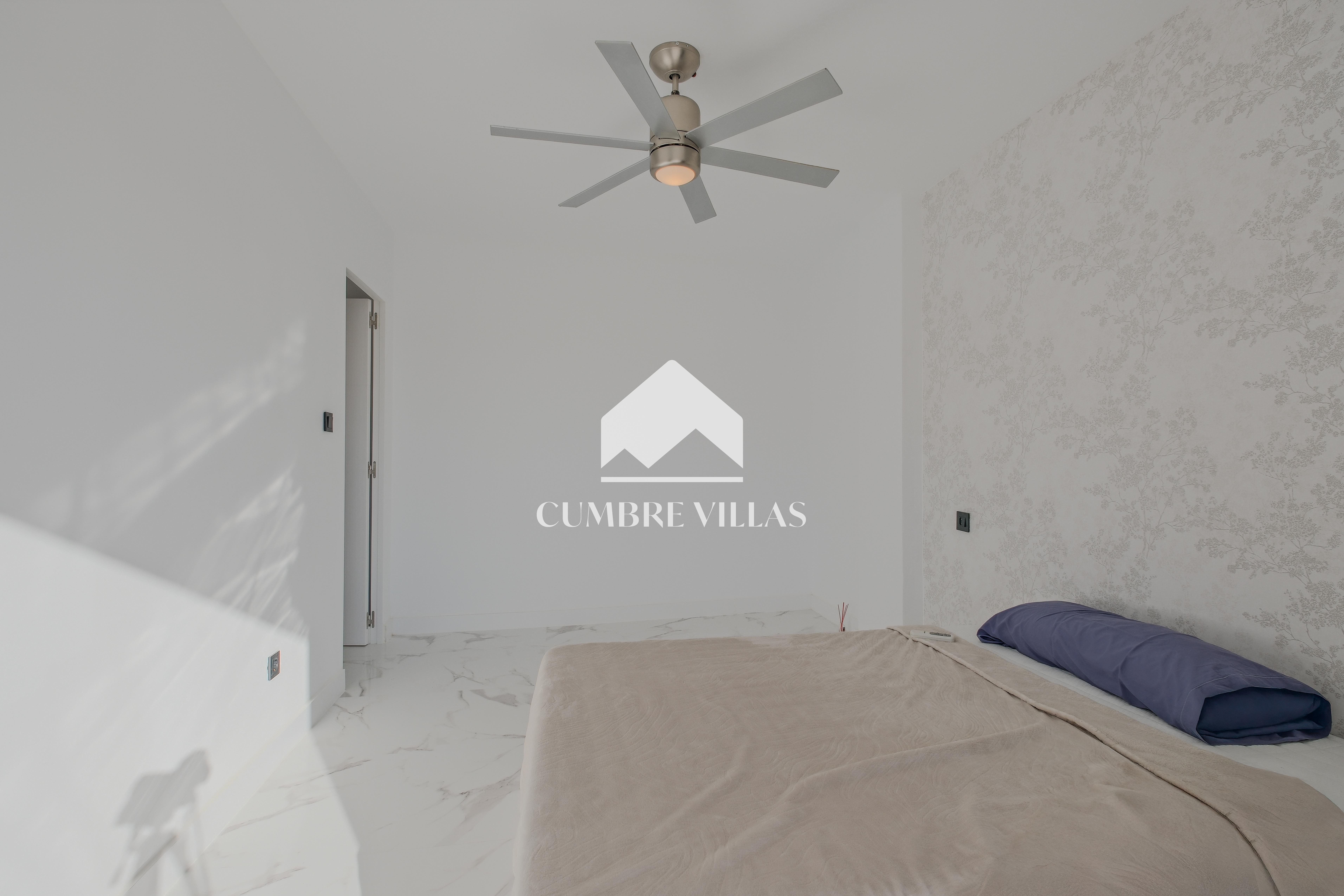 The upper floor is dedicated to the sleeping accommodation and comprises three spacious bedrooms and a family bathroom. The main bedroom features its own en-suite bathroom, while another bedroom enjoys French doors opening onto a private balcony with lovely, open views over Salobreña, the sea and the mountainous landscape in the background. All bathrooms are fitted with walk-in showers, and the living room and two bedrooms feature ceiling fans.