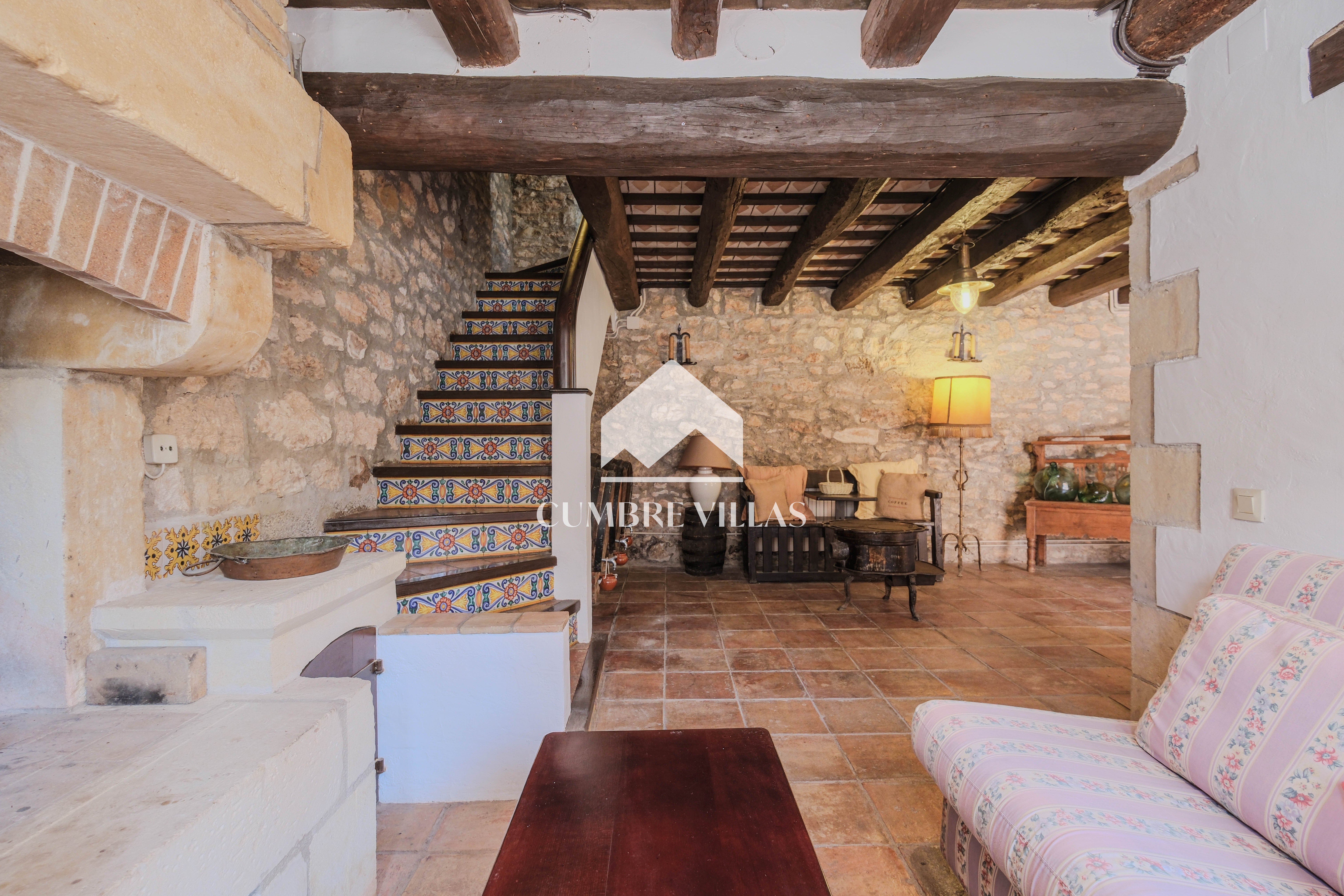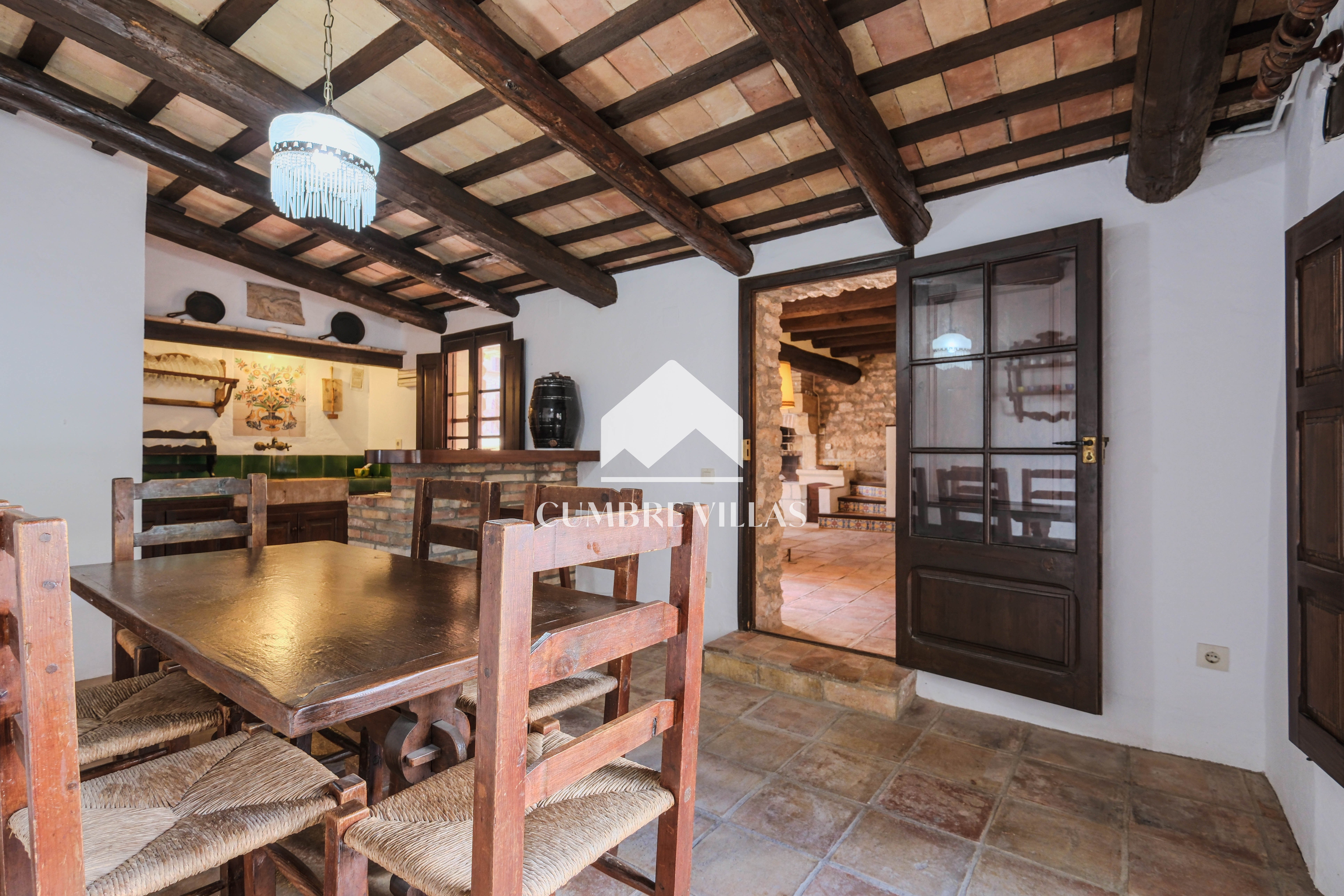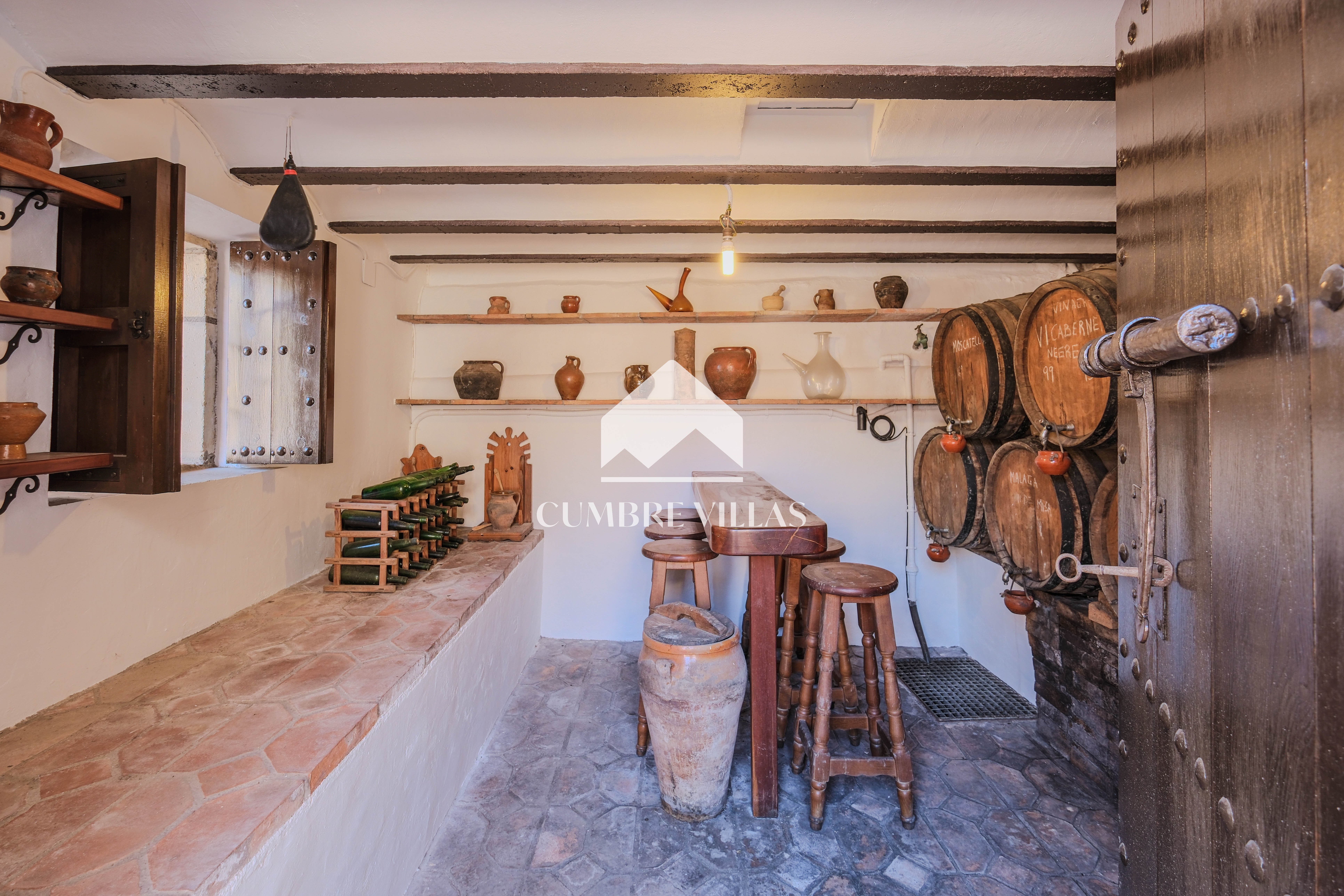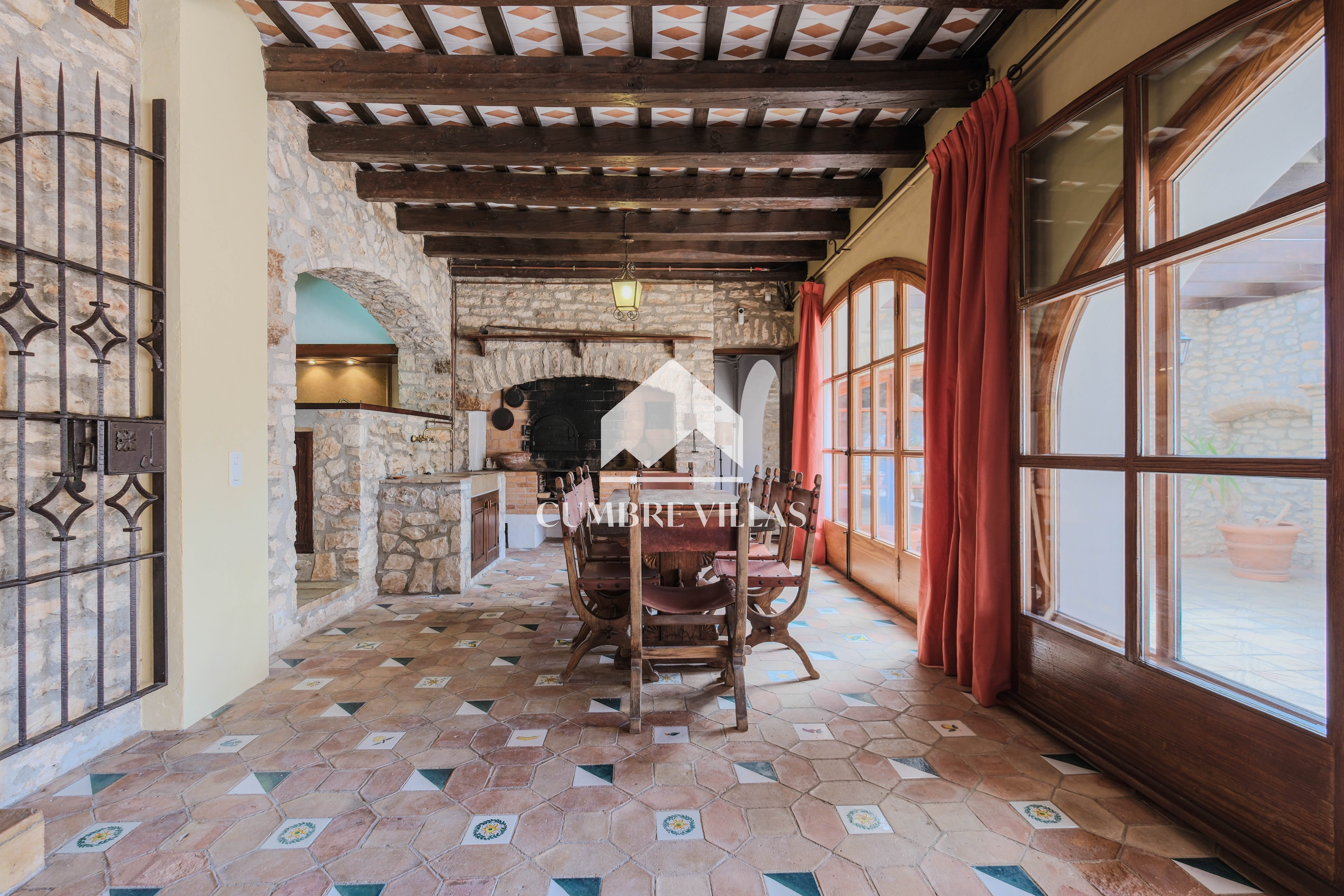The kitchen, reception room and cinema all connect to the dining room, where a wood-burning oven is set to the left and a decorative water well to the right (no longer in use). From the dining room, three double archways open onto the covered outdoor area with a dining space on the left, lounge corner in the middle, and stone BBQ and cosy summer room on the right. A short flight of steps leads down to the main terrace and pool.