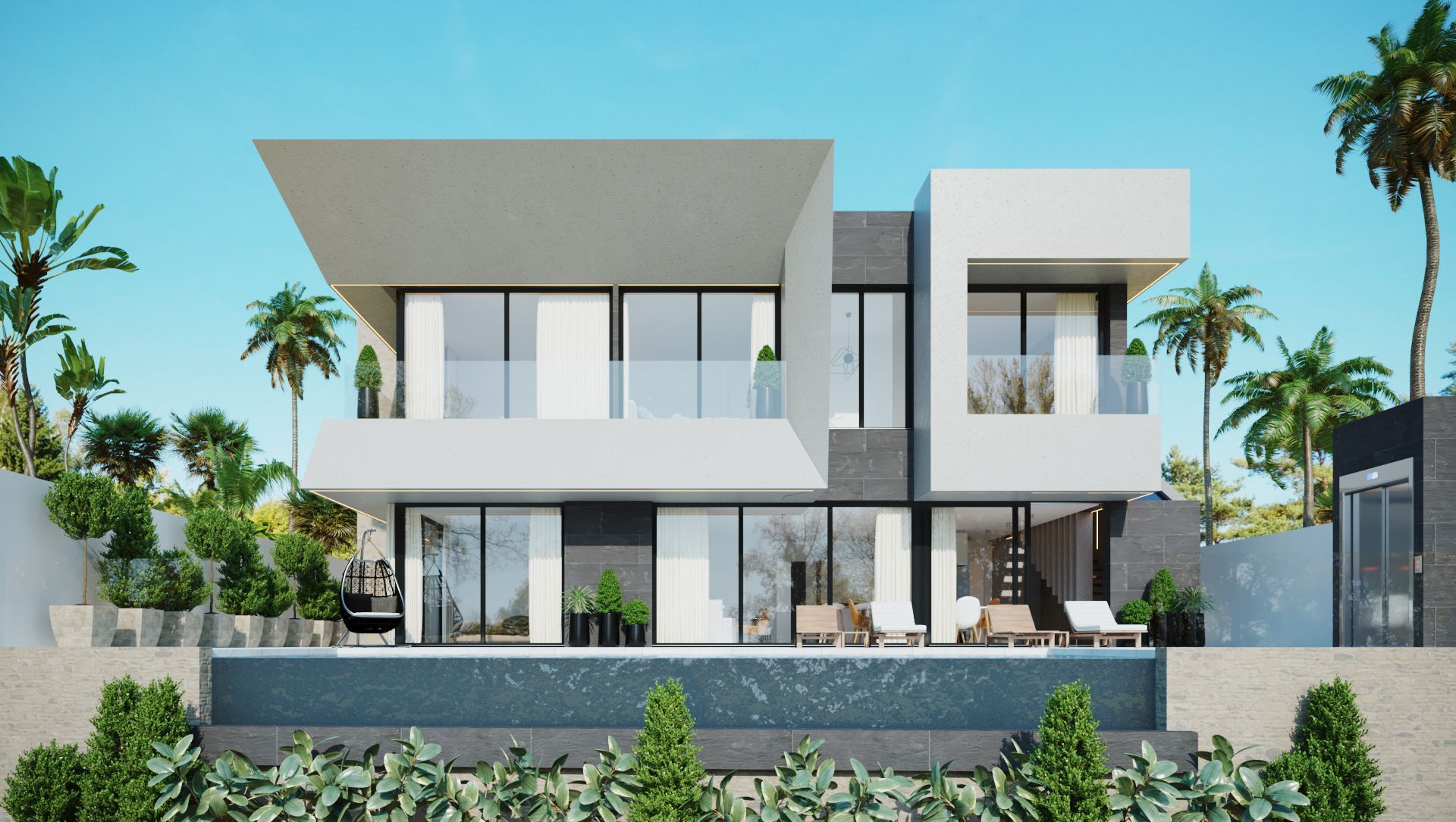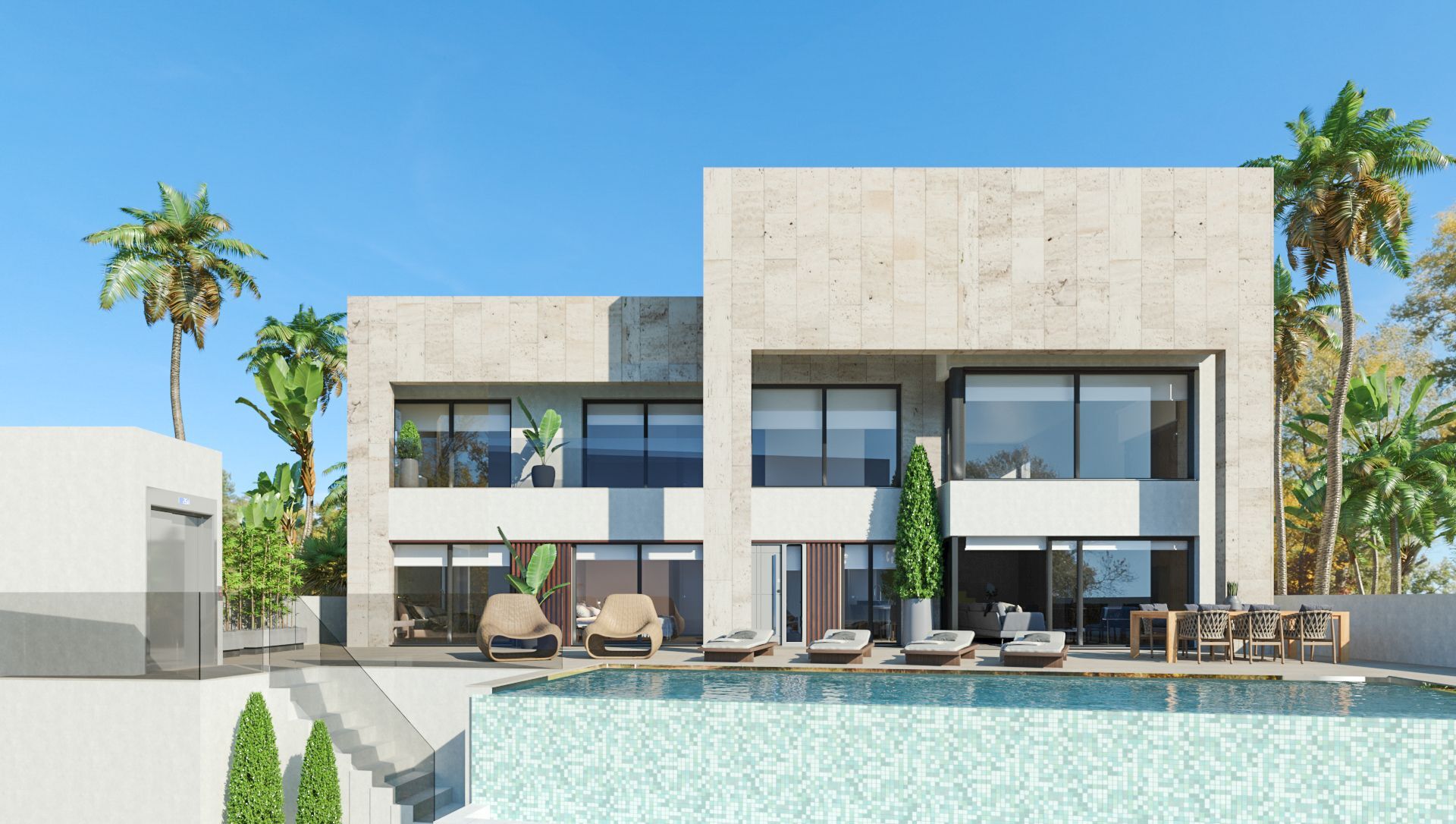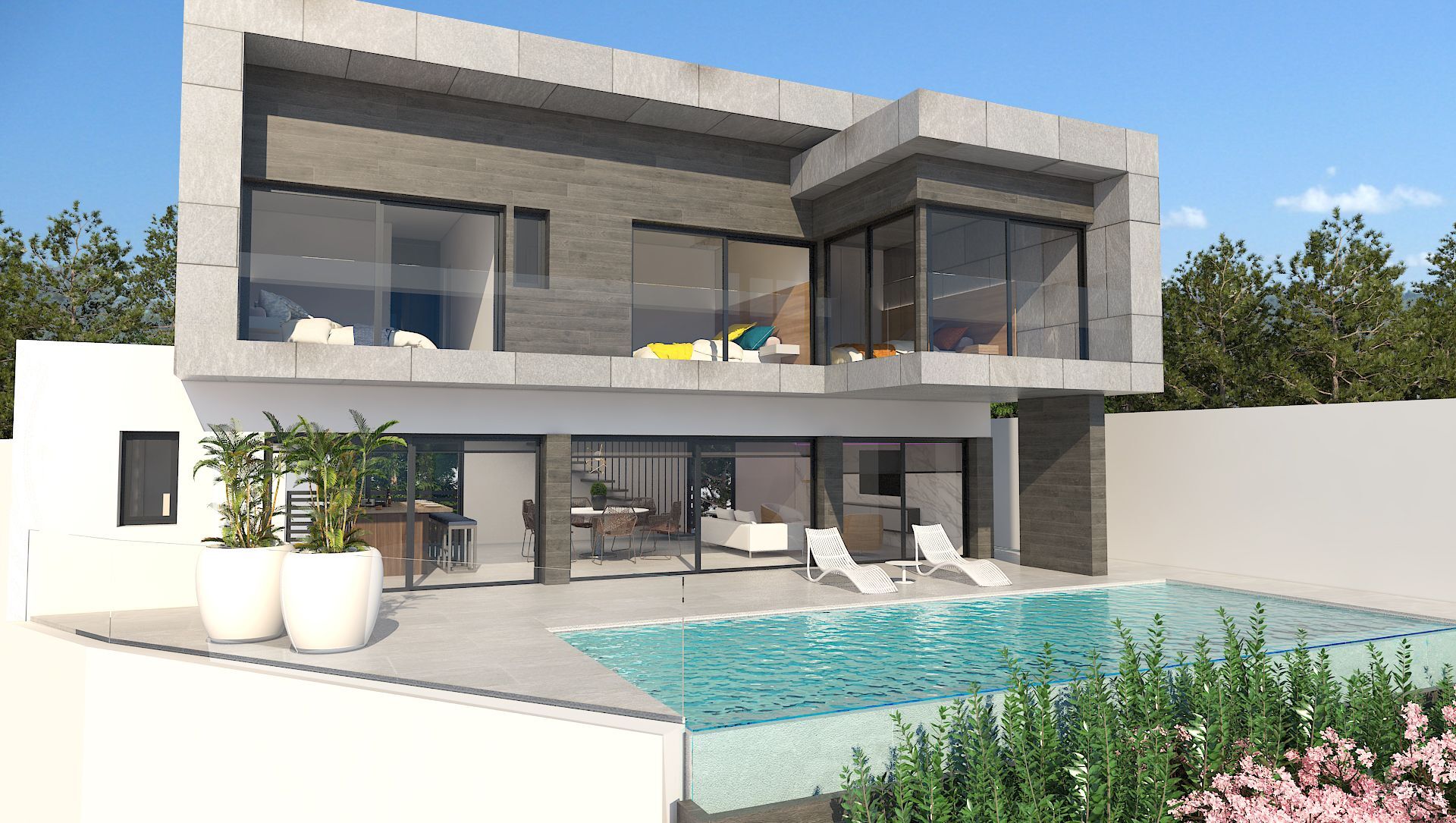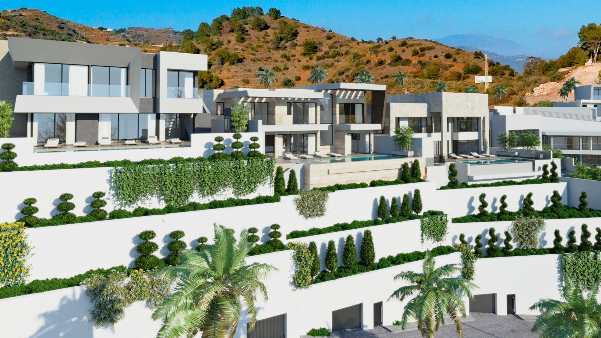 In addition to high-quality windows, doors and finishes, the following is included in this turnkey project: an infinity pool, a fully-fitted Italian kitchen with premium appliances, luxurious fitted bathrooms with glass shower enclosures, fitted wardrobes, central air conditioning, solar panels (phase 1 and 2 only), an aerothermal system for domestic hot water, a lift (only in some villas), spectacular exterior LED-illumination, and an automatic garage door and/or access gate.