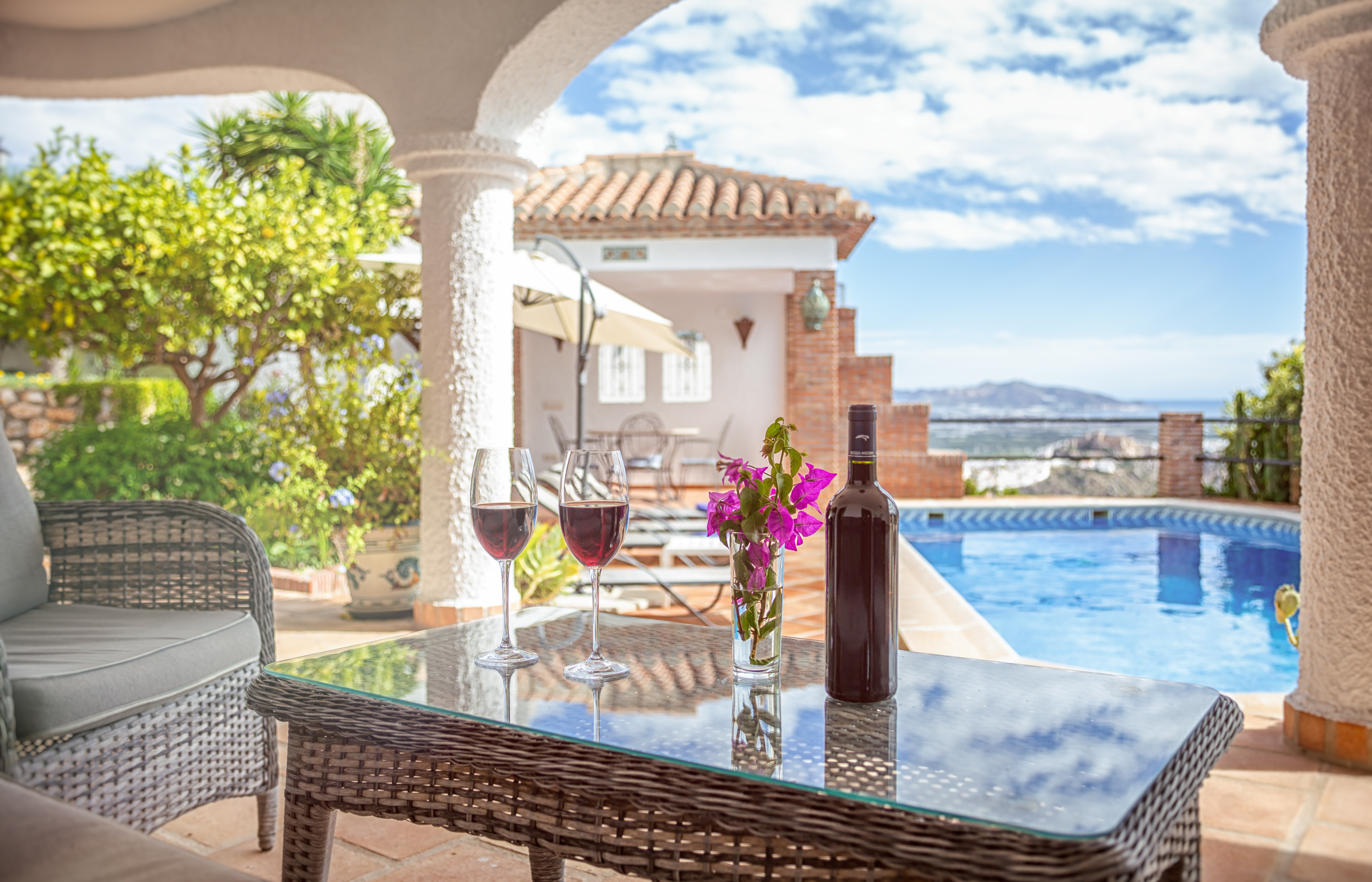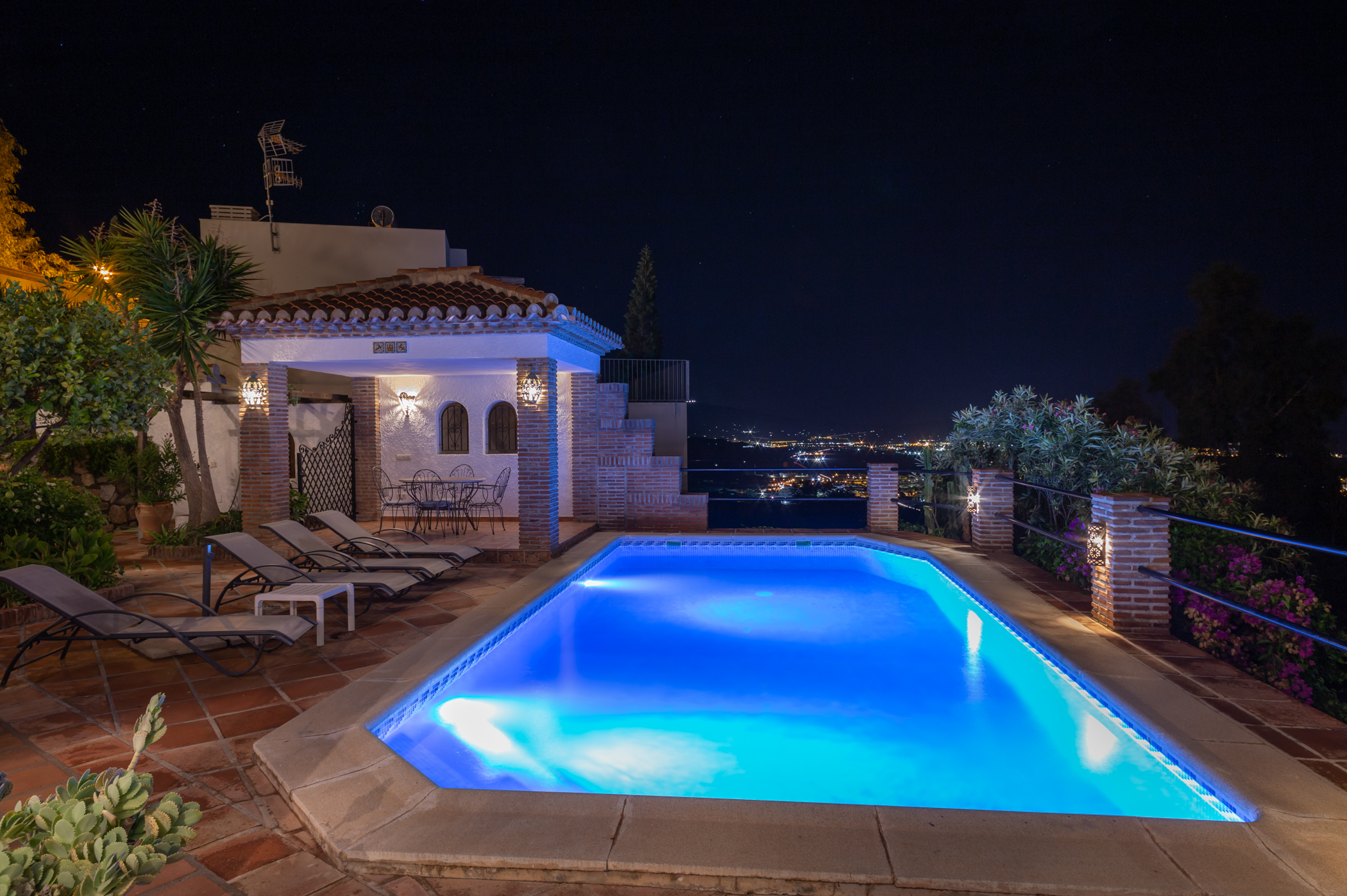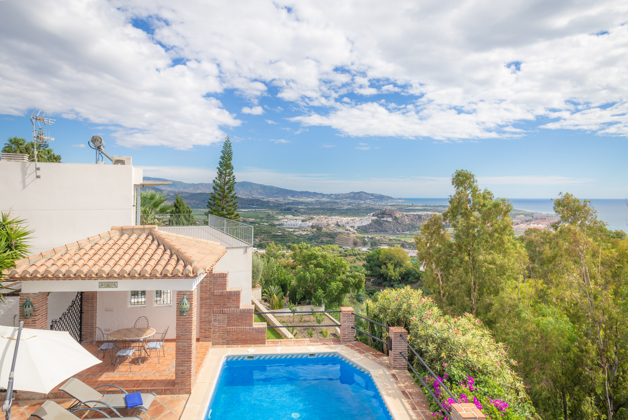This unique, south facing villa with lovely design has been recently refurnished. It combines a contemporary and modern design with wood and stone elements. It offers fantastic sea views through its big windows to create a wonderful light and open atmosphere. From the moment you enter the villa, you will be awestruck by the stunning sea views that you can enjoy from inside and from the terrace. This villa invites you to unwind and have a relaxing holiday! This luxurious and spacious 4 bedroom villa blends in perfectly with its surroundings on the hillside community in which it is set. The villa overlooks the Mediterranean sea and the romantic landscape of the Costa Tropical. It is located on a quiet part of Monte Los Almendros. You also can enjoy these incredible views to the sea and the hillside from the pool. No doubt you will be enticed to spend hours relaxing in it! This house was originally designed to be a family home, so there are many extras. If you want luxurious and comfortable self catering accommodation, then Villa Cañada is for you. Tennis, beach & golf are located nearby. Furthermore you have easy access to Granada, Malaga & Almeria airport. Free access to the recreational area of the Monte de los Almendros (pools, lawn, tennis, football, tapas bar, small library and more)