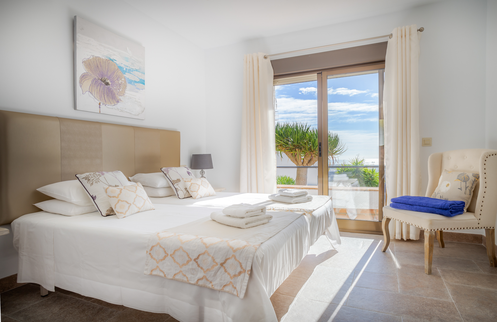 Bedroom 1: Two united single beds (can be separated), Air conditioning, Curtains &Shutters, Ensuite bathroom with bath tub &shower, Sea view, Access to terrace