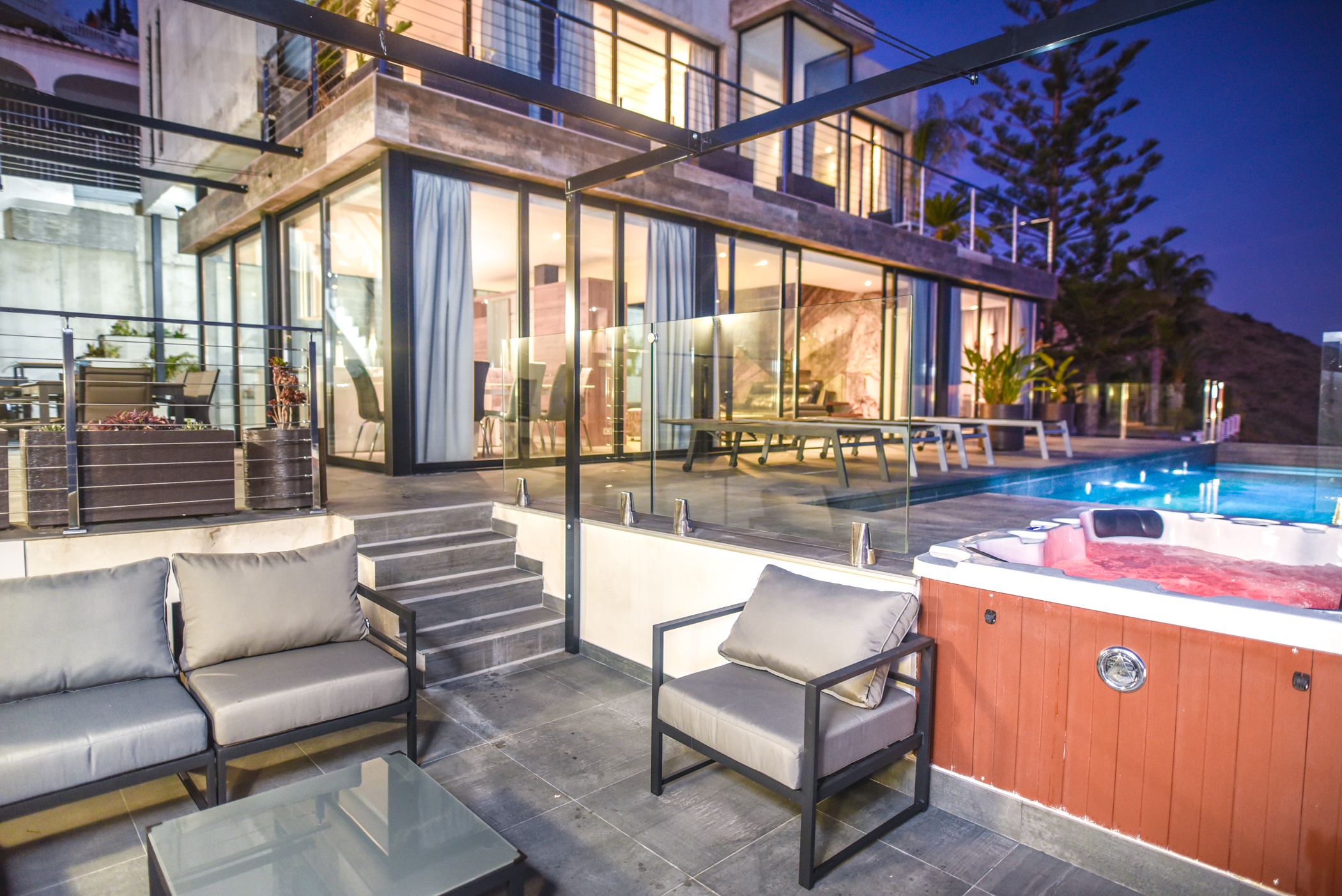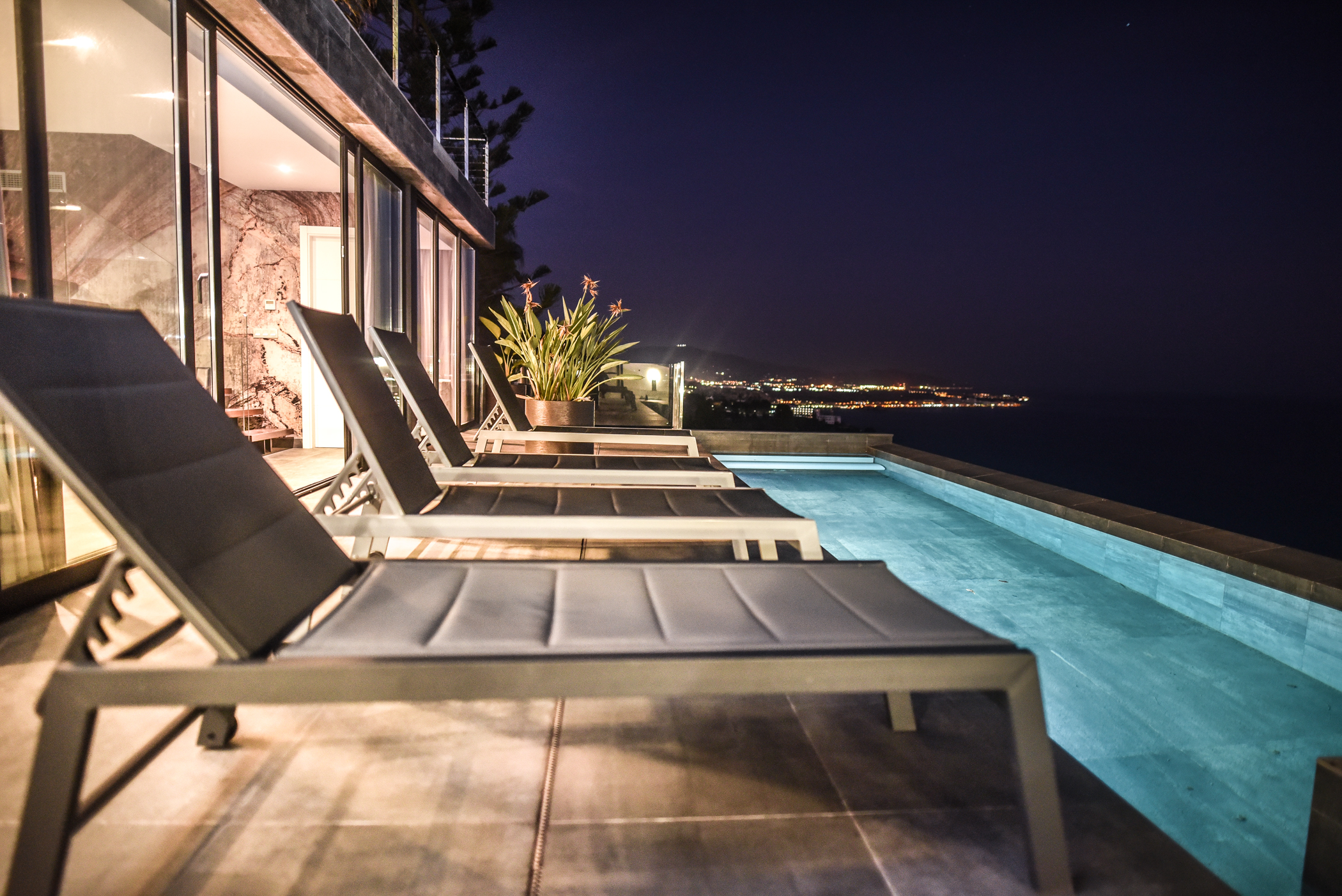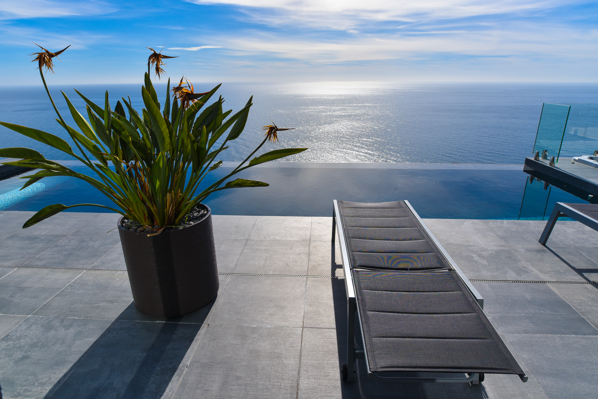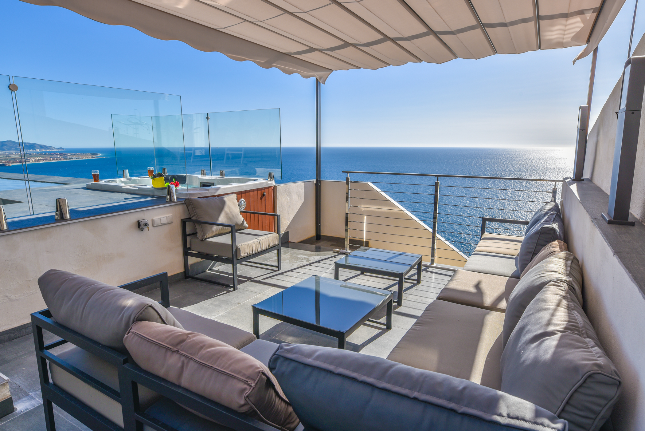 The middle level is composed of a large avant-garde style living room, a kitchen and an ensuite room, all with direct access to the pool and jacuzzi. The infinity pool and jacuzzi have stunning views towards the sea. You can have a refreshing drink in the pool or jacuzzi while having extraordinary views of the sea. This level also has a wonderful fountain, also including a barbecue.