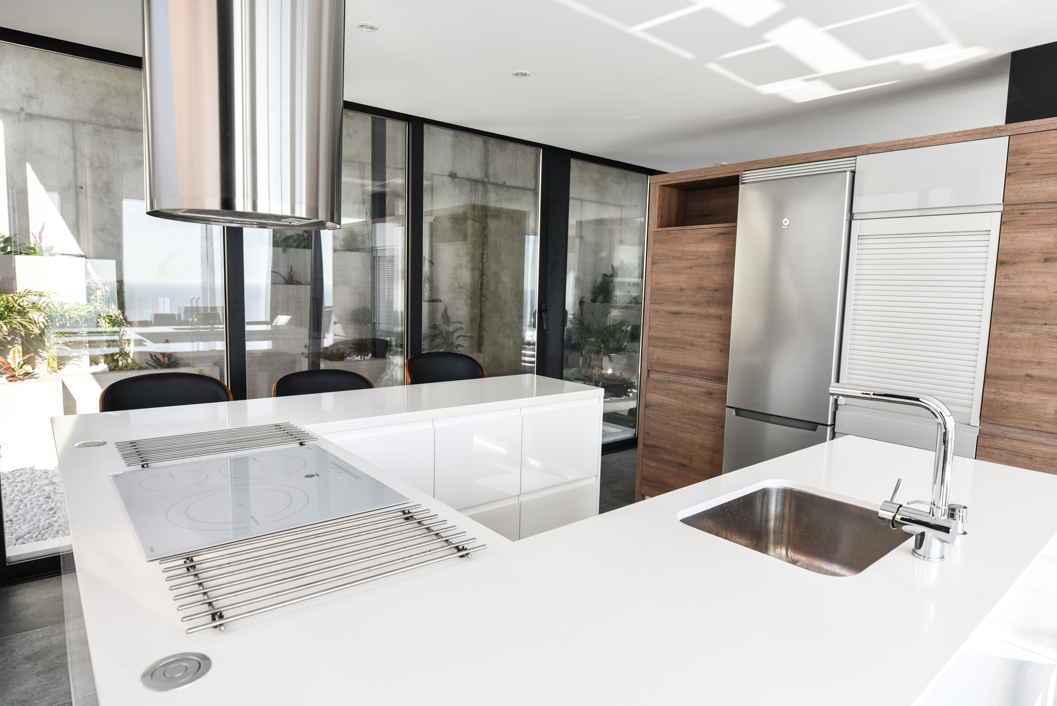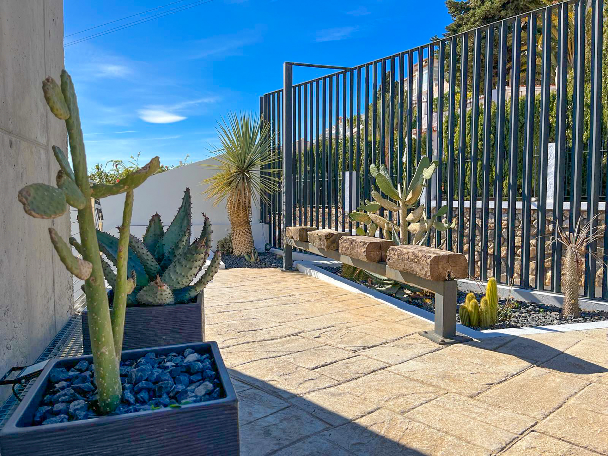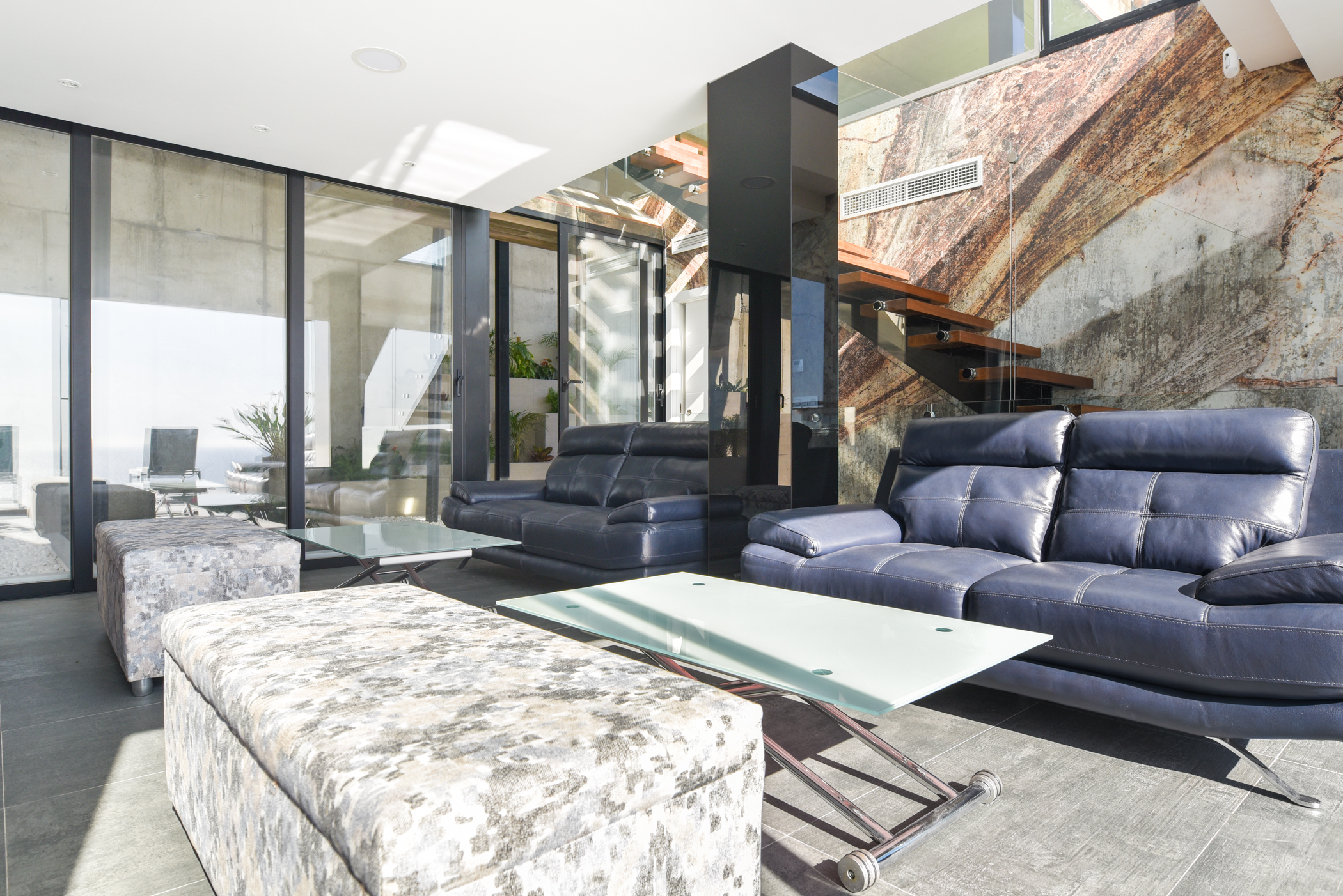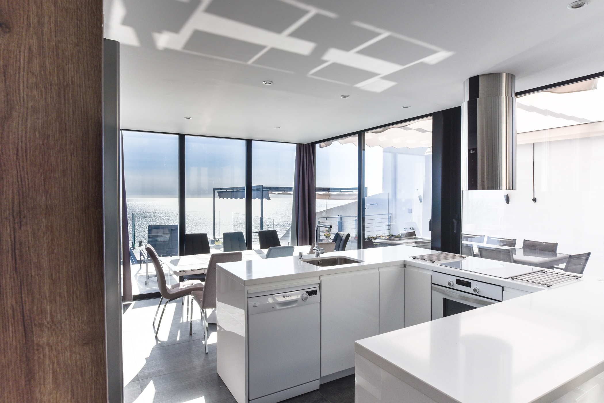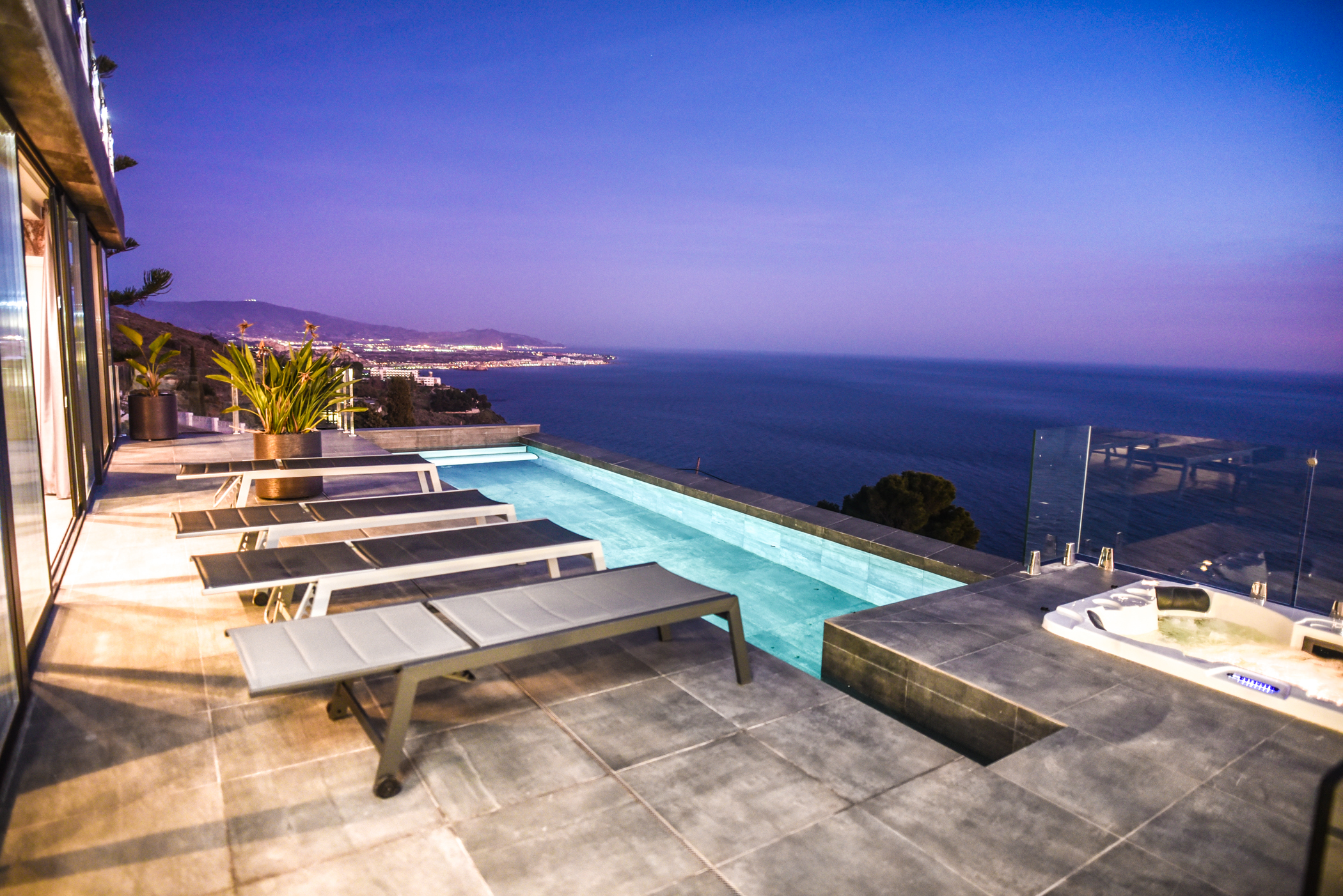 The middle level is composed of a large avant-garde style living room, a kitchen and an ensuite room, all with direct access to the pool and jacuzzi. The infinity pool and jacuzzi have stunning views towards the sea. You can have a refreshing drink in the pool or jacuzzi while having extraordinary views of the sea. This level also has a wonderful fountain, also including a barbecue.