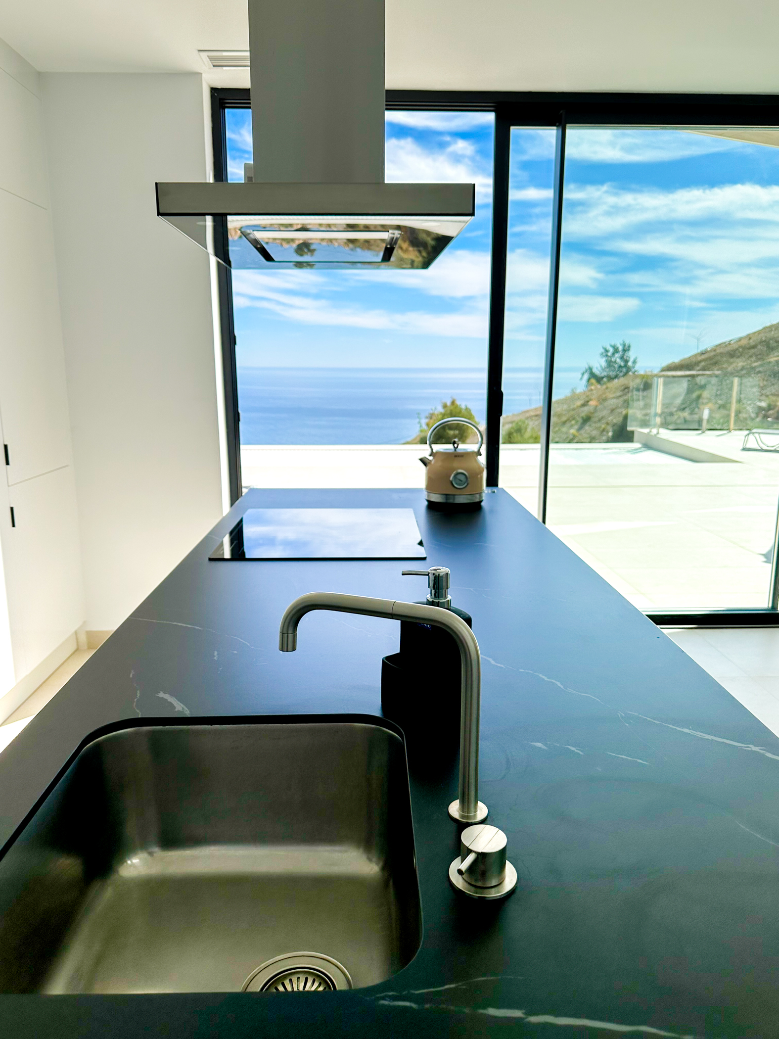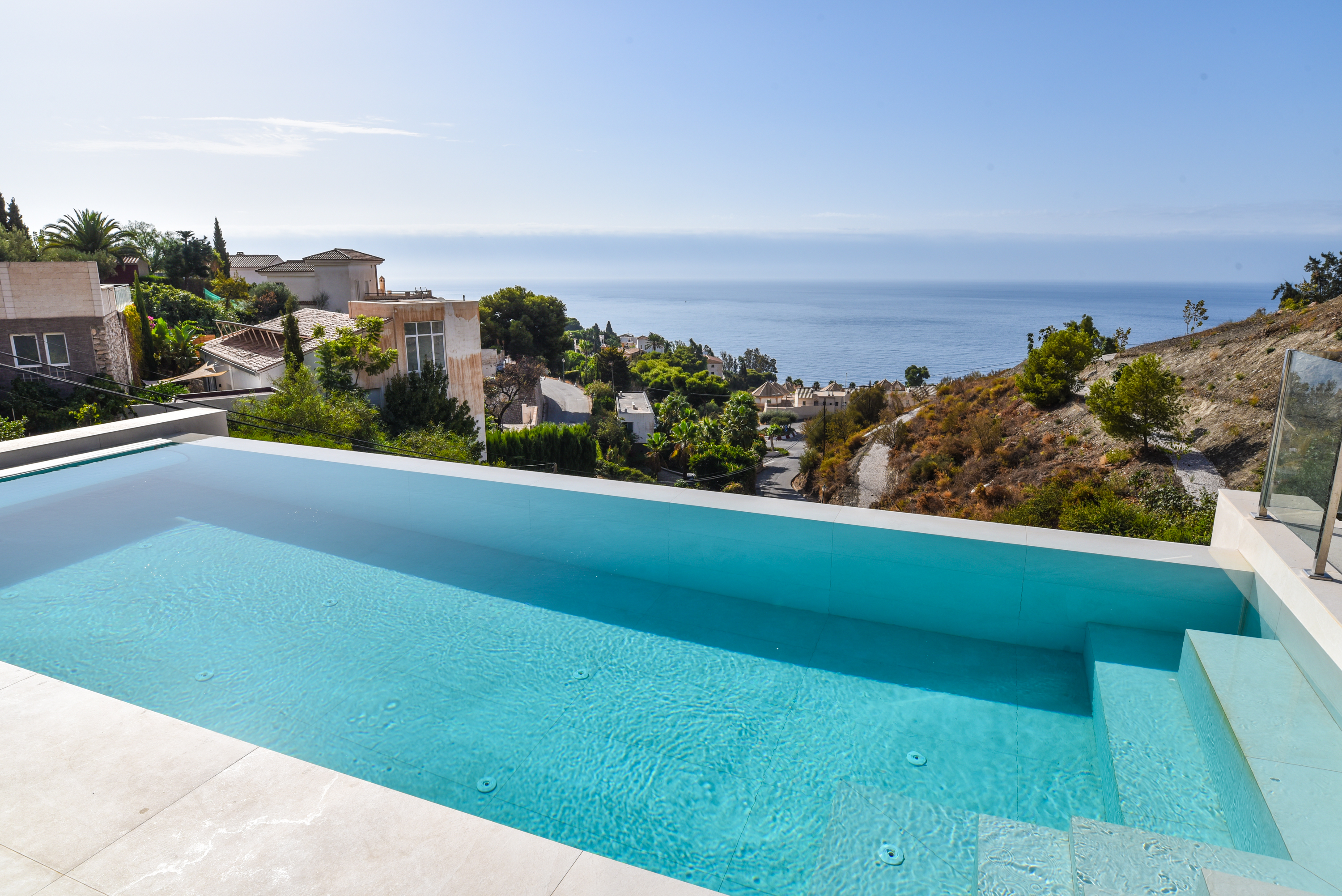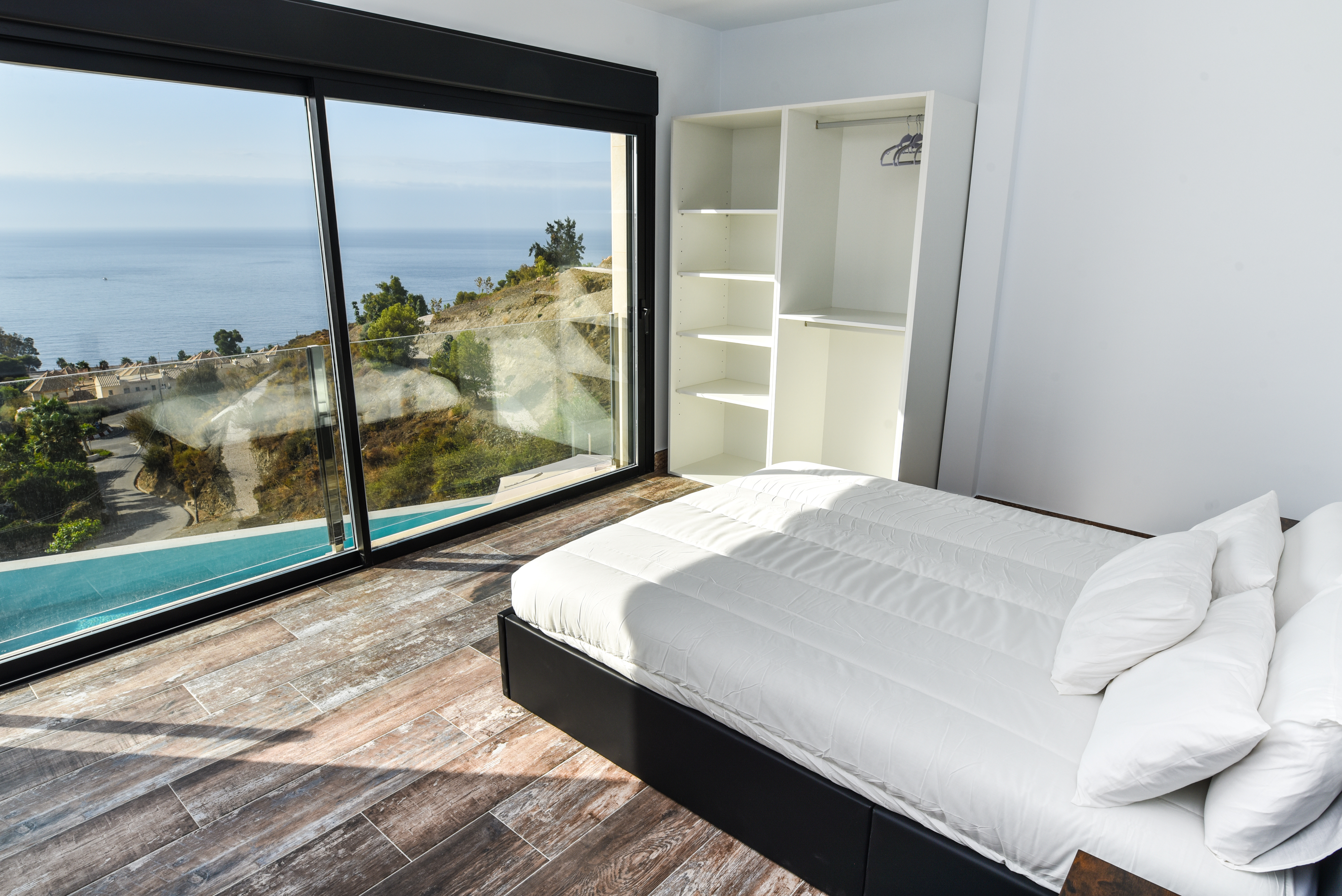 Both the living area and the modern kitchen have large sliding glass doors that penetrate the wall and disappear when opened. Thus, you can move unhindered from inside to outside to encounter the wonderful climate that the Costa Tropical of Granada offers all year round. There are sliding glass doors in the bedrooms as well, with automatic blinds so you can decide whether to let the sun shine in or make the room as dark as you wish.