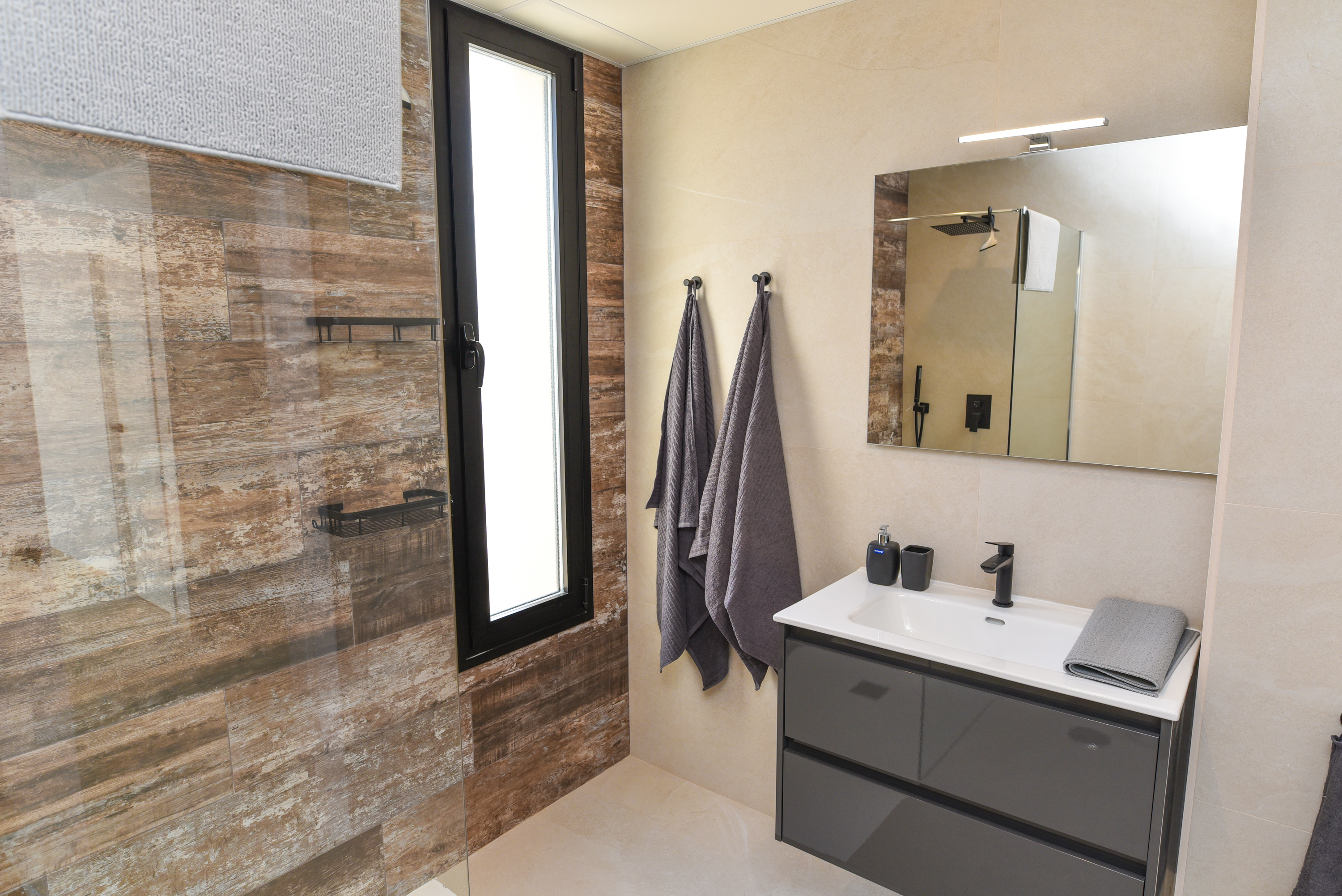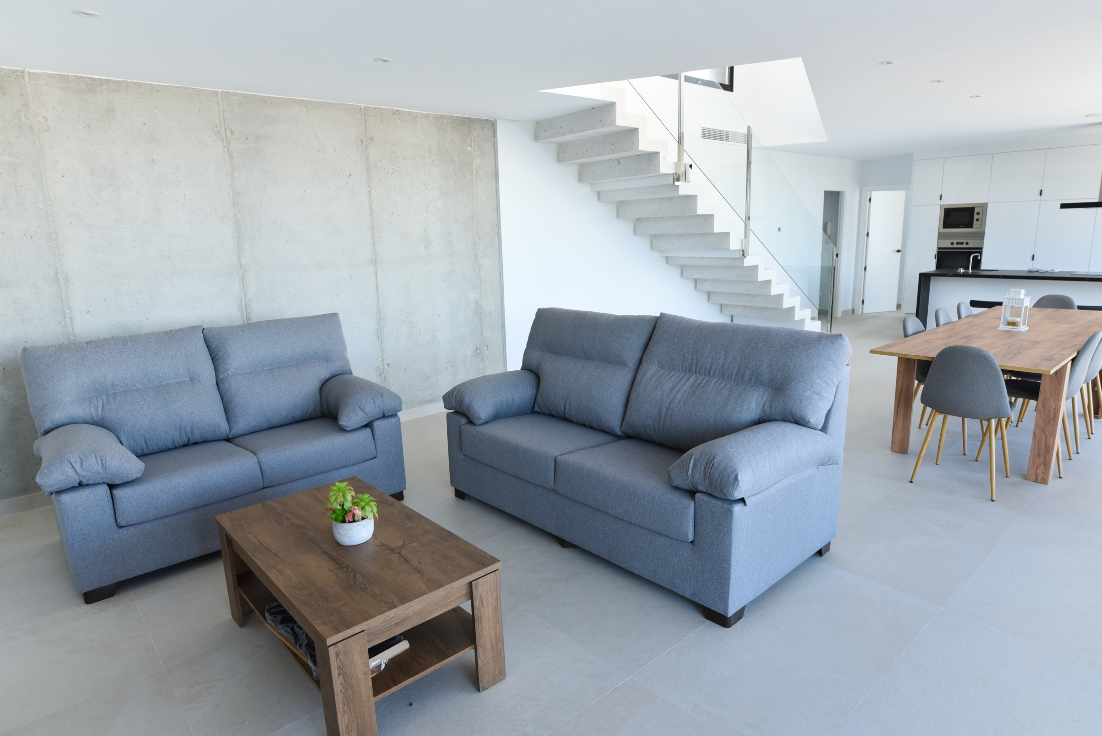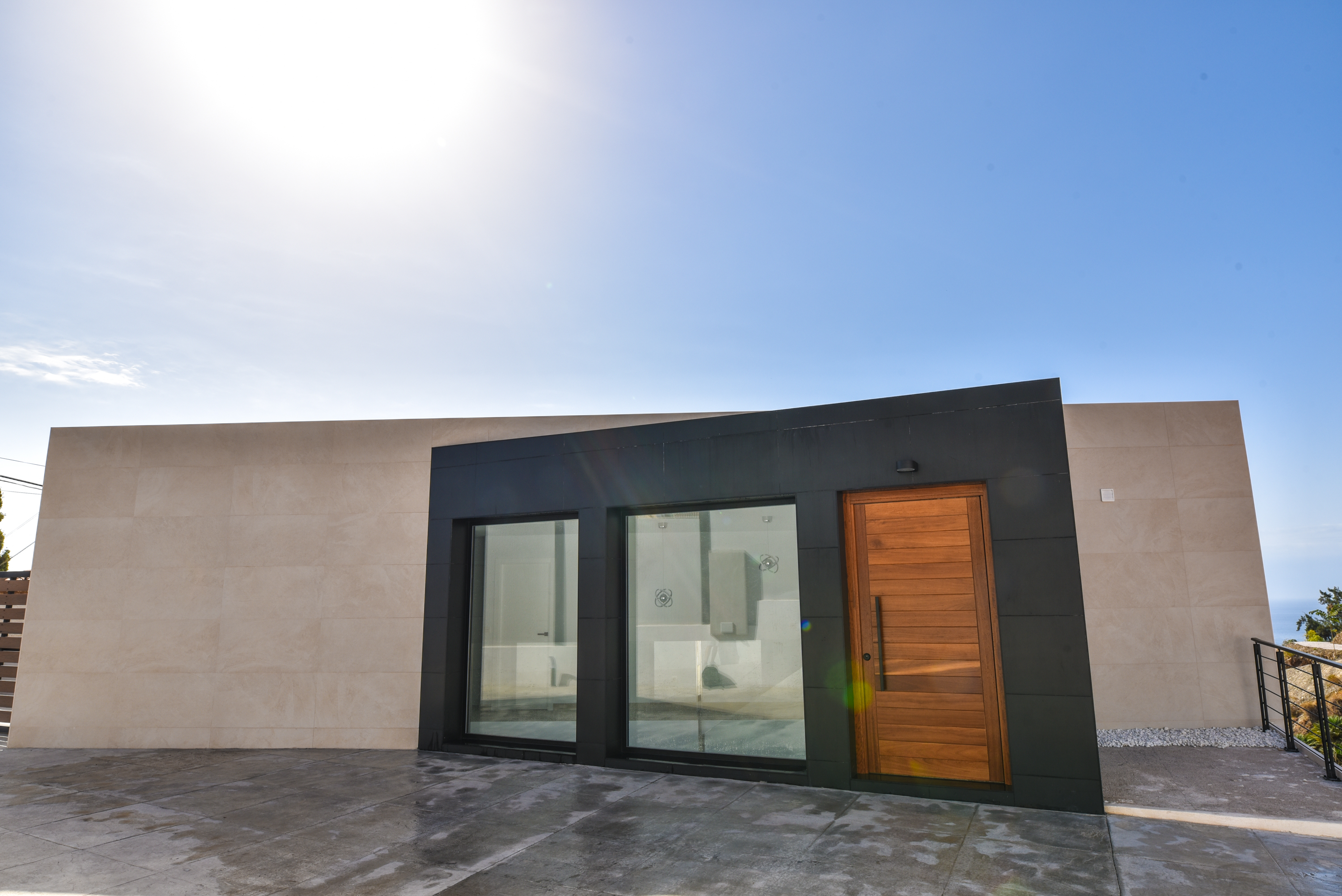 Both the living area and the modern kitchen have large sliding glass doors that penetrate the wall and disappear when opened. Thus, you can move unhindered from inside to outside to encounter the wonderful climate that the Costa Tropical of Granada offers all year round. There are sliding glass doors in the bedrooms as well, with automatic blinds so you can decide whether to let the sun shine in or make the room as dark as you wish.