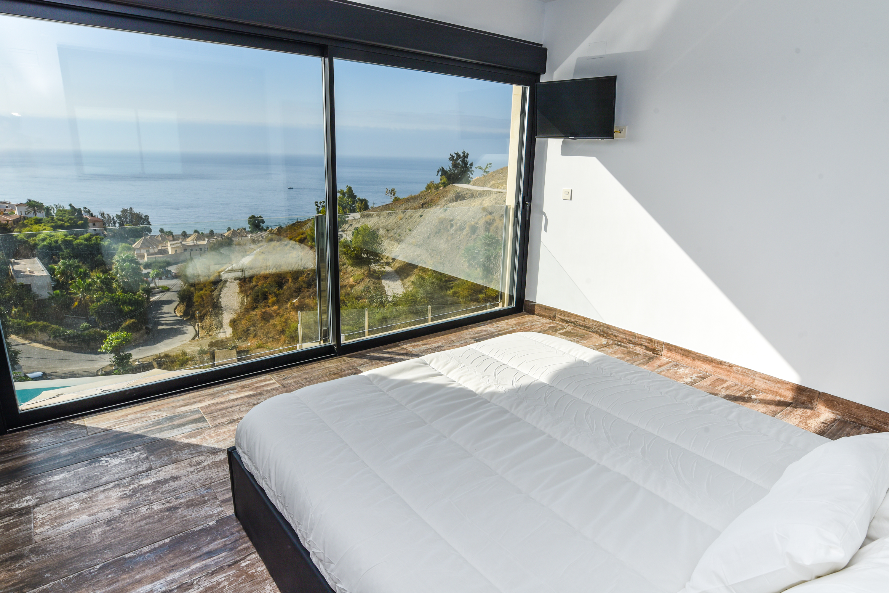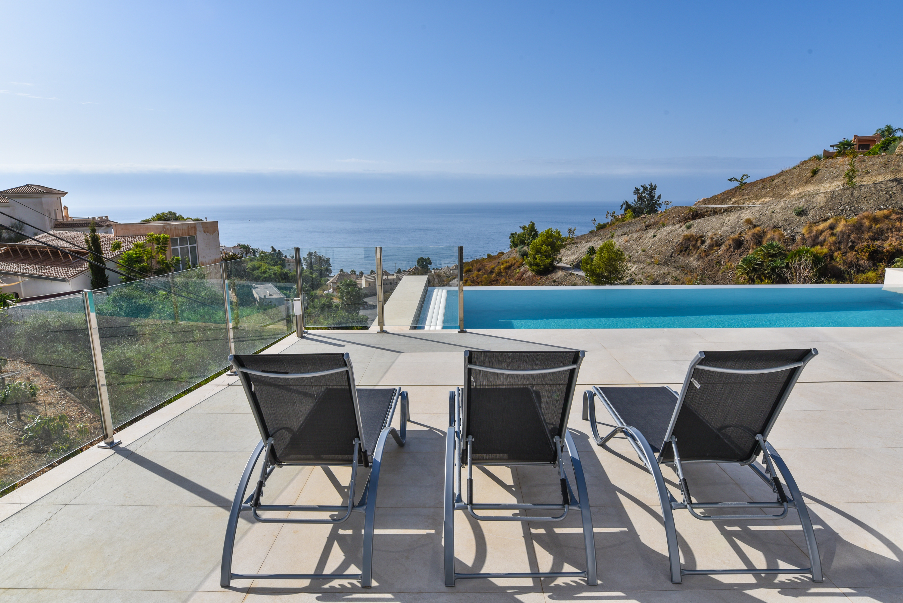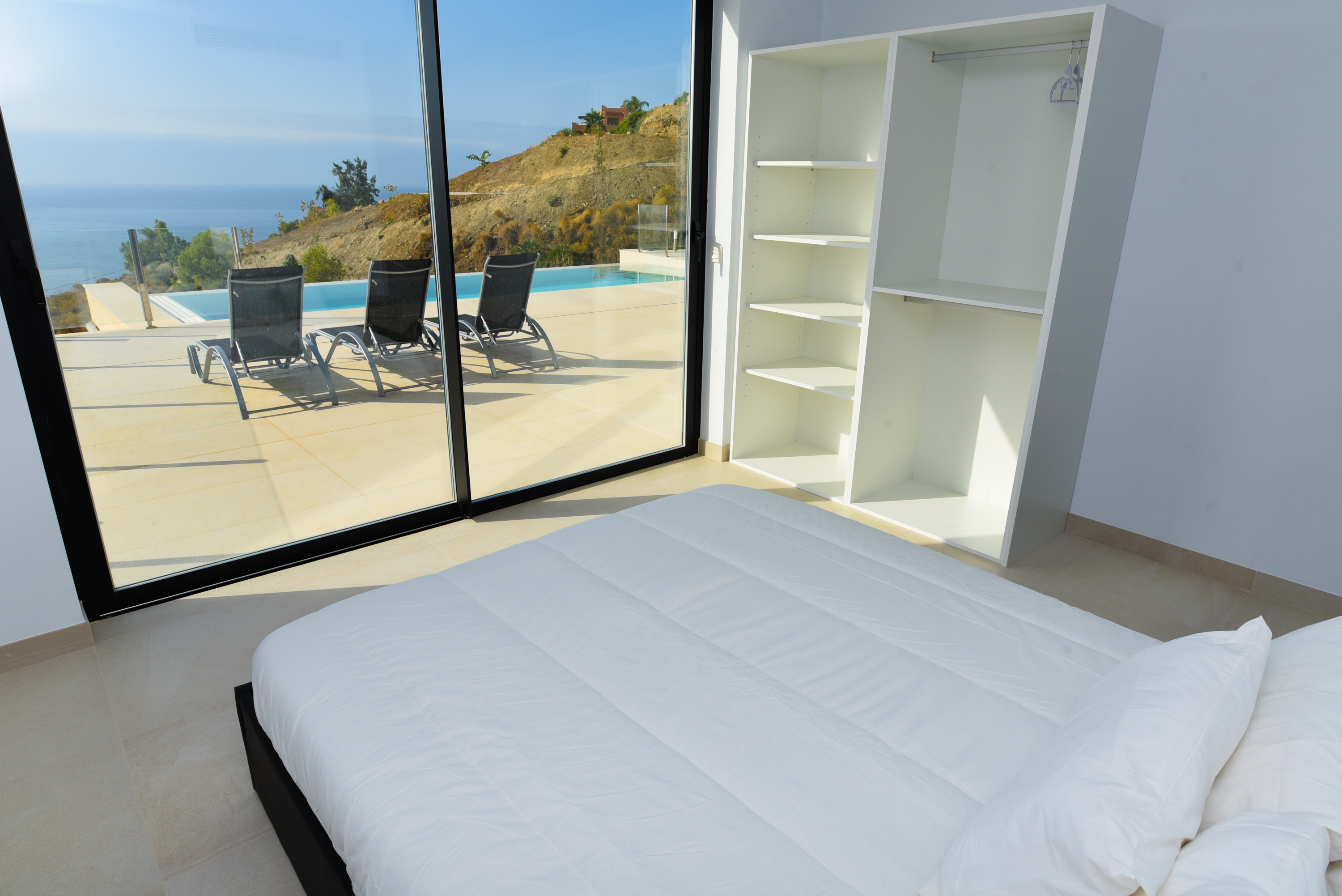 On the main floor there are three good sized bedrooms with ample wardrobe space. One bedroom has a well equipped en-suite bathroom with washbasin and rain shower cubicle. The other two bedrooms share a bathroom. All bedrooms have fantastic views from the bed and sliding glass doors. One of the bedrooms has a bathtub where you can enjoy magnificent views. All the bedrooms have television. Waking up in this villa is a pleasure!