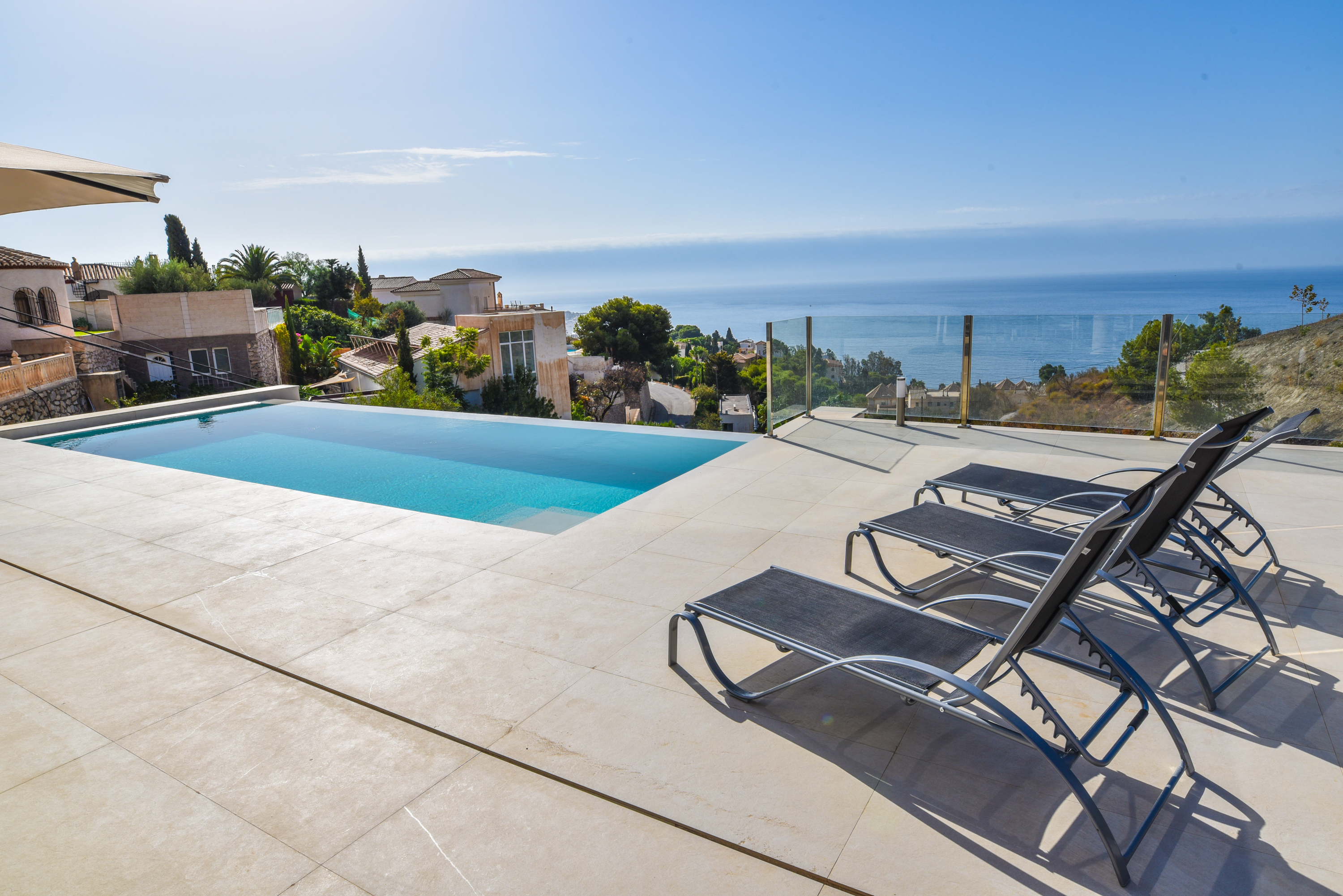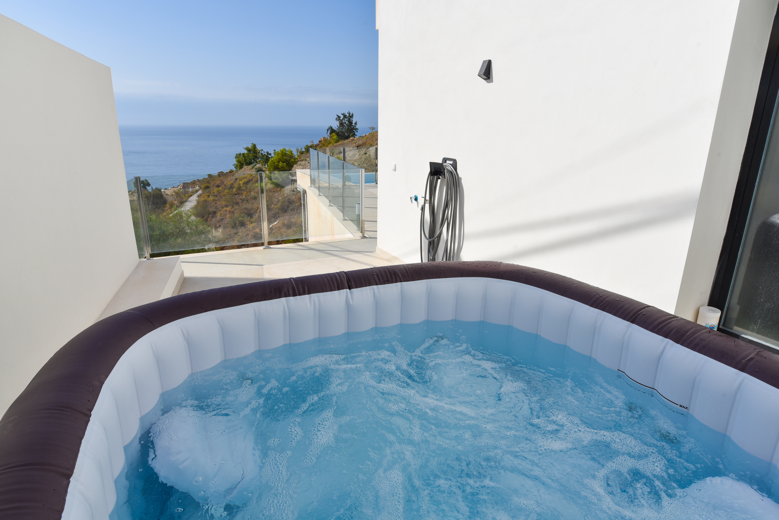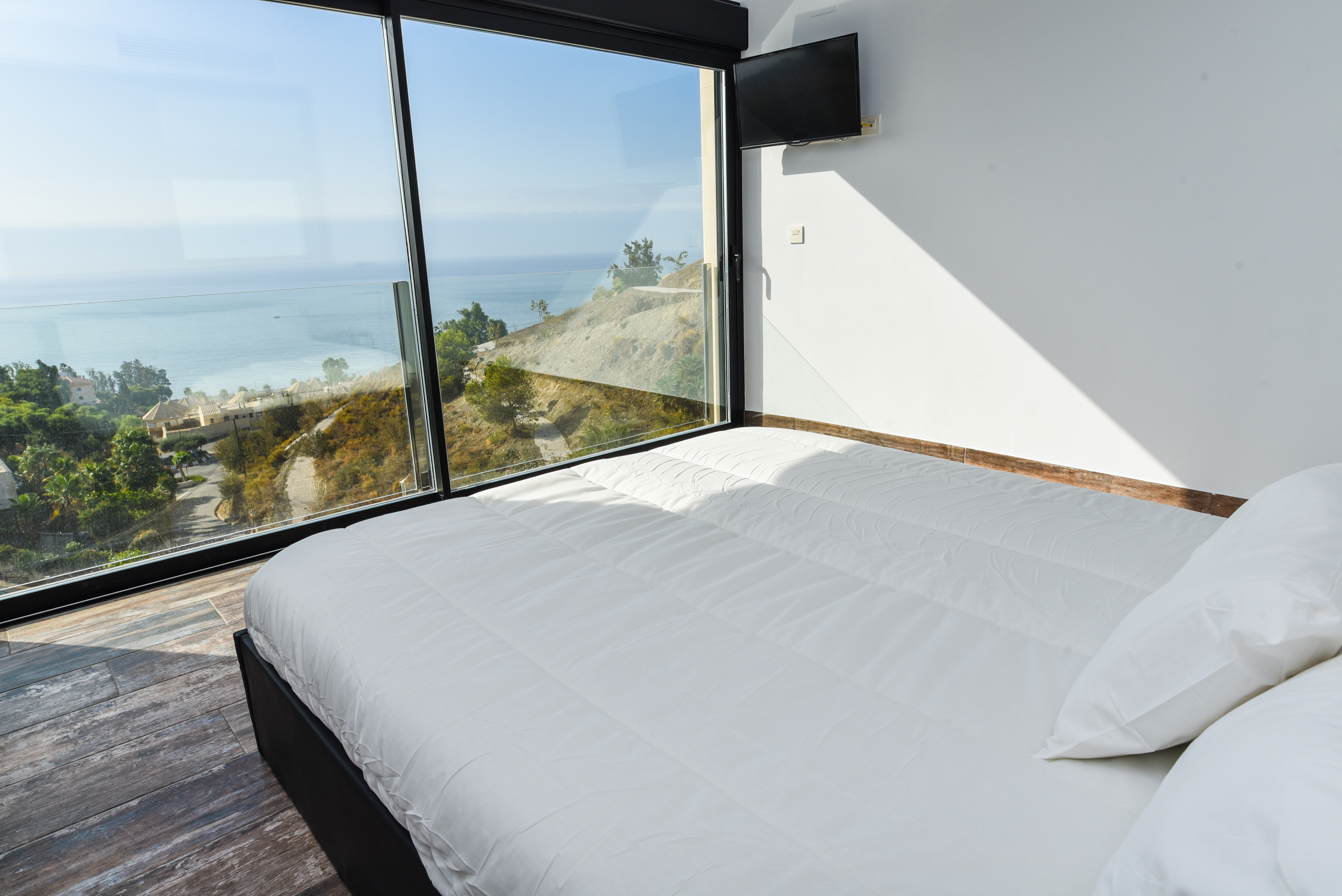 On the main floor there are three good sized bedrooms with ample wardrobe space. One bedroom has a well equipped en-suite bathroom with washbasin and rain shower cubicle. The other two bedrooms share a bathroom. All bedrooms have fantastic views from the bed and sliding glass doors. One of the bedrooms has a bathtub where you can enjoy magnificent views. All the bedrooms have television. Waking up in this villa is a pleasure!