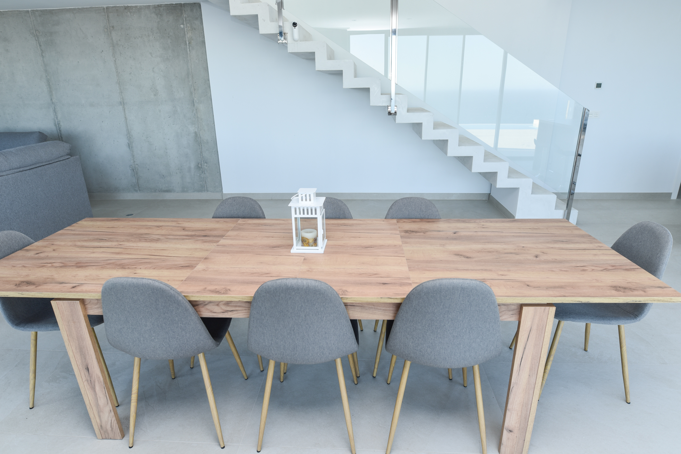 On the ground floor there is a living room, a dining area, a modern kitchen and a bedroom behind the kitchen "en suite". Beautiful designer lamps function as hanging jewels in this open plan area with unbeatable views of the Mediterranean. The living area offers everything you need for a cosy evening: TV, wireless WIFI connection. The dining area has a large table for eight people and a well-equipped kitchen with everything you need, with a central island where you can cook and contemplate the sea views at the same time! Outside there is a large table with chairs that invite you to wine and dine.