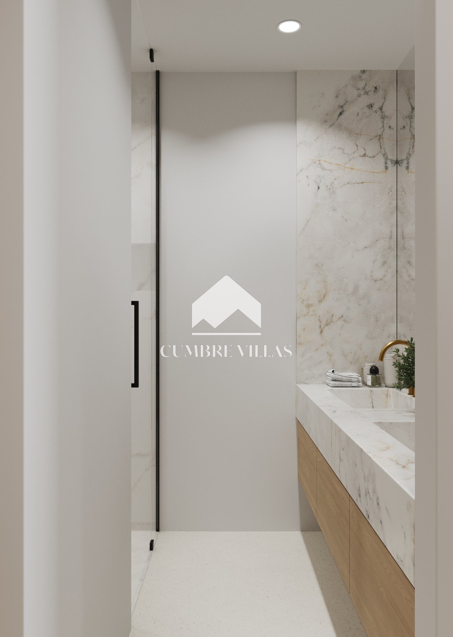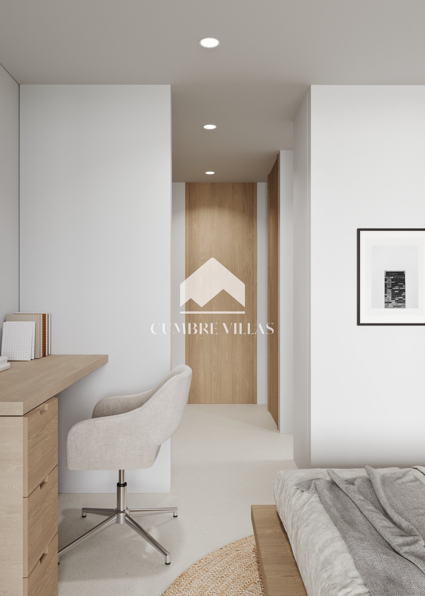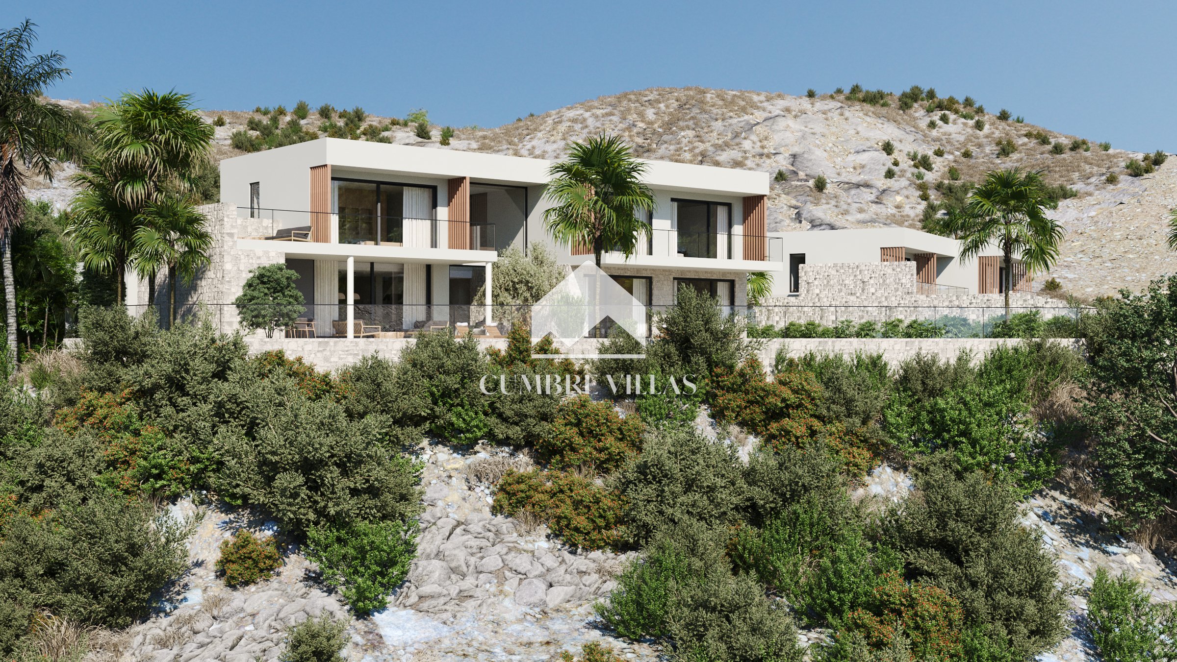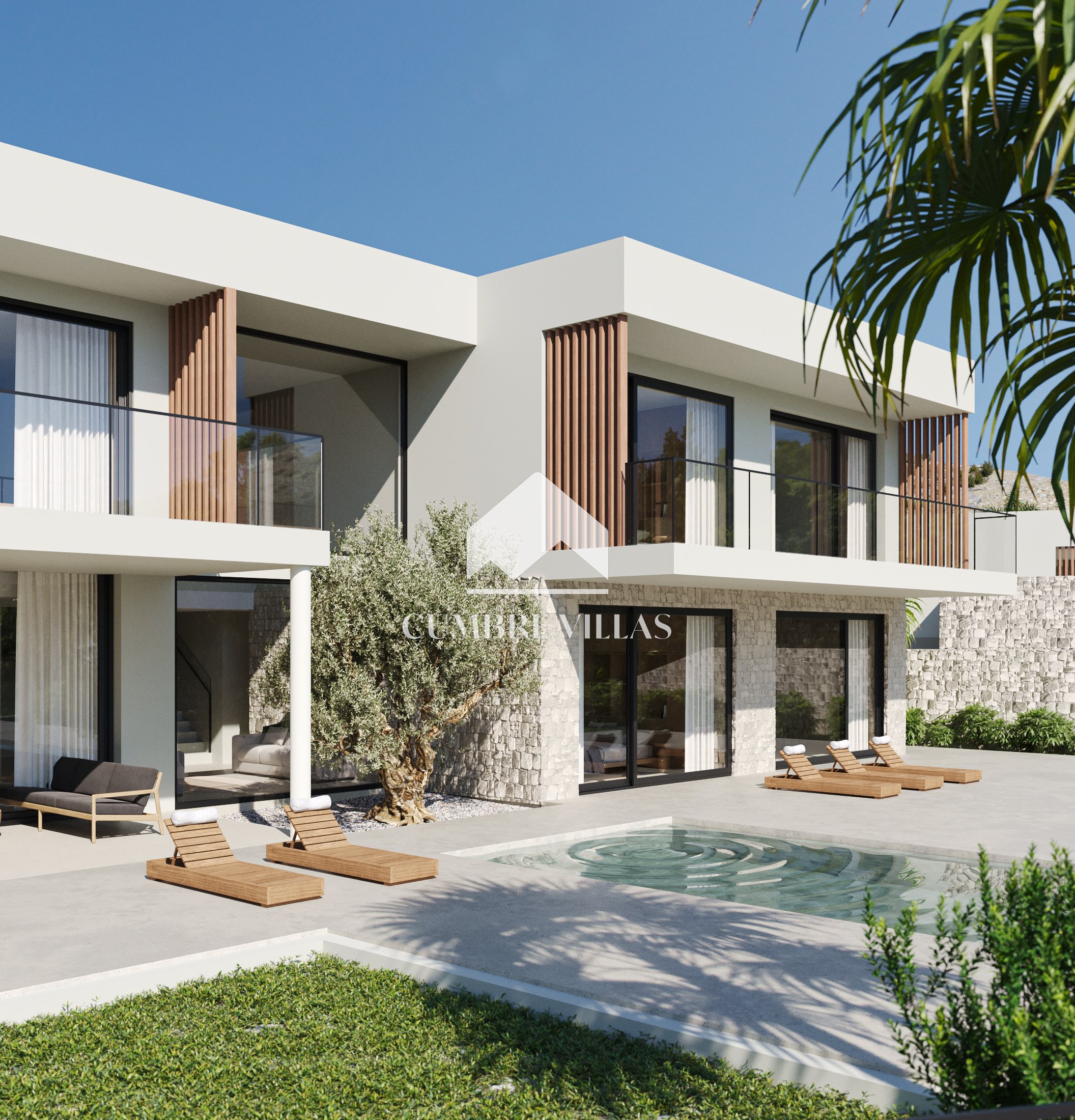 Terug binnen, aan de linkerkant van de woonkamer, leidt een gang naar het gastentoilet en twee ruime suites, beide met directe toegang tot buiten. Terug in de hal leidt een trap naar de eerste verdieping. Aan de linkerkant bevinden zich twee slaapkamers die een terras delen, terwijl aan de rechterkant de hoofdsuite te vinden is, compleet met een eigen terras. Alle slaapkamers zijn uitgerust met inloopkasten, eigen badkamers en bieden adembenemend zeezicht.