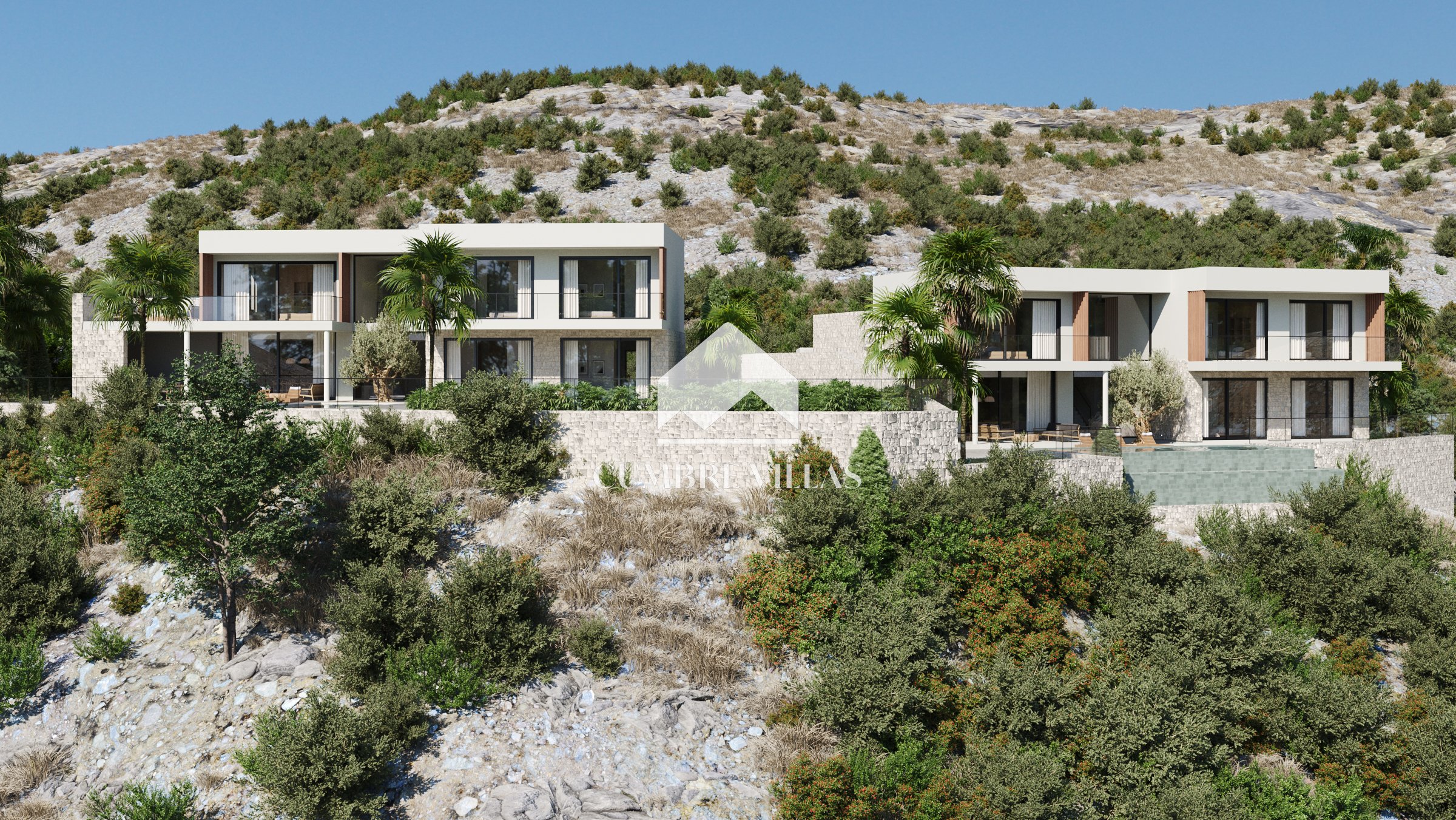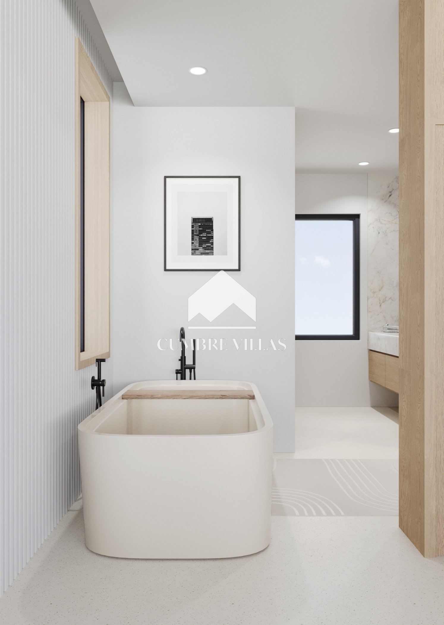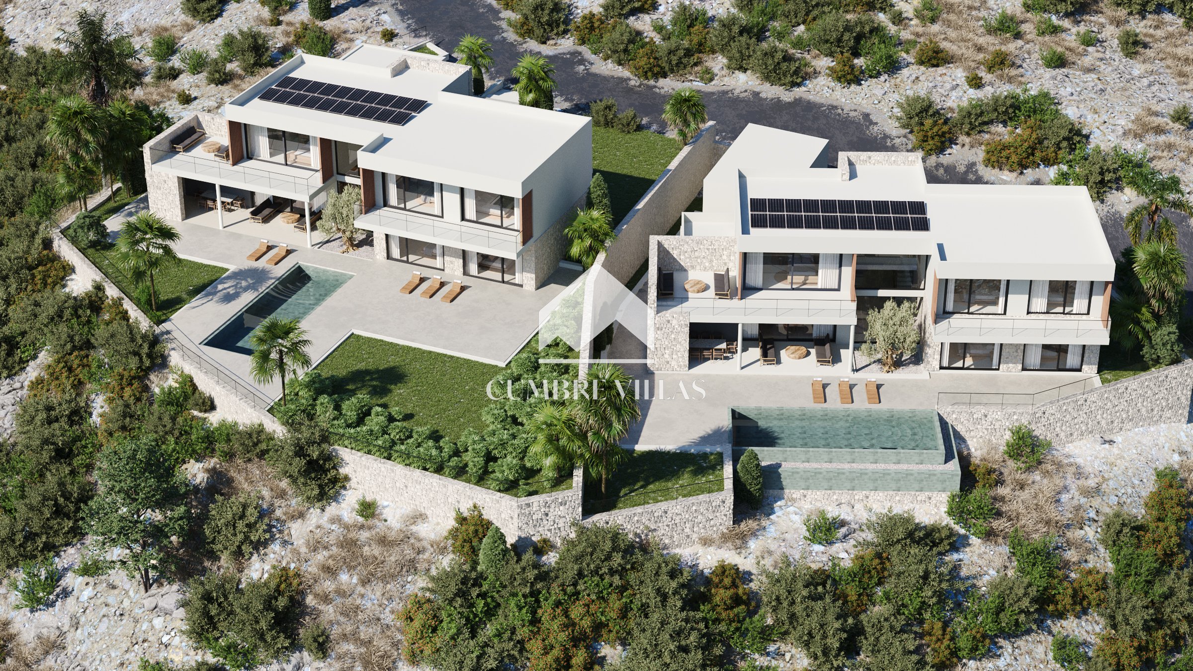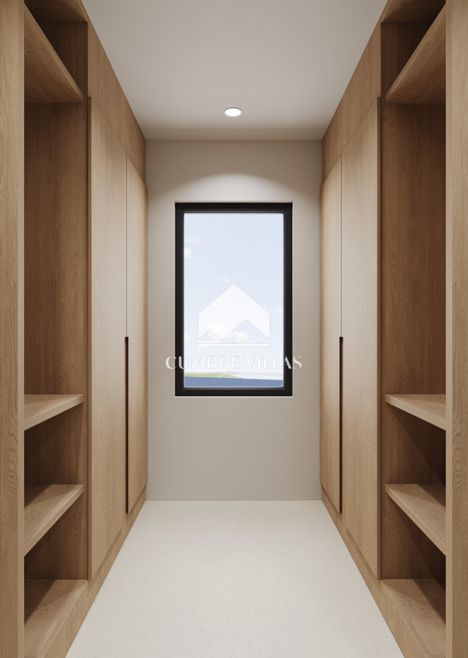 Terug binnen, aan de linkerkant van de woonkamer, leidt een gang naar het gastentoilet en twee ruime suites, beide met directe toegang tot buiten. Terug in de hal leidt een trap naar de eerste verdieping. Aan de linkerkant bevinden zich twee slaapkamers die een terras delen, terwijl aan de rechterkant de hoofdsuite te vinden is, compleet met een eigen terras. Alle slaapkamers zijn uitgerust met inloopkasten, eigen badkamers en bieden adembenemend zeezicht.