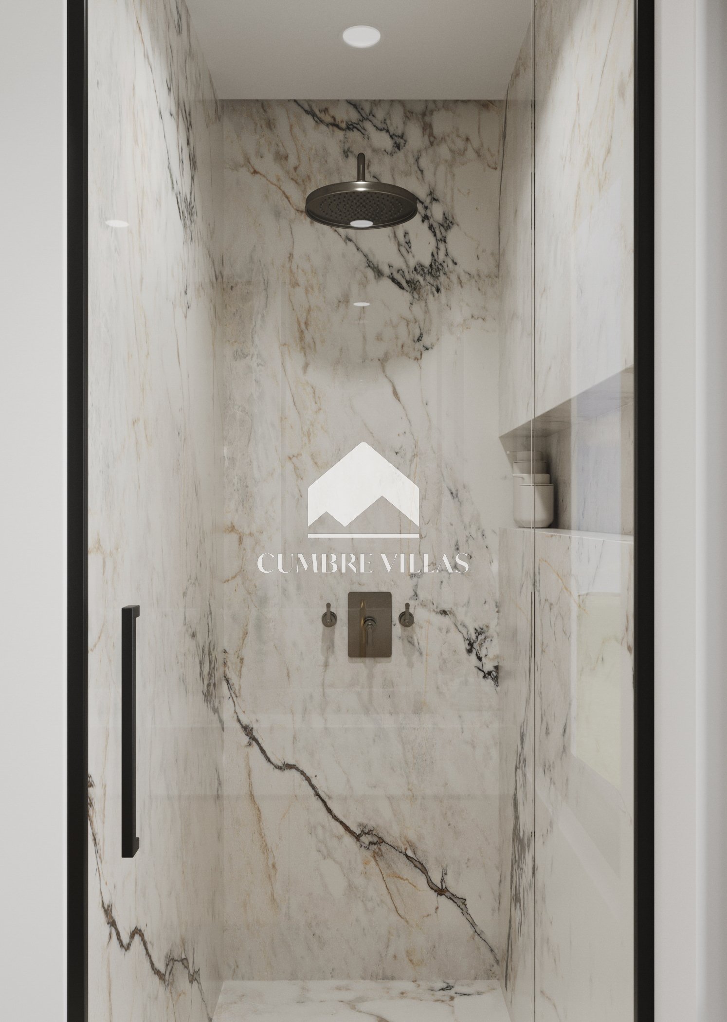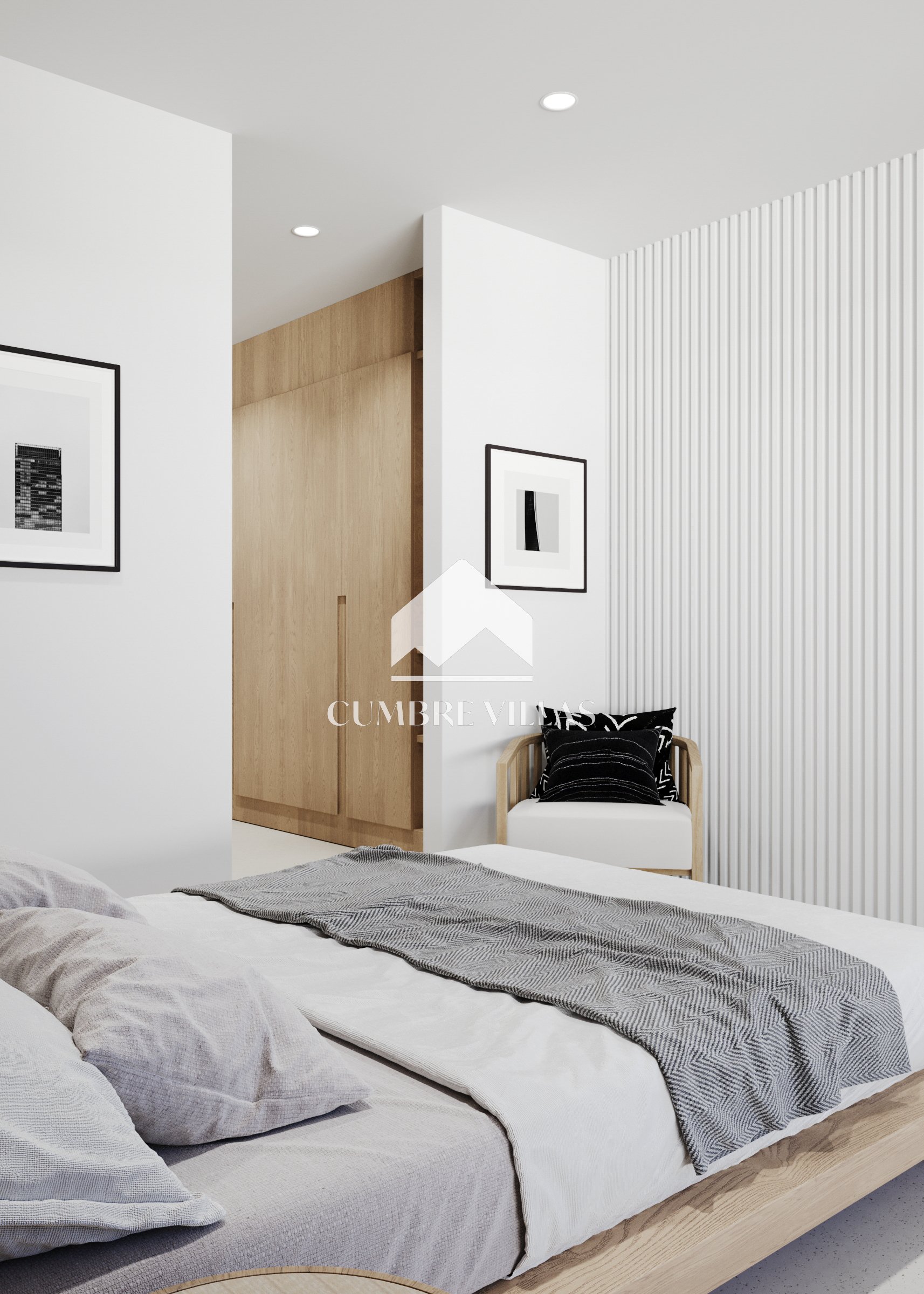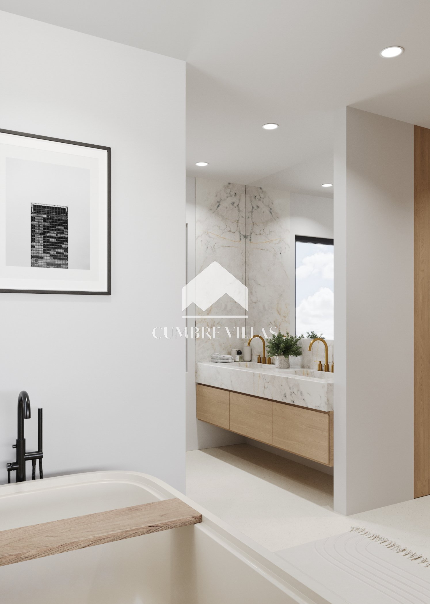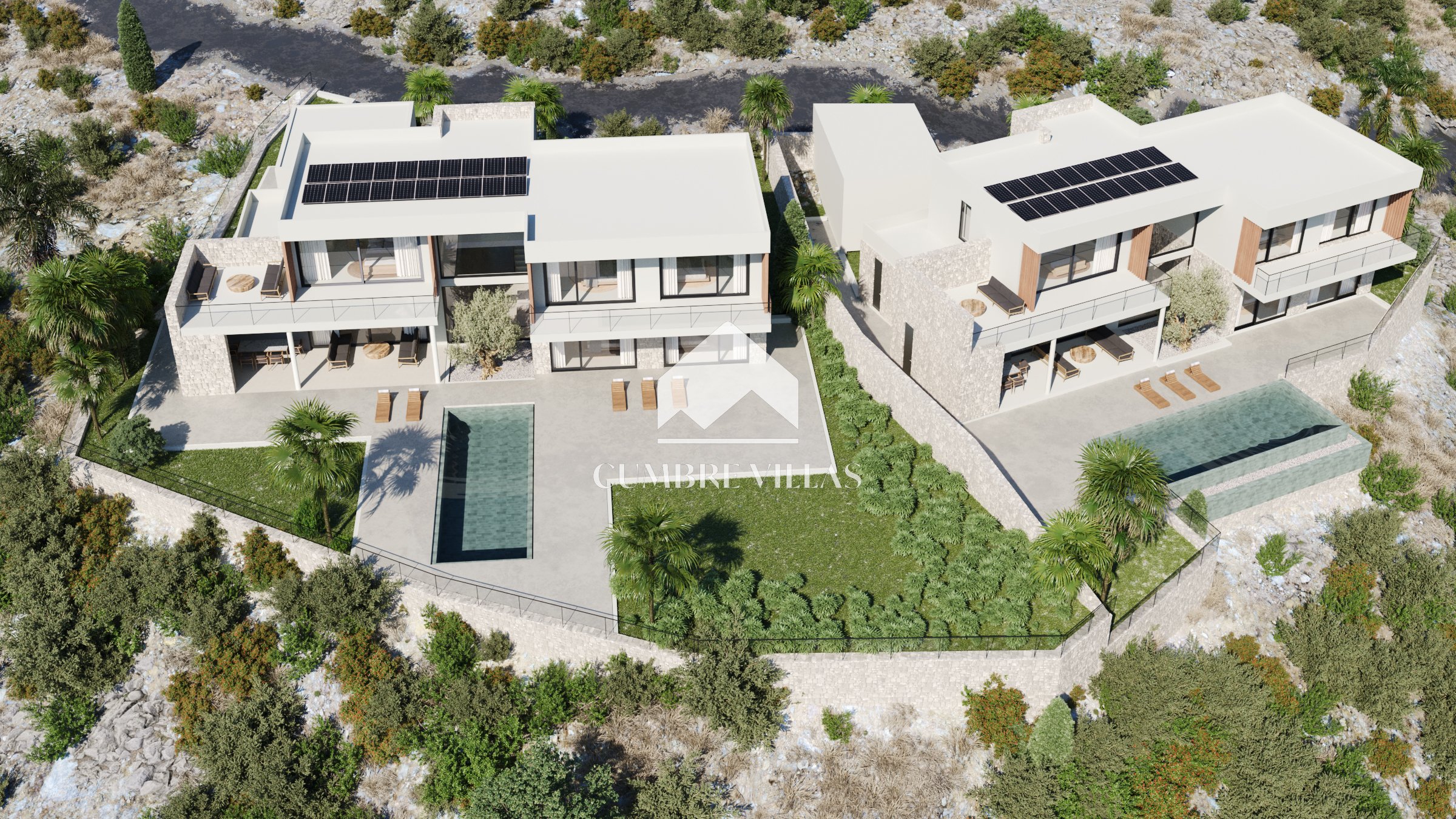 Terug binnen, aan de linkerkant van de woonkamer, leidt een gang naar het gastentoilet en twee ruime suites, beide met directe toegang tot buiten. Terug in de hal leidt een trap naar de eerste verdieping. Aan de linkerkant bevinden zich twee slaapkamers die een terras delen, terwijl aan de rechterkant de hoofdsuite te vinden is, compleet met een eigen terras. Alle slaapkamers zijn uitgerust met inloopkasten, eigen badkamers en bieden adembenemend zeezicht.