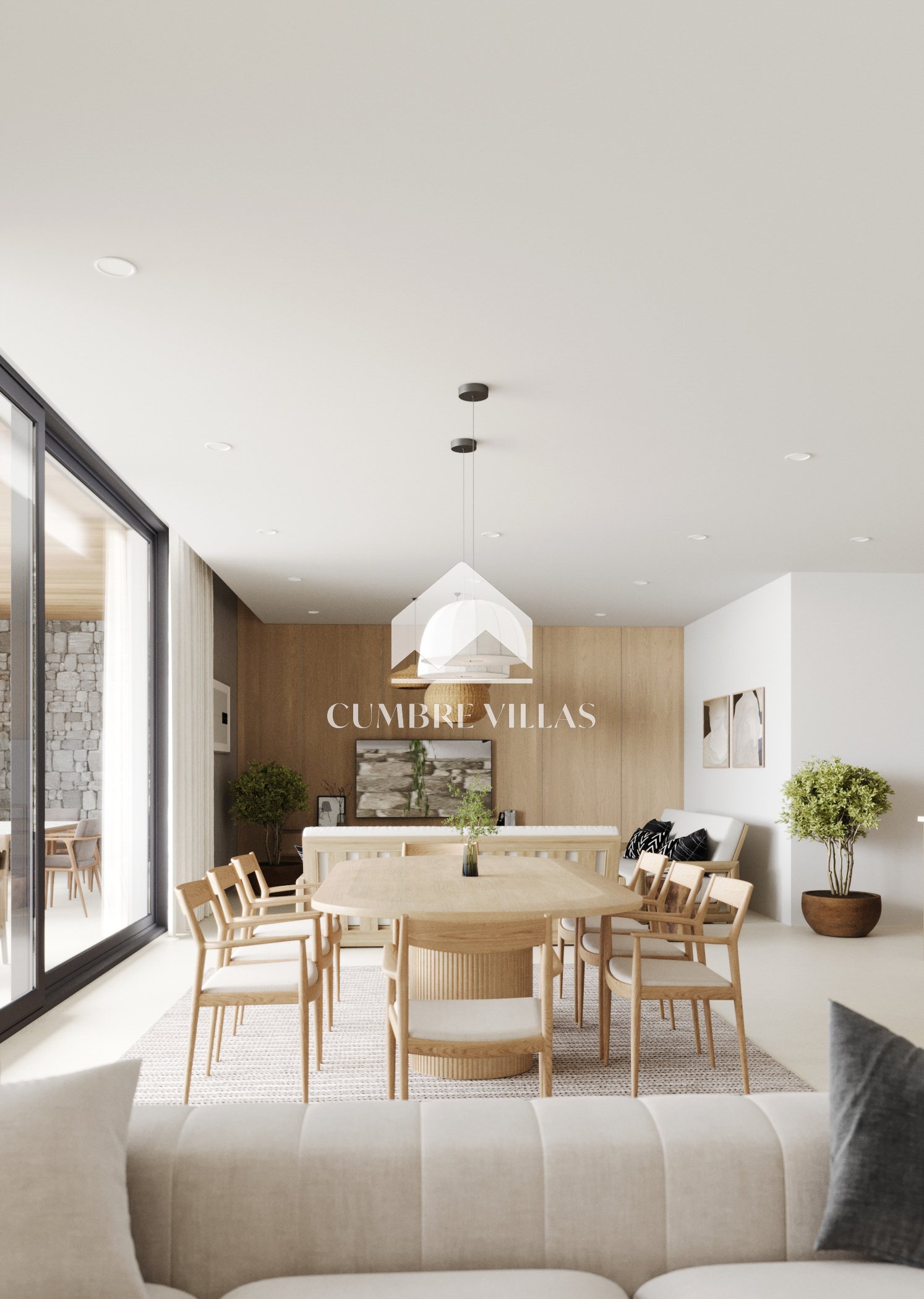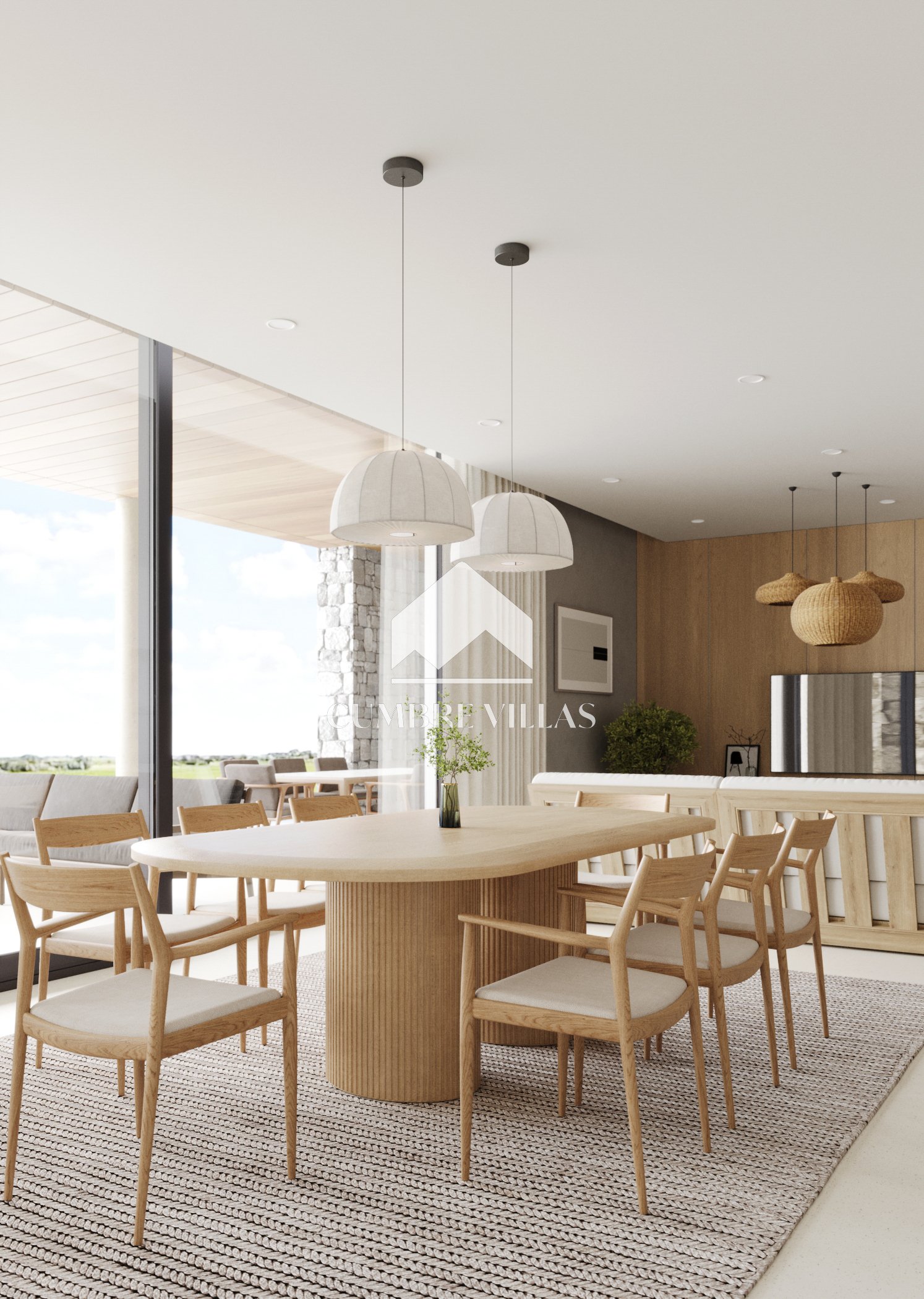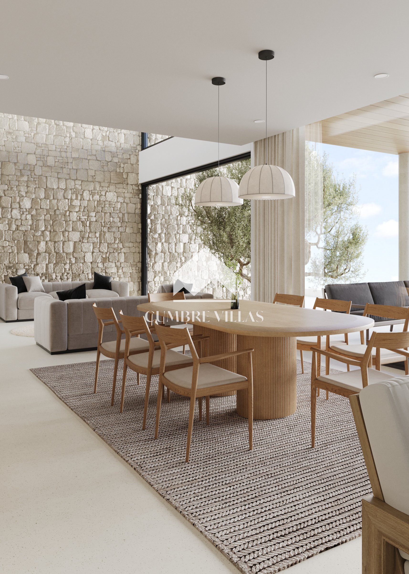 Bij binnenkomst via de voordeur wordt u begroet door de lichte, open woonruimte achter de hal en die voorzien is van dubbelhoge plafonds. Vanaf hier strekt het uitzicht zich uit over het zwembad en de tuin tot aan de zee. Als u rechtdoor loopt, komt u in de woonkamer uit die naadloos geïntegreerd is met de open, volledig uitgeruste keuken aan uw rechterkant. Naast de keuken bevindt zich een bijkeuken met toegang tot een zijterras. De woonkamer komt uit op een overdekt terras dat overloopt in het open terras waar het verwarmde zwembad op u wacht, omringd door tuin aan beide zijden. Voor extra gemak is er aan één kant van het huis een buitentoilet.