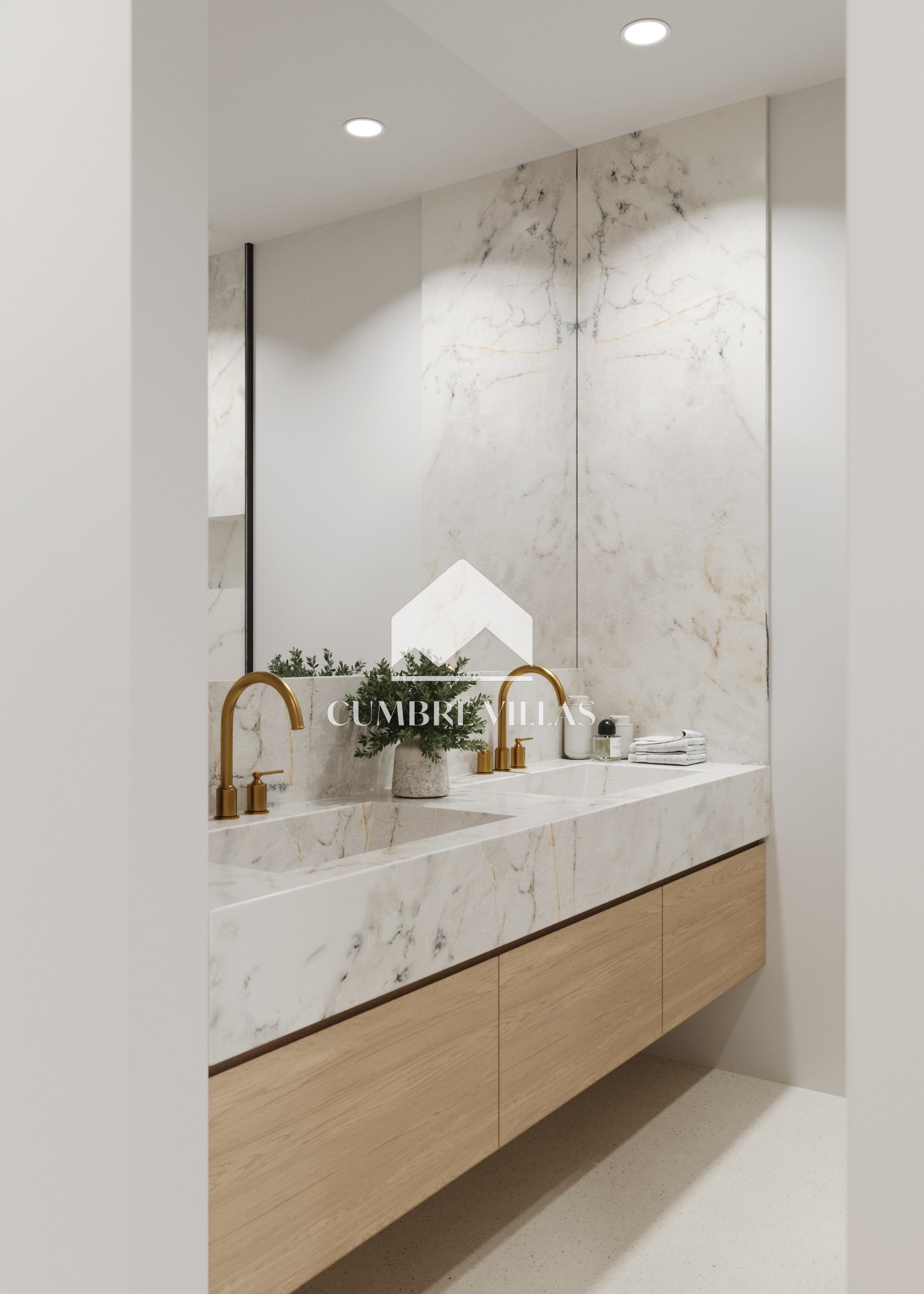 Terug binnen, aan de linkerkant van de woonkamer, leidt een gang naar het gastentoilet en twee ruime suites, beide met directe toegang tot buiten. Terug in de hal leidt een trap naar de eerste verdieping. Aan de linkerkant bevinden zich twee slaapkamers die een terras delen, terwijl aan de rechterkant de hoofdsuite te vinden is, compleet met een eigen terras. Alle slaapkamers zijn uitgerust met inloopkasten, eigen badkamers en bieden adembenemend zeezicht.