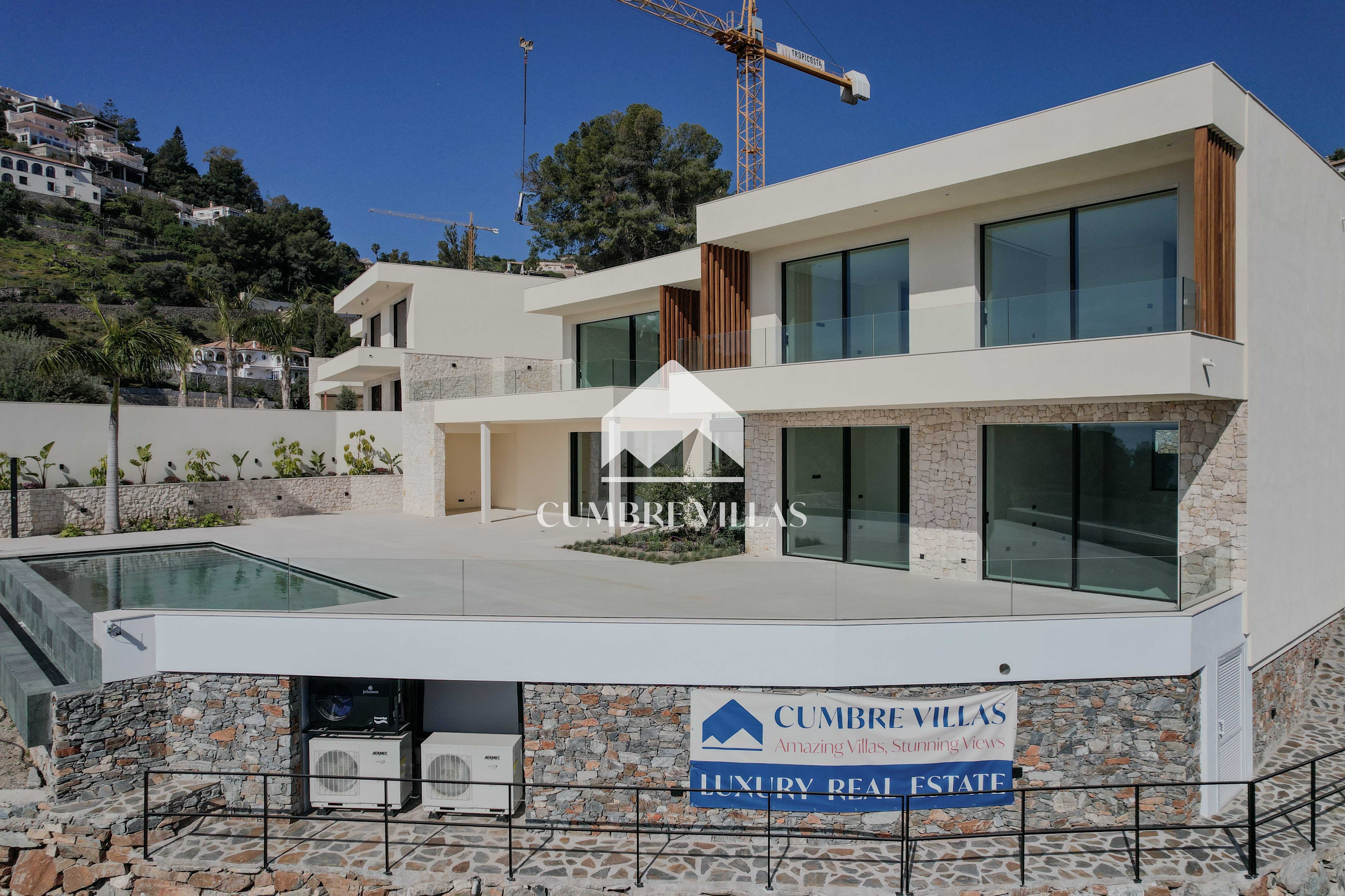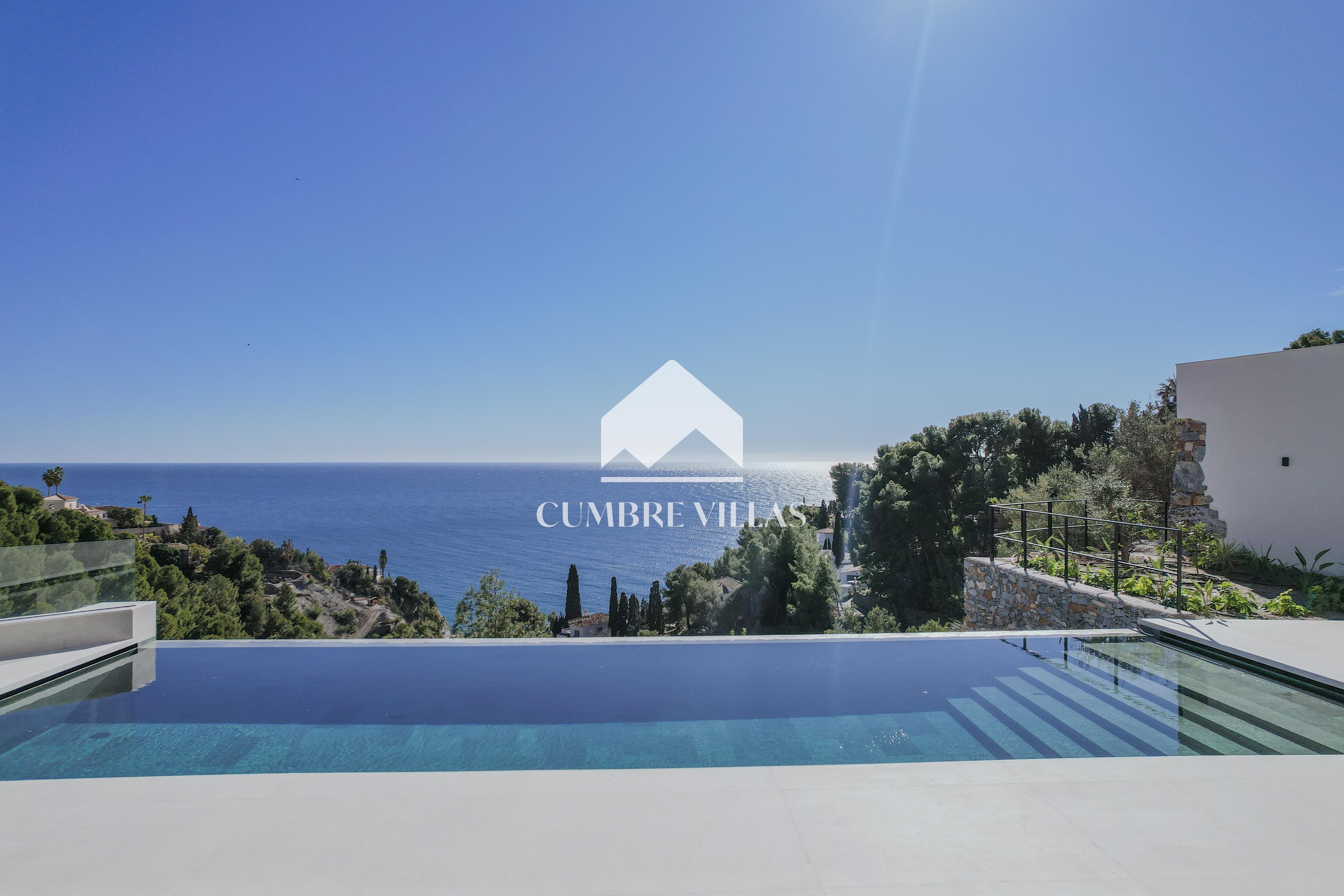 Moderne nieuwbouwvilla in de wijk Cotobro in Almuñécar met een aangelegde tuin, verwarmd zwembad en prachtig uitzicht.
